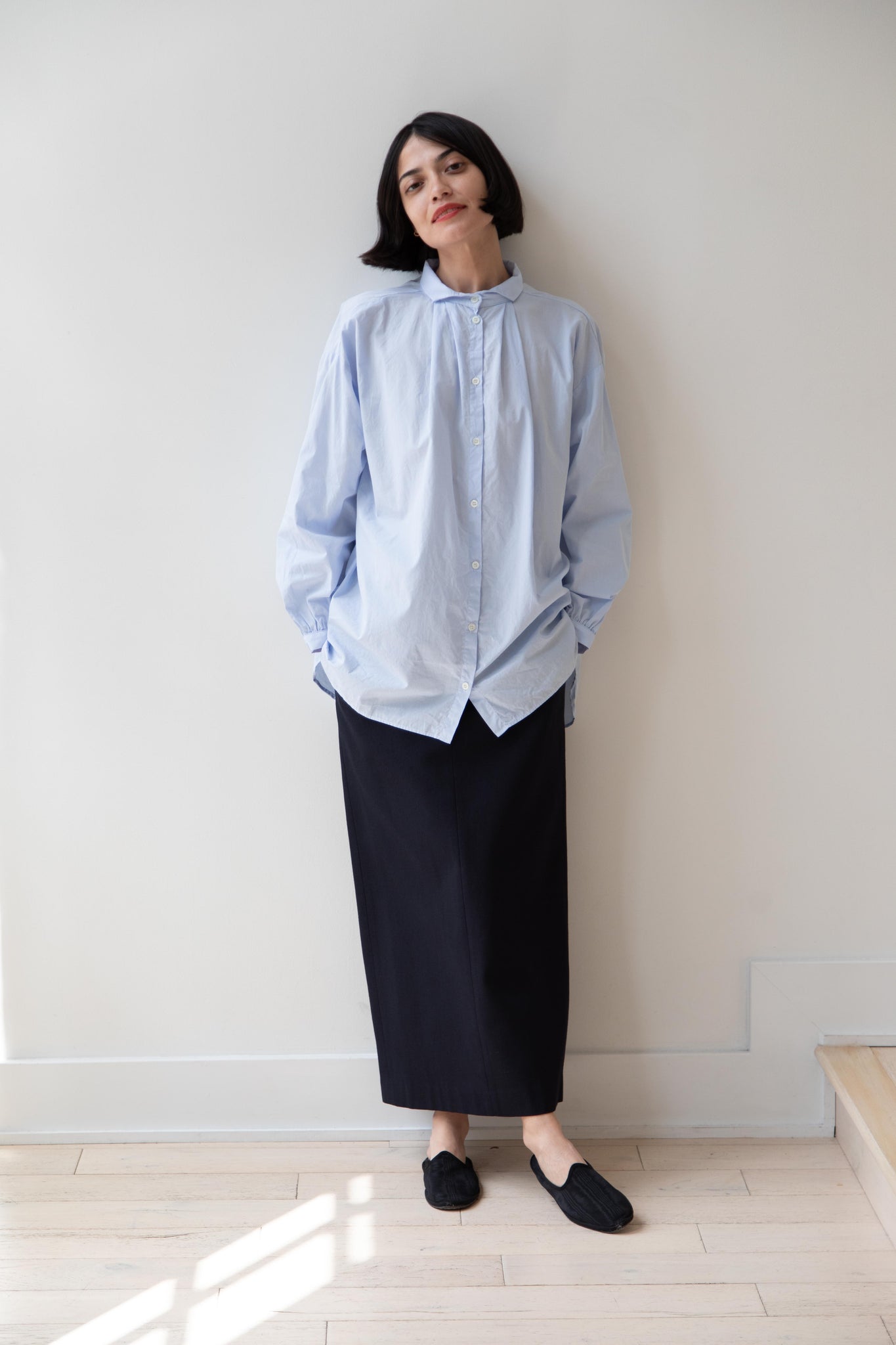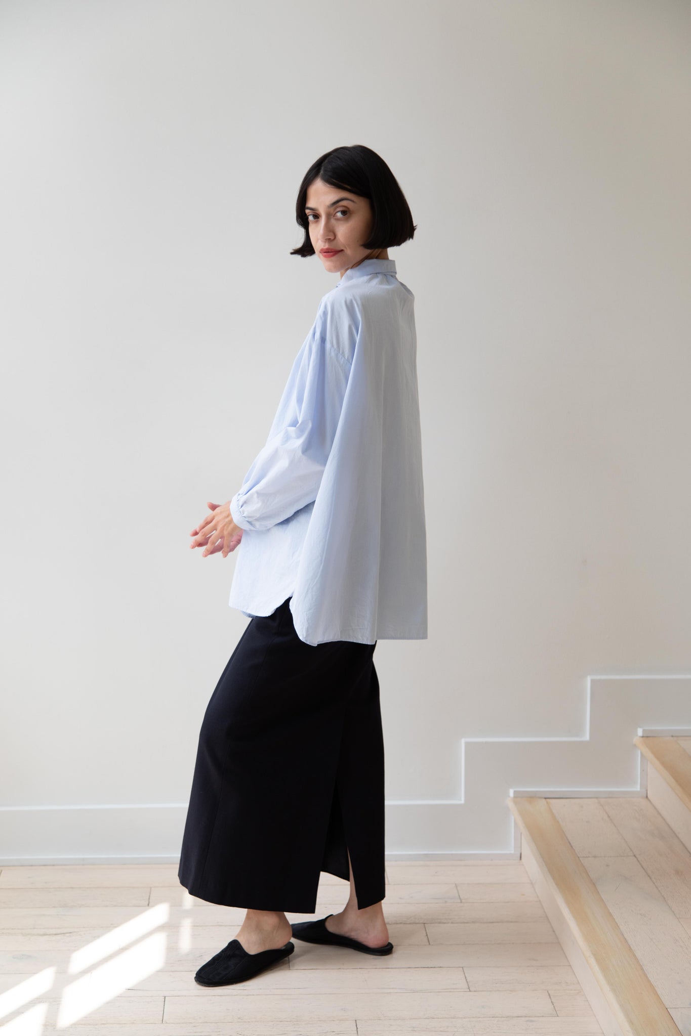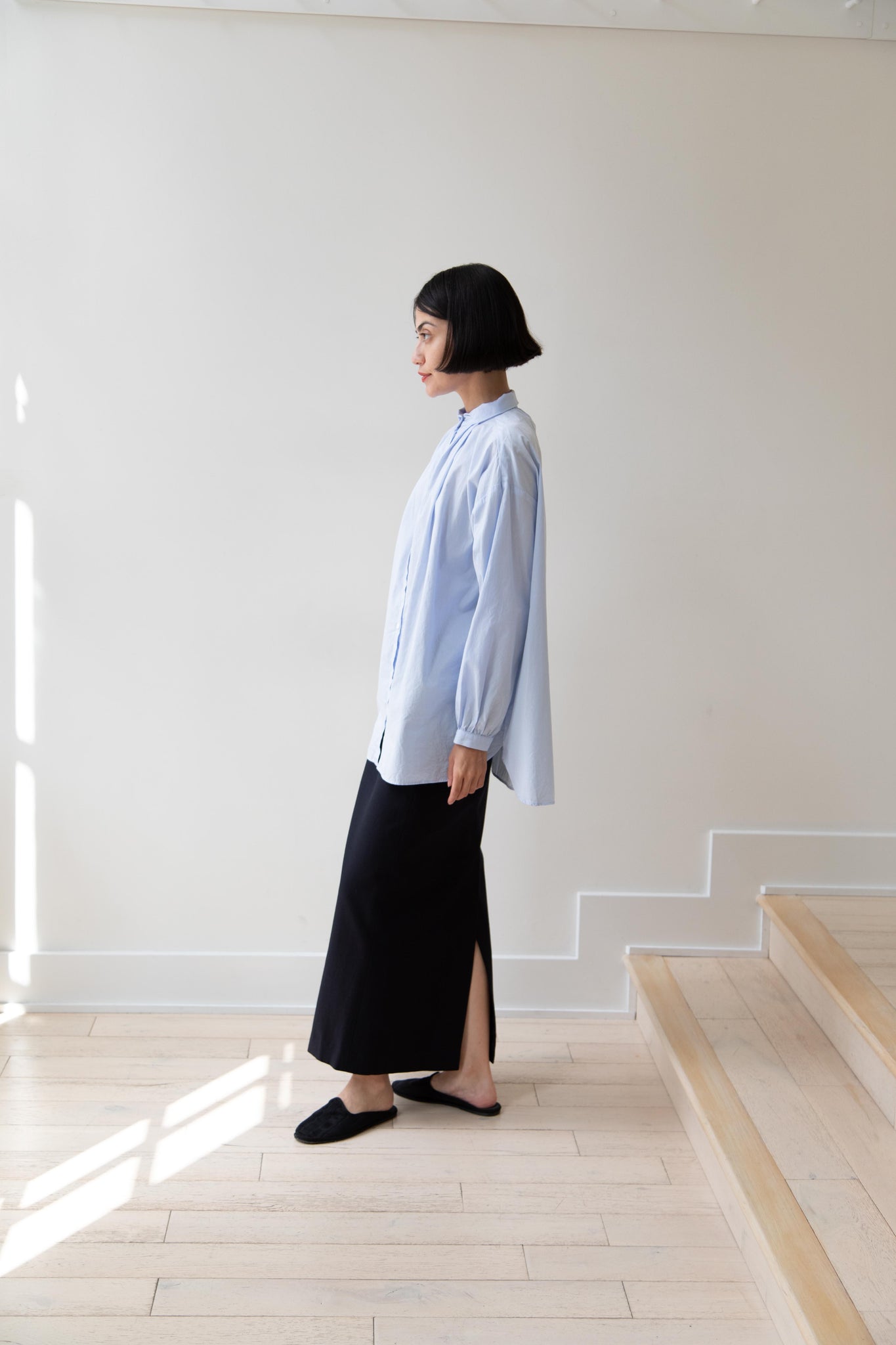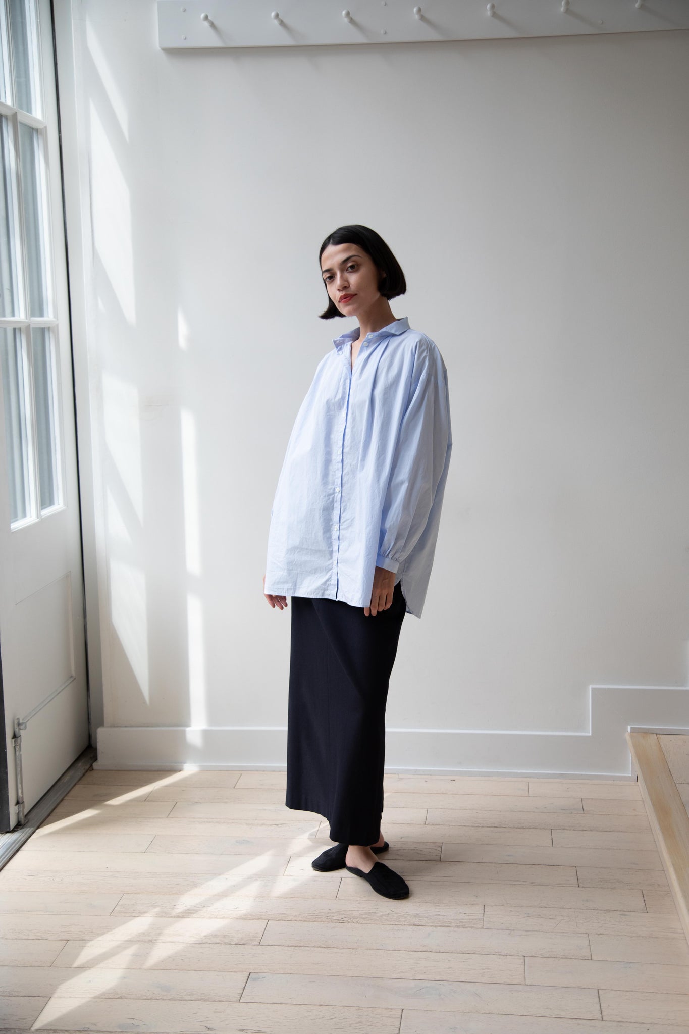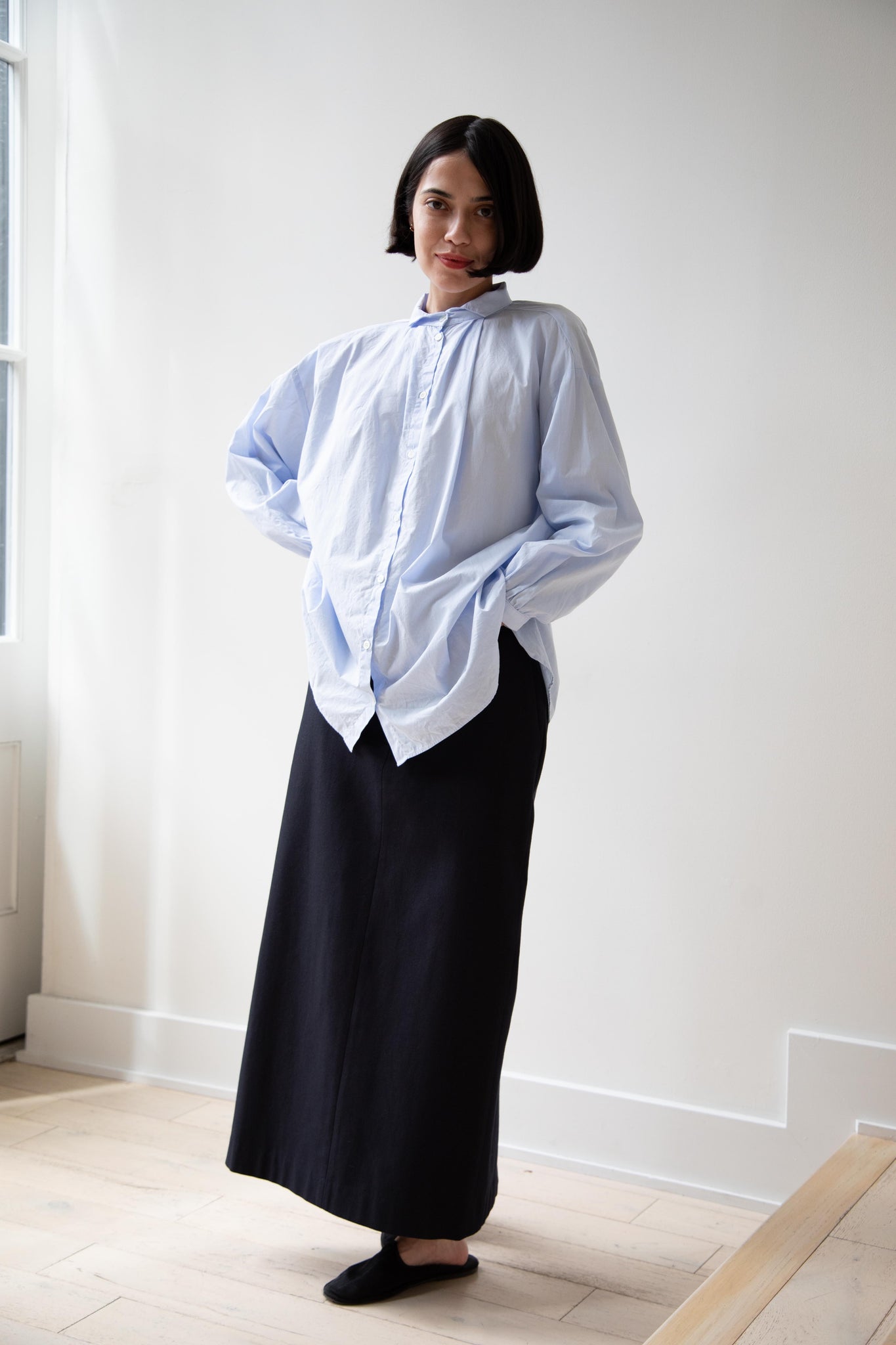 This top is so lovely and an instant spring classic with an easy, slightly oversized shape through the body. We love that this is a slightly different take on the classic button-down top. Made from cotton poplin, it gathers around the collar and the sleeve giving it a slight balloon to its shape. It looks great with skirts, pants, and dresses!