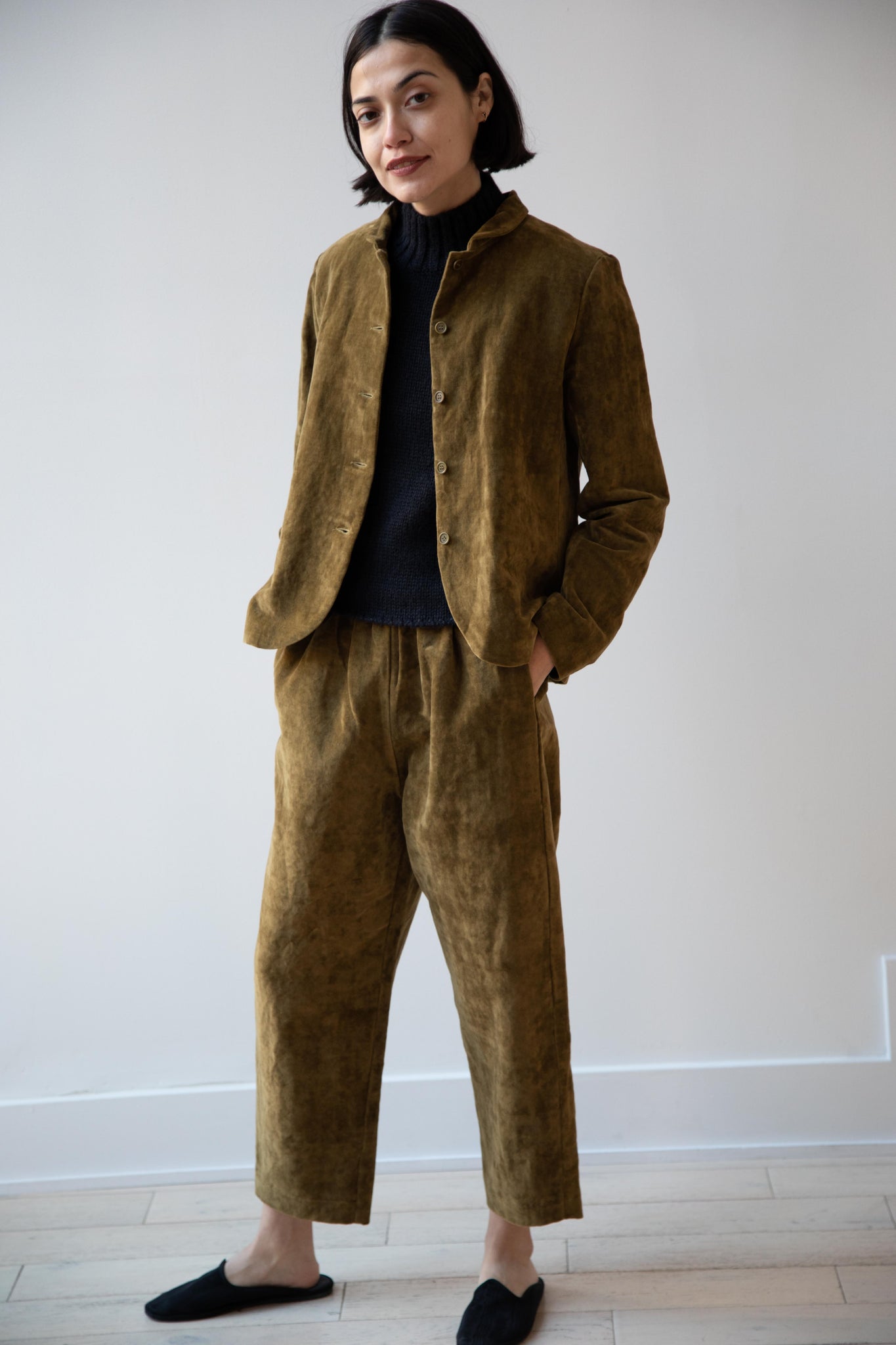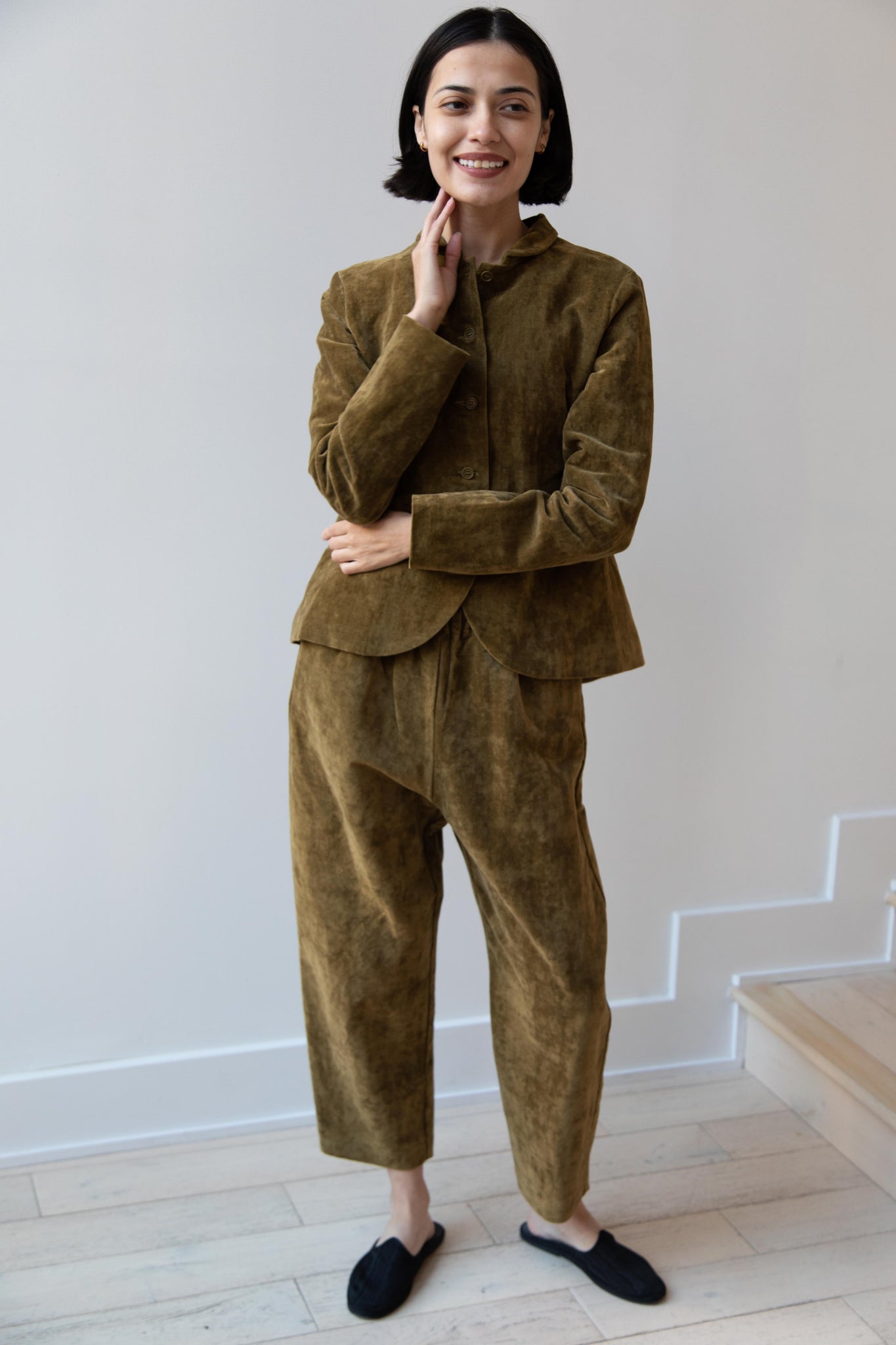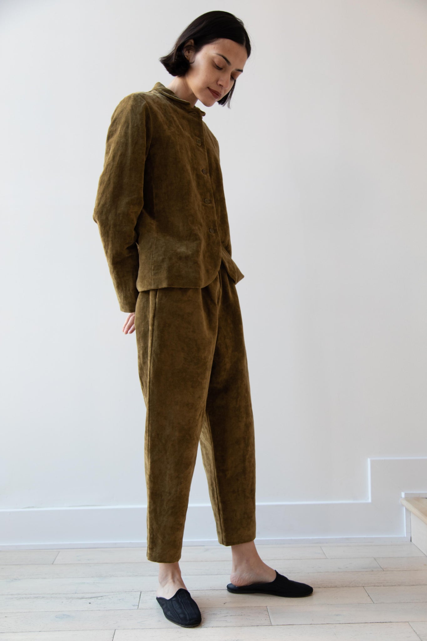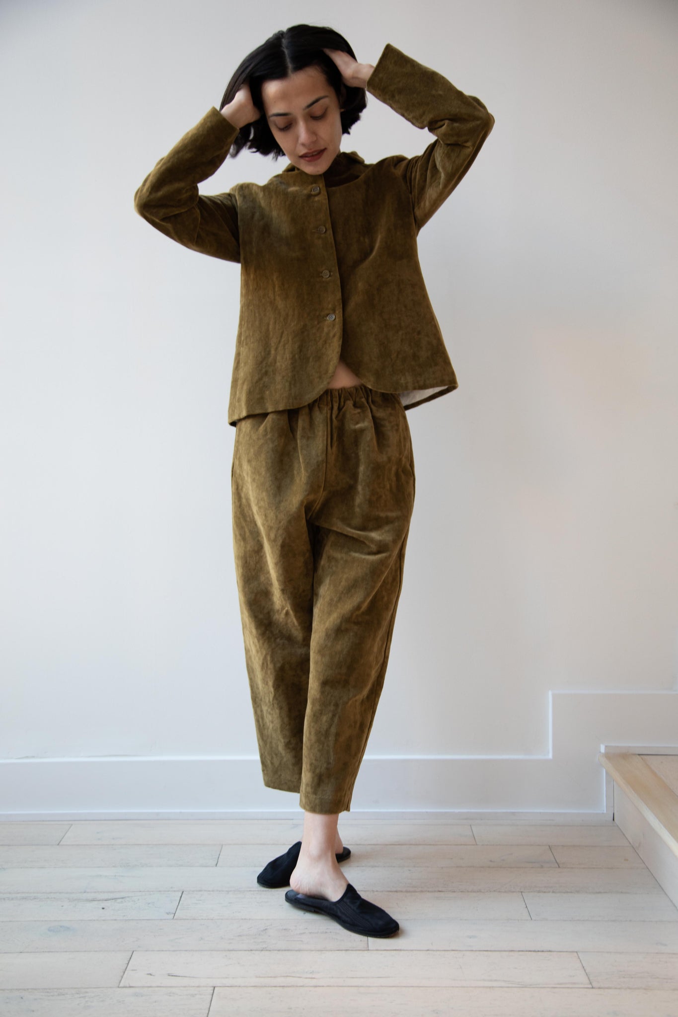 Apuntob's classic straight leg cropped trouser is back this season in a beautiful crushed cotton linen velvet.  They have an elastic waist and side pockets.  The color is a golden olive and can look different in different lights and is hard to capture precisely in photos; the designer's color is called forest.
