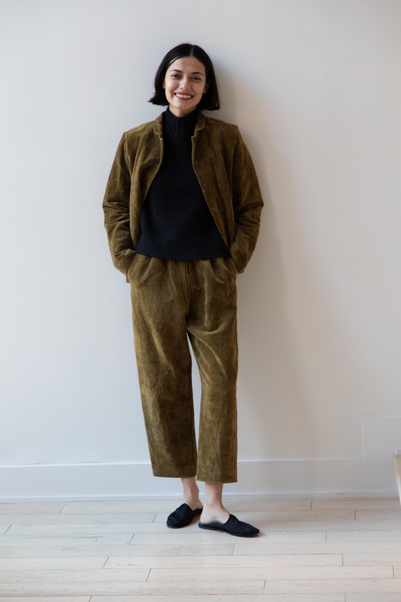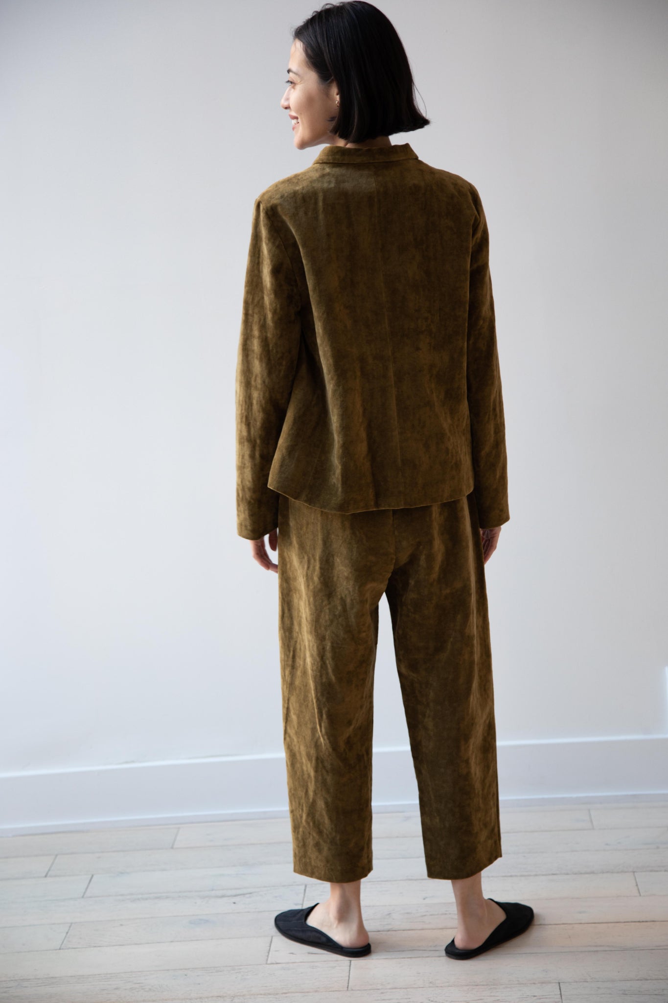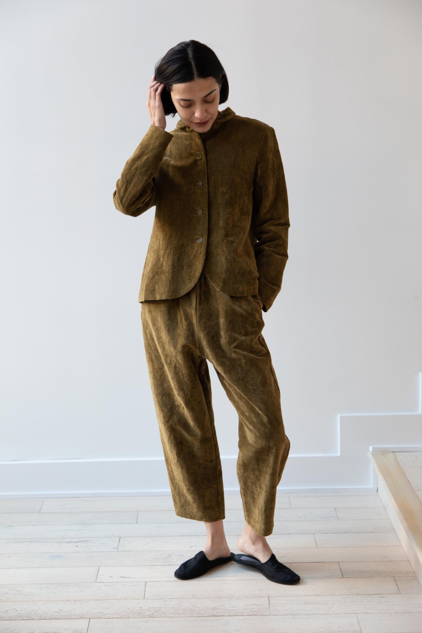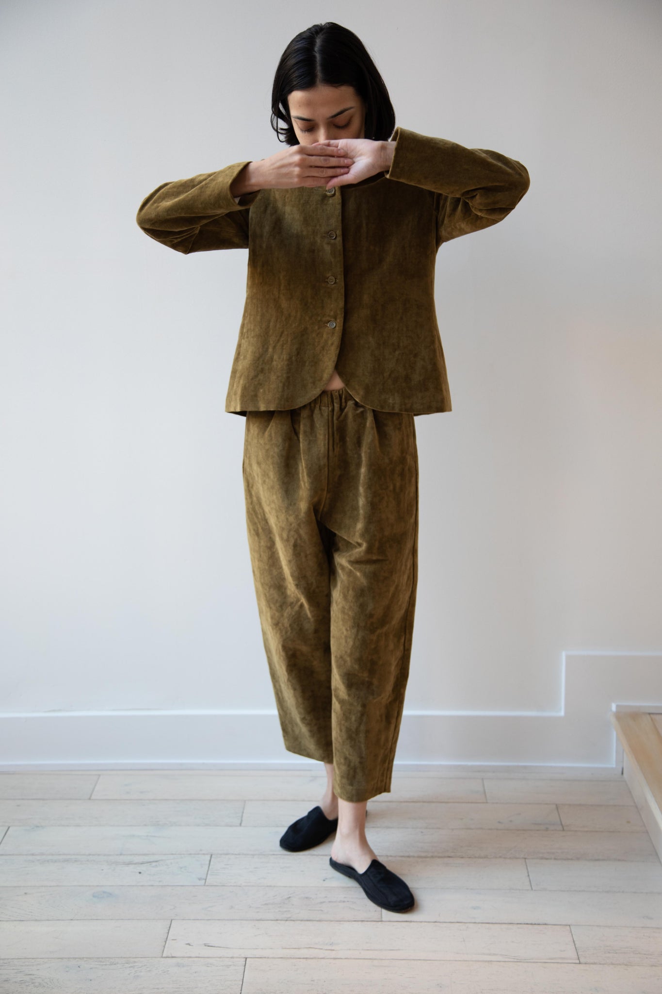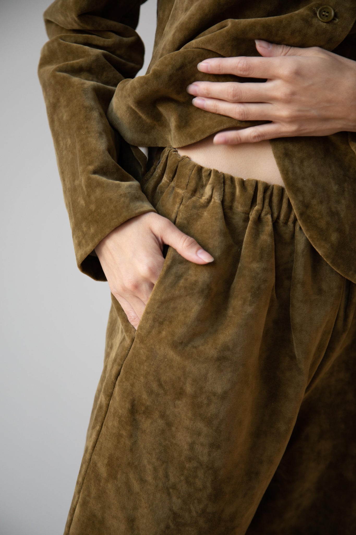 Apuntob's classic straight leg cropped trouser is back this season in a beautiful crushed cotton linen velvet.  They have an elastic waist and side pockets.  The color is a golden olive and can look different in different lights and is hard to capture precisely in photos; the designer's color is called forest.