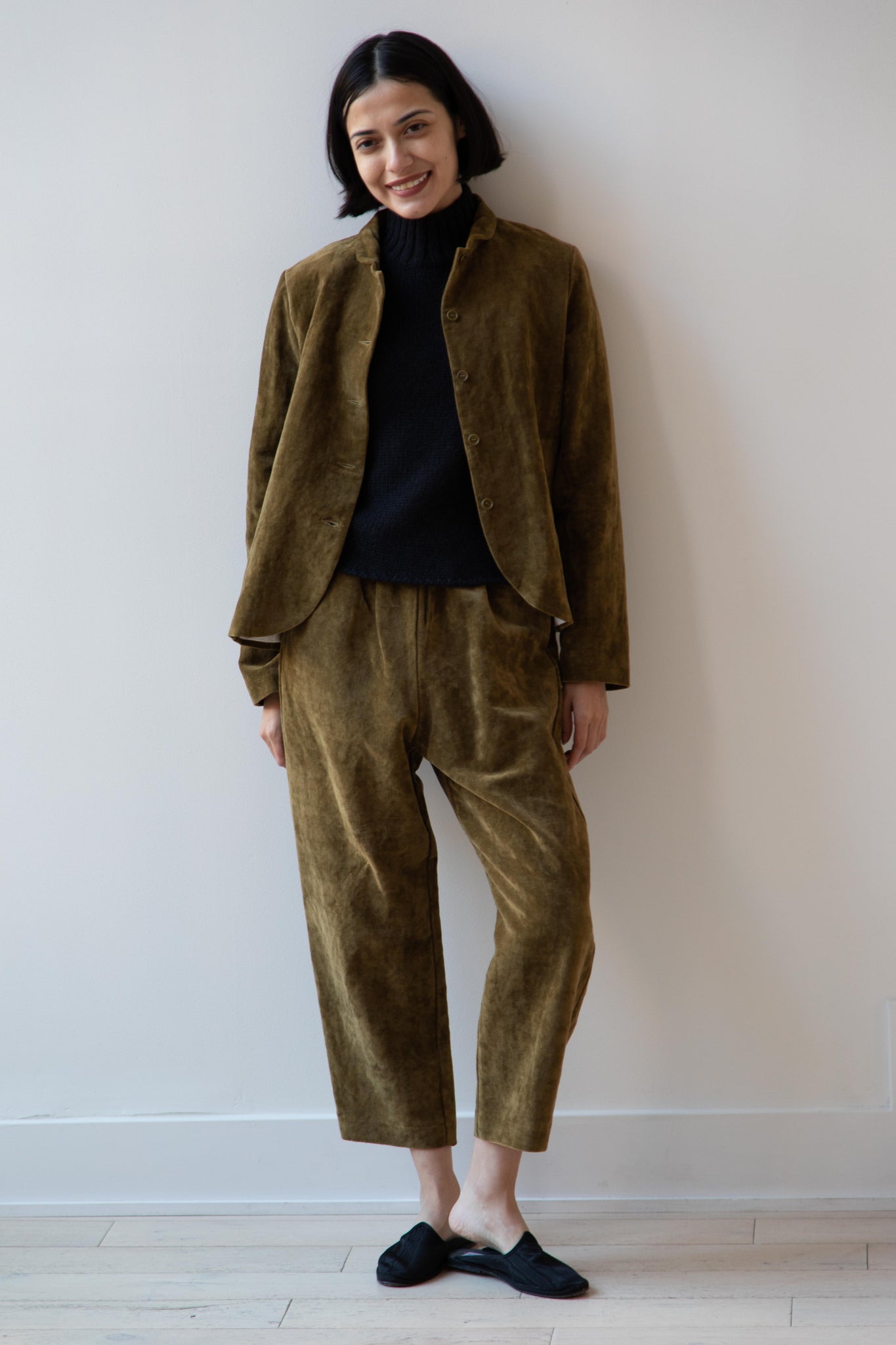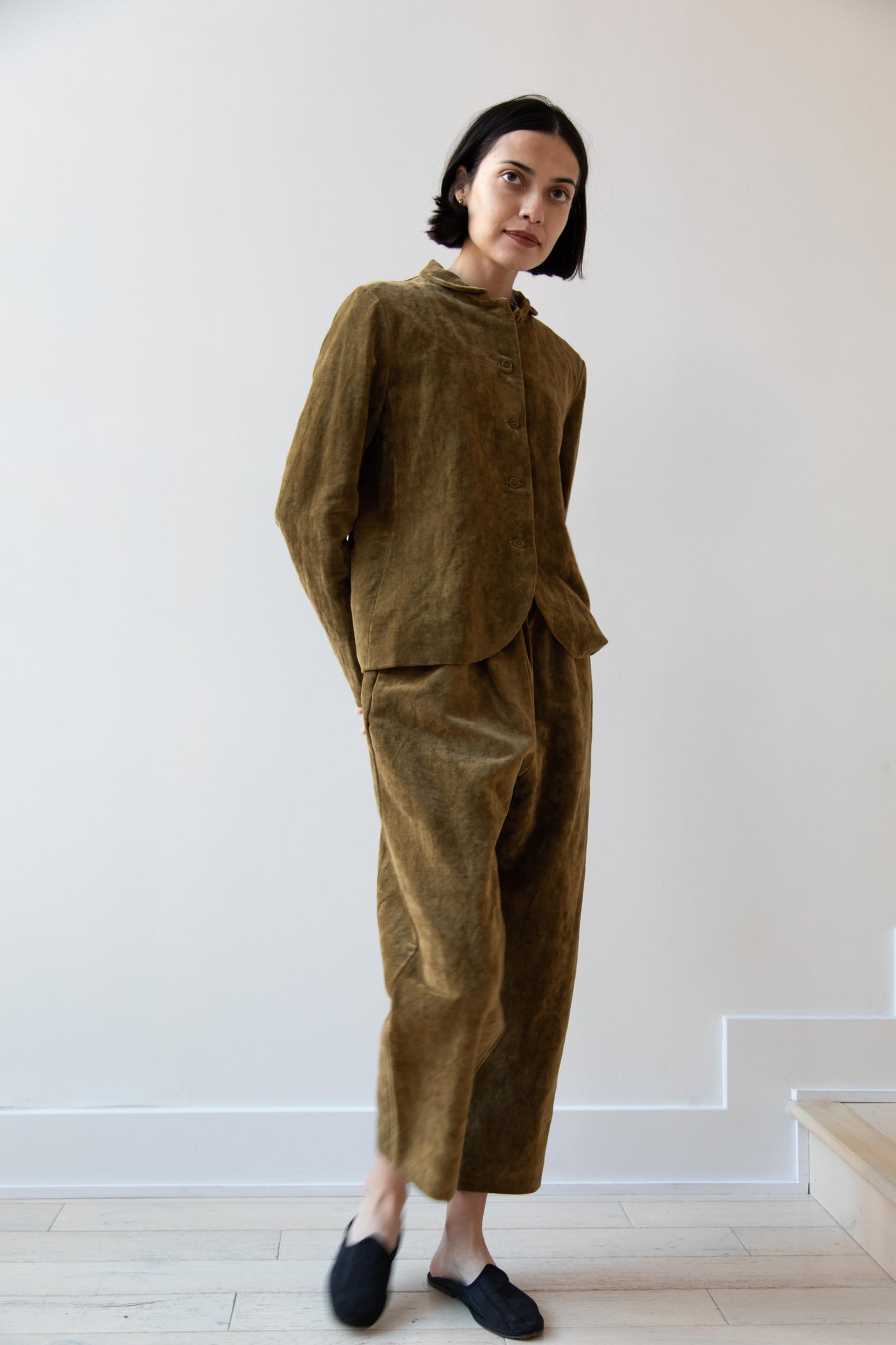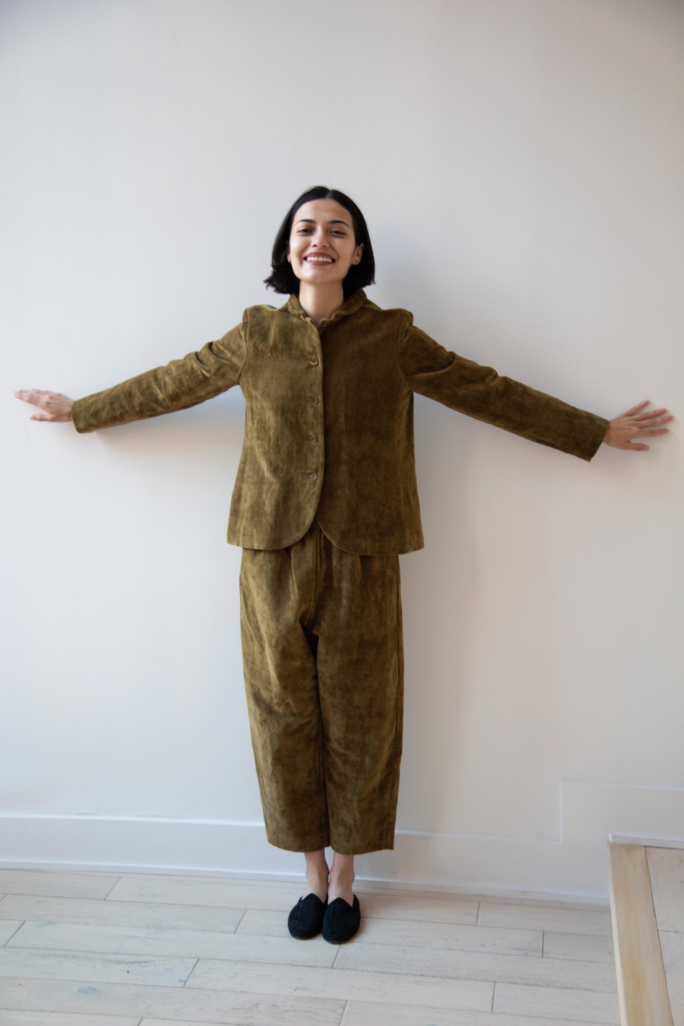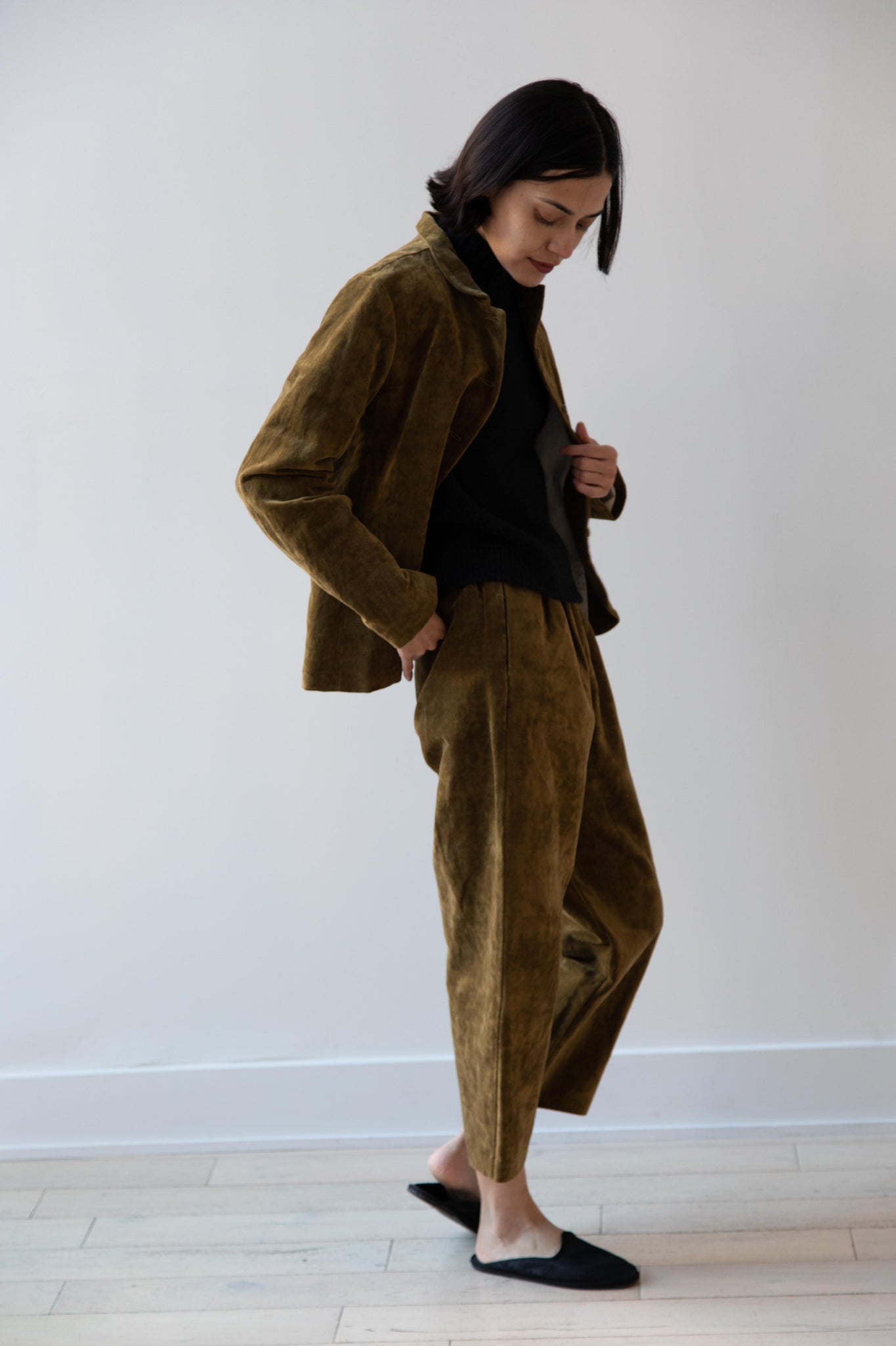 Apuntob's classic straight leg cropped trouser is back this season in a beautiful crushed cotton linen velvet.  They have an elastic waist and side pockets.  The color is a golden olive and can look different in different lights and is hard to capture precisely in photos; the designer's color is called forest.