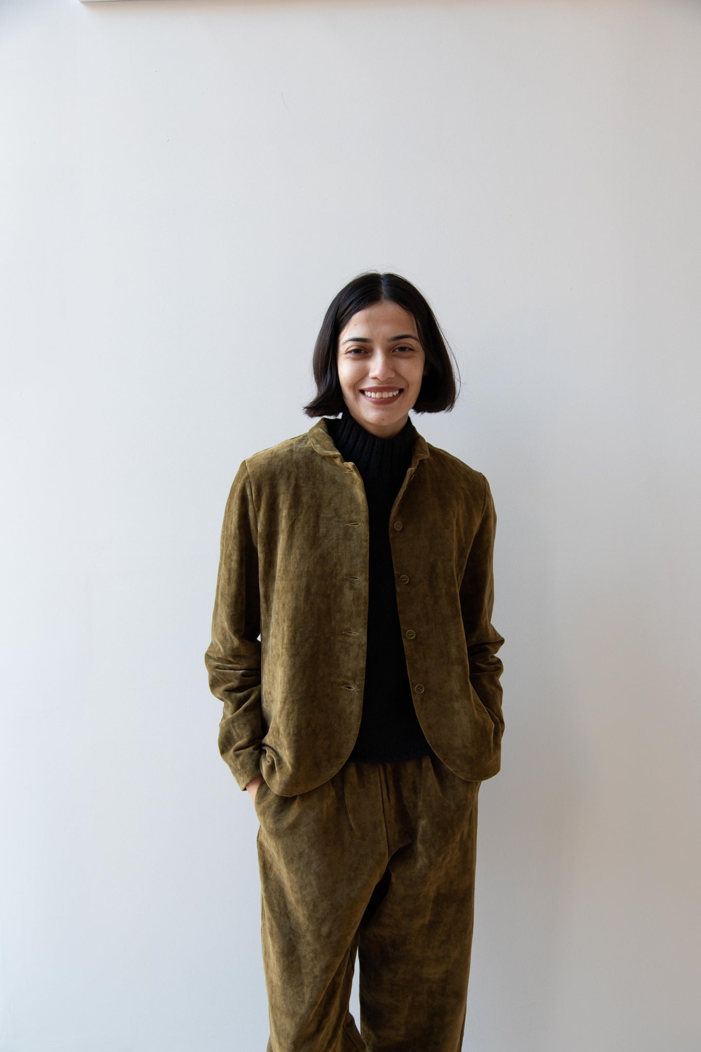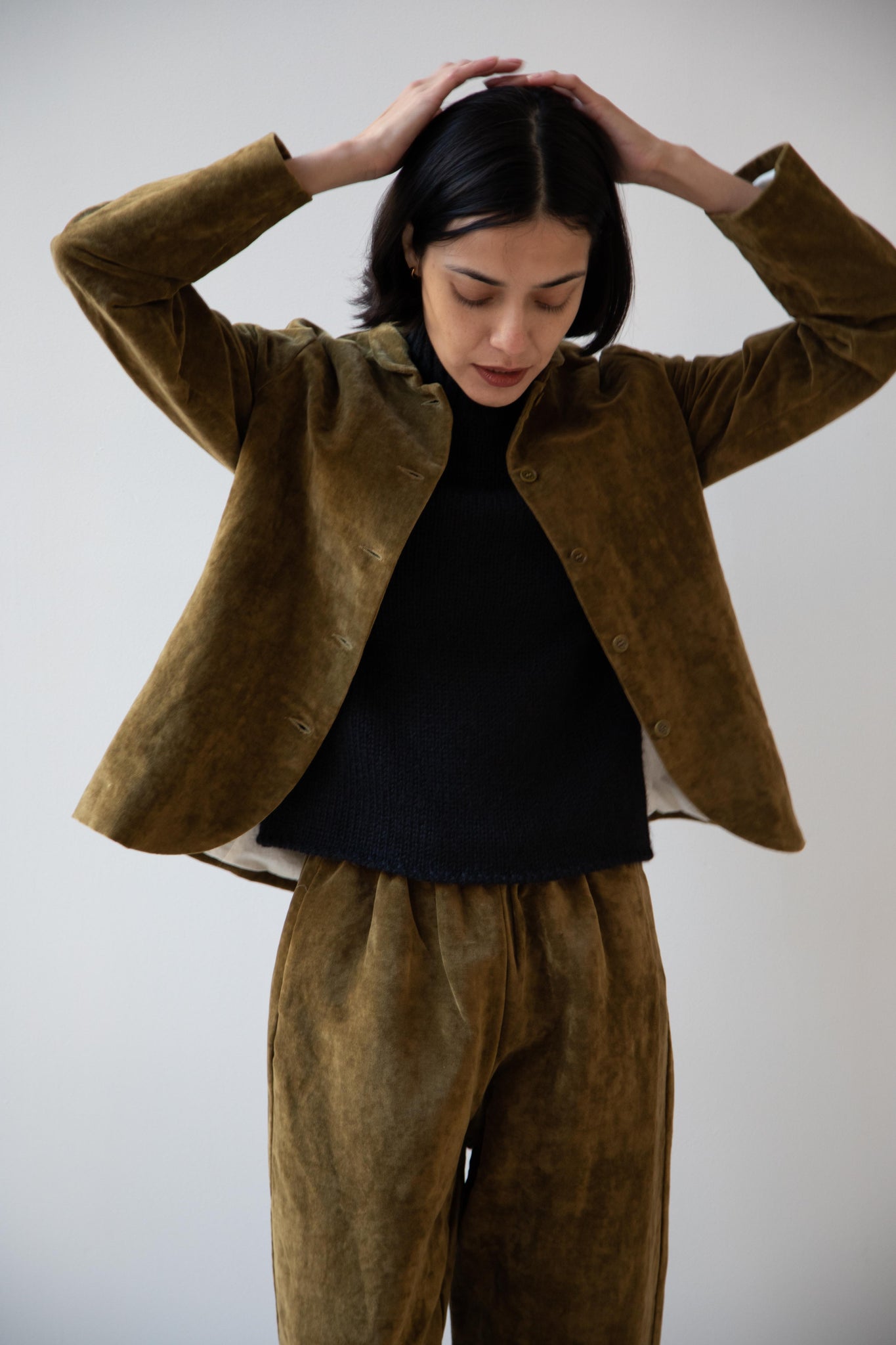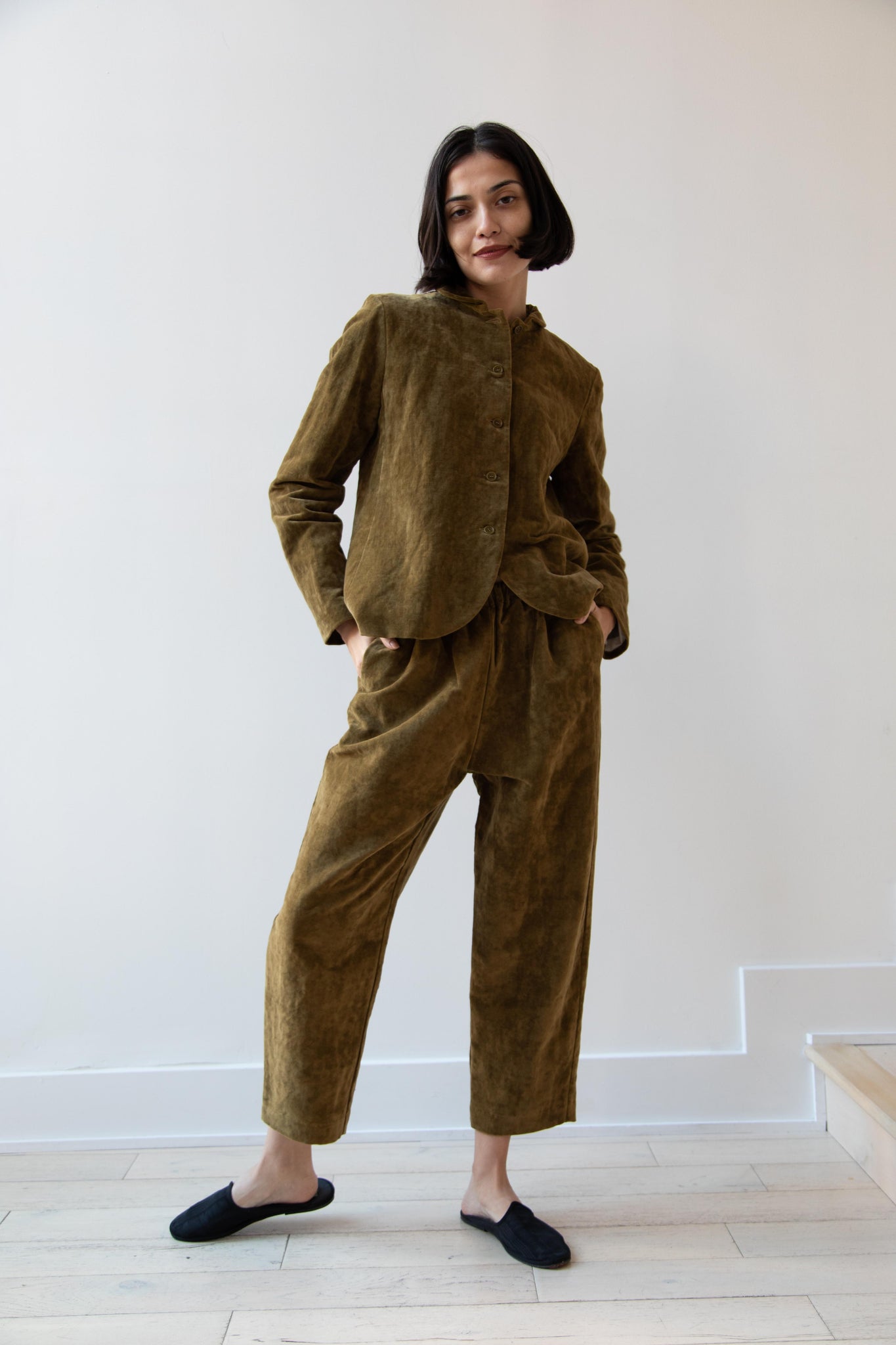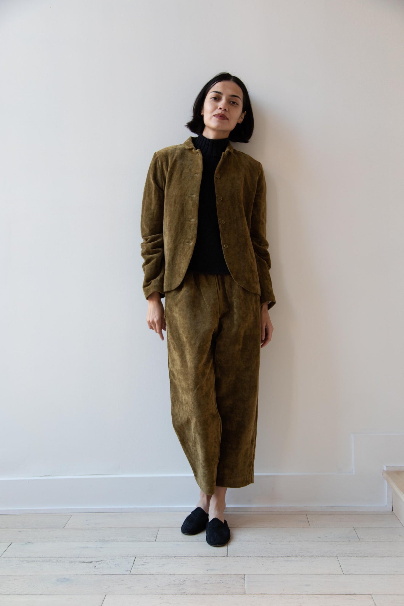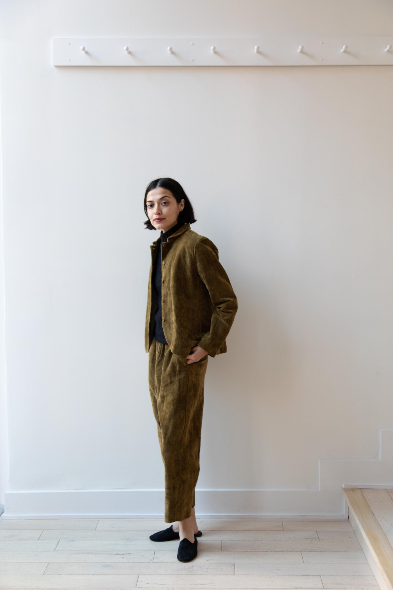Apuntob's classic straight leg cropped trouser is back this season in a beautiful crushed cotton linen velvet.  They have an elastic waist and side pockets.  The color is a golden olive and can look different in different lights and is hard to capture precisely in photos; the designer's color is called forest.