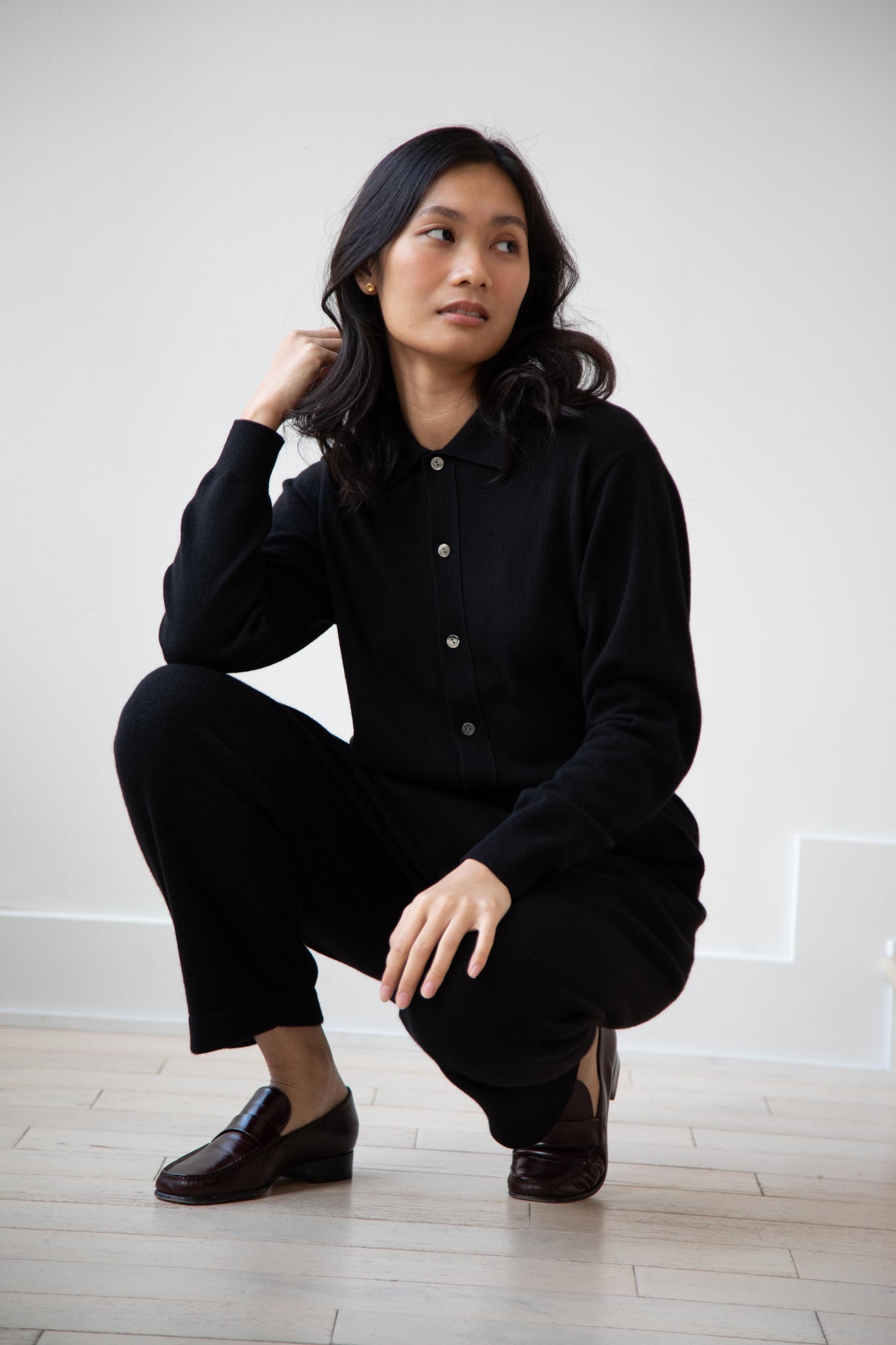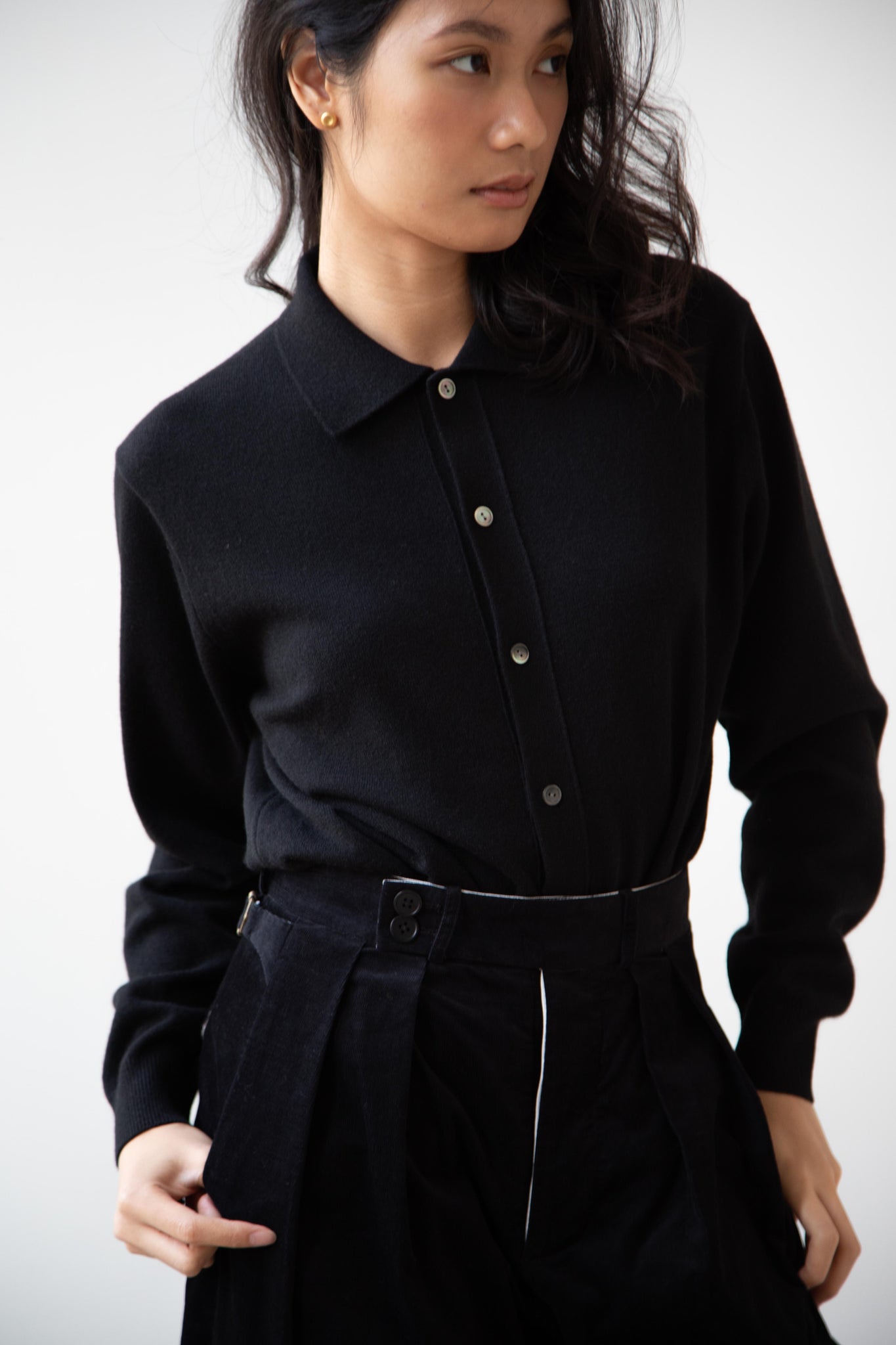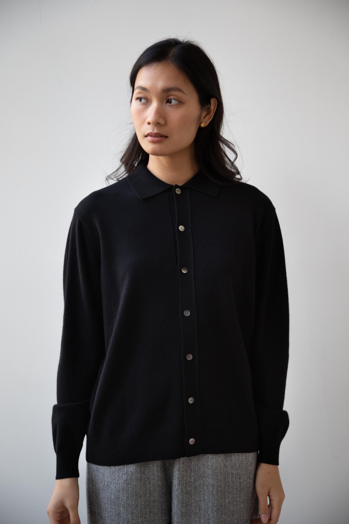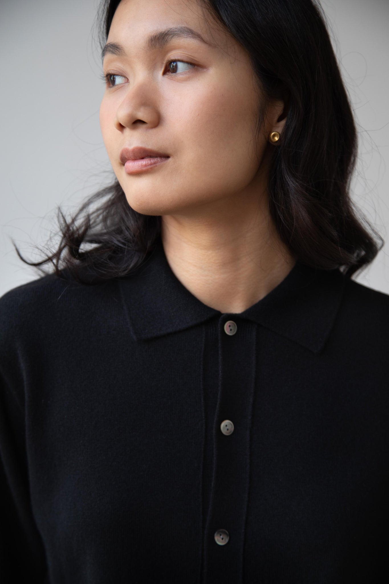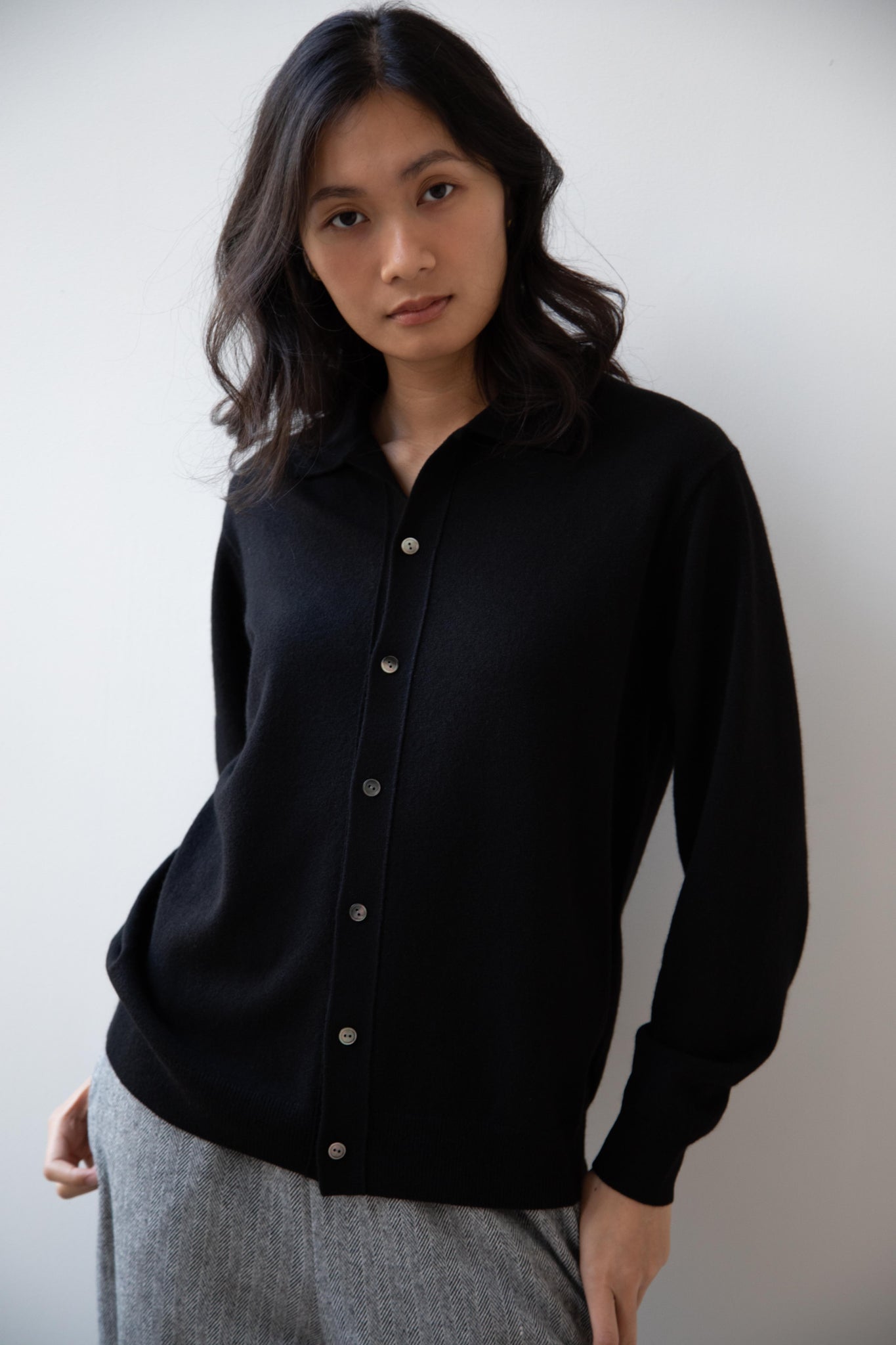This polo sweater is simple and very special. Made from a soft cashmere, this style features a button up front so you can wear this as a shirt or a cardigan. This medium weight knit is also perfect for tucking into trousers or skirts, so it's a great layering piece.