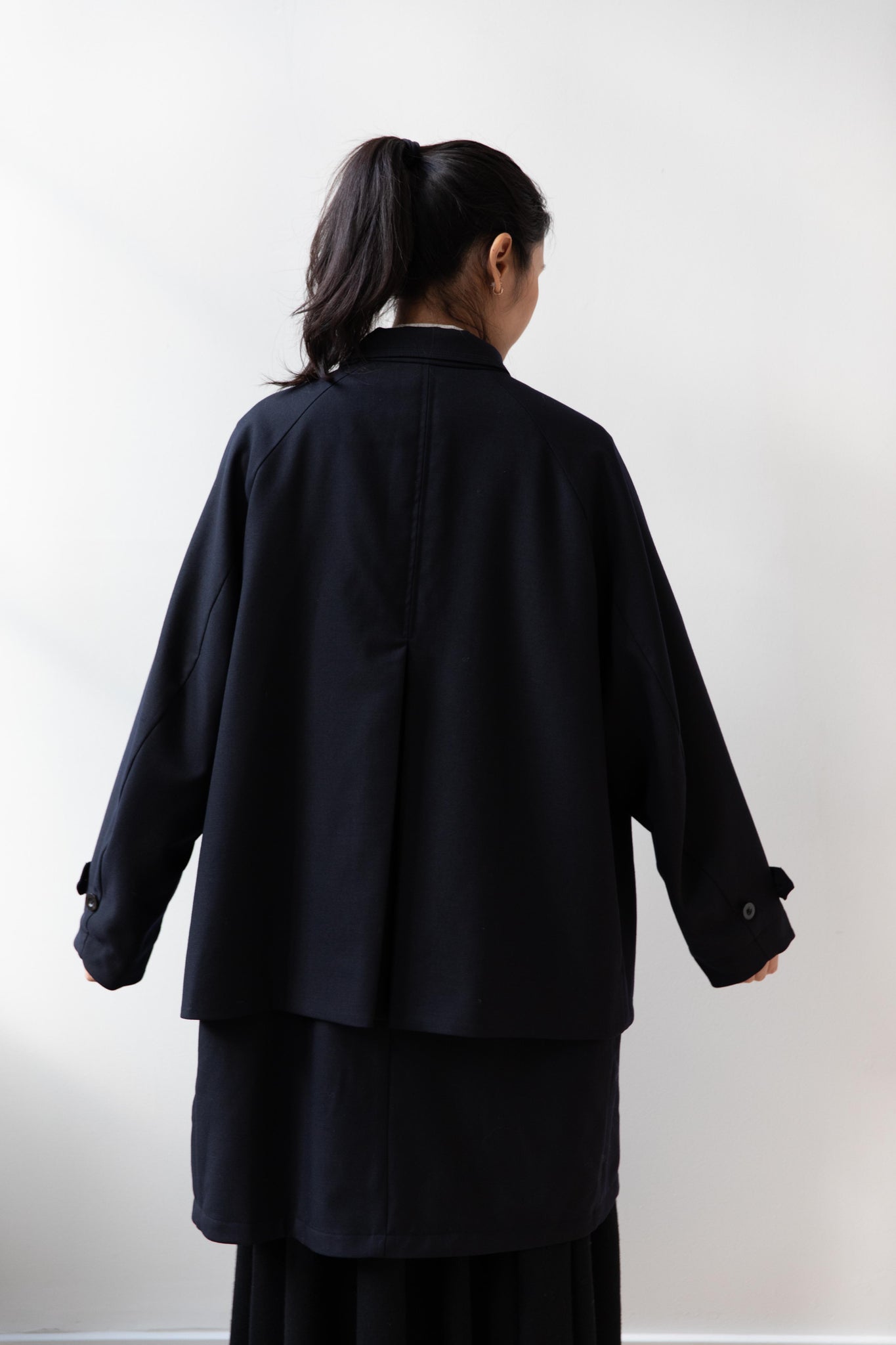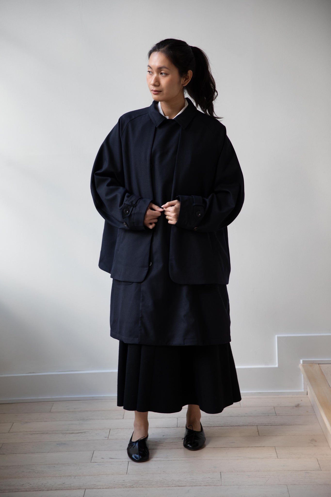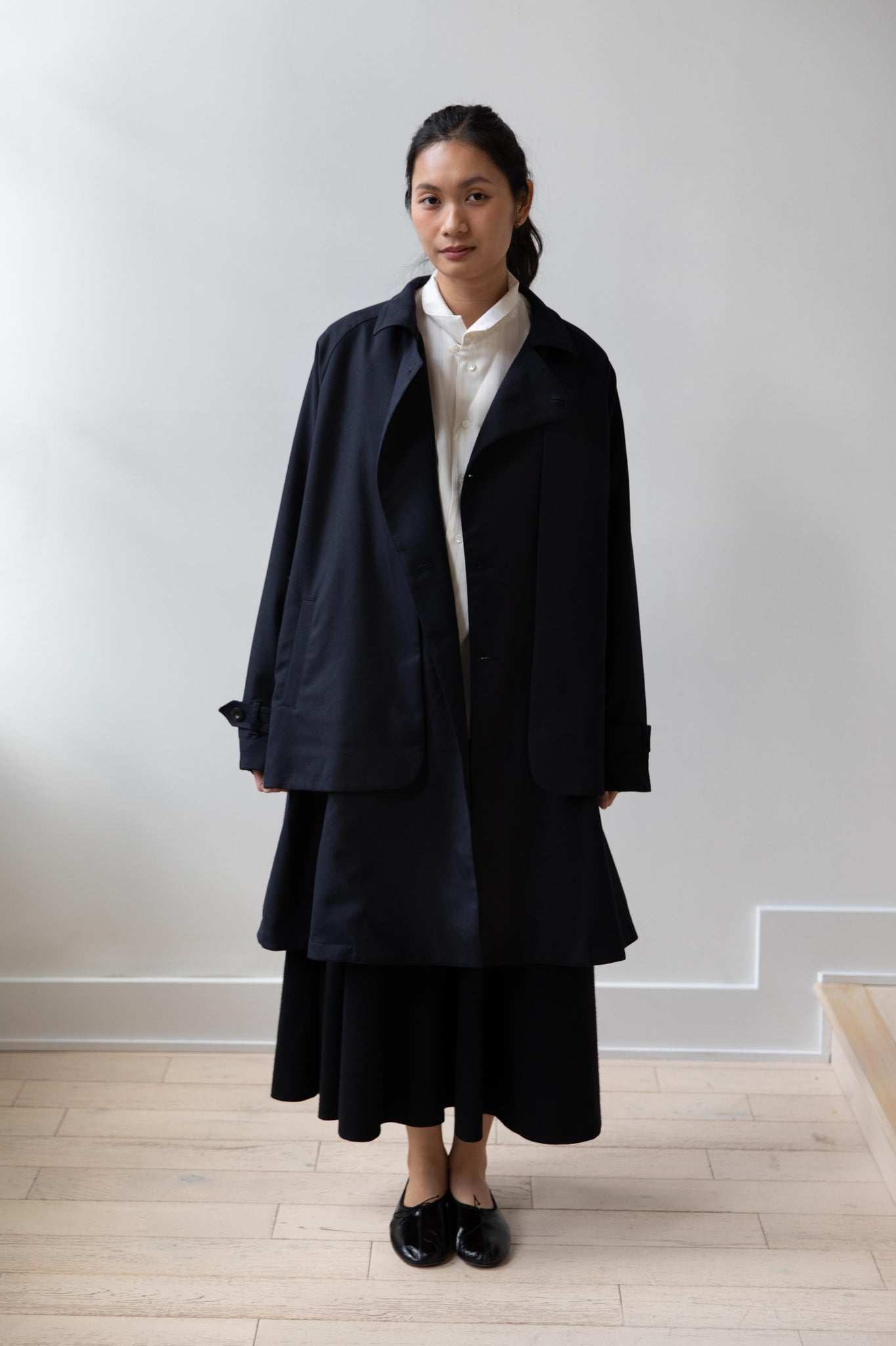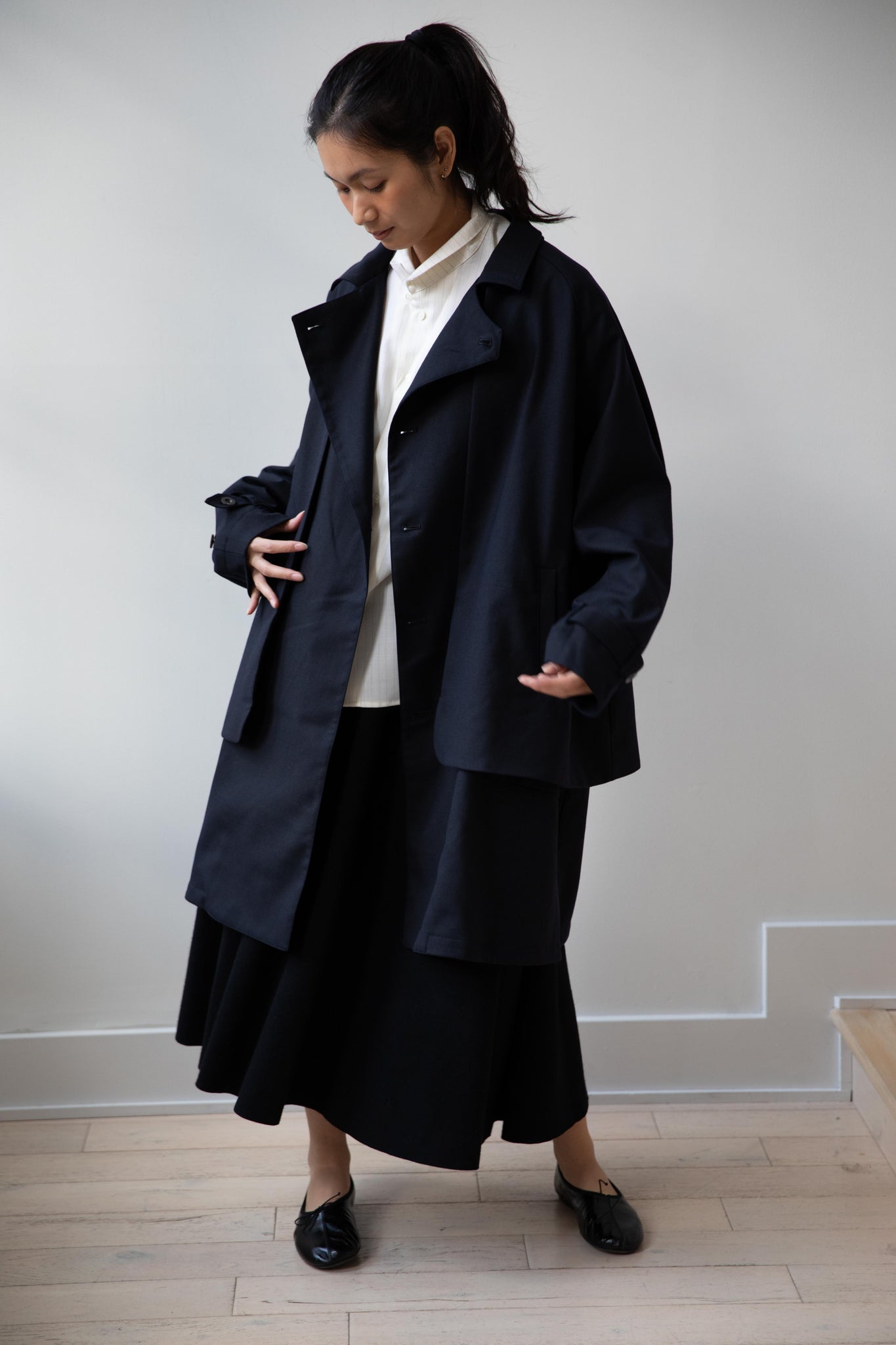 We are obsessed with this coat. Made of a twill wool blend, it has a unique, layered style silhouette.  There are front flaps that cover the body of the coat, which underneath is more like a vest - perhaps not easy to describe - but easier to understand in person - but trust us - it's super nifty.  There is an asymmetric button closure up the front.  The shape has a slight swing to it and the fabric drapes beautifully.