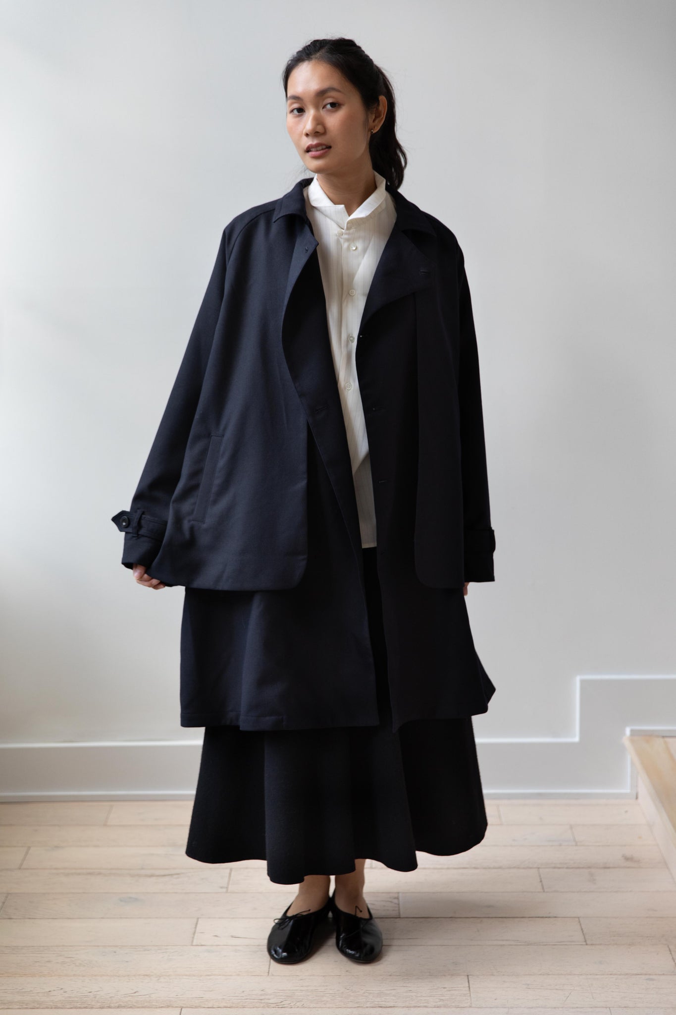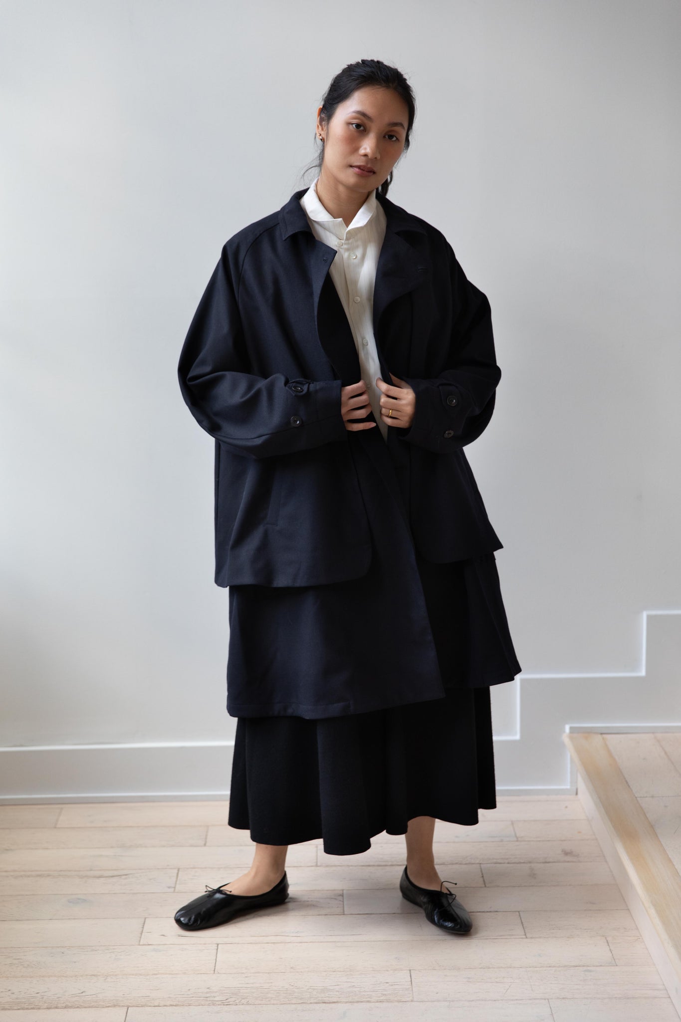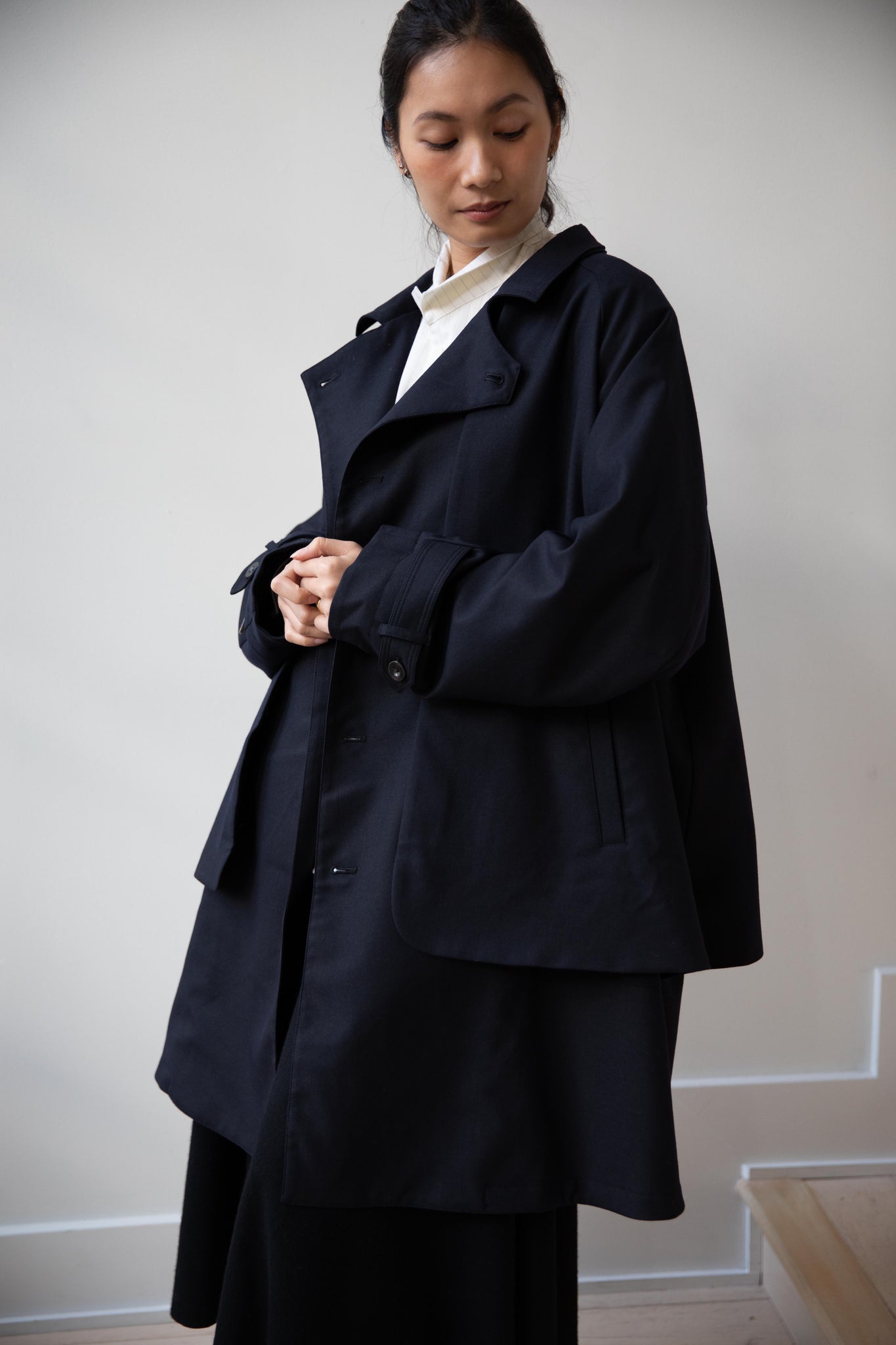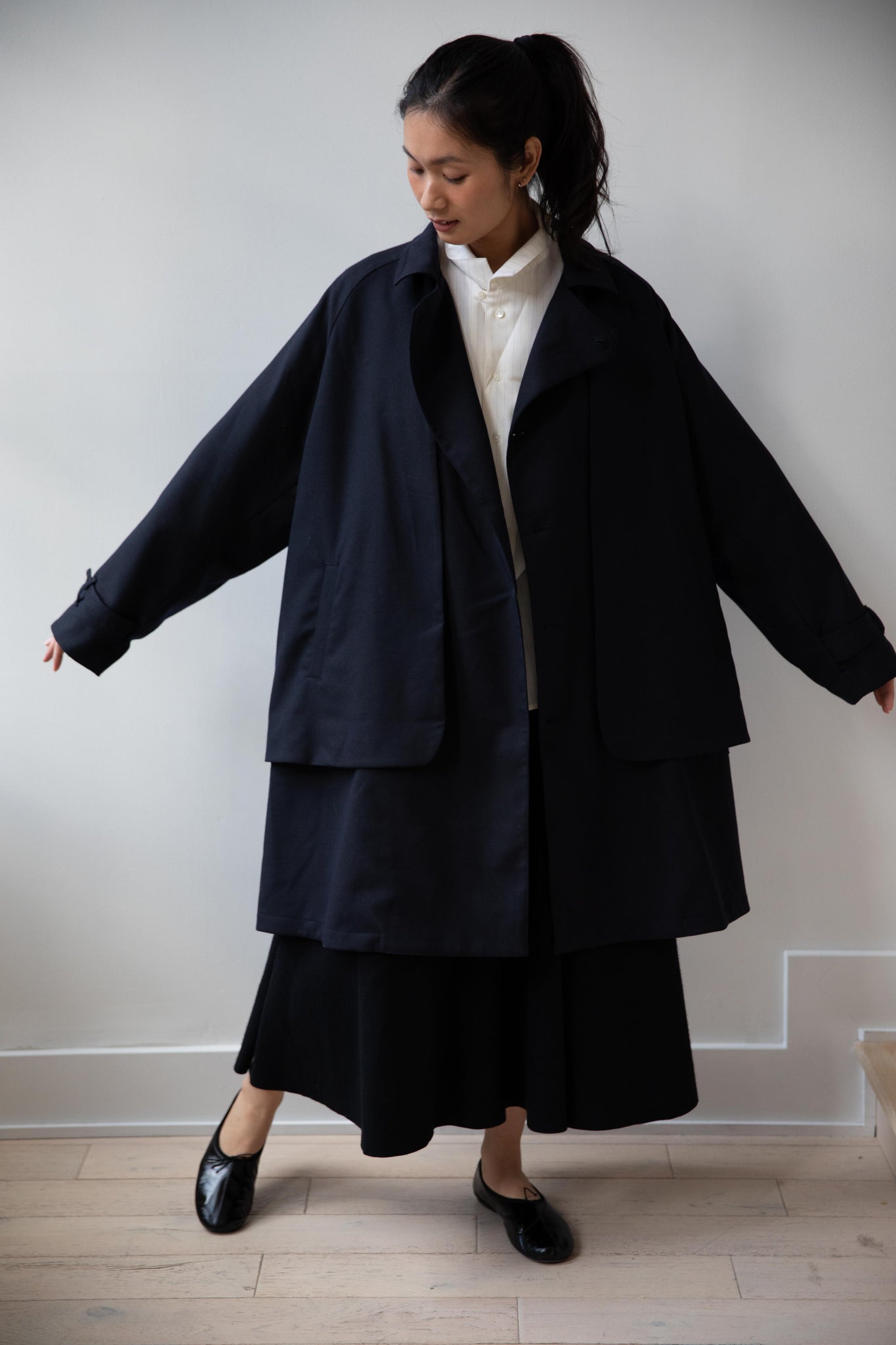 We are obsessed with this coat. Made of a twill wool blend, it has a unique, layered style silhouette.  There are front flaps that cover the body of the coat, which underneath is more like a vest - perhaps not easy to describe - but easier to understand in person - but trust us - it's super nifty.  There is an asymmetric button closure up the front.  The shape has a slight swing to it and the fabric drapes beautifully.