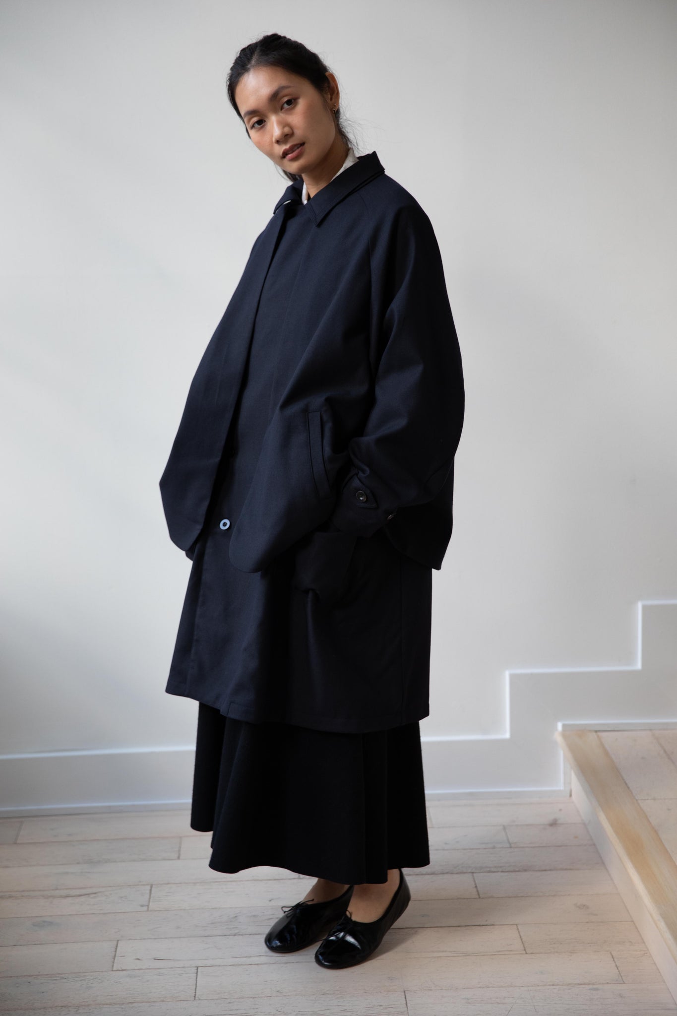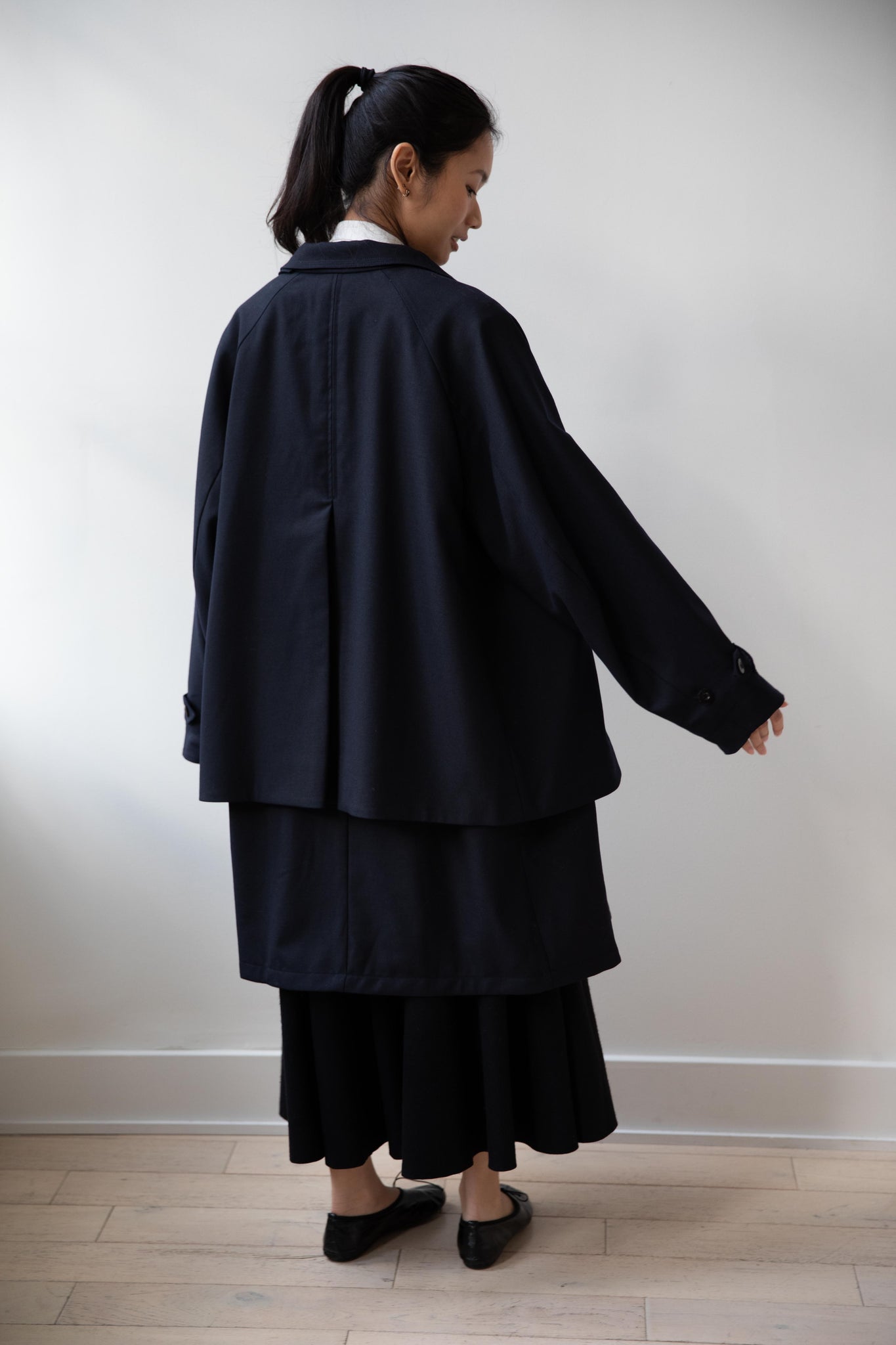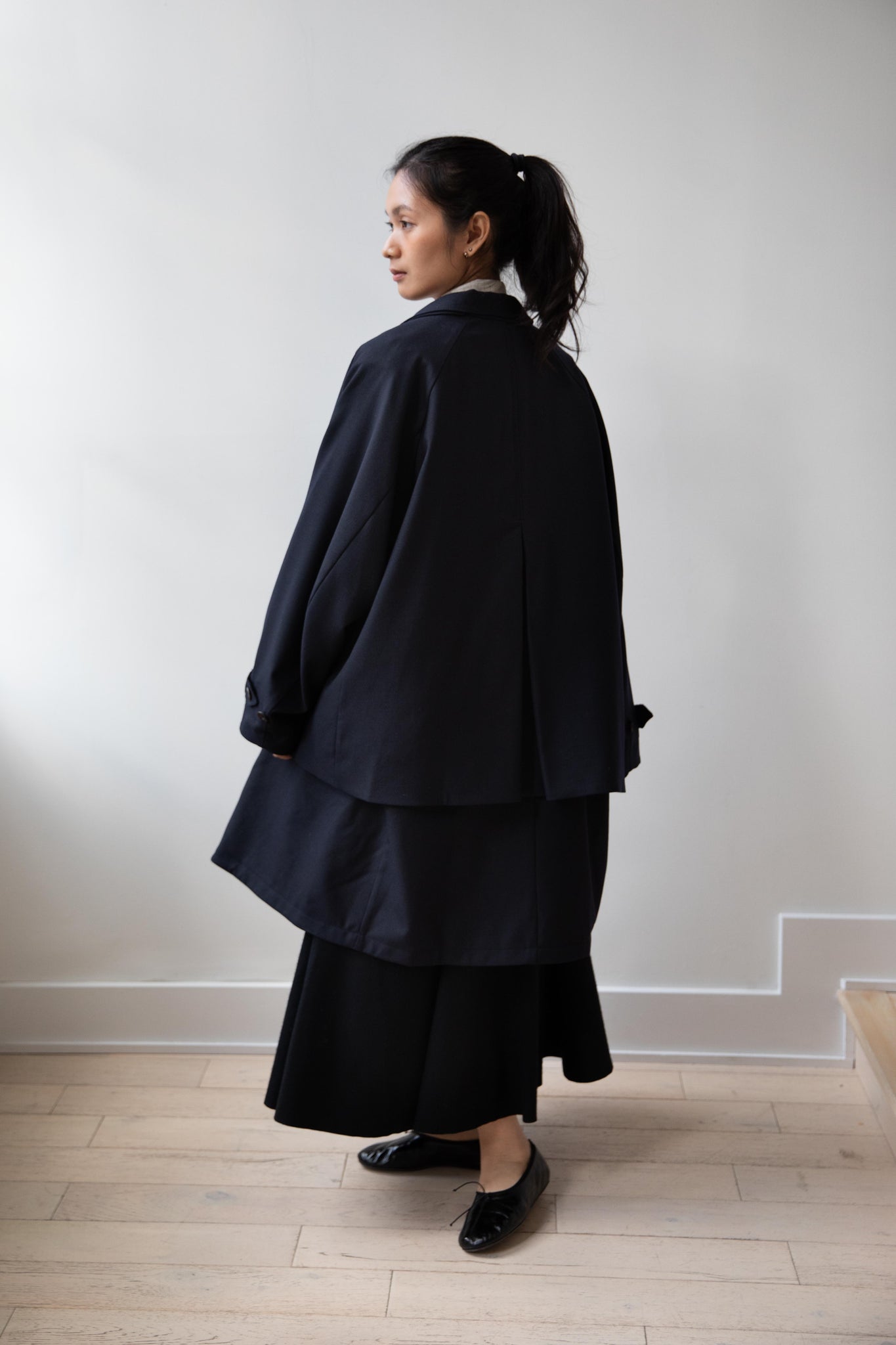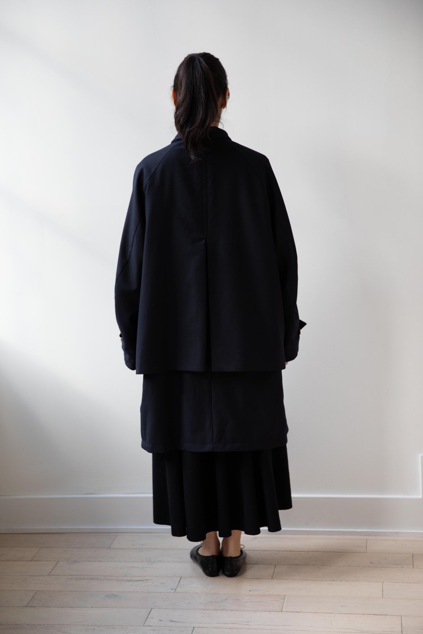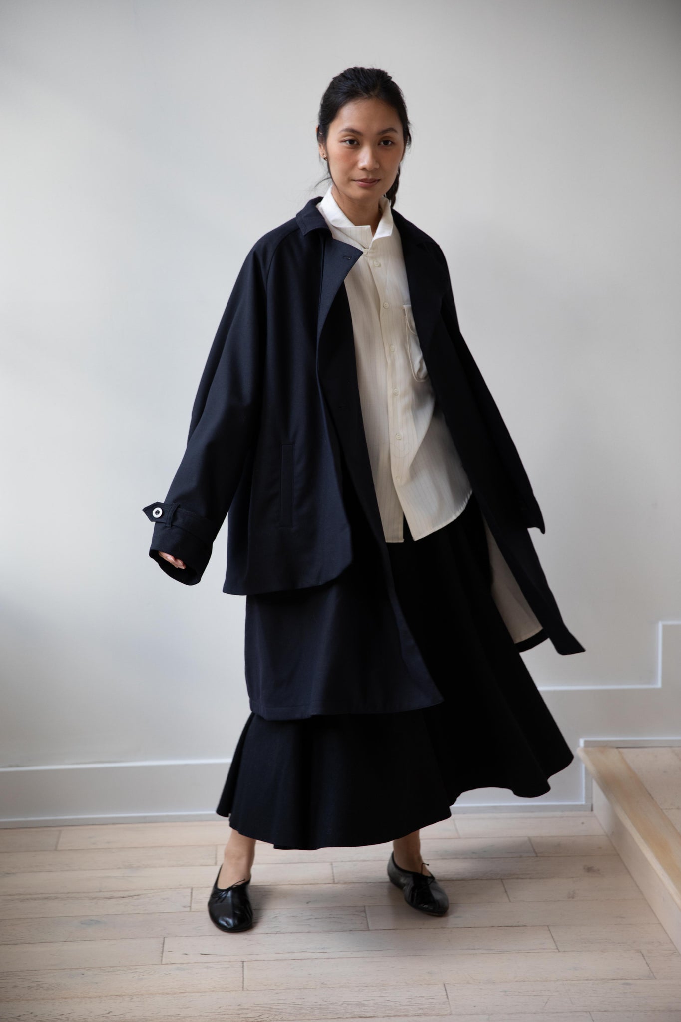 We are obsessed with this coat. Made of a twill wool blend, it has a unique, layered style silhouette.  There are front flaps that cover the body of the coat, which underneath is more like a vest - perhaps not easy to describe - but easier to understand in person - but trust us - it's super nifty.  There is an asymmetric button closure up the front.  The shape has a slight swing to it and the fabric drapes beautifully.