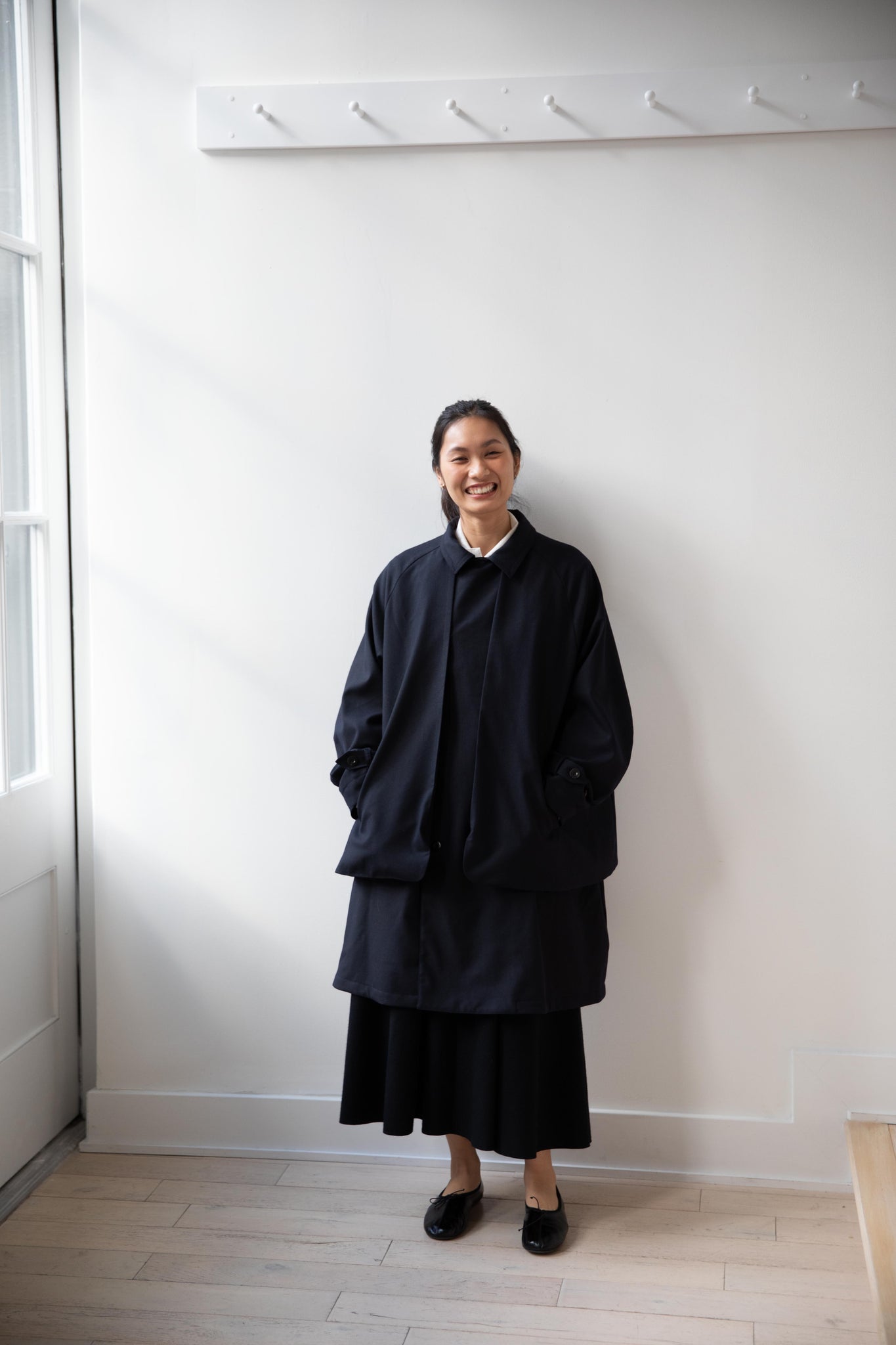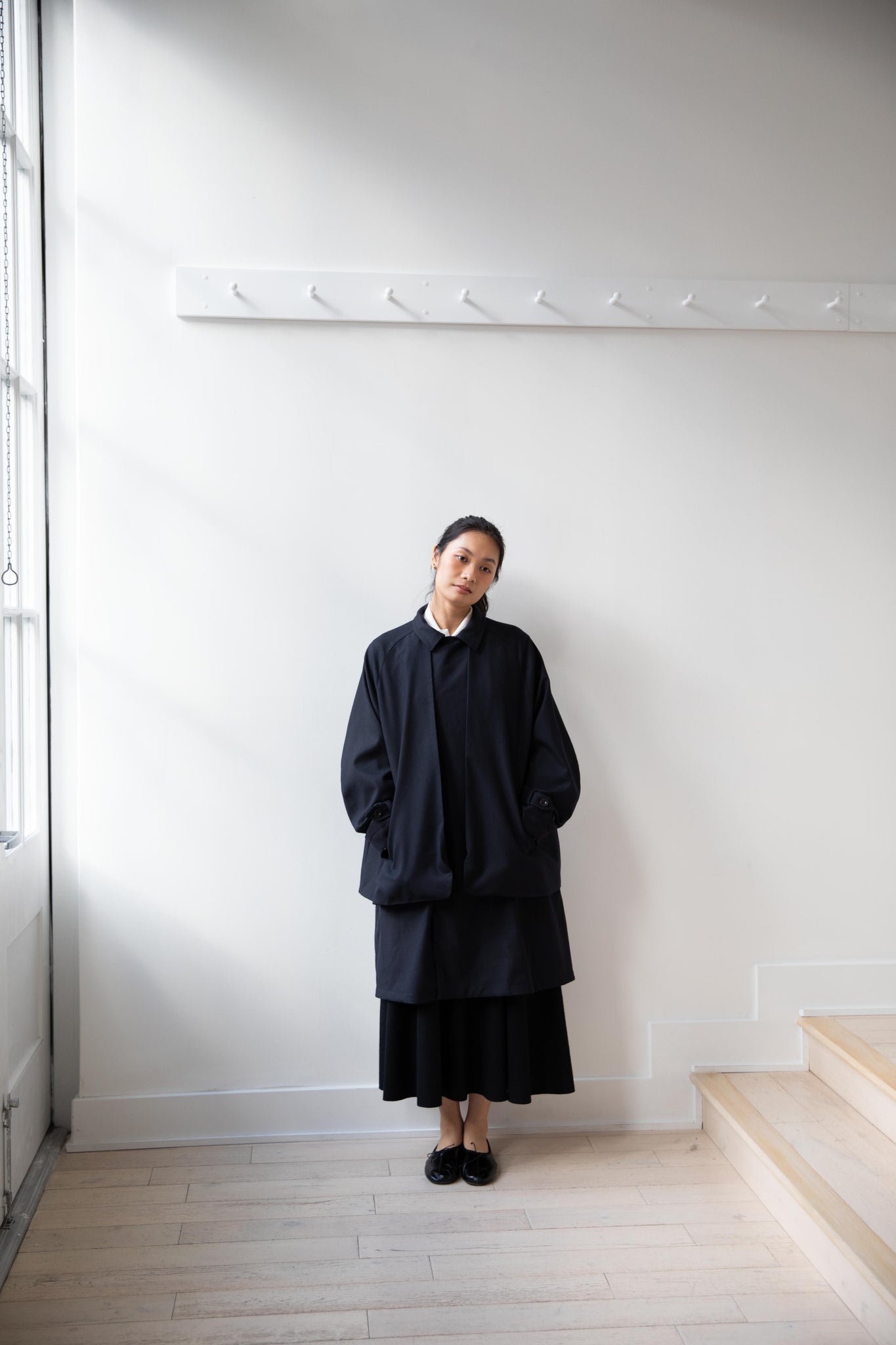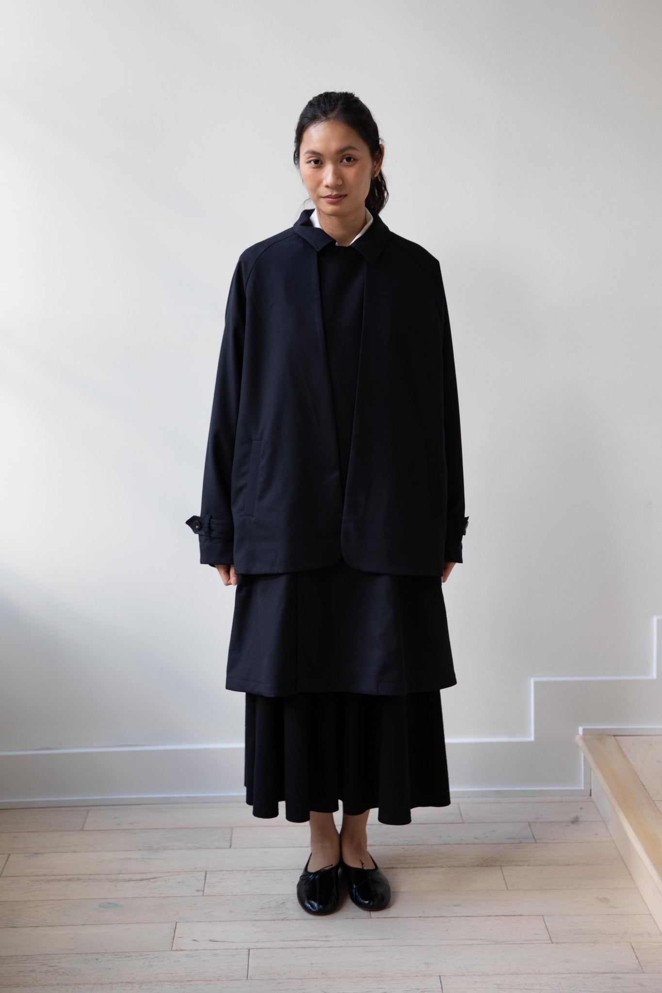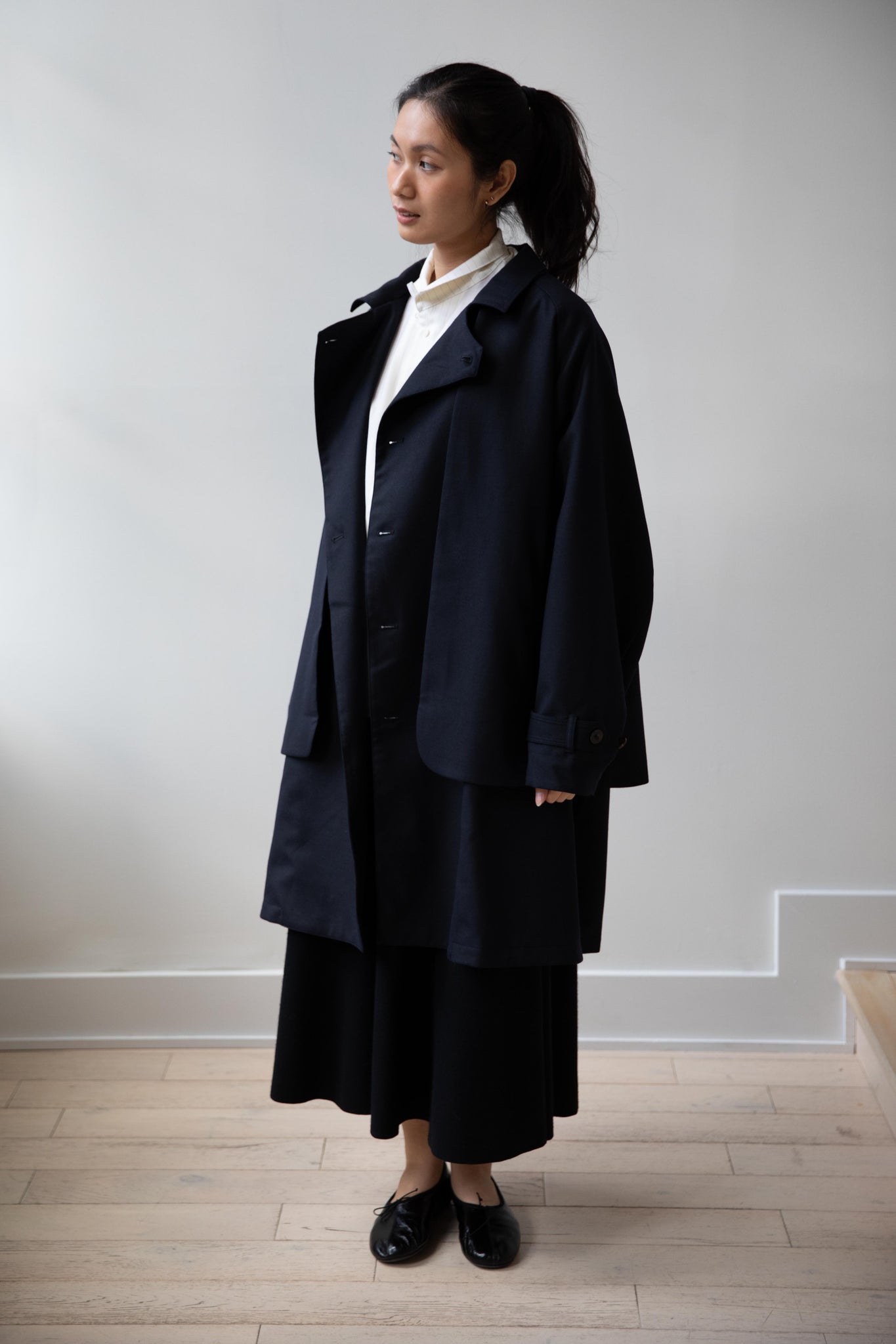 We are obsessed with this coat. Made of a twill wool blend, it has a unique, layered style silhouette.  There are front flaps that cover the body of the coat, which underneath is more like a vest - perhaps not easy to describe - but easier to understand in person - but trust us - it's super nifty.  There is an asymmetric button closure up the front.  The shape has a slight swing to it and the fabric drapes beautifully.