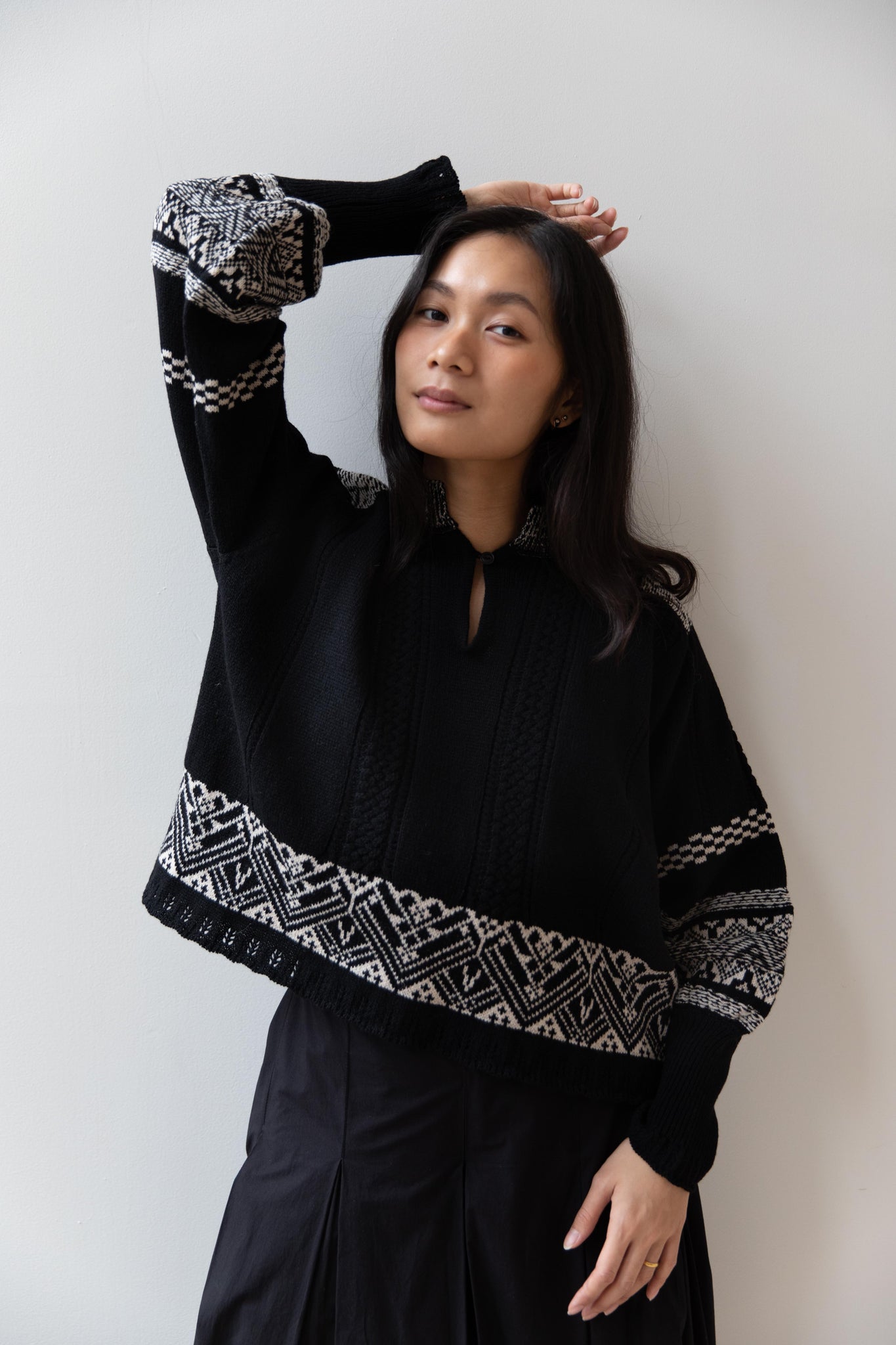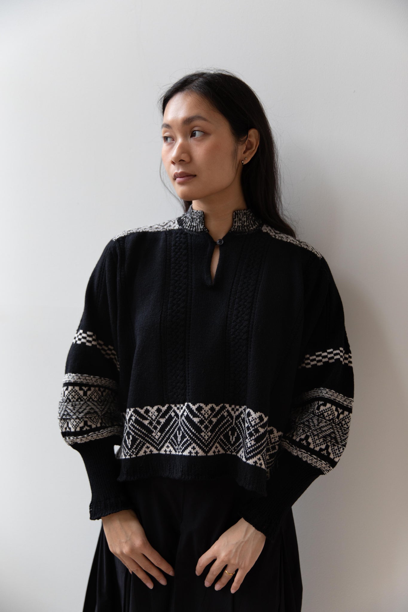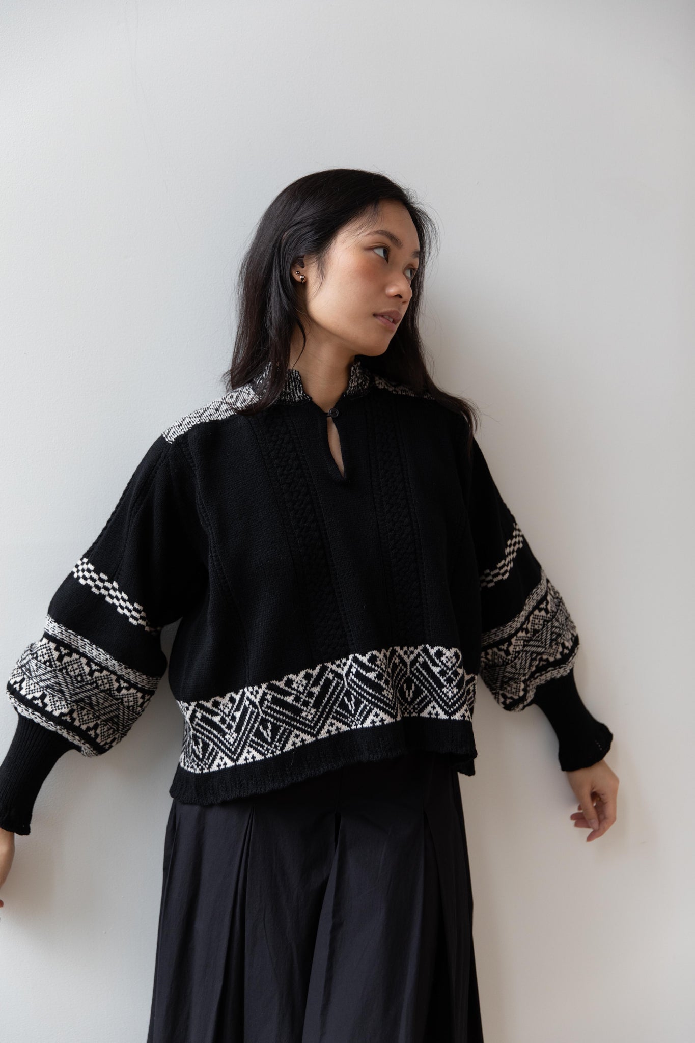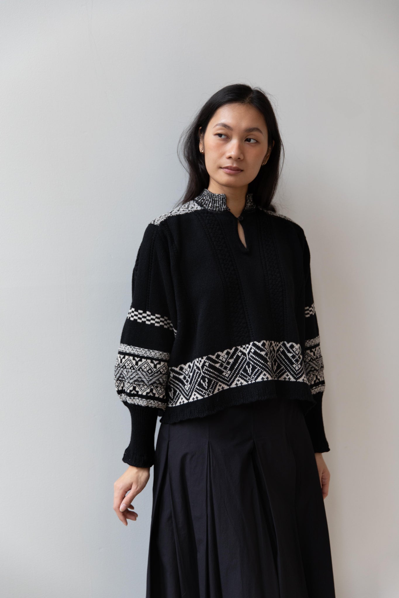 This fair isle knit is perfect. From the knit pattern to the silhouette, we can't imagine a better winter sweater. The sleeves stand out and have a beautiful balloon shape, along with slight scallop details on the wrist. There are small cables running throughout the sweater in addition to the fair isle pattern. There is one button at the neck and a small stand collar.