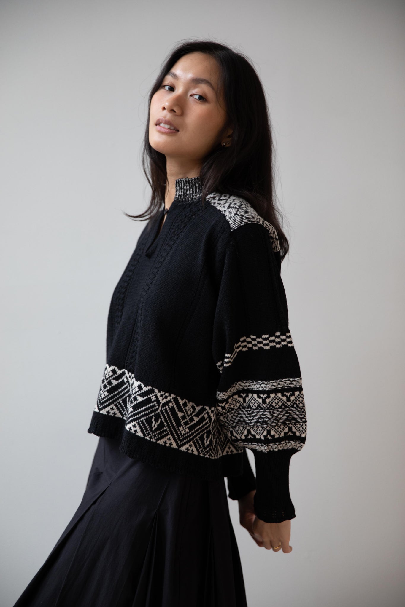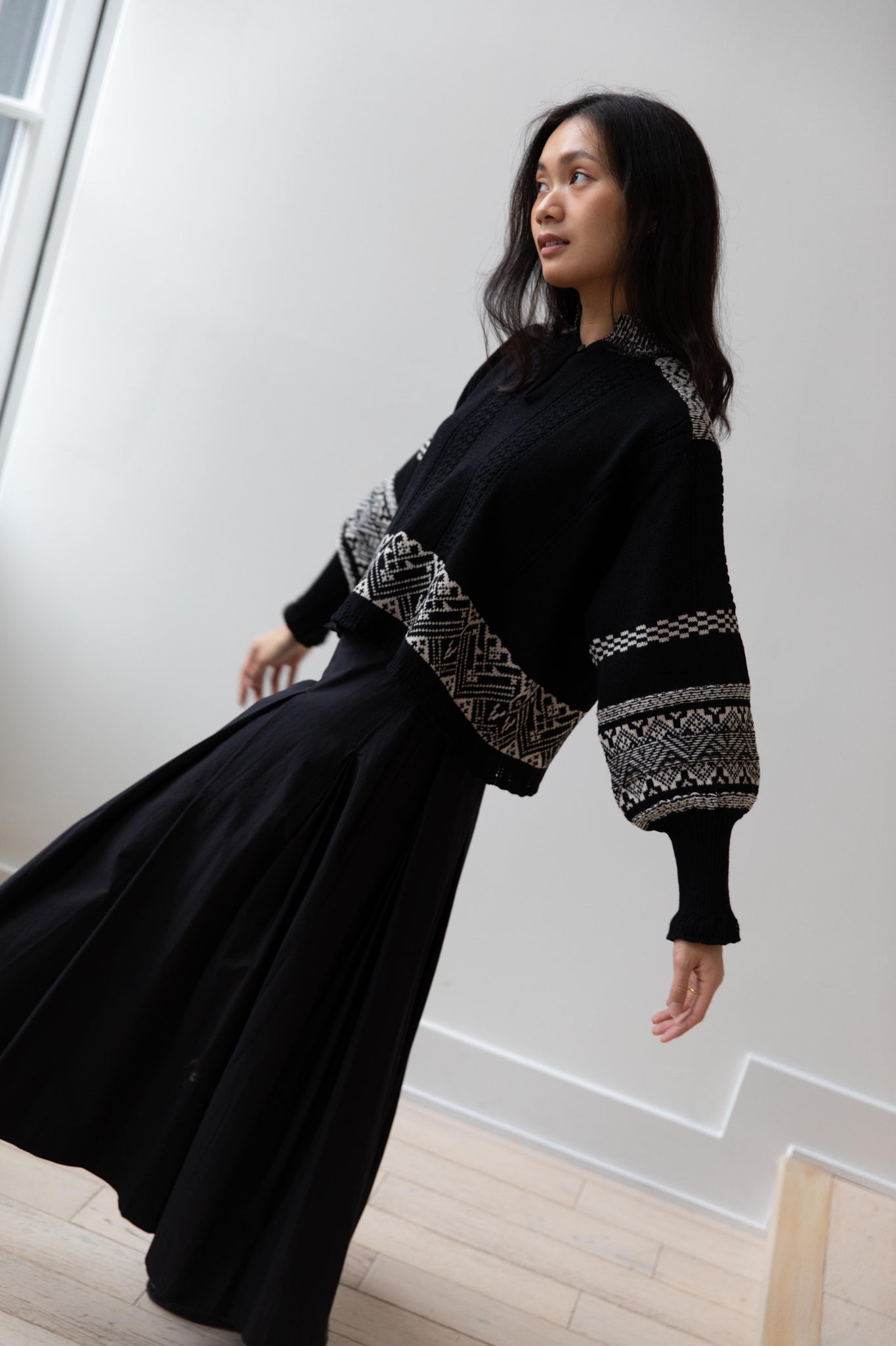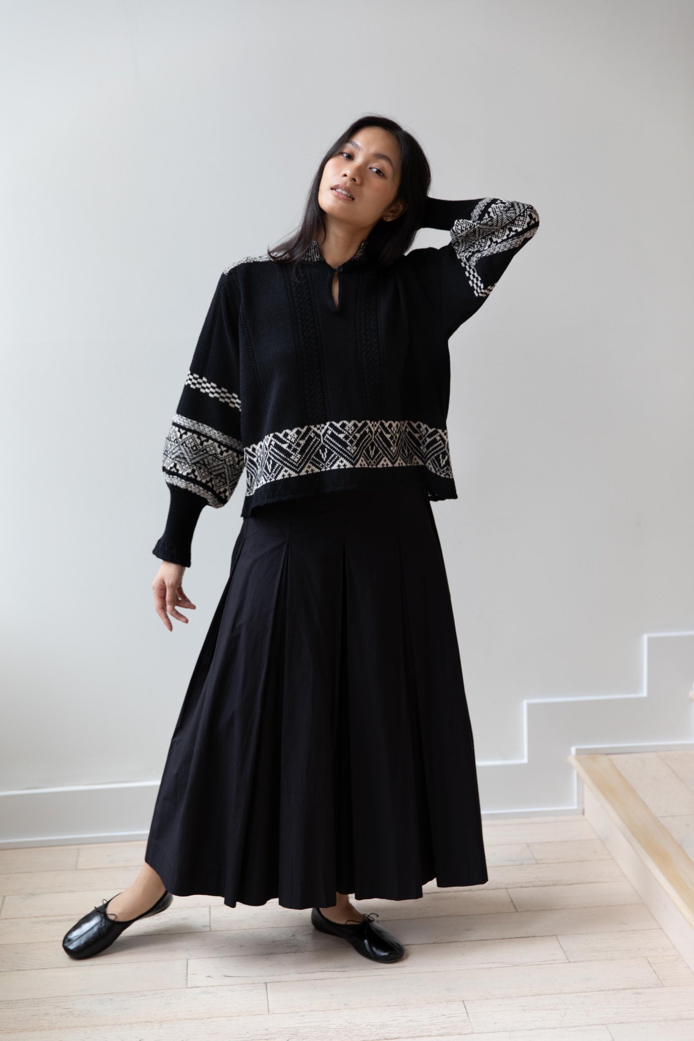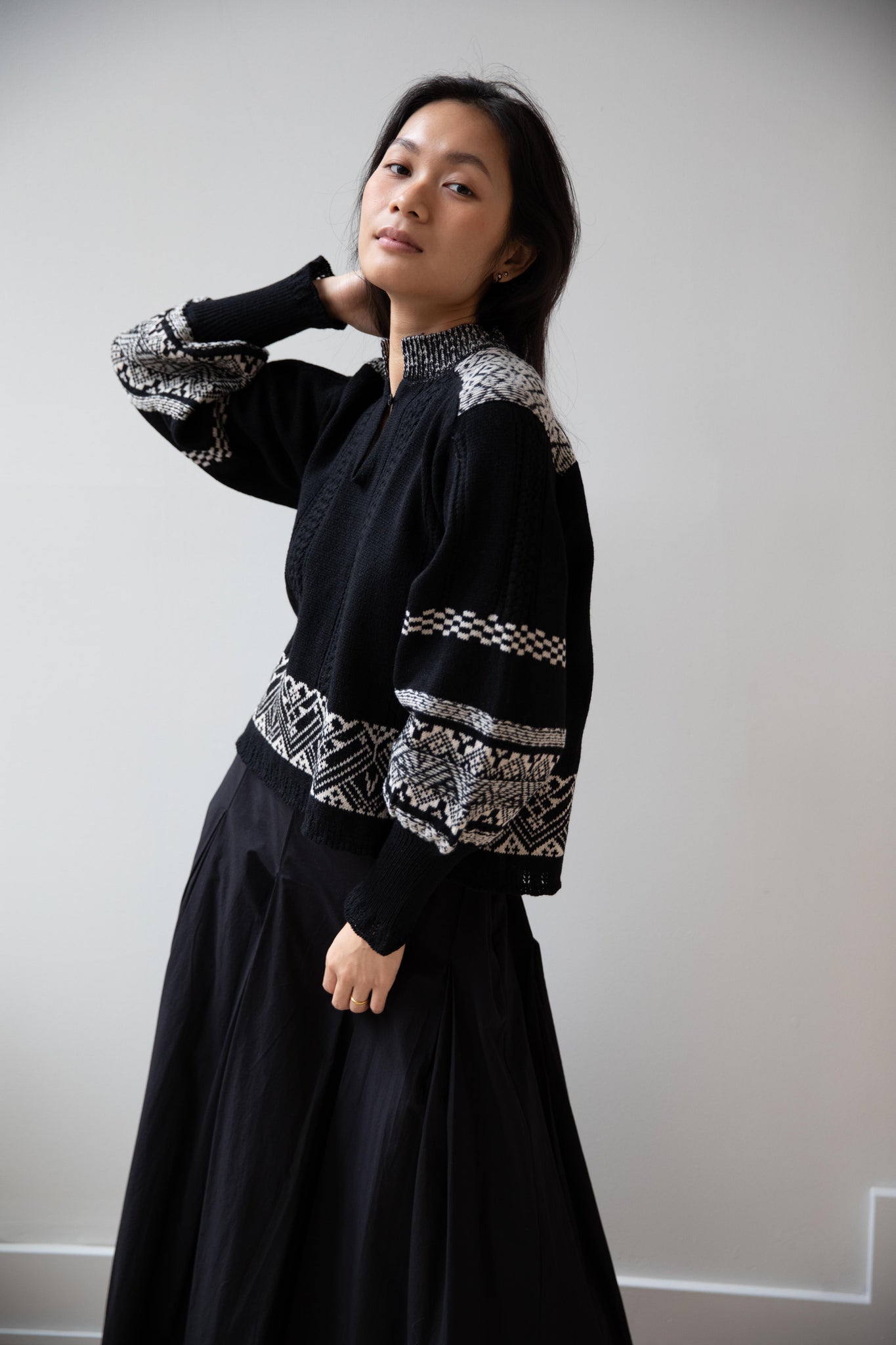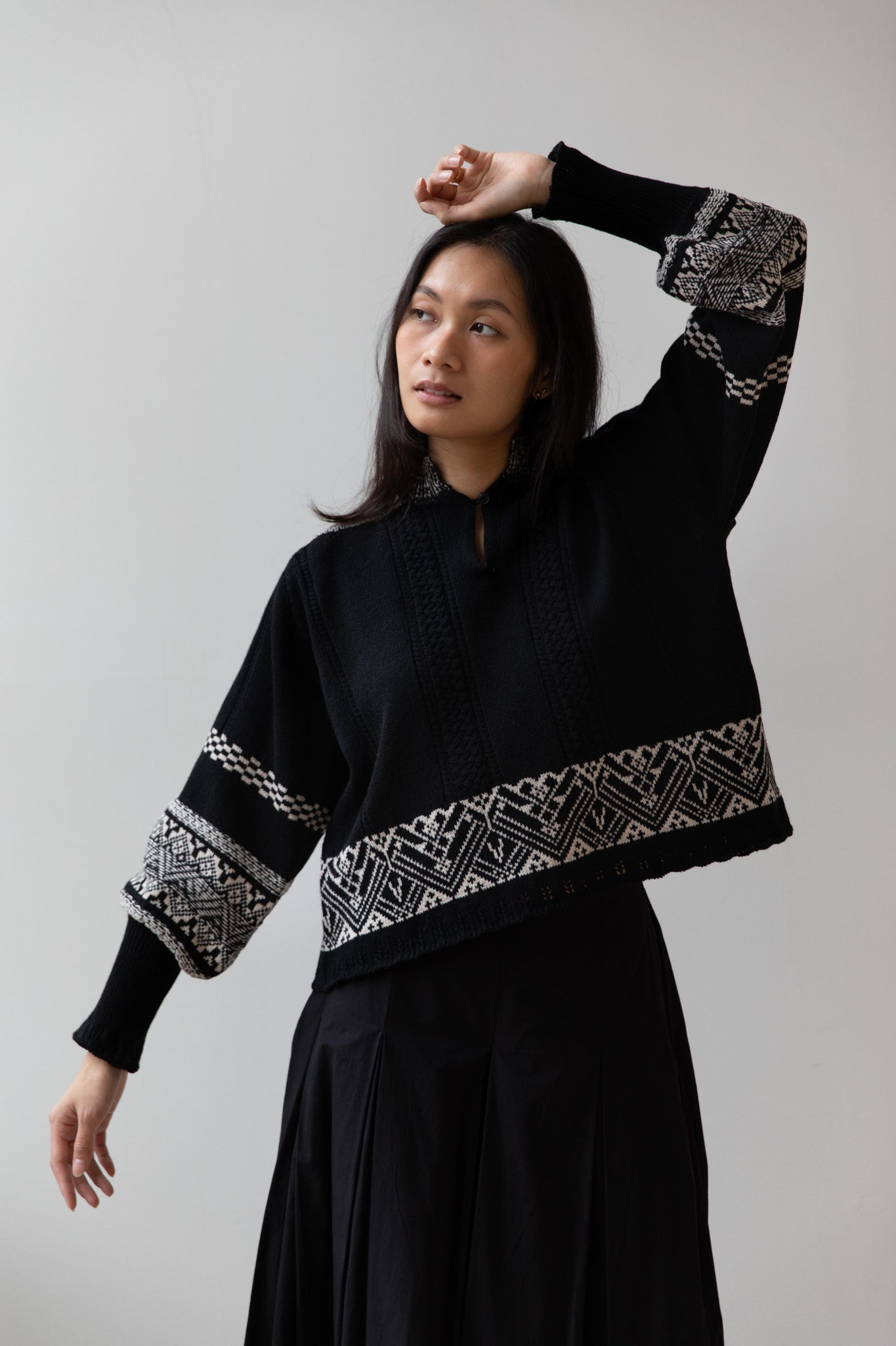 This fair isle knit is perfect. From the knit pattern to the silhouette, we can't imagine a better winter sweater. The sleeves stand out and have a beautiful balloon shape, along with slight scallop details on the wrist. There are small cables running throughout the sweater in addition to the fair isle pattern. There is one button at the neck and a small stand collar.
