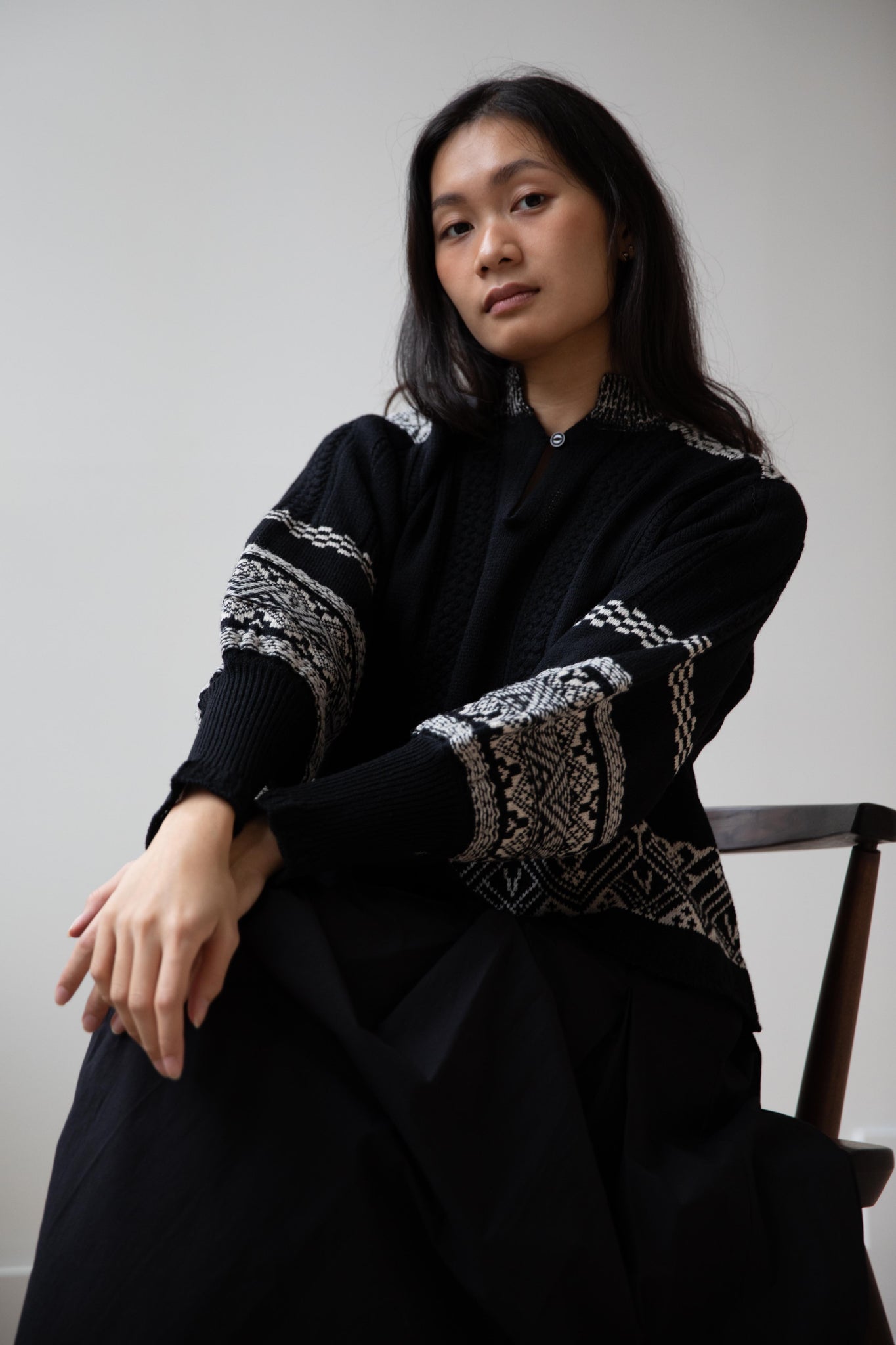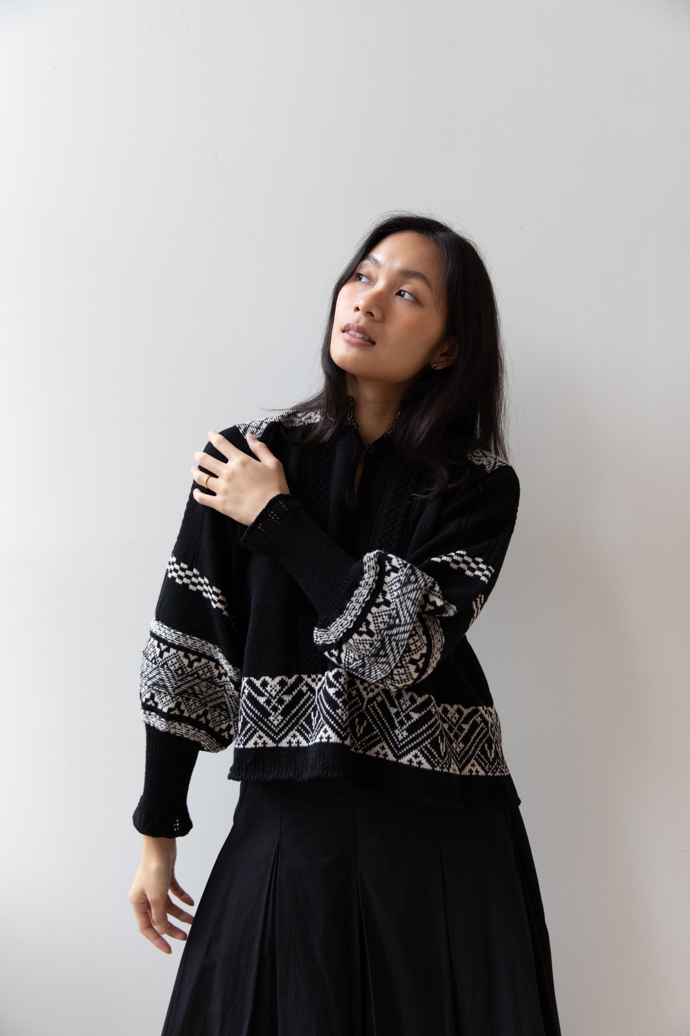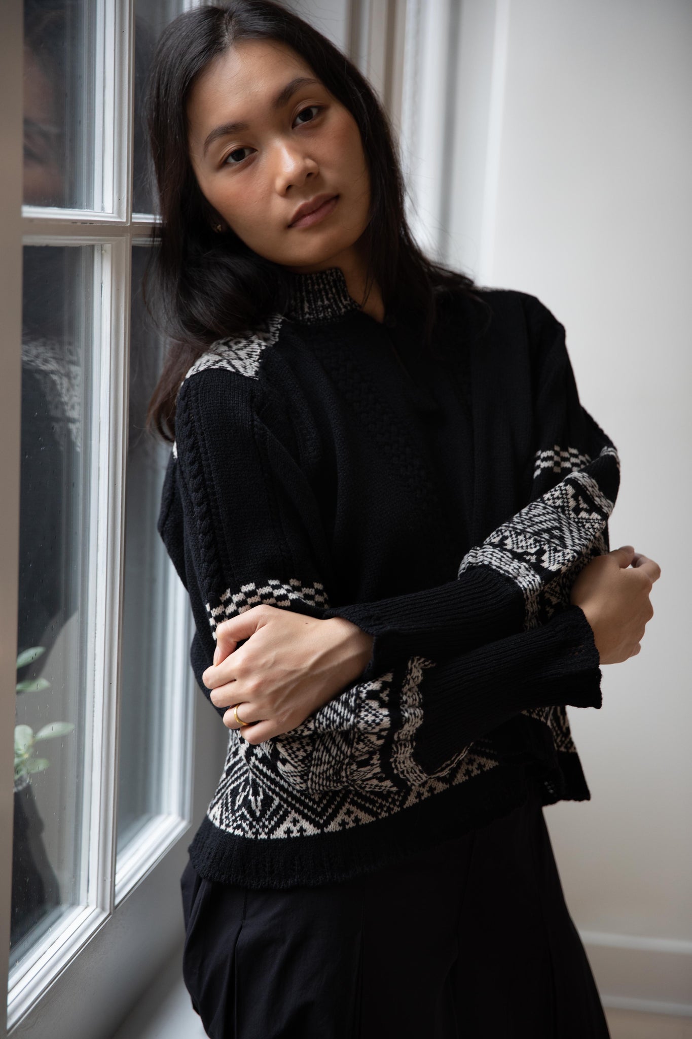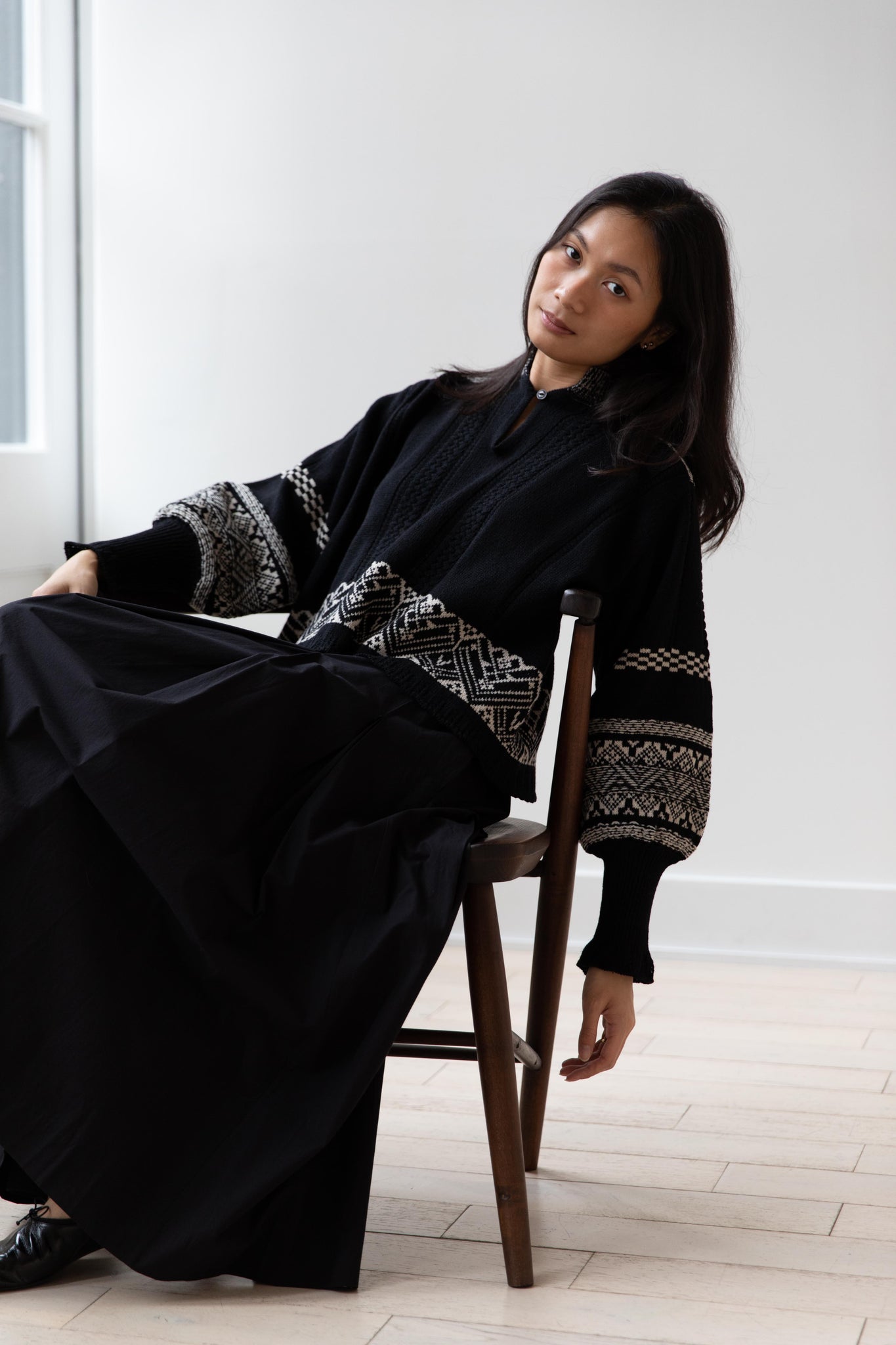 This fair isle knit is perfect. From the knit pattern to the silhouette, we can't imagine a better winter sweater. The sleeves stand out and have a beautiful balloon shape, along with slight scallop details on the wrist. There are small cables running throughout the sweater in addition to the fair isle pattern. There is one button at the neck and a small stand collar.