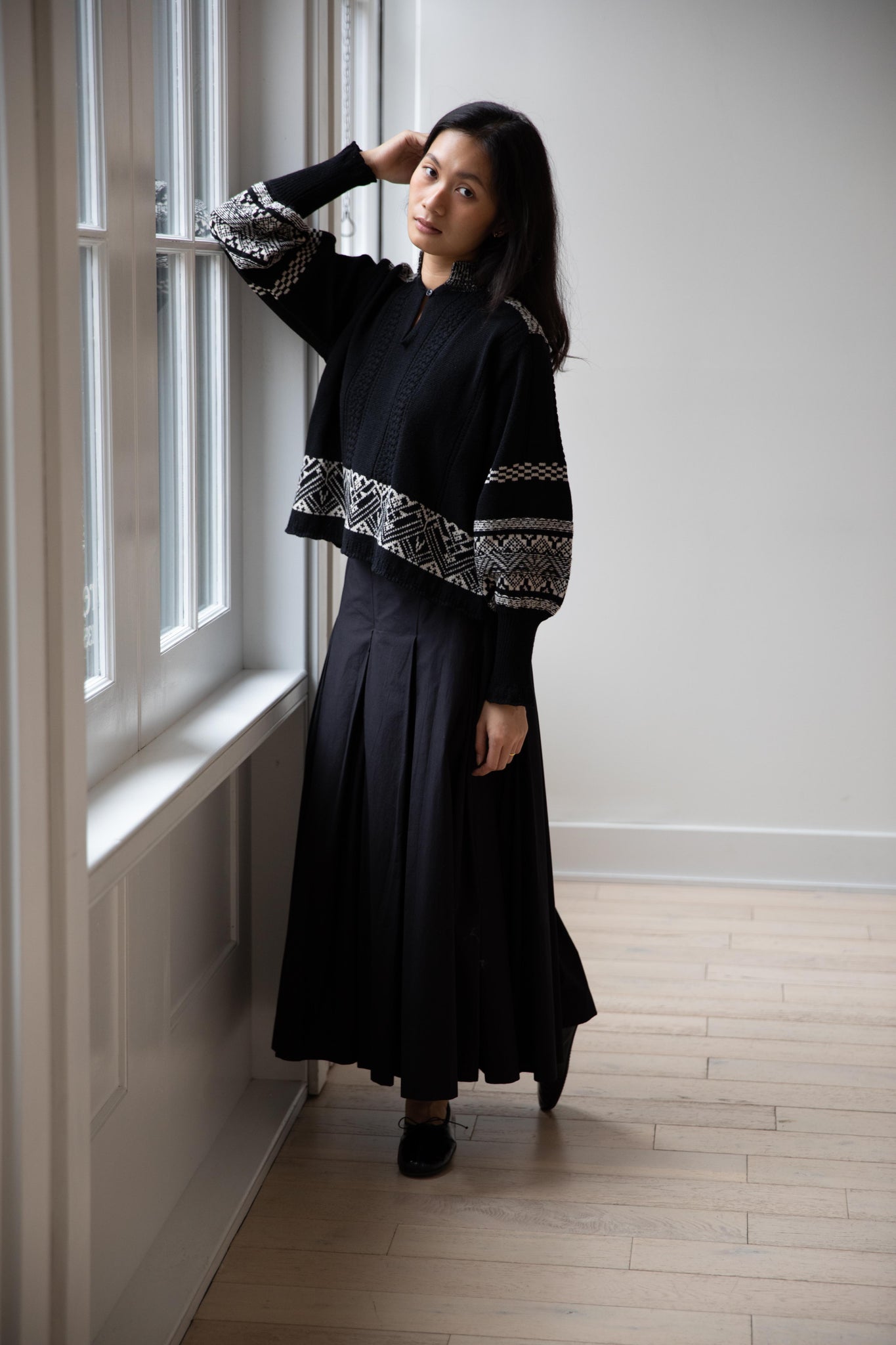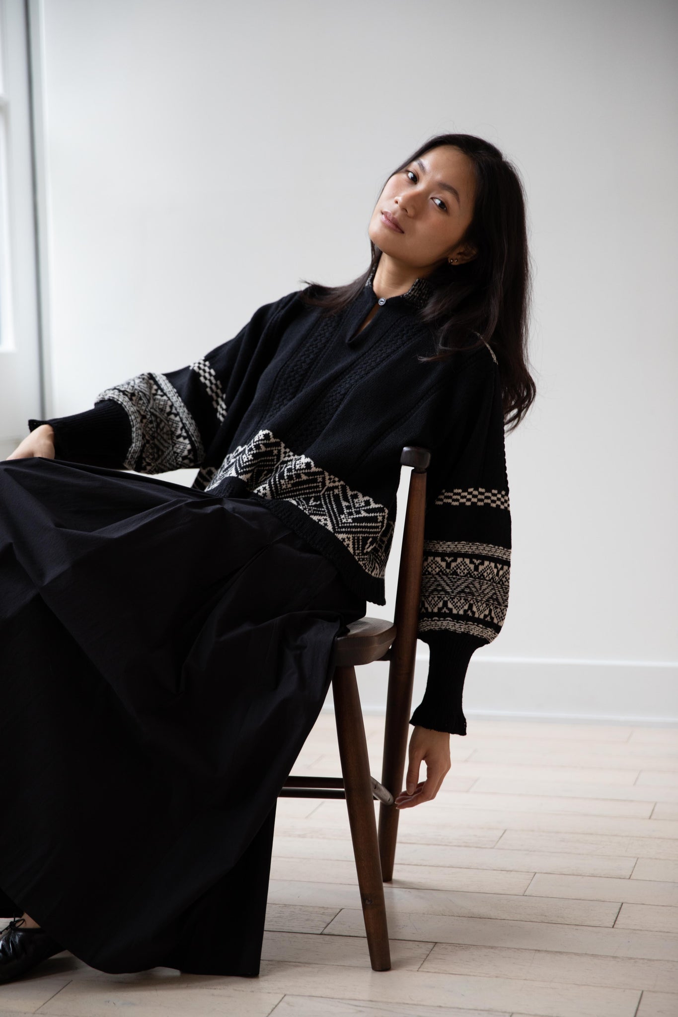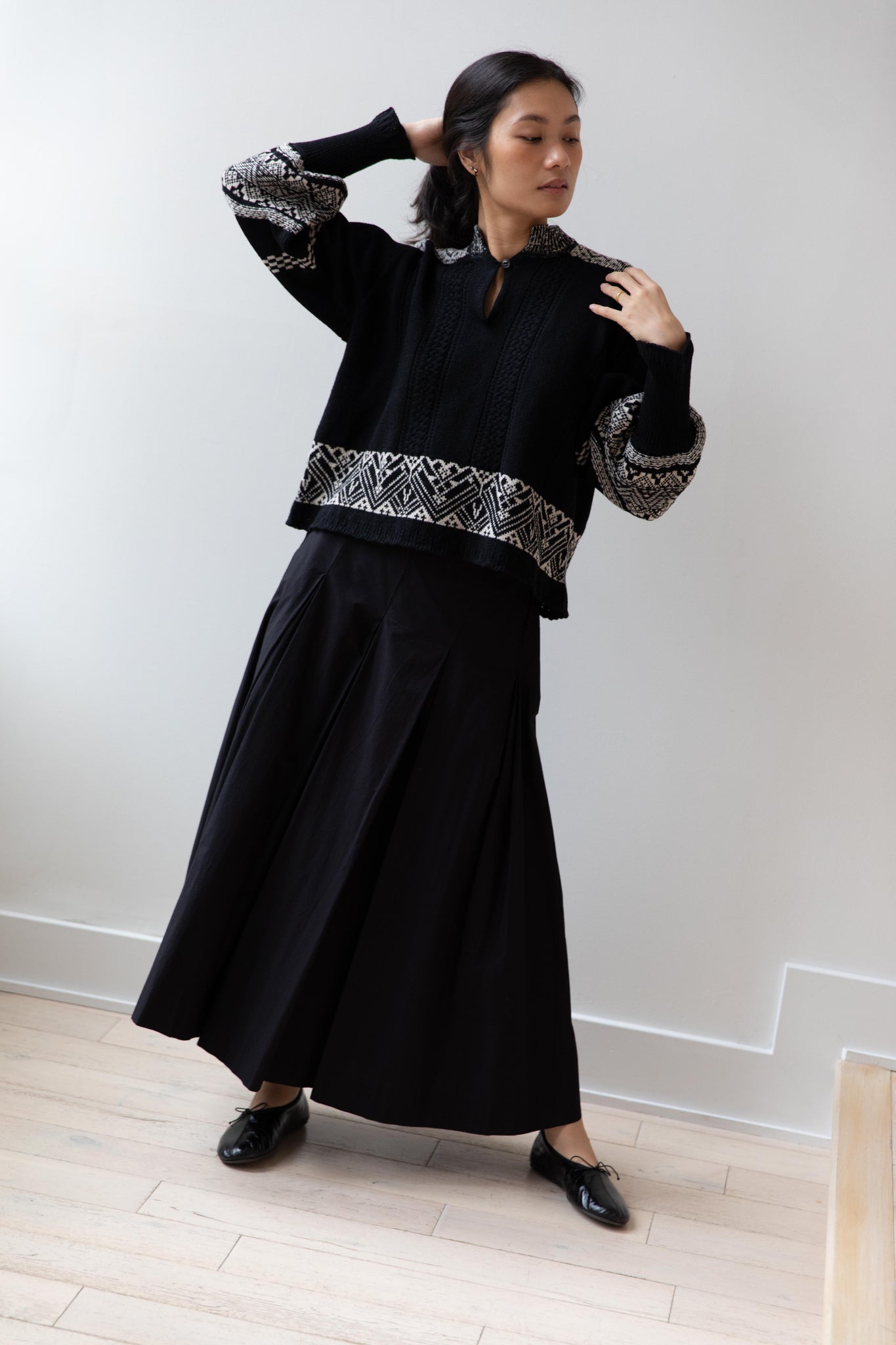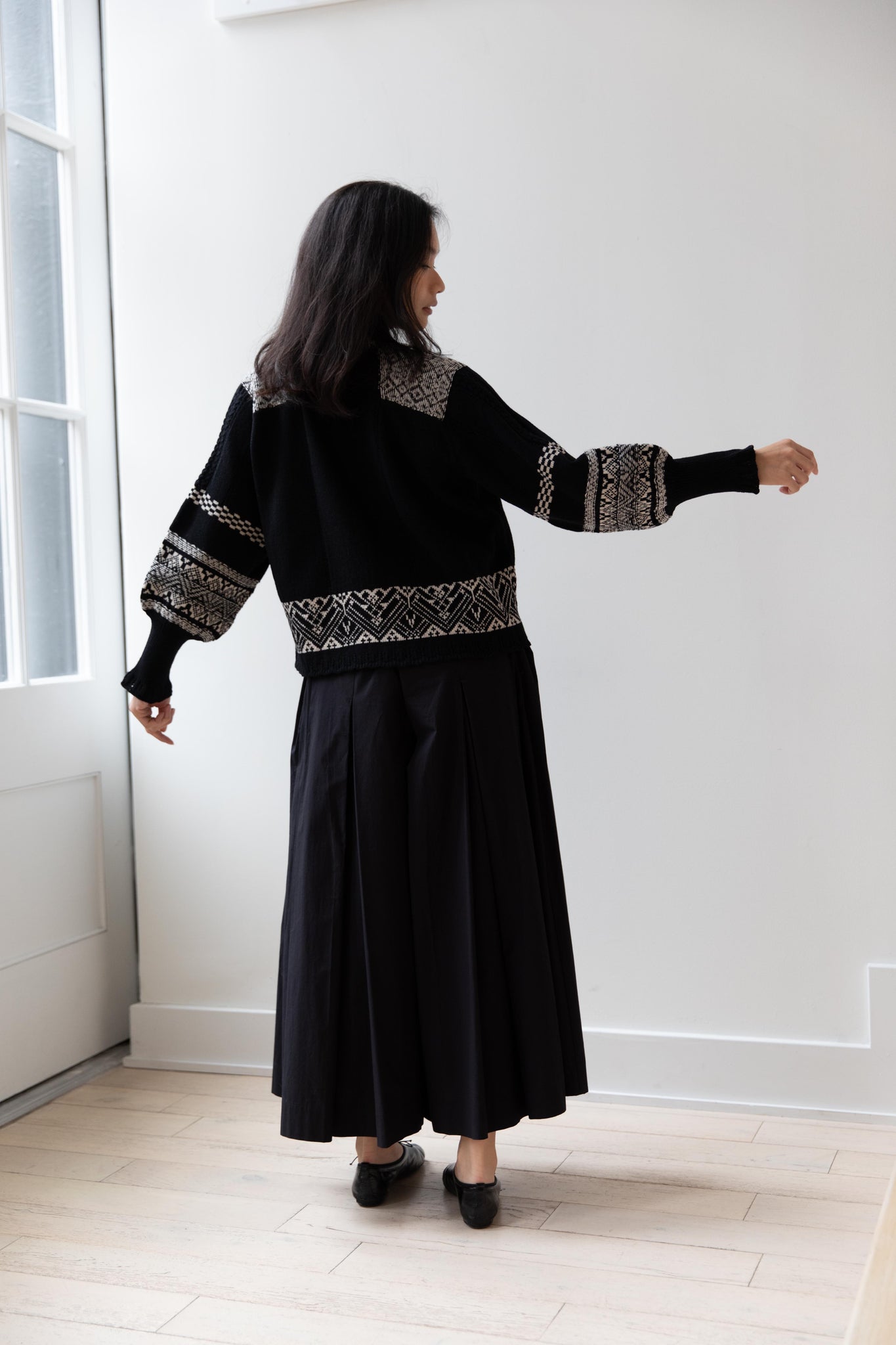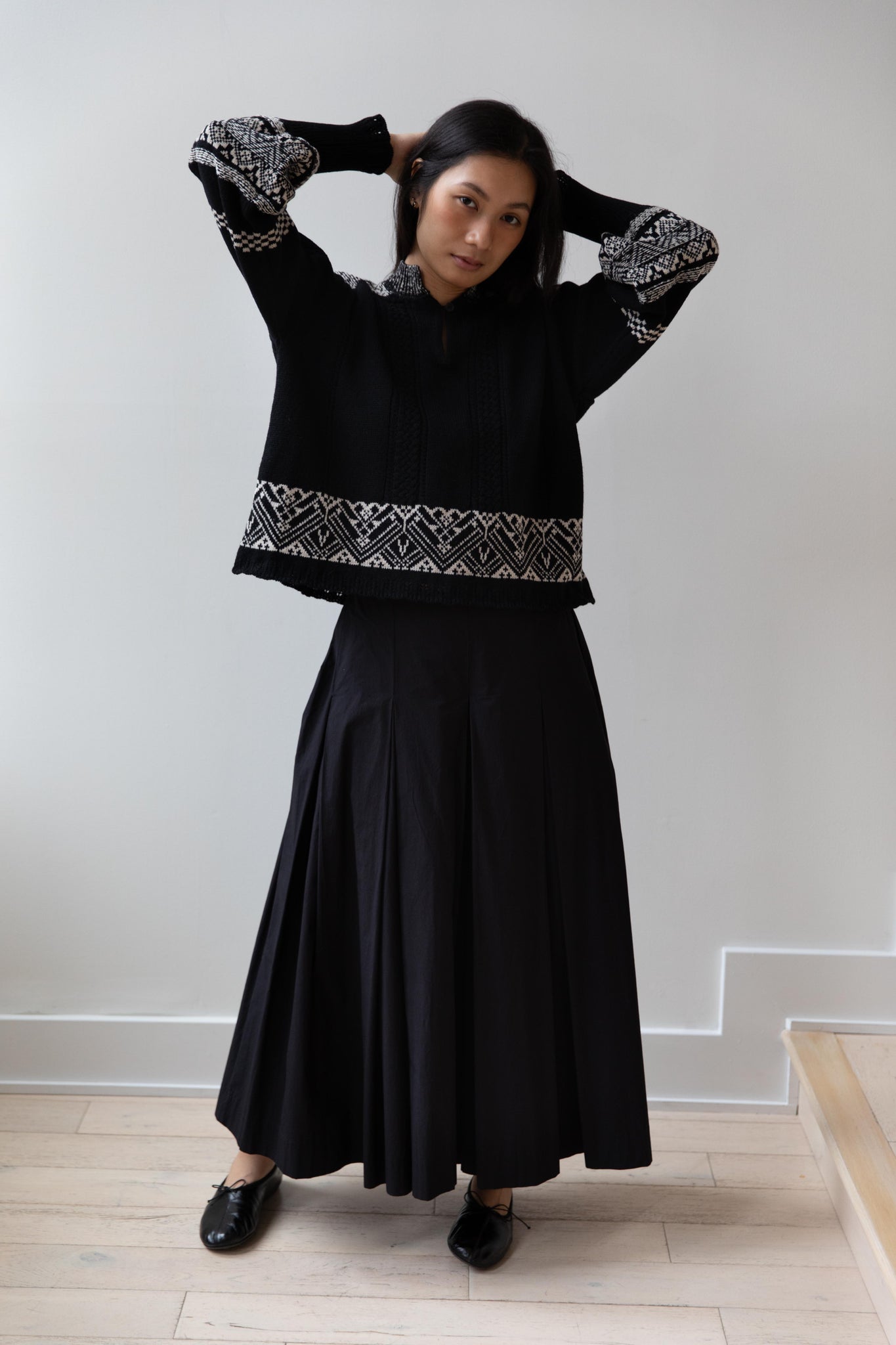 This fair isle knit is perfect. From the knit pattern to the silhouette, we can't imagine a better winter sweater. The sleeves stand out and have a beautiful balloon shape, along with slight scallop details on the wrist. There are small cables running throughout the sweater in addition to the fair isle pattern. There is one button at the neck and a small stand collar.
