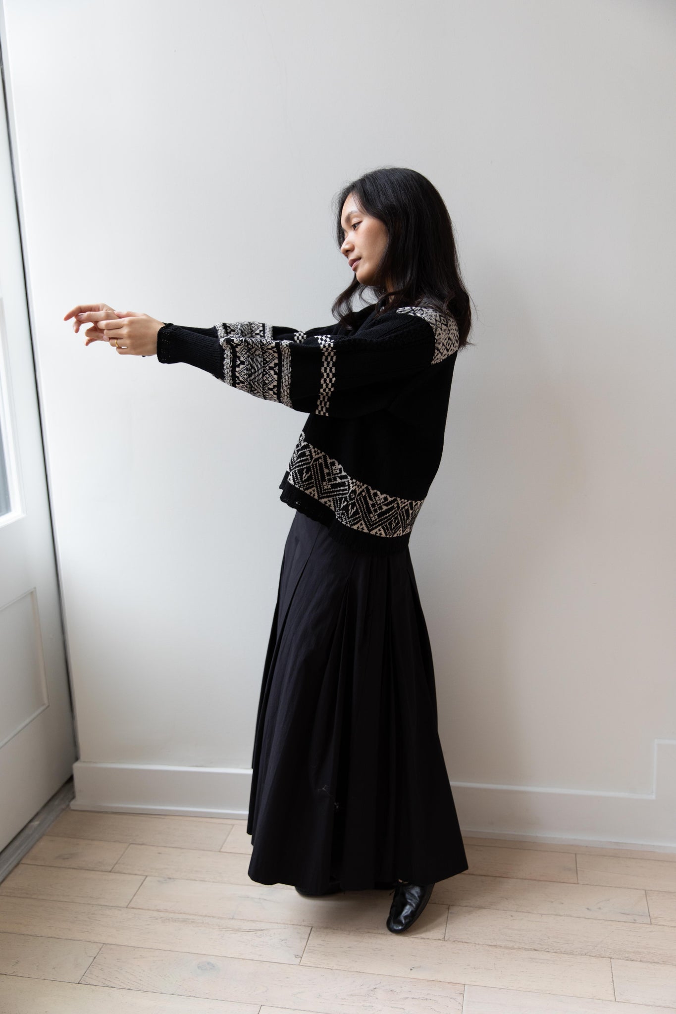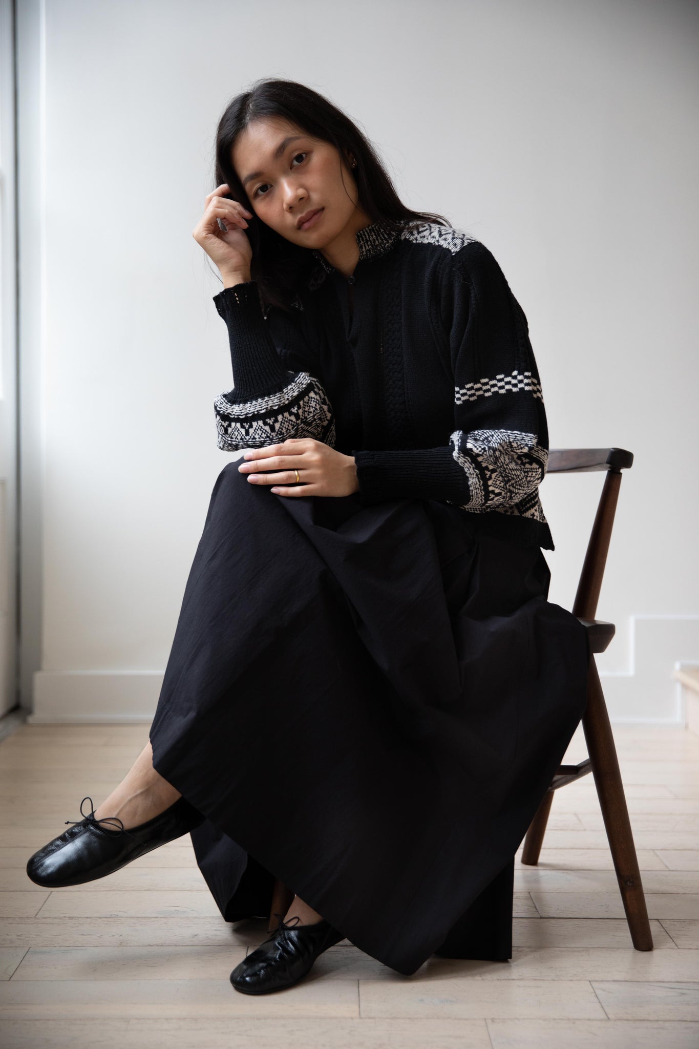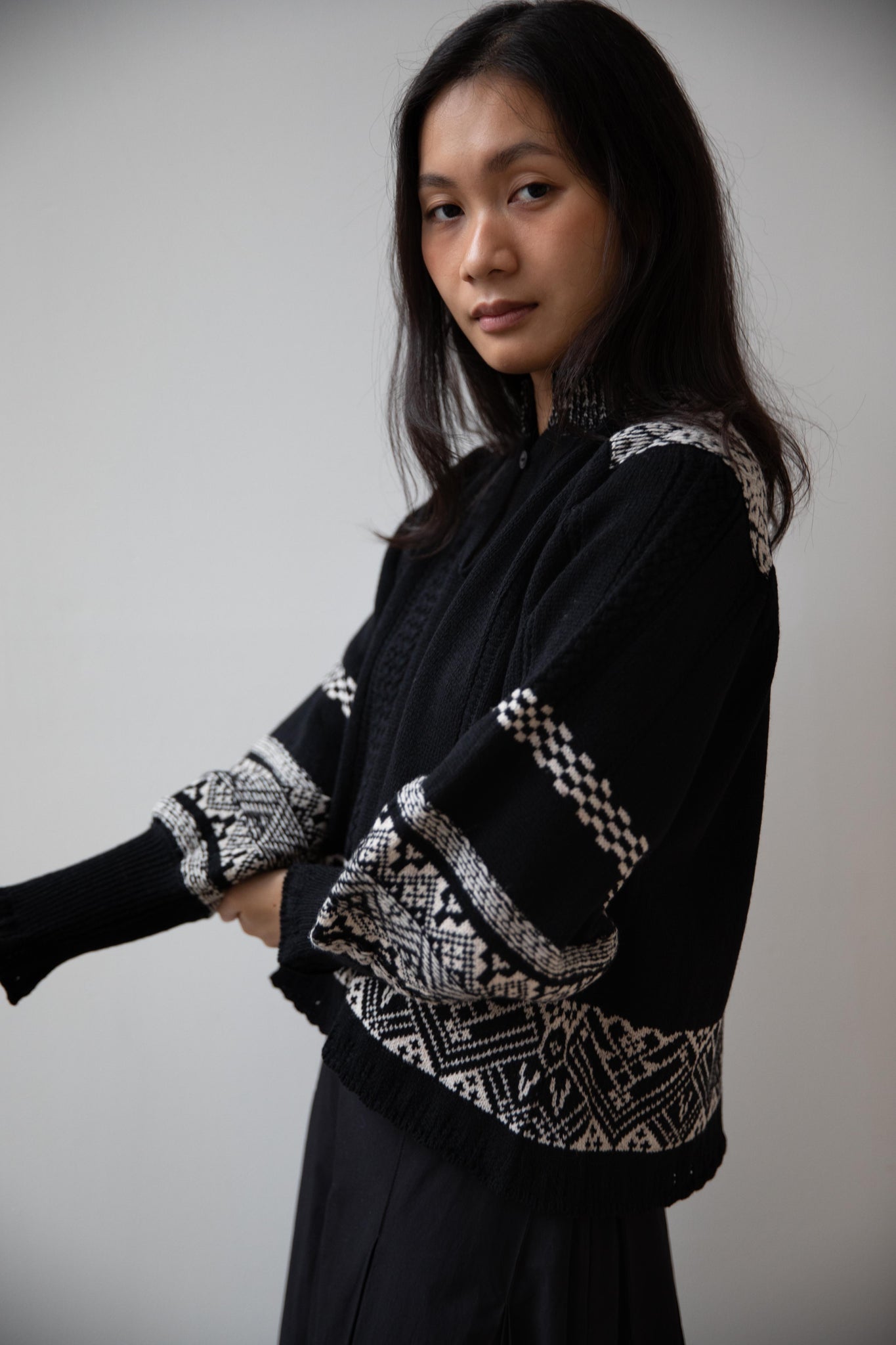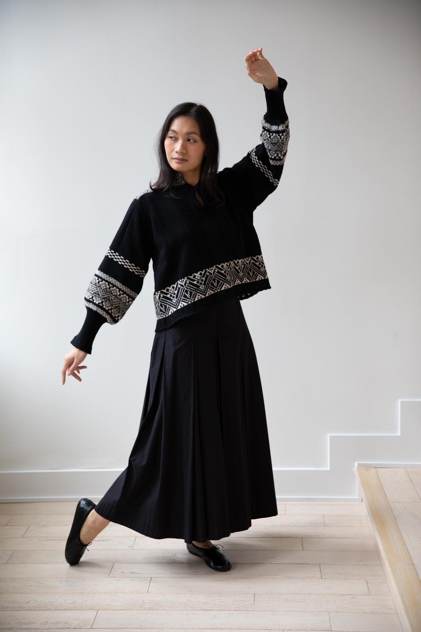 This fair isle knit is perfect. From the knit pattern to the silhouette, we can't imagine a better winter sweater. The sleeves stand out and have a beautiful balloon shape, along with slight scallop details on the wrist. There are small cables running throughout the sweater in addition to the fair isle pattern. There is one button at the neck and a small stand collar.