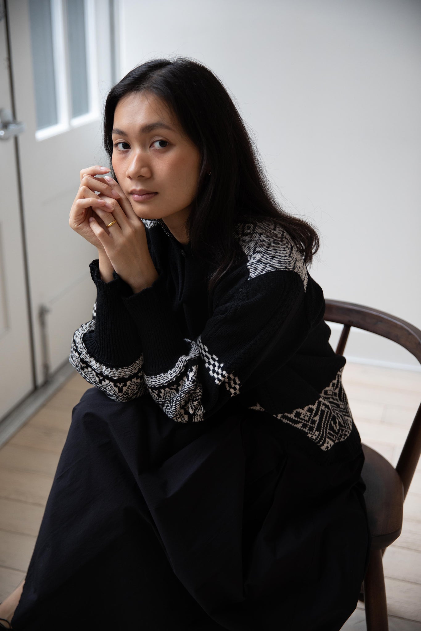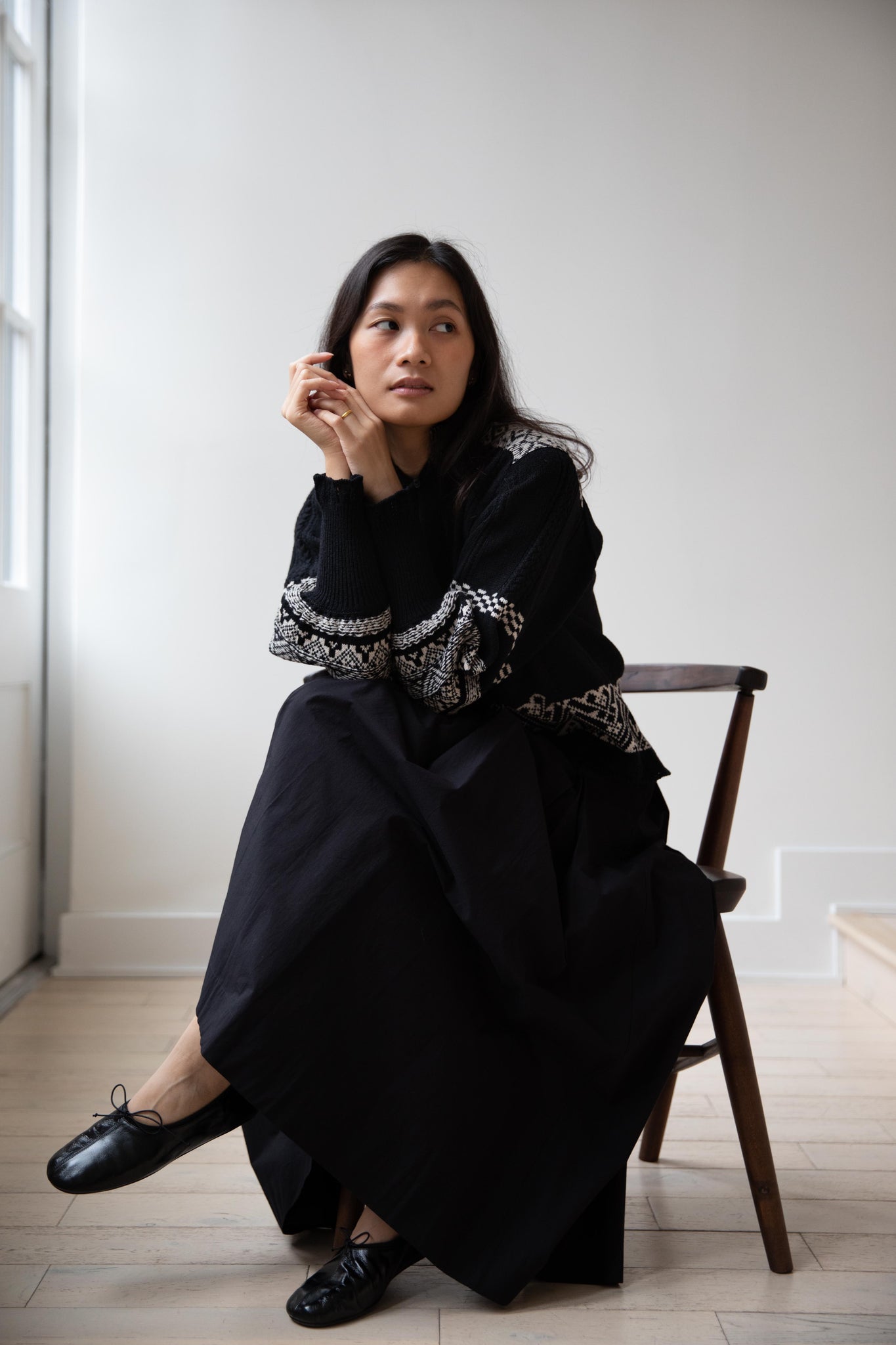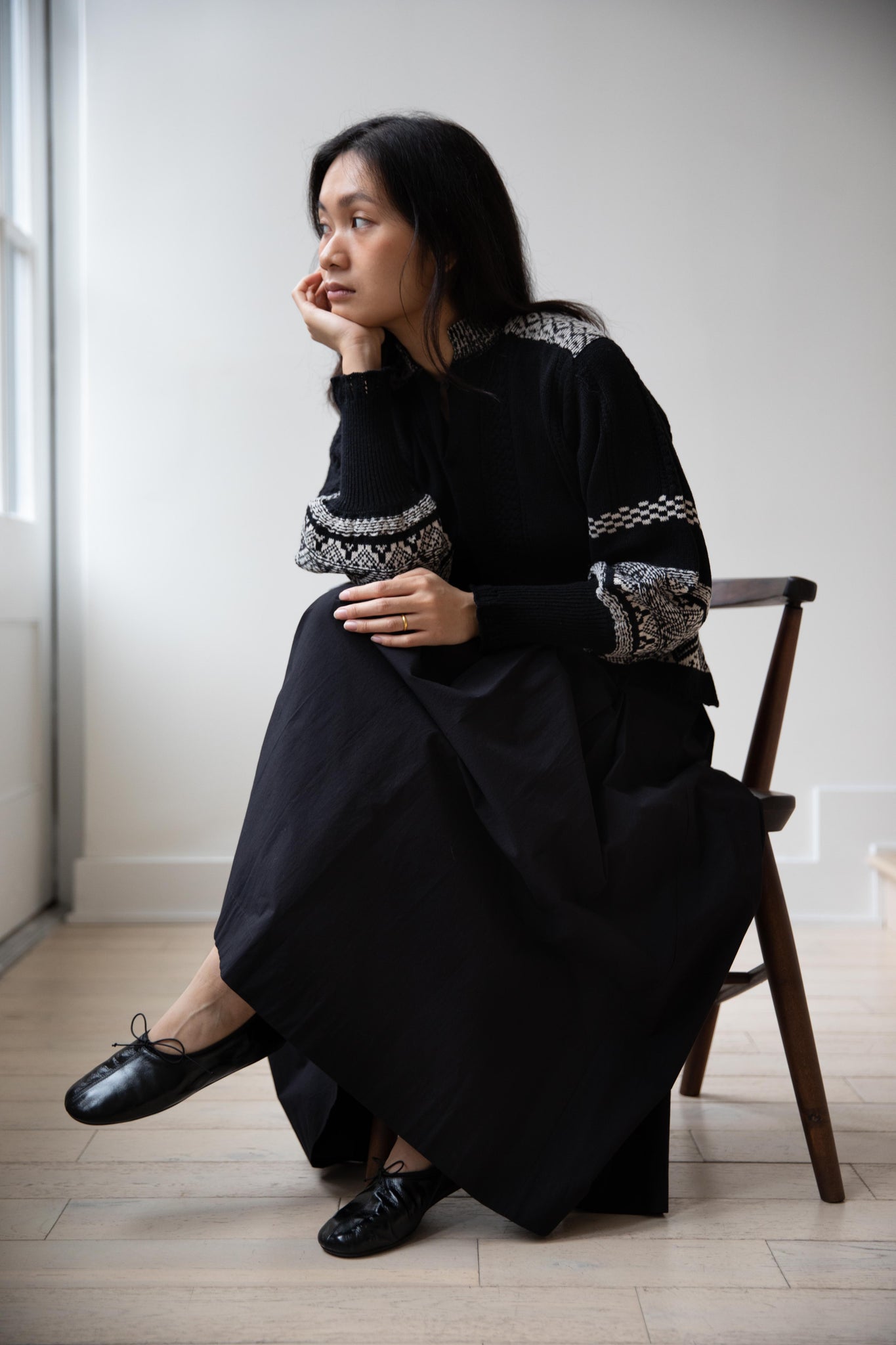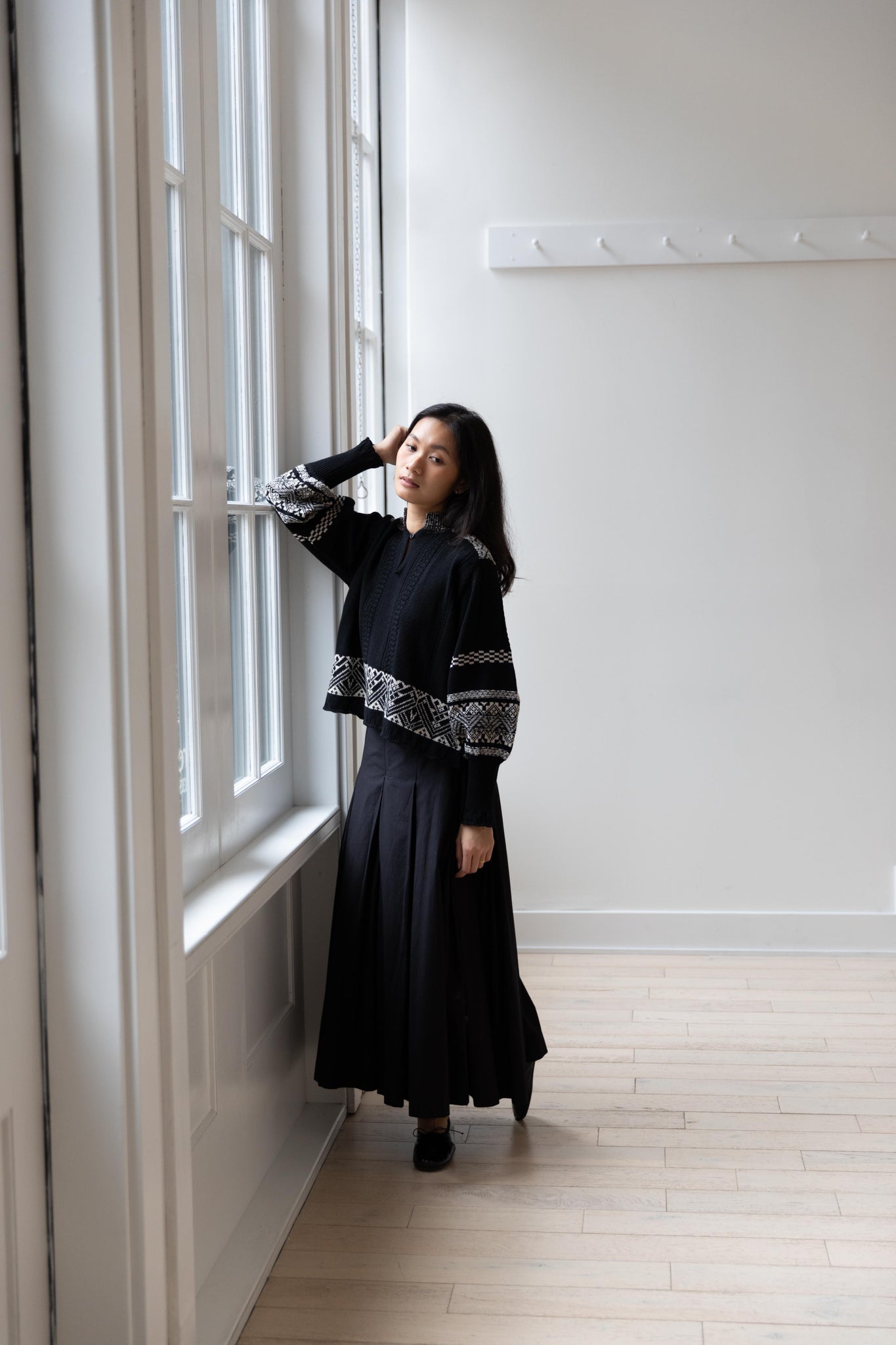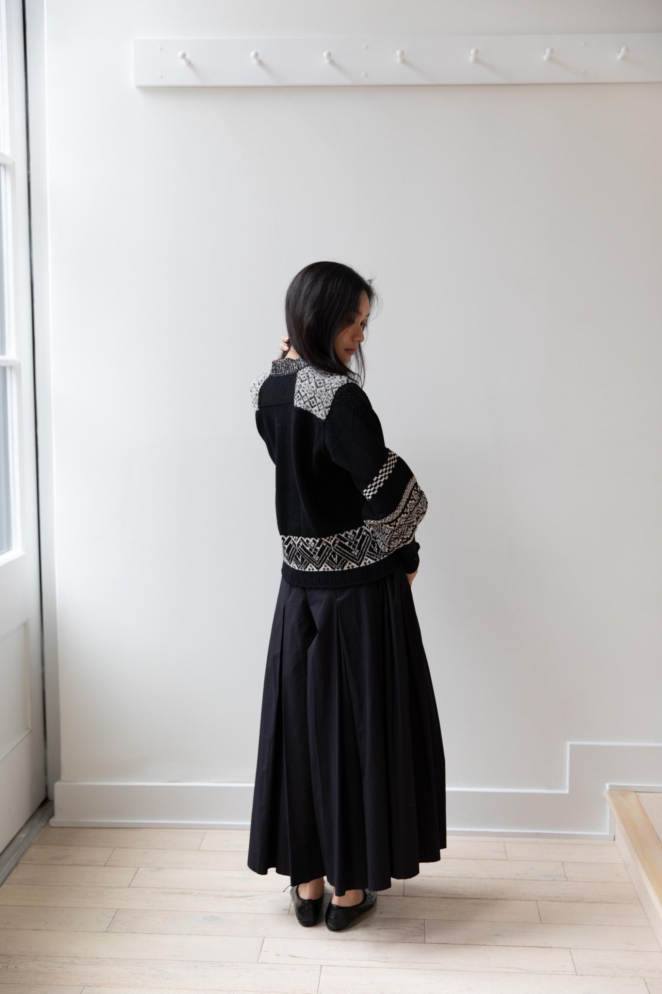 This fair isle knit is perfect. From the knit pattern to the silhouette, we can't imagine a better winter sweater. The sleeves stand out and have a beautiful balloon shape, along with slight scallop details on the wrist. There are small cables running throughout the sweater in addition to the fair isle pattern. There is one button at the neck and a small stand collar.
