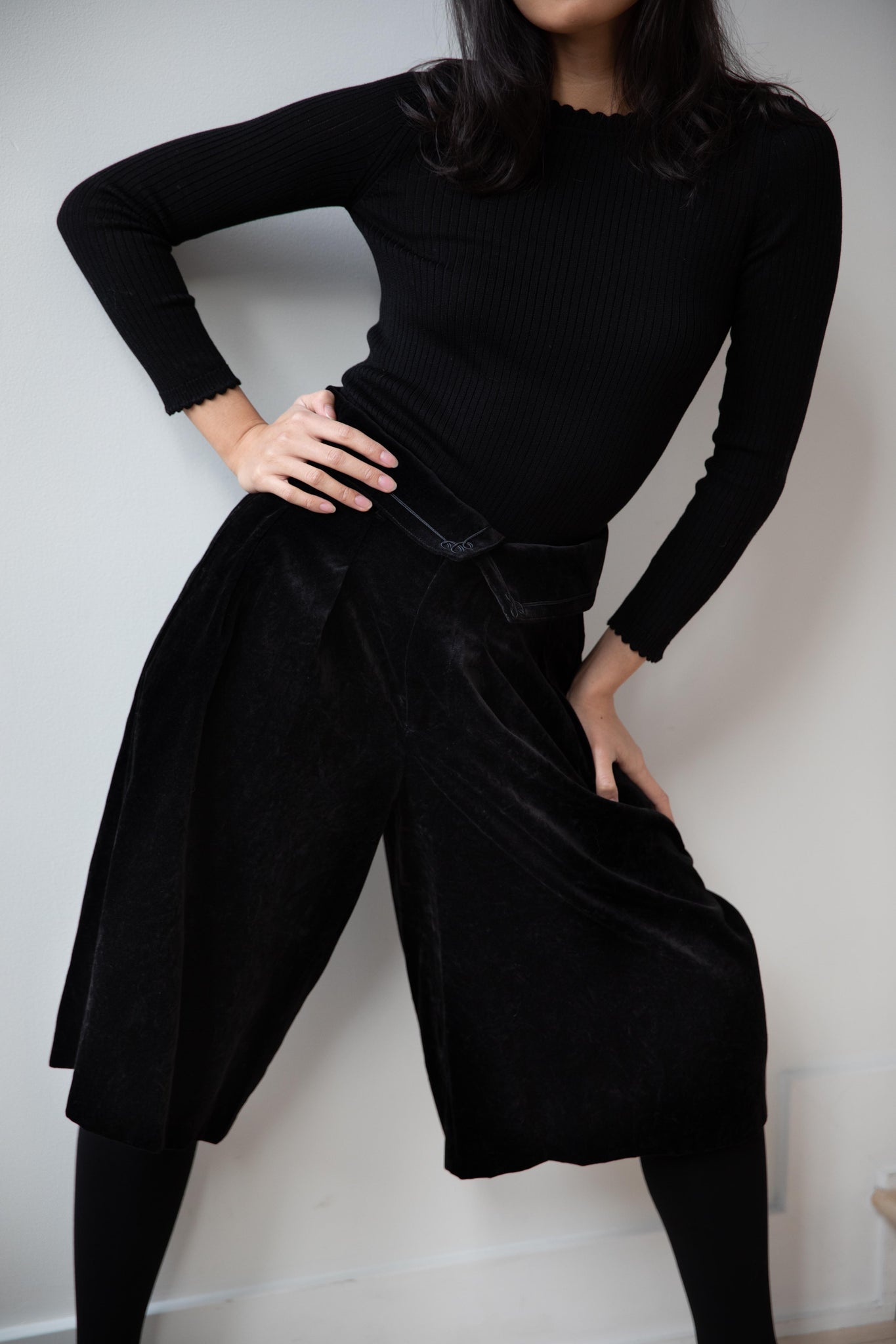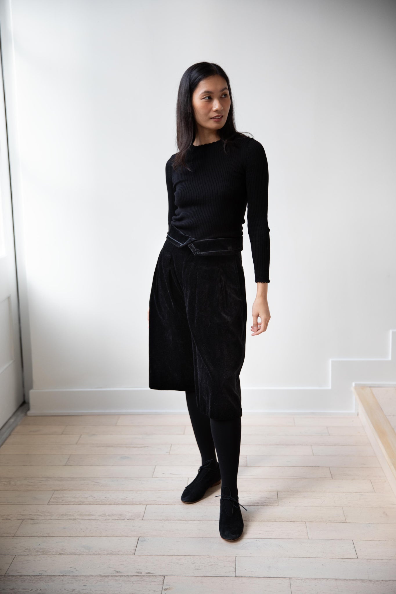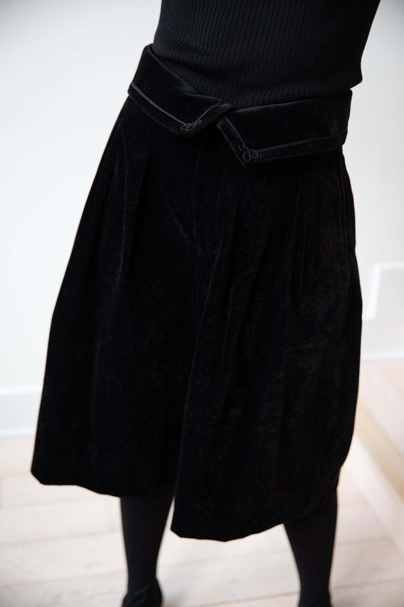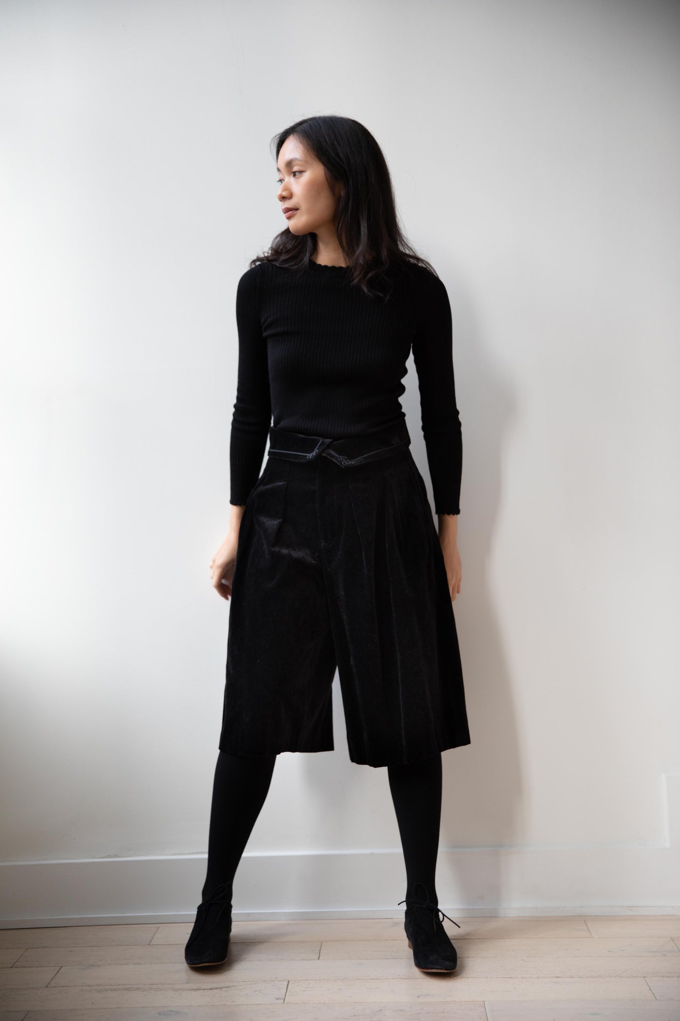 We love the idea of wearing shorts in the winter layered with tights.  Made from a crushed black velvet, these flowing knee length shorts have really interesting details.  The top part of the shorts is designed to be folded over and has a scrolling ribbon trim along the edge that adds for an unexpected twist.  There is a back adjuster tab to use as needed to change the fit, and there are belt loops too.  There are side and back pockets.  Pair it with the matching jacket for a full winter look.