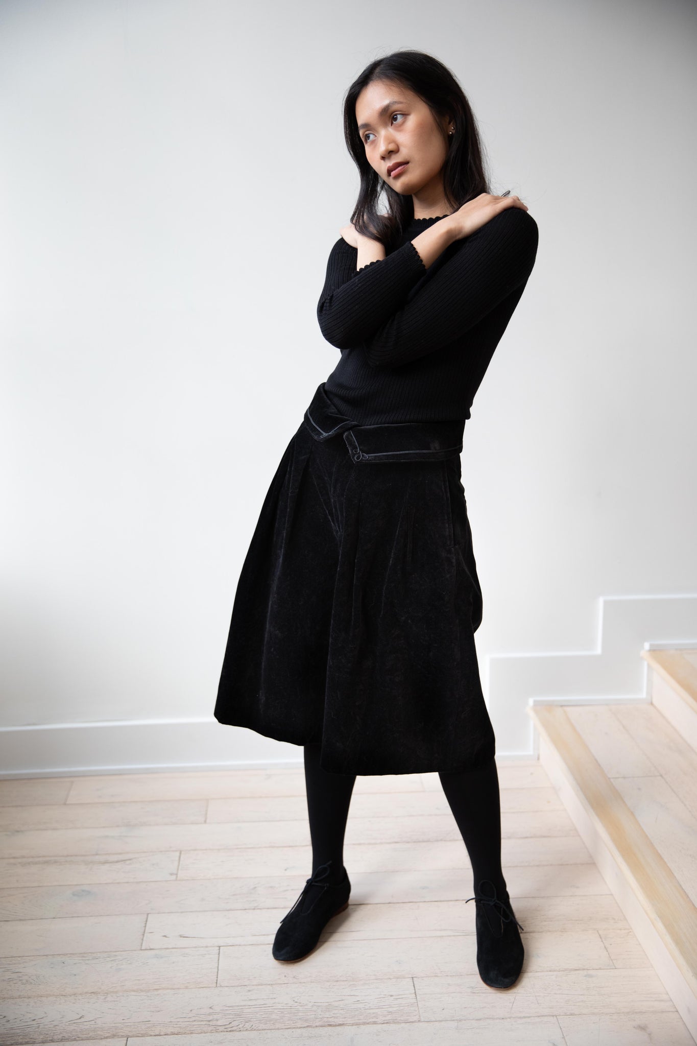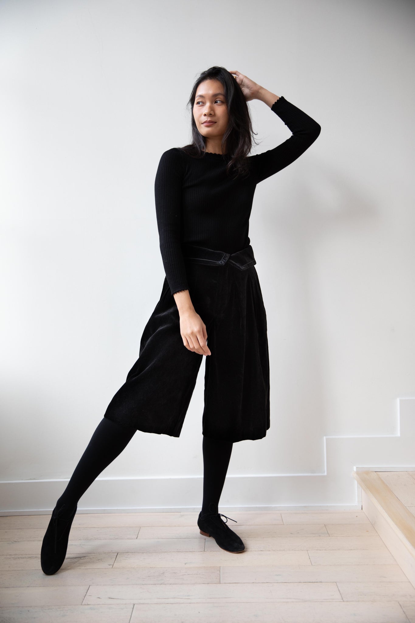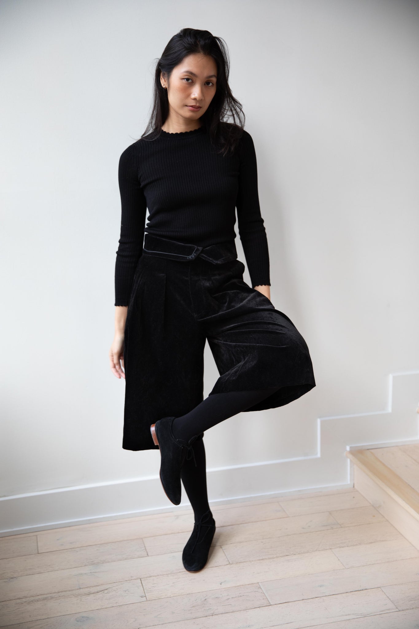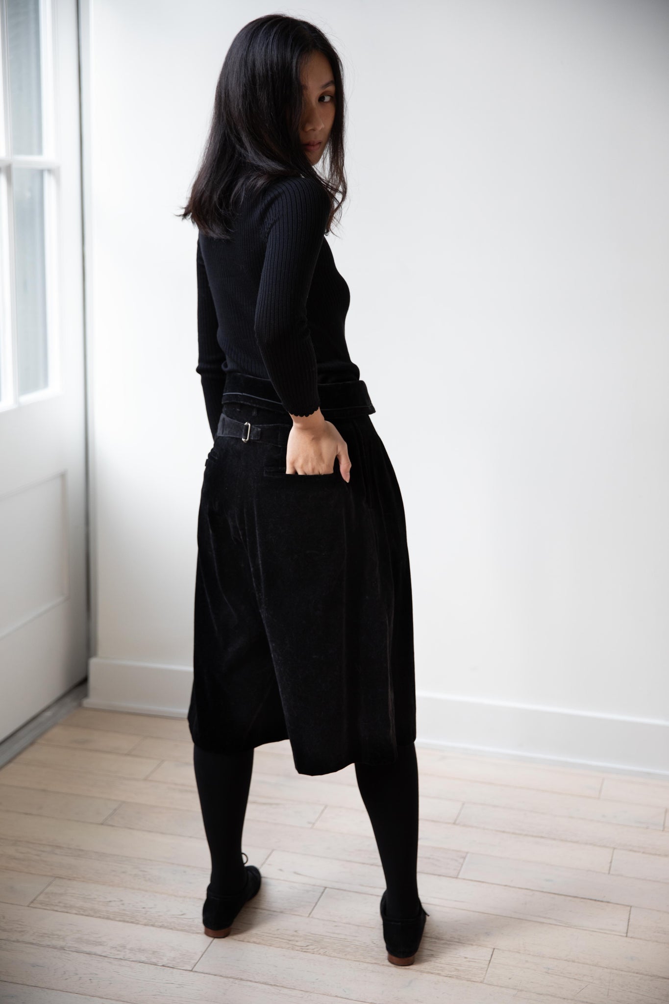 We love the idea of wearing shorts in the winter layered with tights.  Made from a crushed black velvet, these flowing knee length shorts have really interesting details.  The top part of the shorts is designed to be folded over and has a scrolling ribbon trim along the edge that adds for an unexpected twist.  There is a back adjuster tab to use as needed to change the fit, and there are belt loops too.  There are side and back pockets.  Pair it with the matching jacket for a full winter look.
