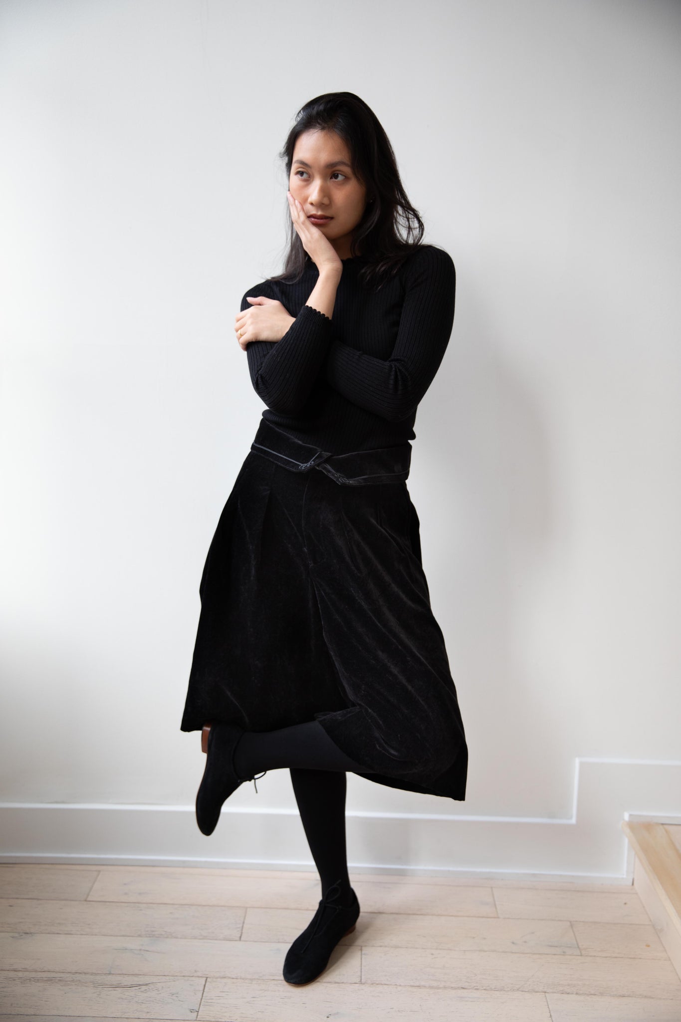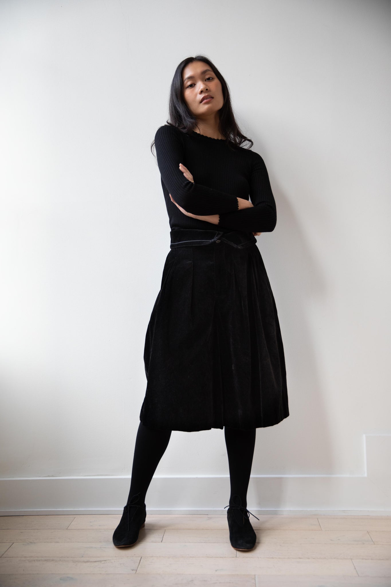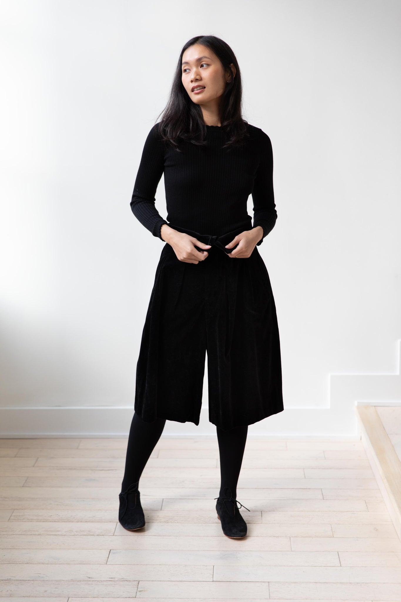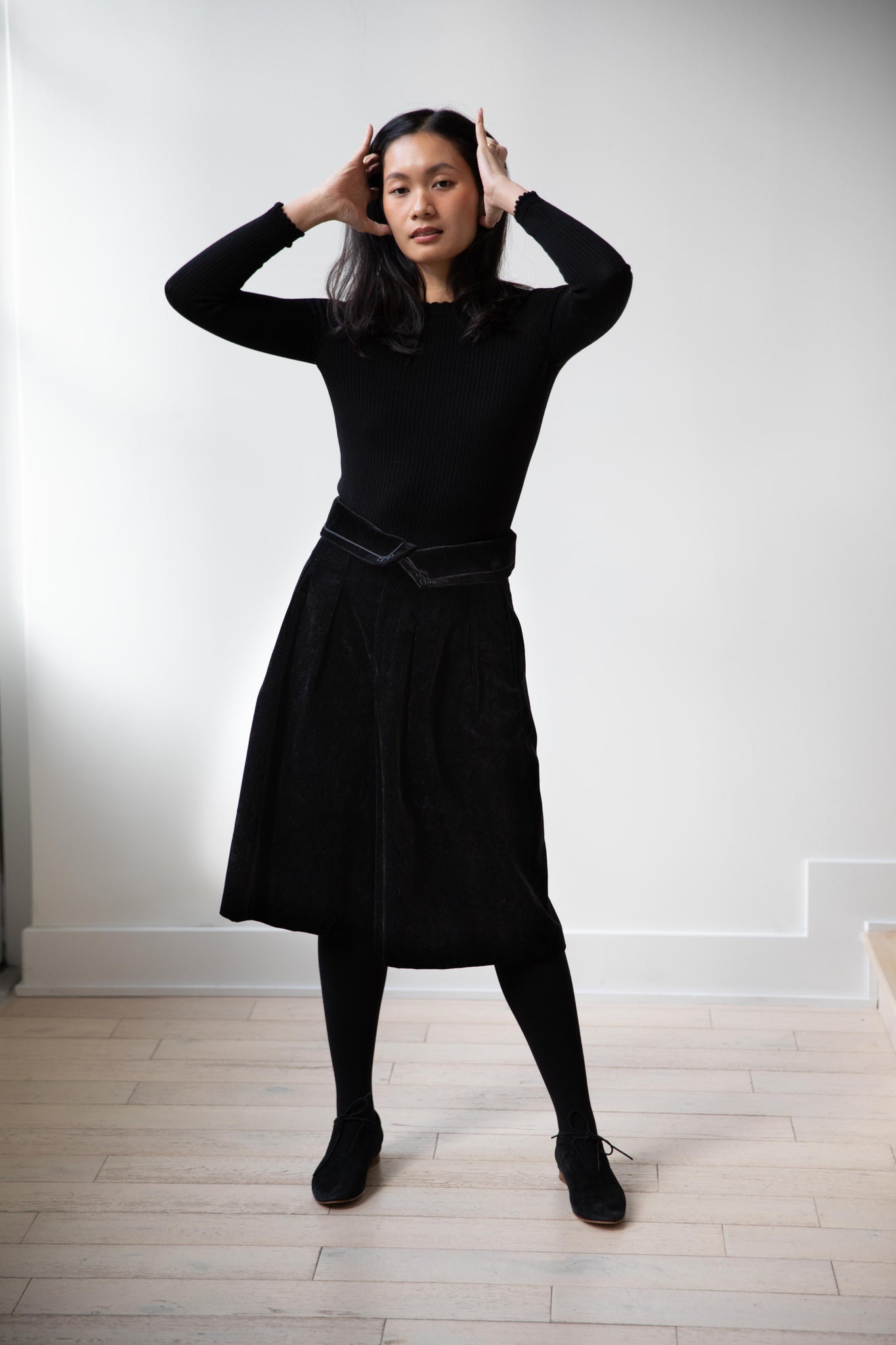 We love the idea of wearing shorts in the winter layered with tights.  Made from a crushed black velvet, these flowing knee length shorts have really interesting details.  The top part of the shorts is designed to be folded over and has a scrolling ribbon trim along the edge that adds for an unexpected twist.  There is a back adjuster tab to use as needed to change the fit, and there are belt loops too.  There are side and back pockets.  Pair it with the matching jacket for a full winter look.