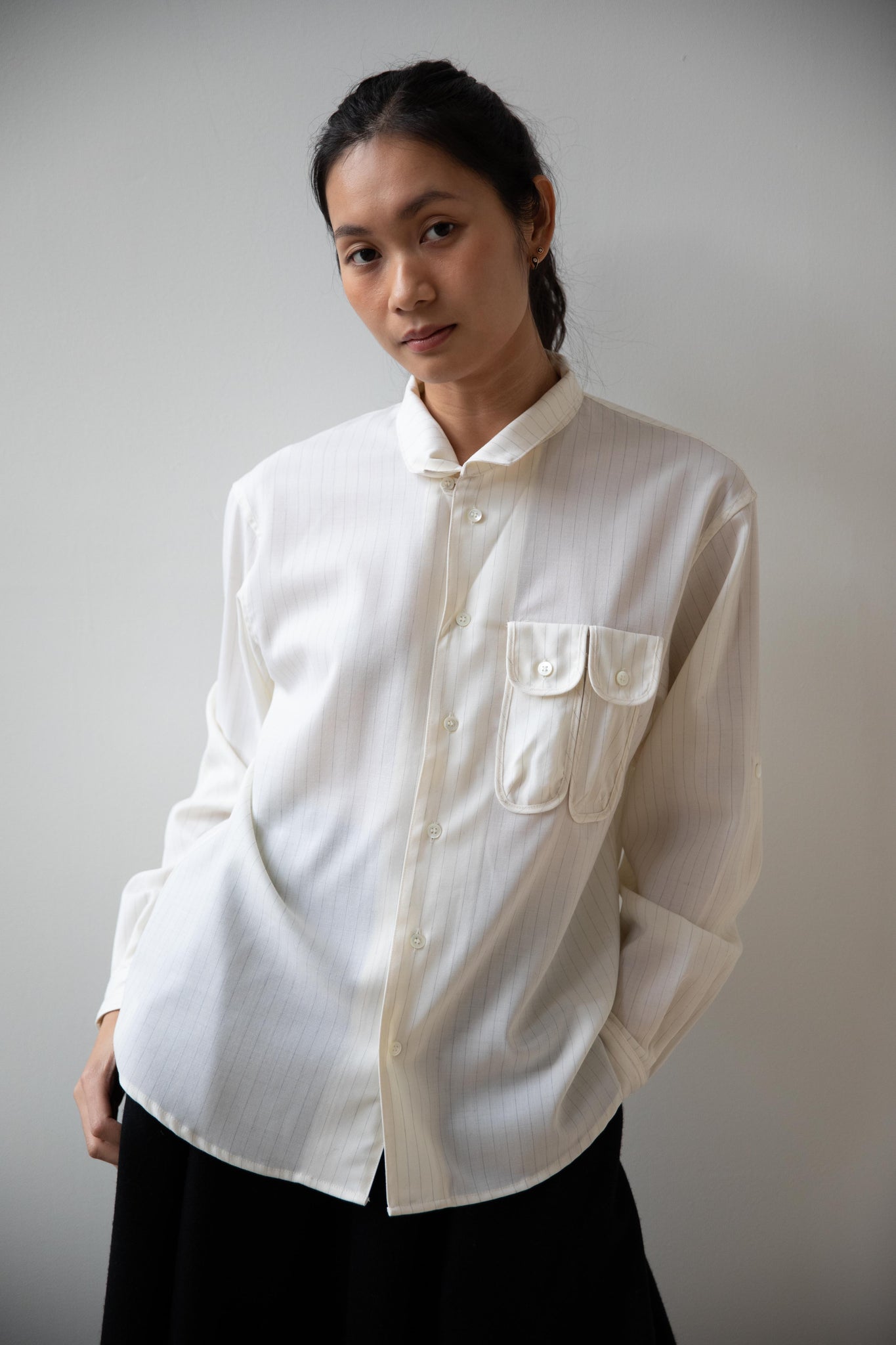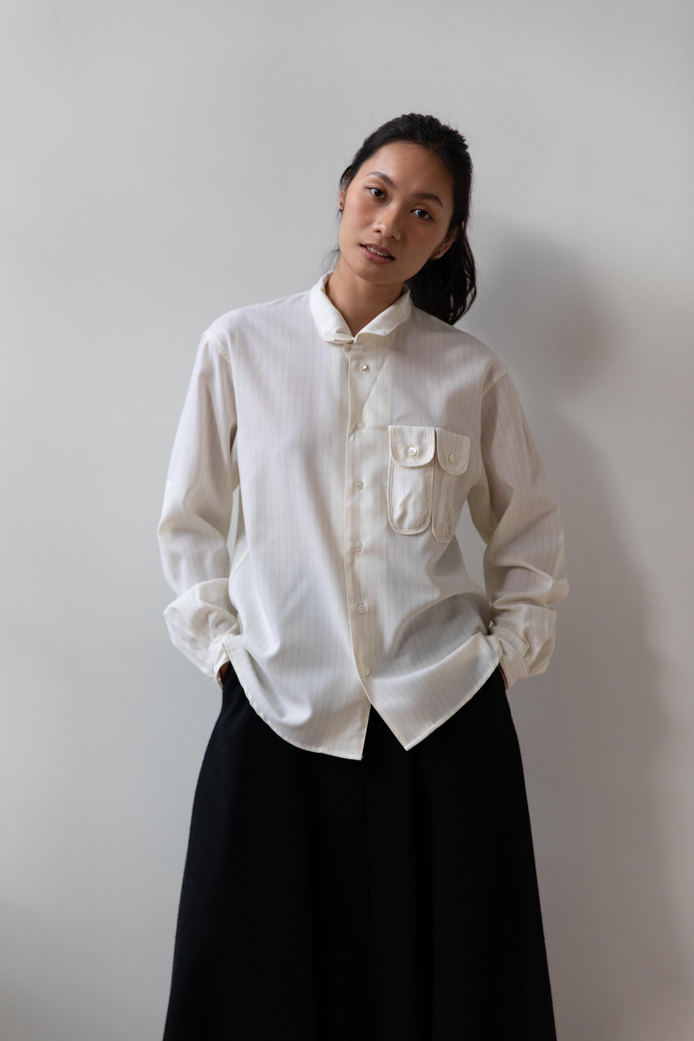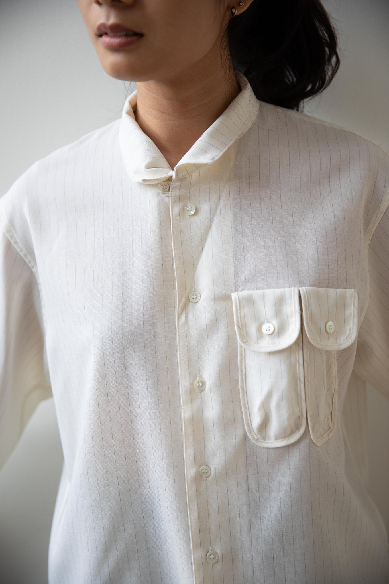 This unique button up is made from a cream pin stripe tropical wool and has the most unique pockets on the front!  There are two of them - they are narrow in proportion and perfect for things like pens and pencils.  Pair the shirt with the matching trousers to have a matching set.