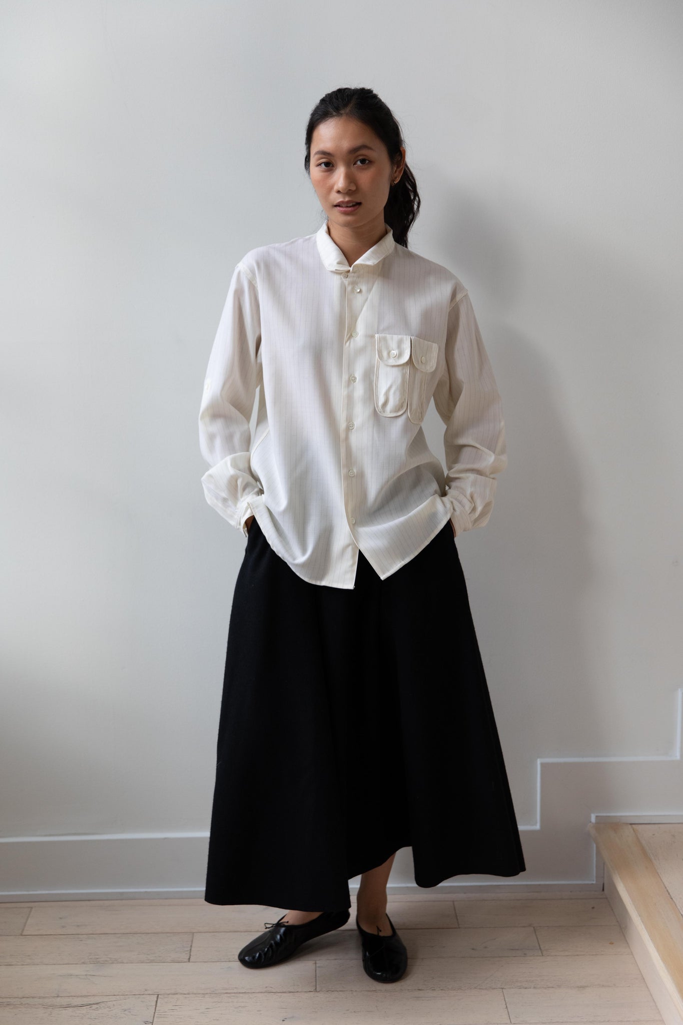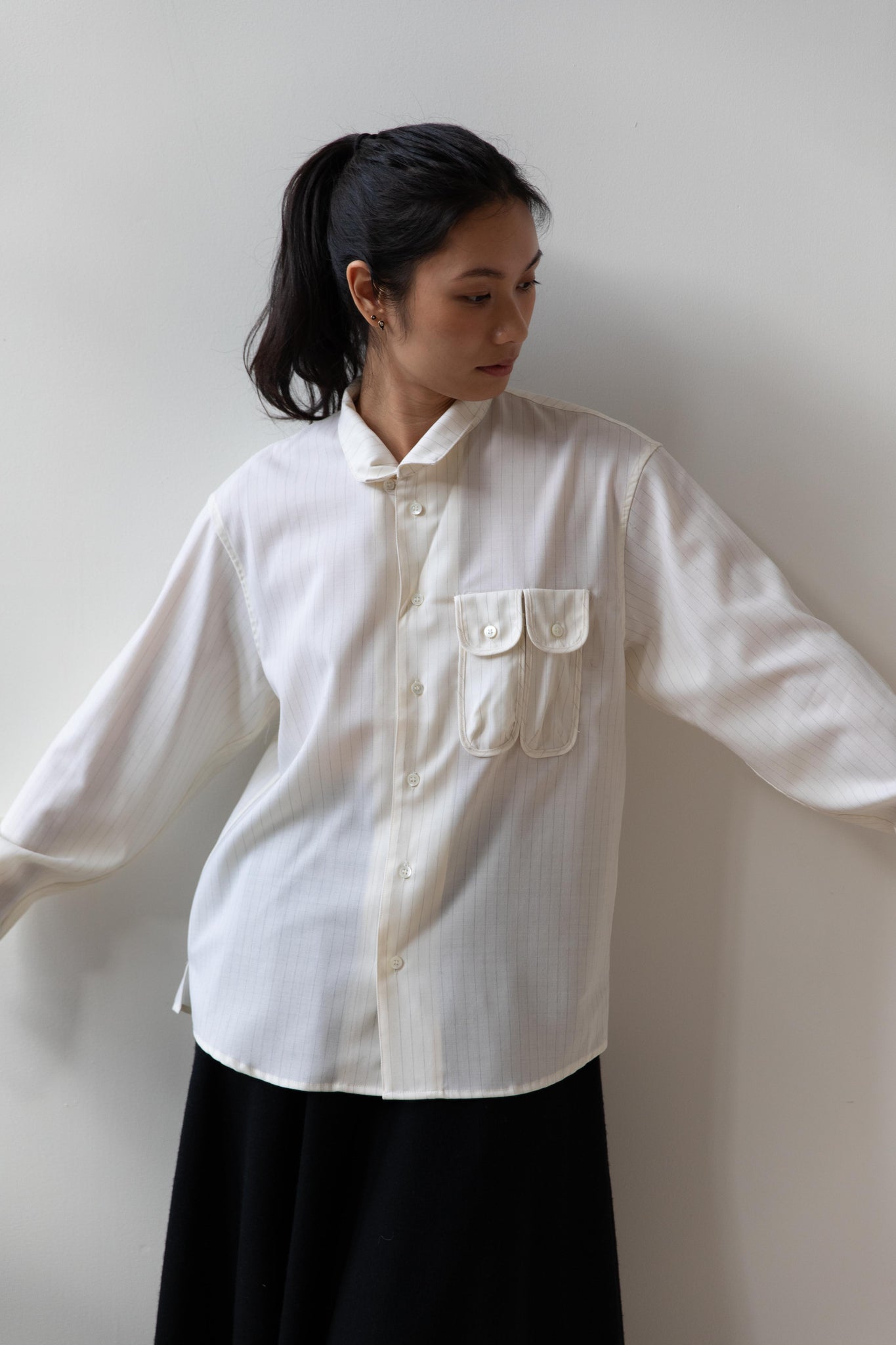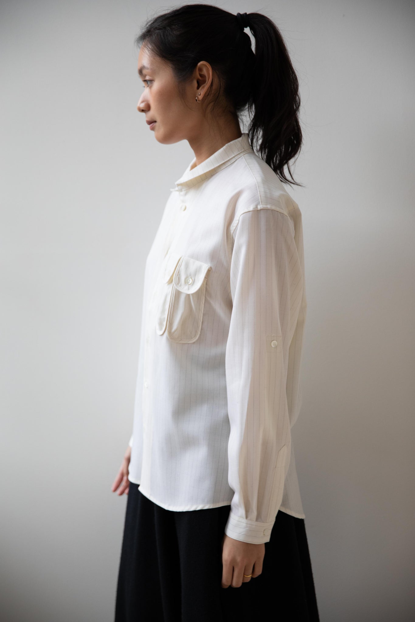 This unique button up is made from a cream pin stripe tropical wool and has the most unique pockets on the front!  There are two of them - they are narrow in proportion and perfect for things like pens and pencils.  Pair the shirt with the matching trousers to have a matching set.