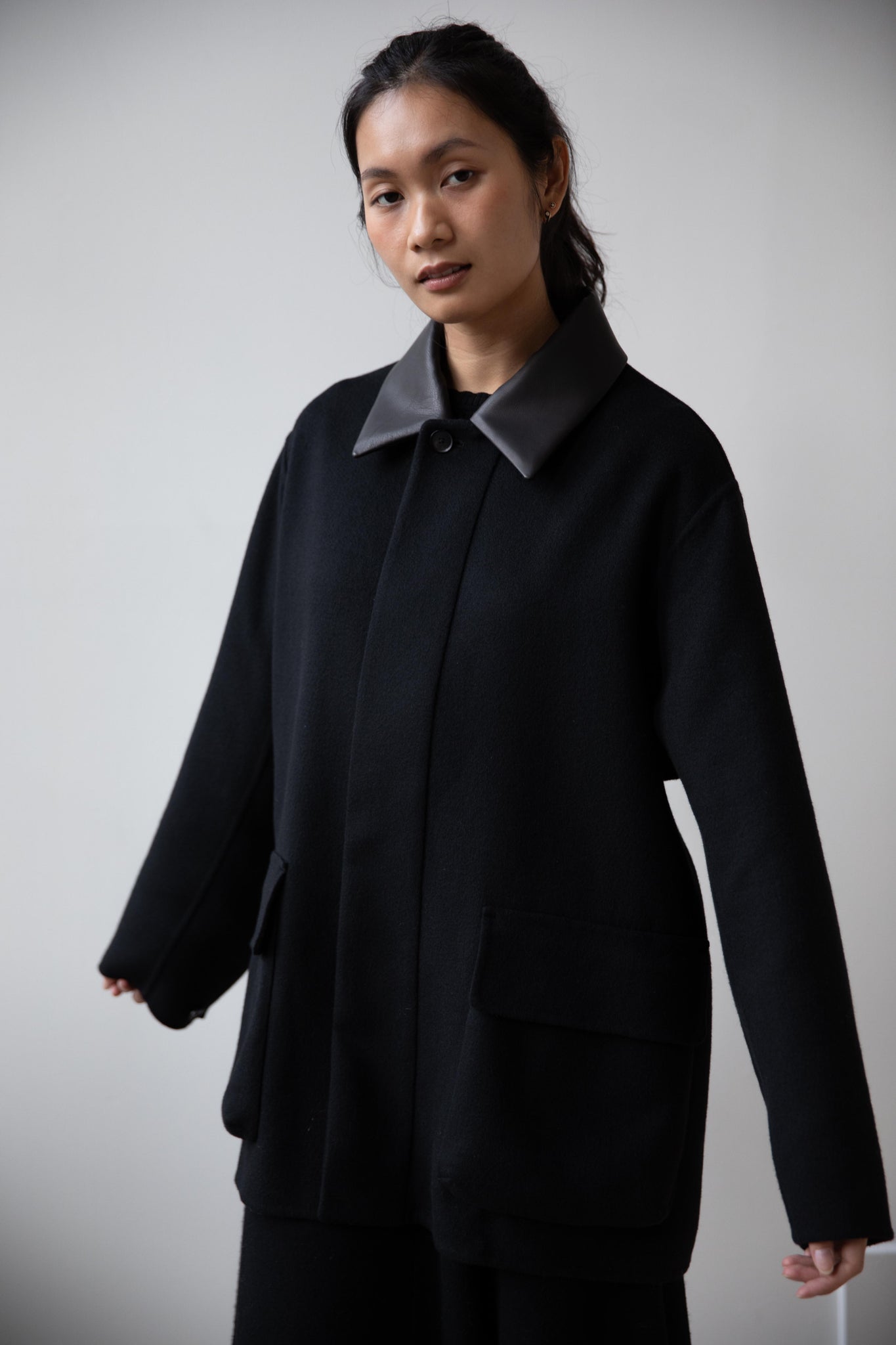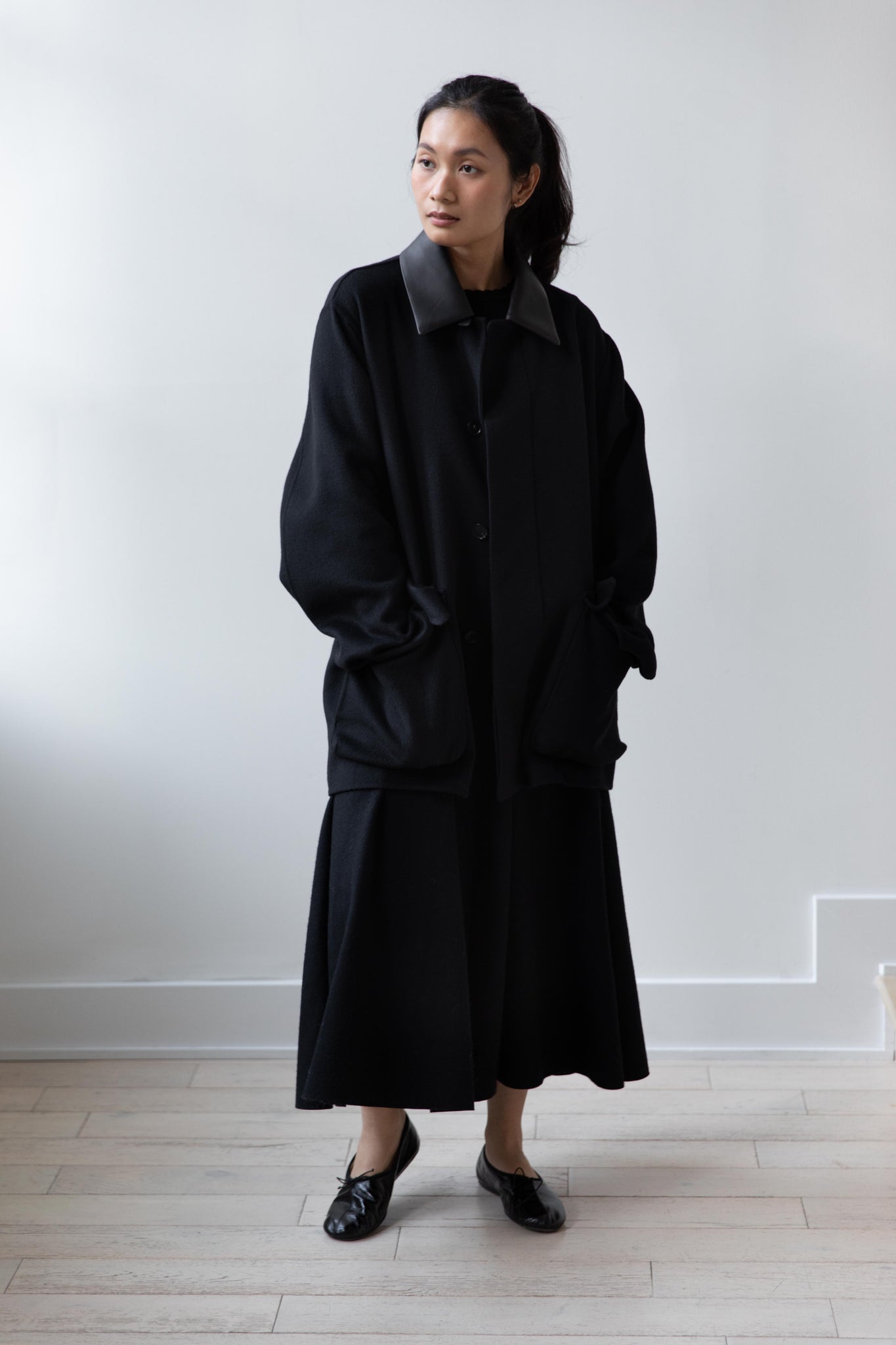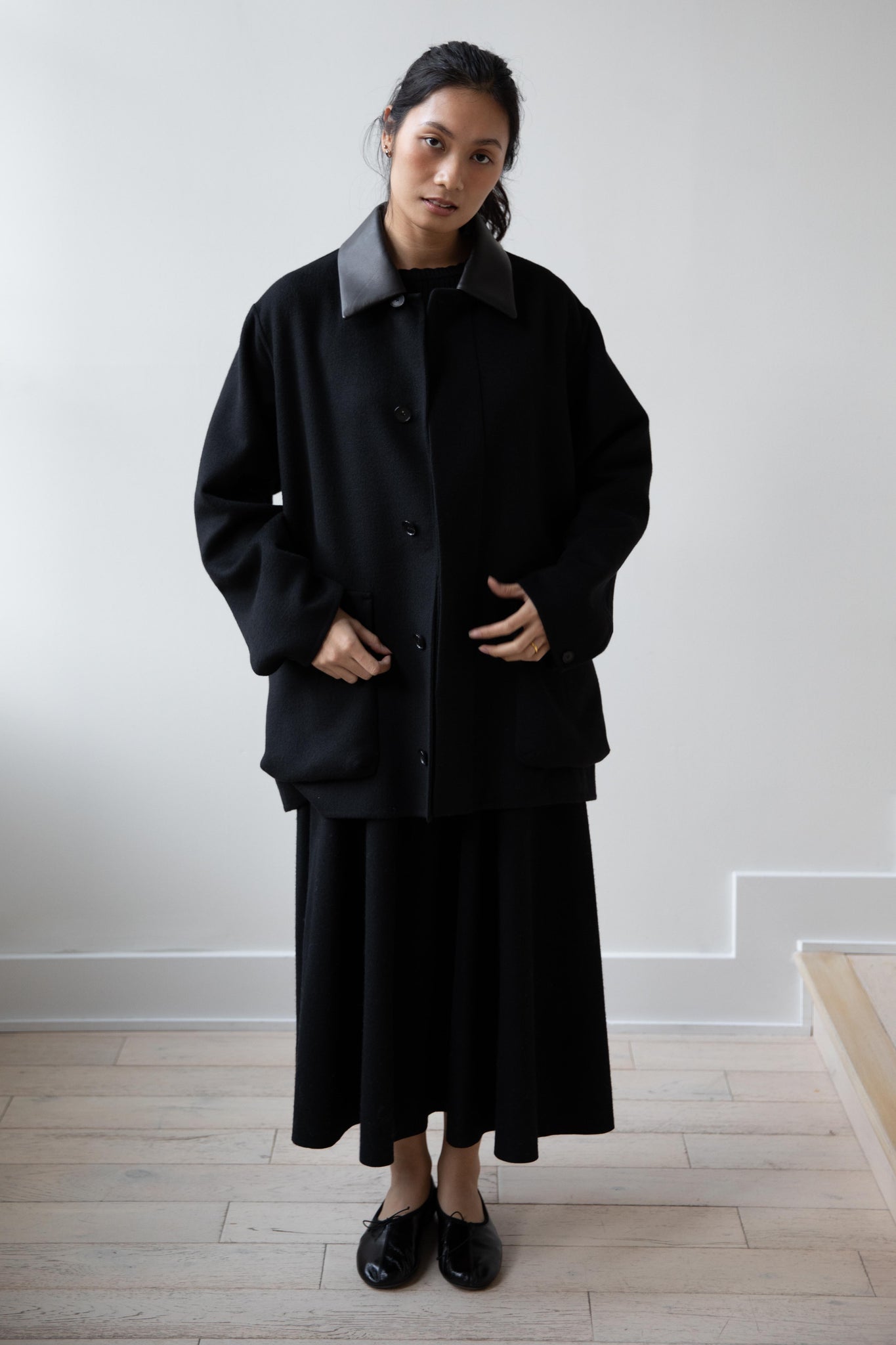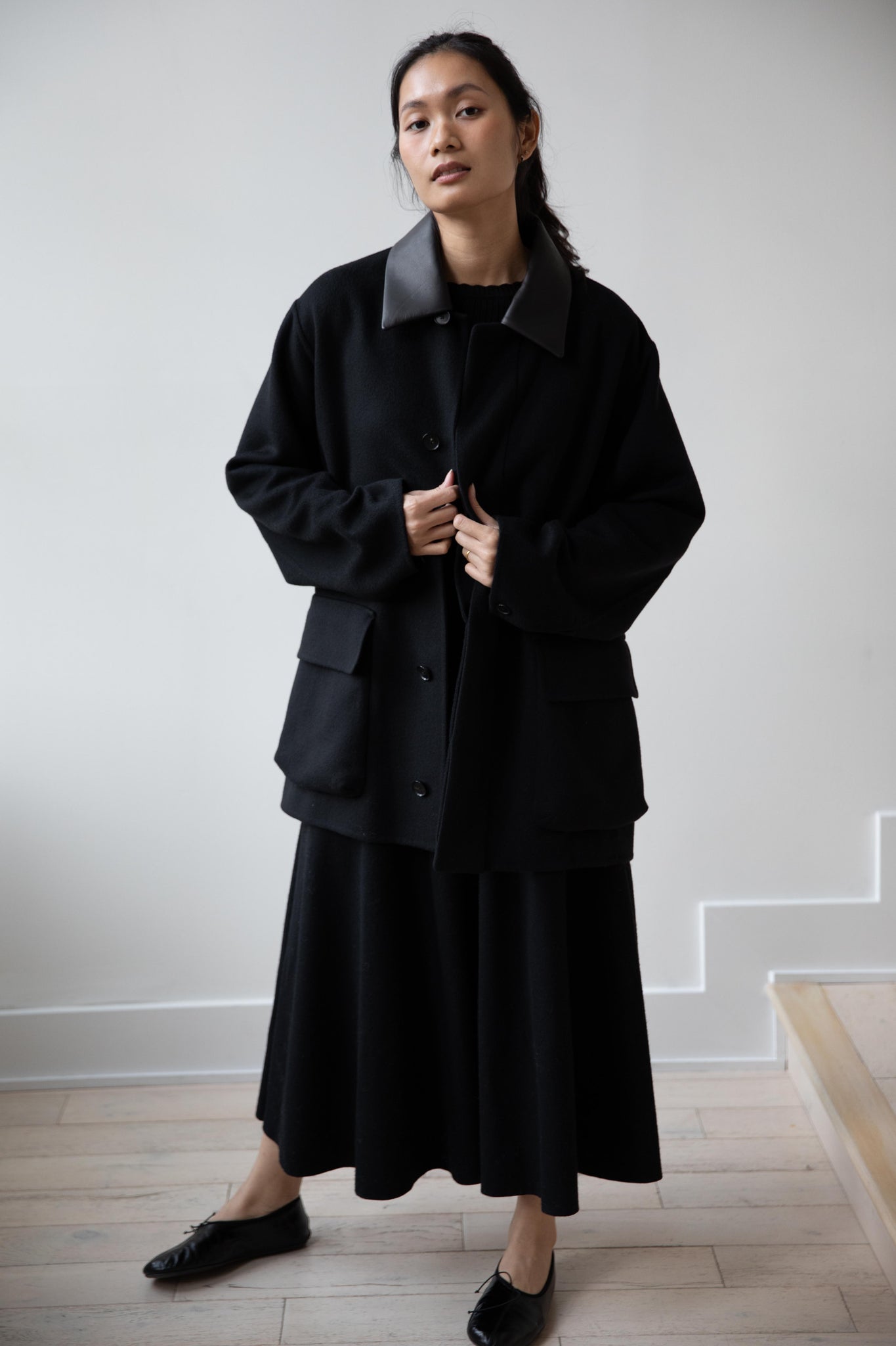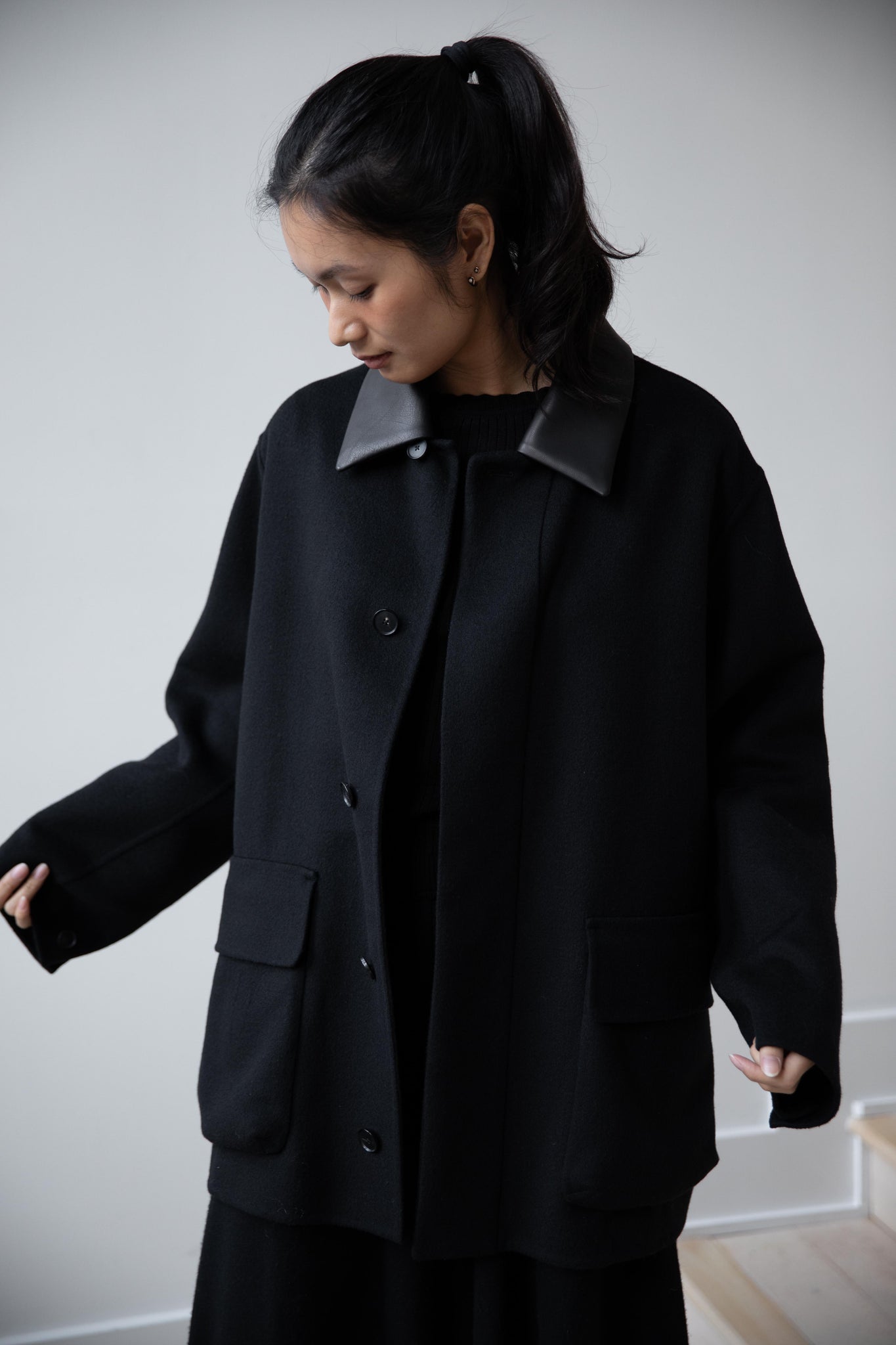 We see this jacket as an ideal version of a perfect chore coat; this one is crafted in the softest cashmere, you won't want to ever have another coat. There are two large front pockets with flaps, a hidden button up front, and a leather collar. The leather collar encapsulated a hidden plain collar and is detachable, so you can have the best of both worlds depending on your mood.