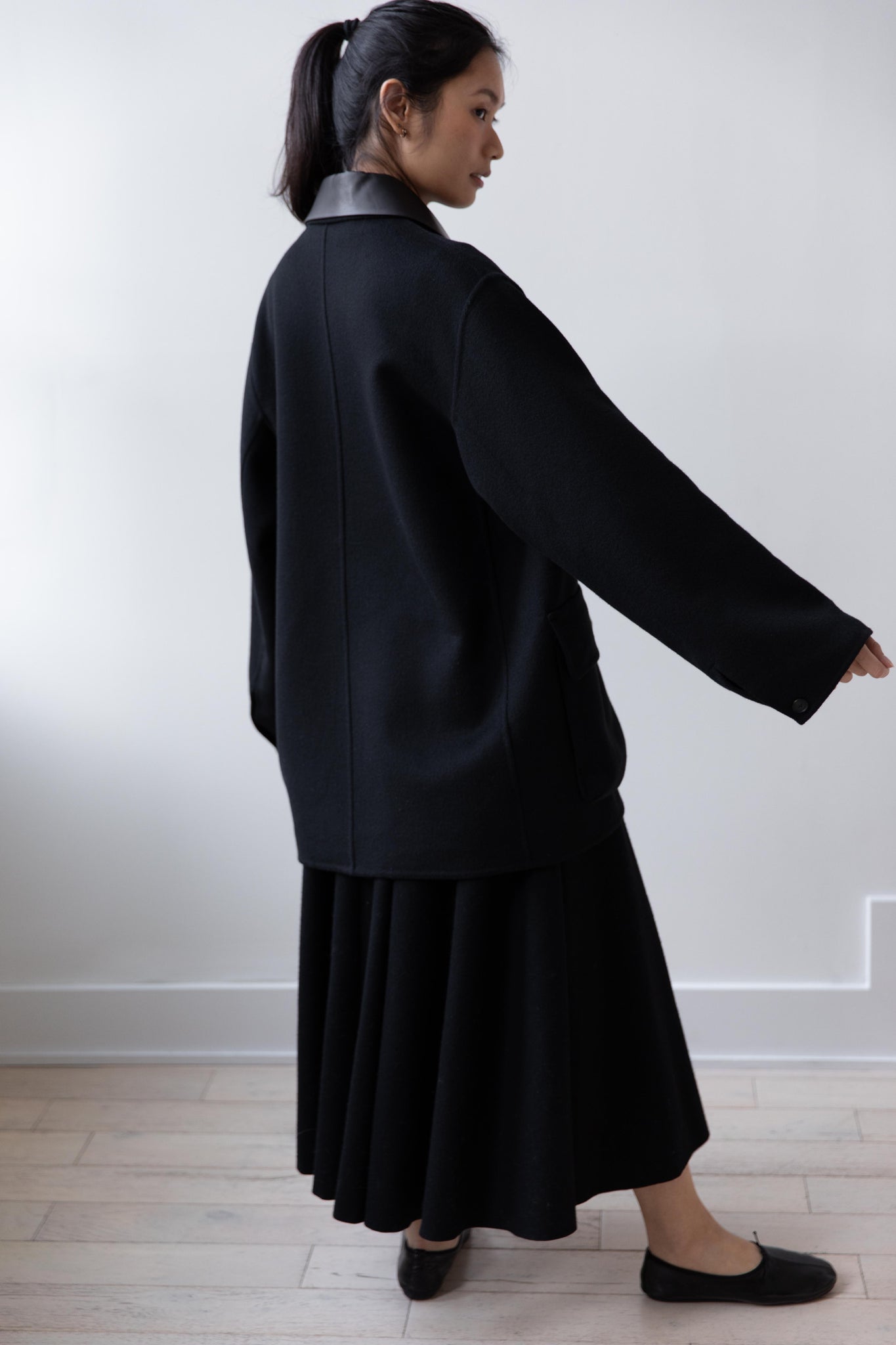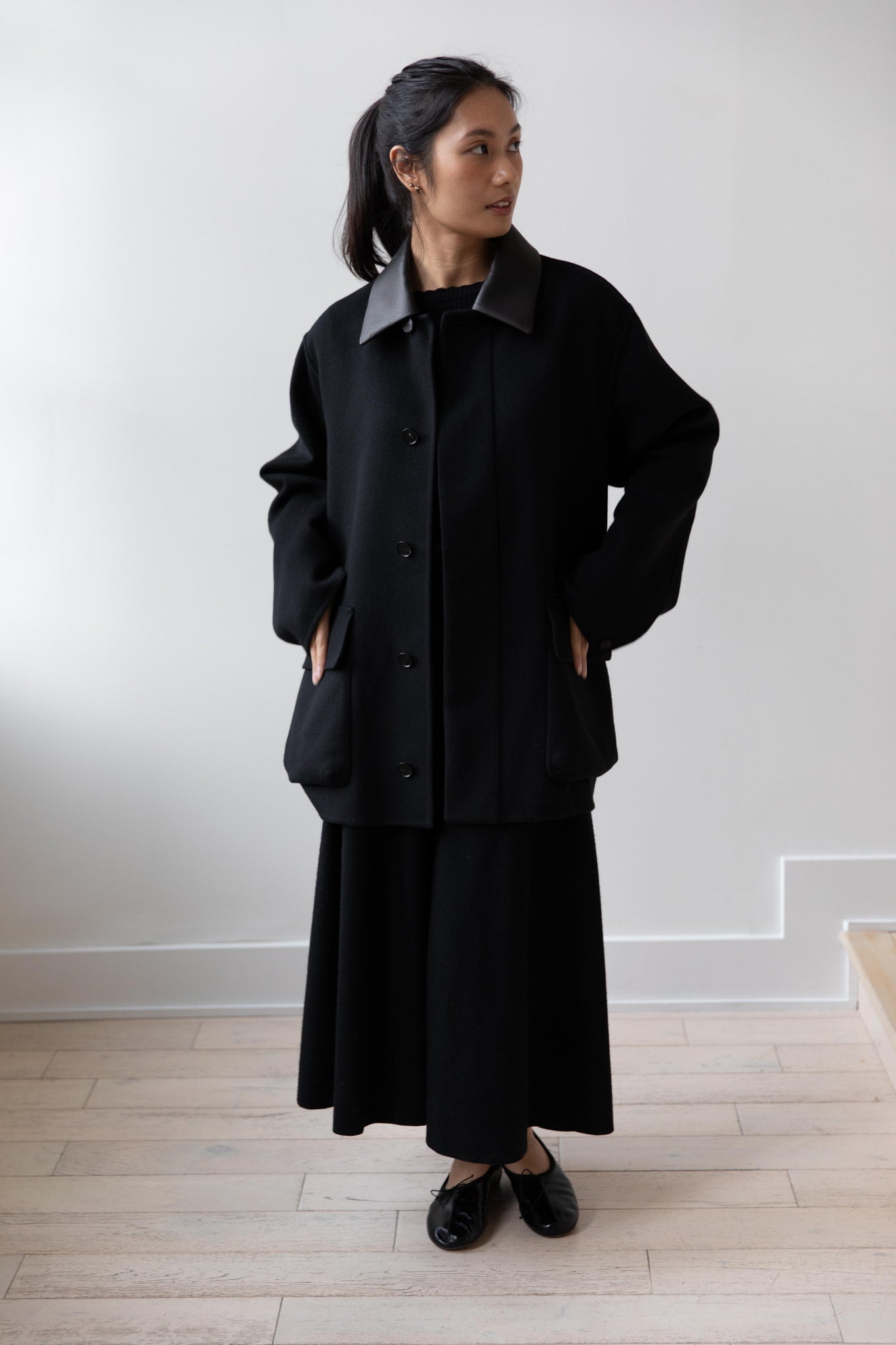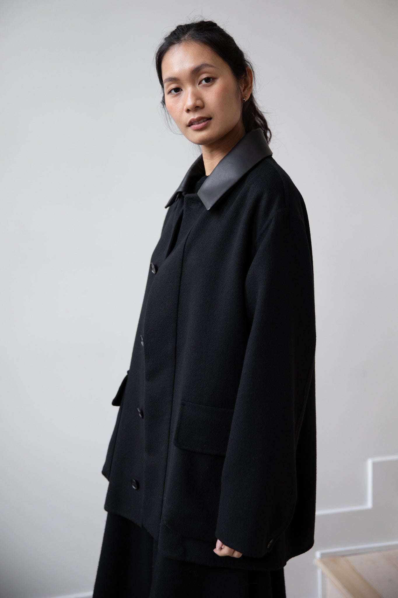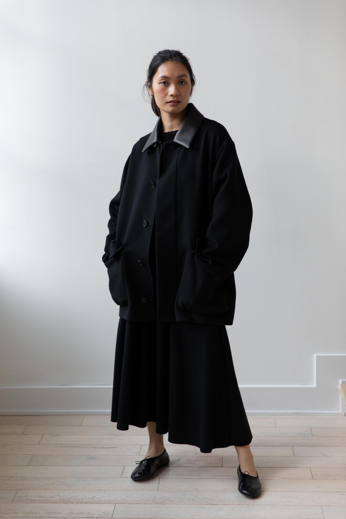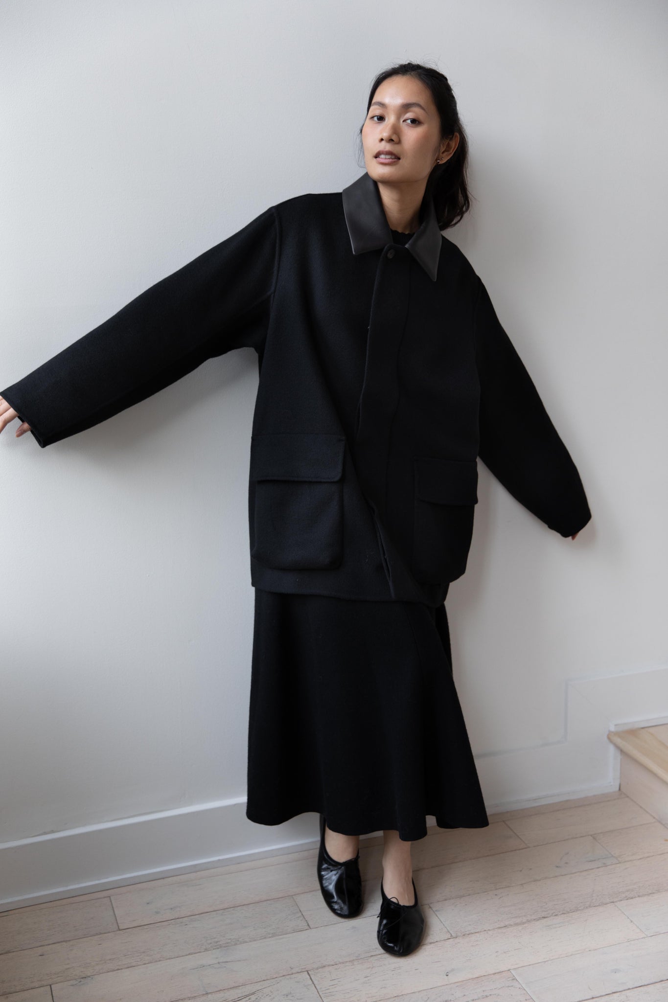We see this jacket as an ideal version of a perfect chore coat; this one is crafted in the softest cashmere, you won't want to ever have another coat. There are two large front pockets with flaps, a hidden button up front, and a leather collar. The leather collar encapsulated a hidden plain collar and is detachable, so you can have the best of both worlds depending on your mood.