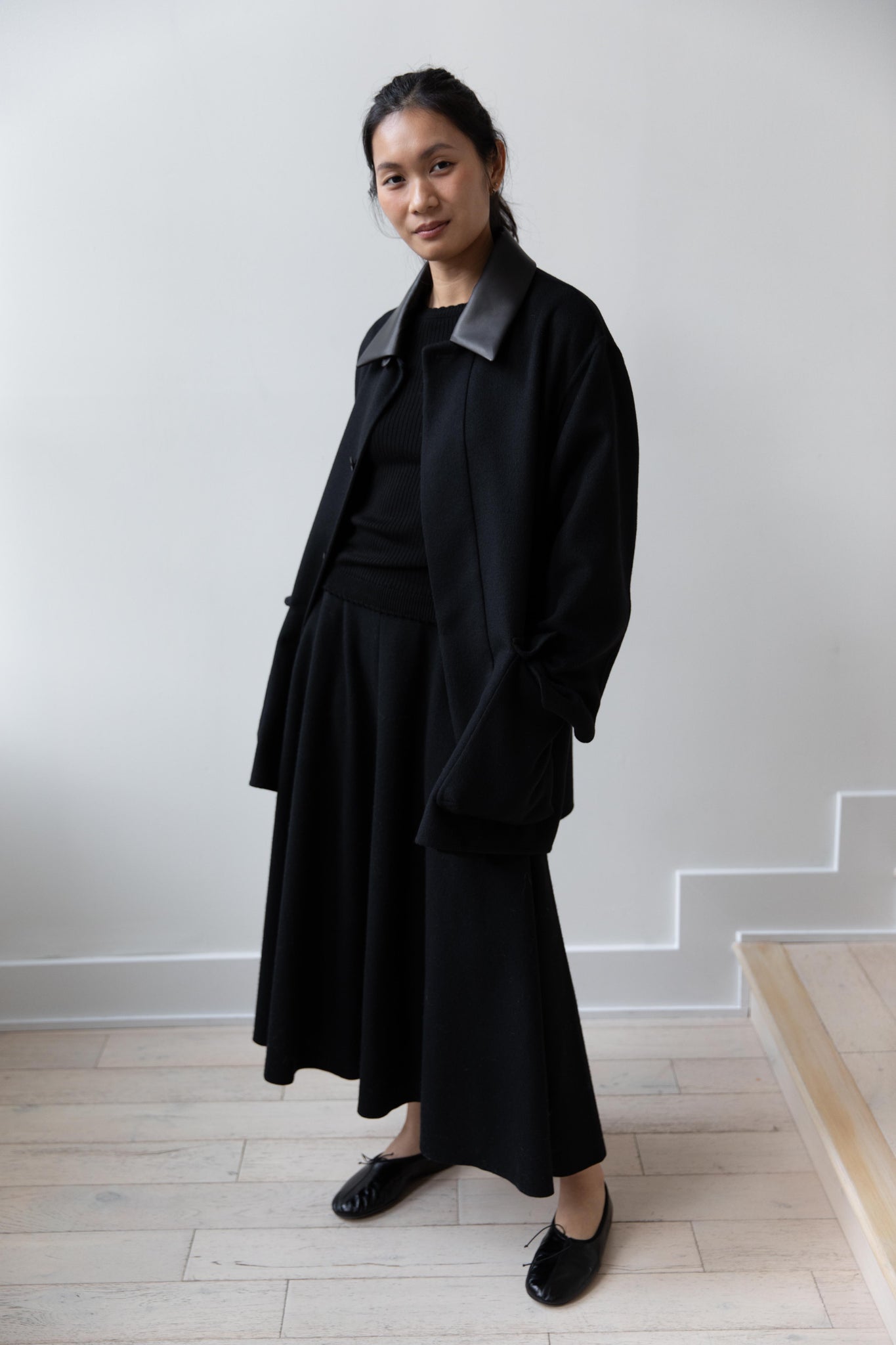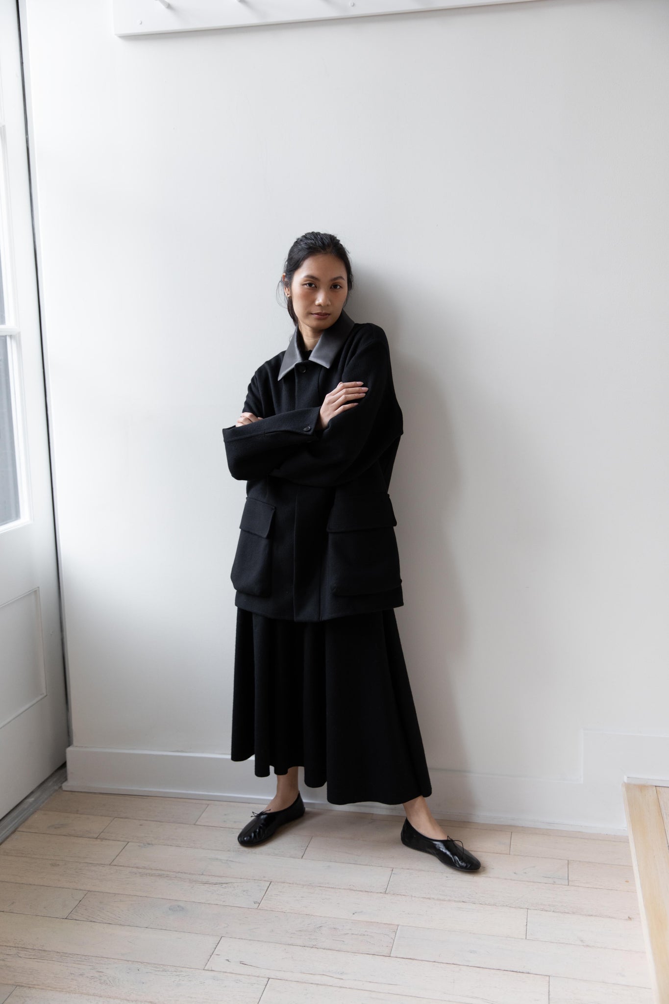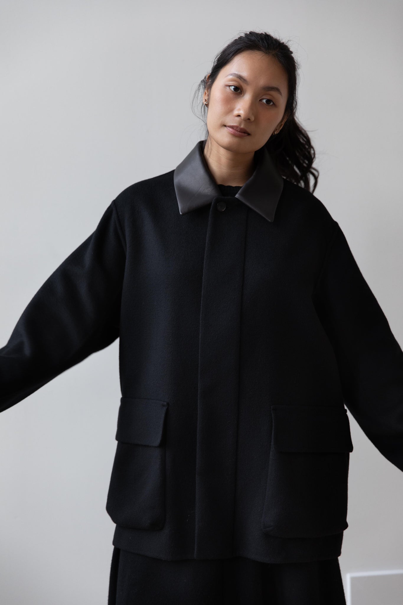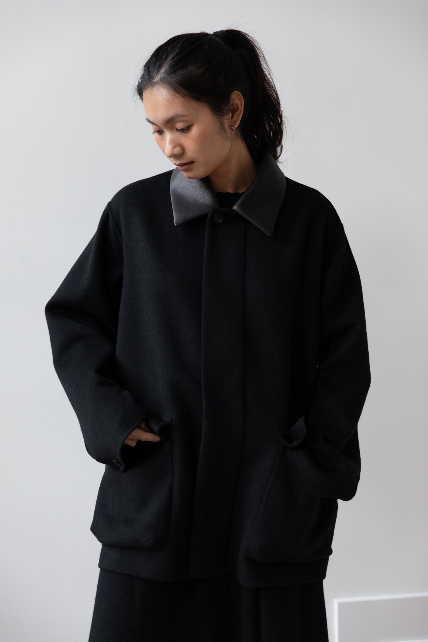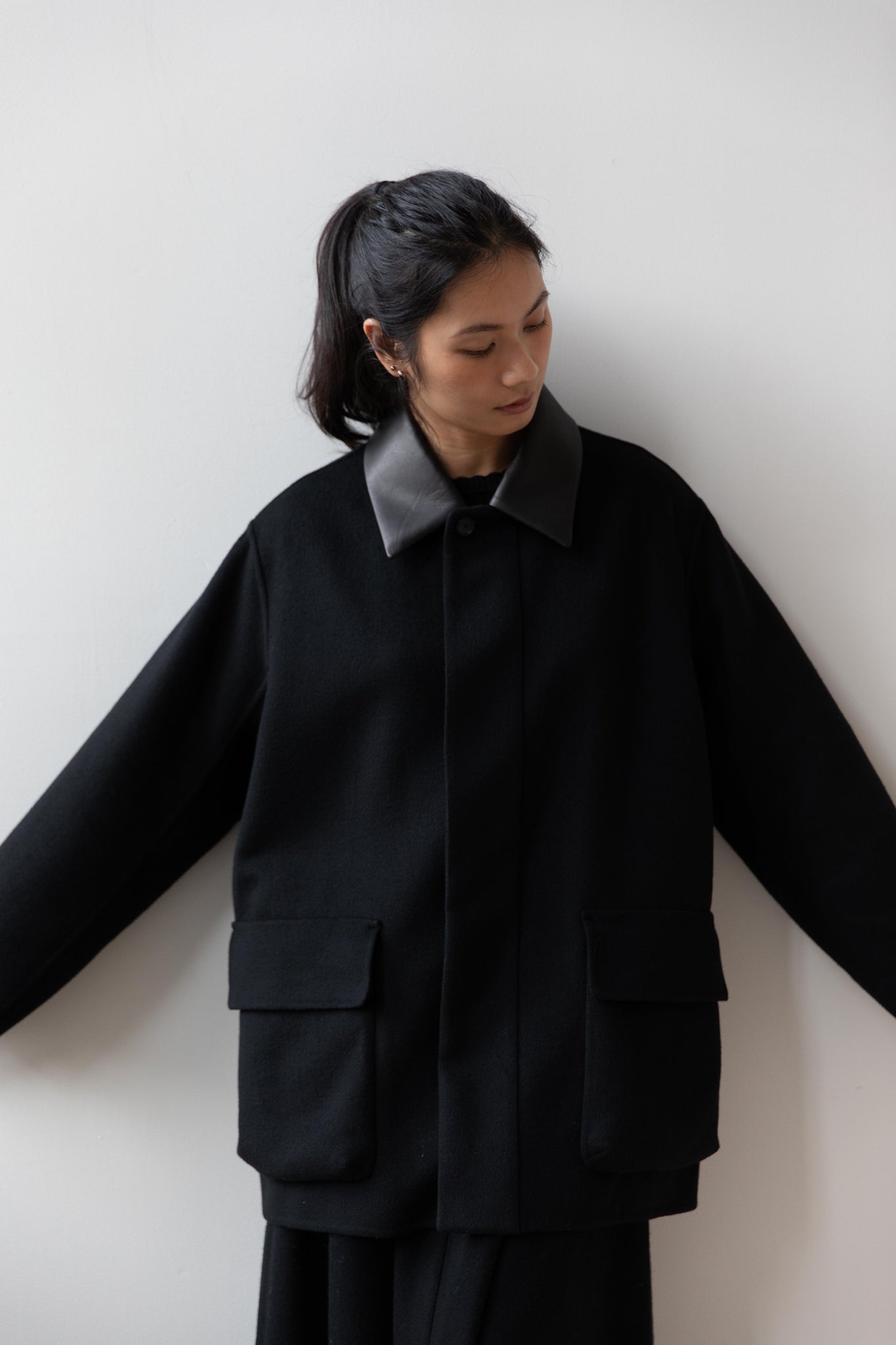 We see this jacket as an ideal version of a perfect chore coat; this one is crafted in the softest cashmere, you won't want to ever have another coat. There are two large front pockets with flaps, a hidden button up front, and a leather collar. The leather collar encapsulated a hidden plain collar and is detachable, so you can have the best of both worlds depending on your mood.