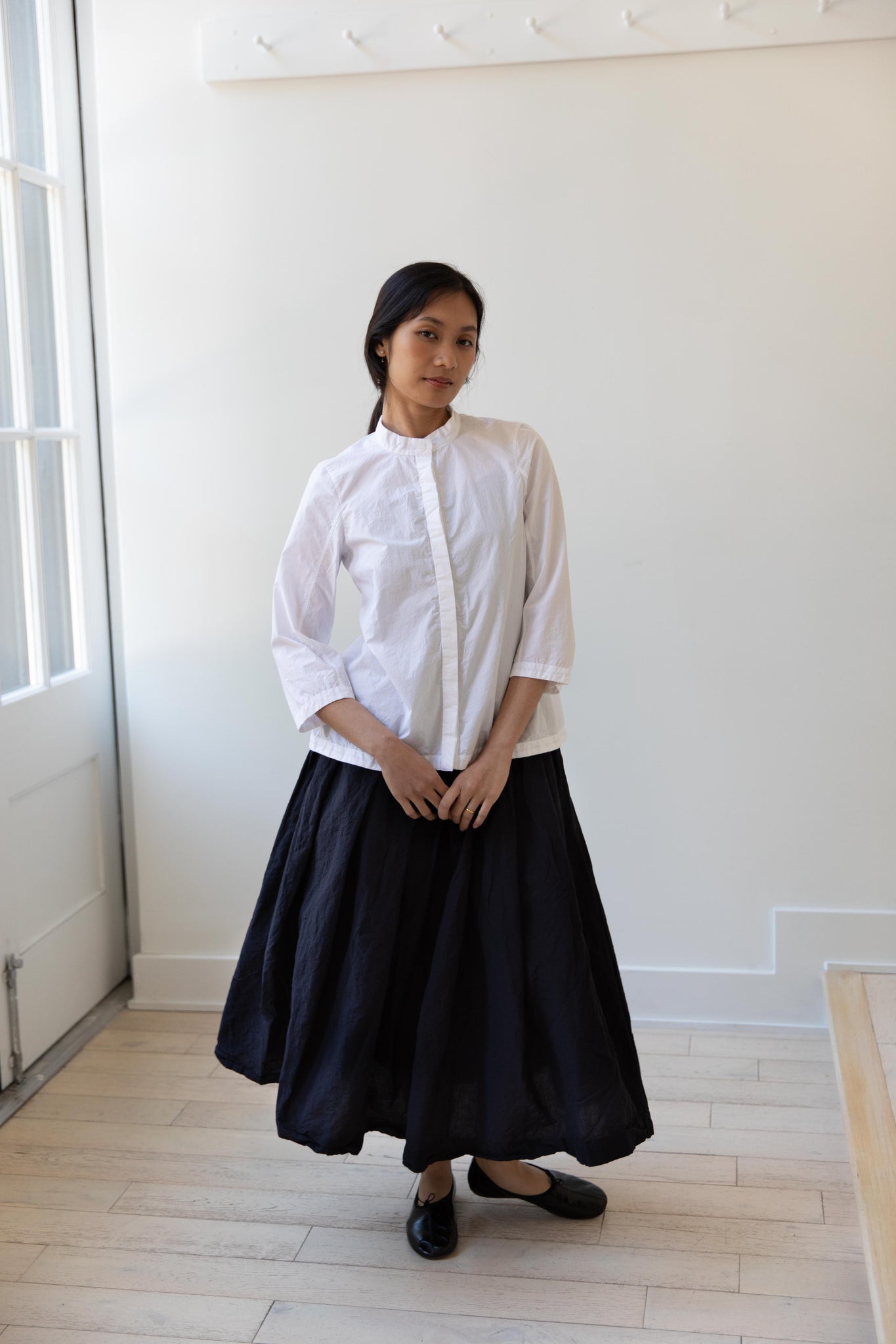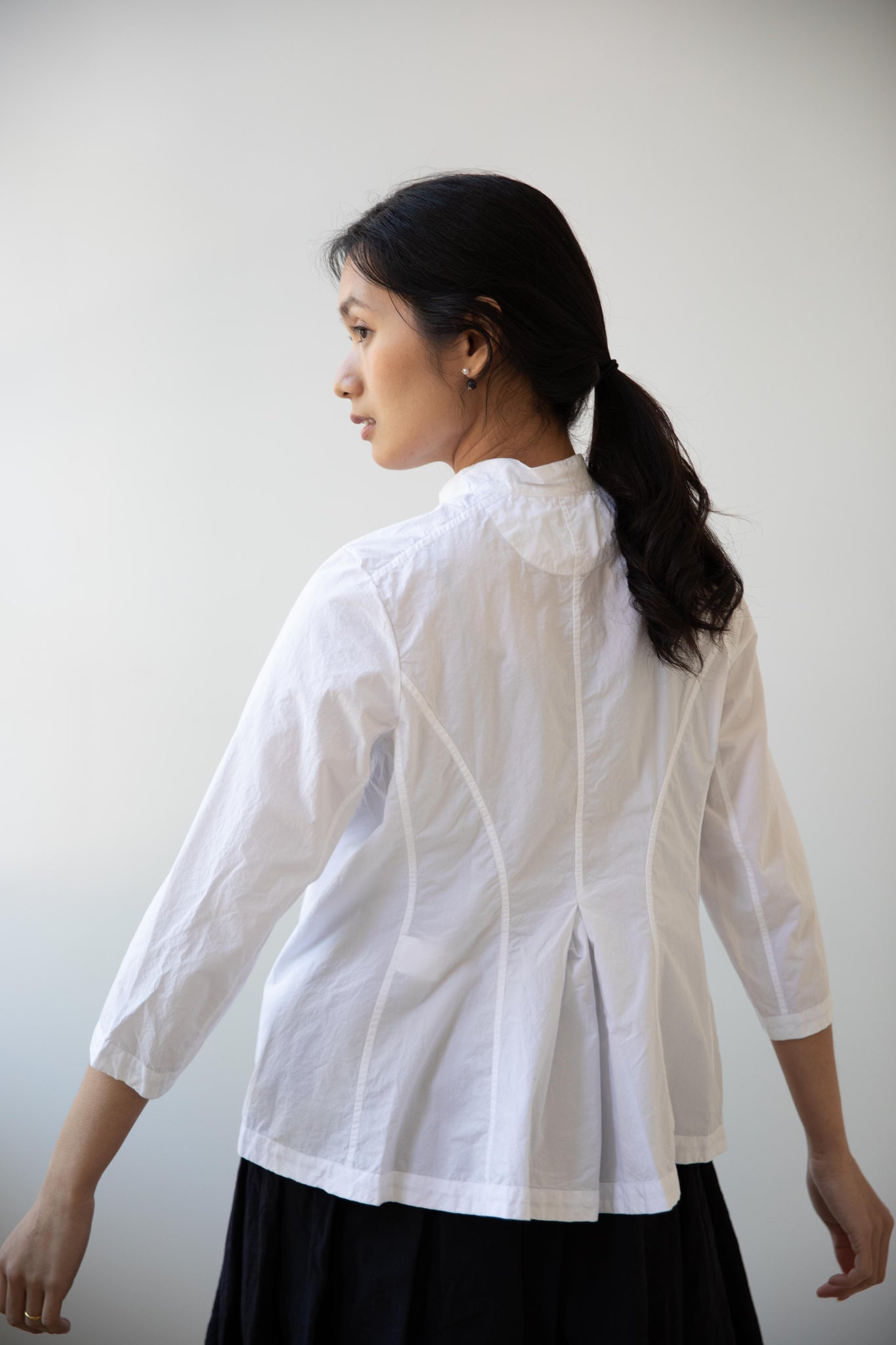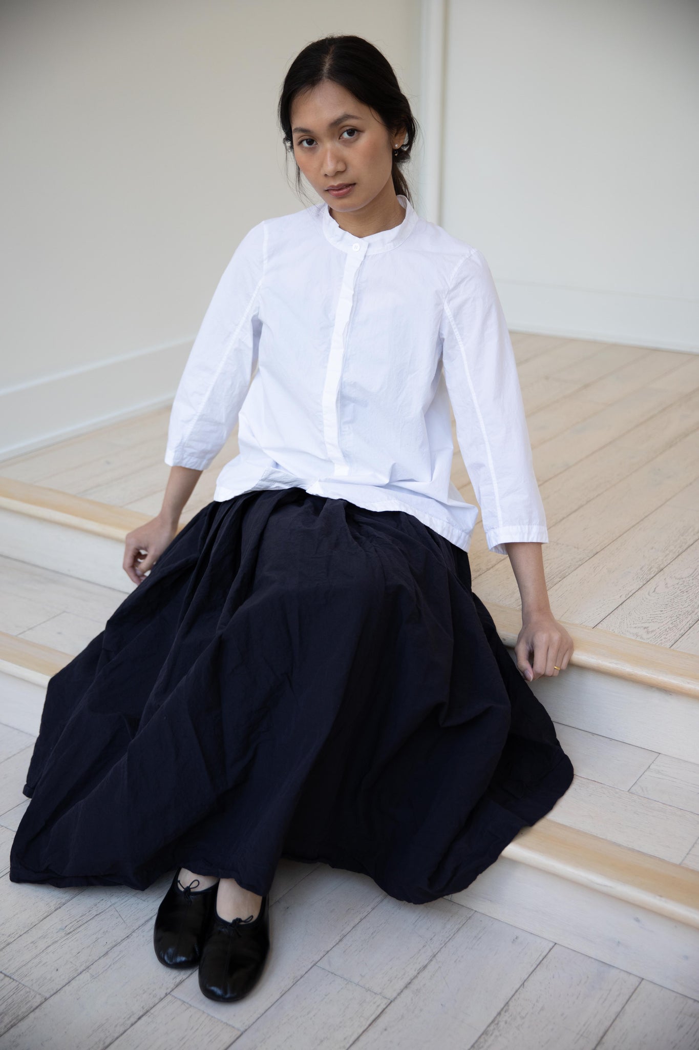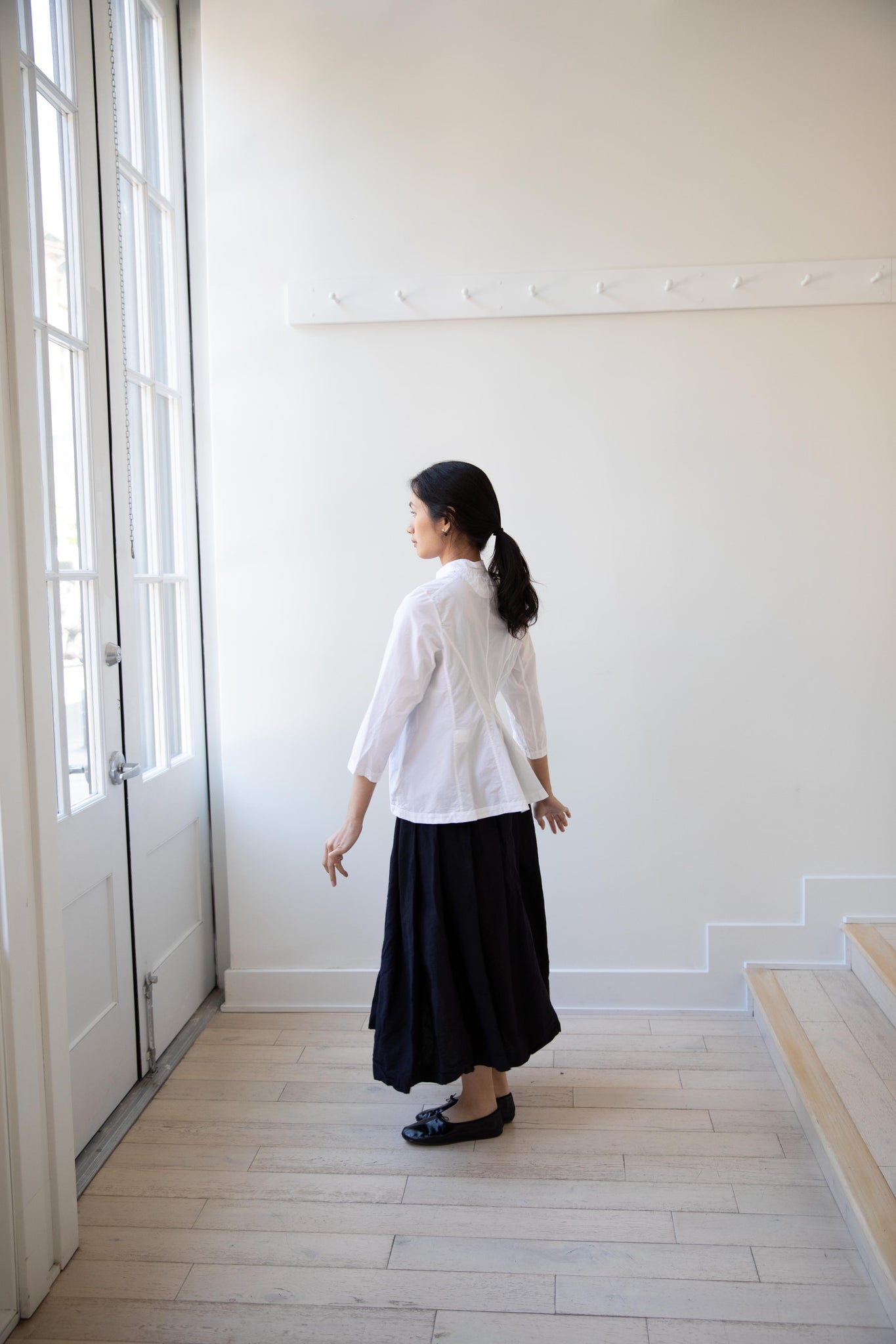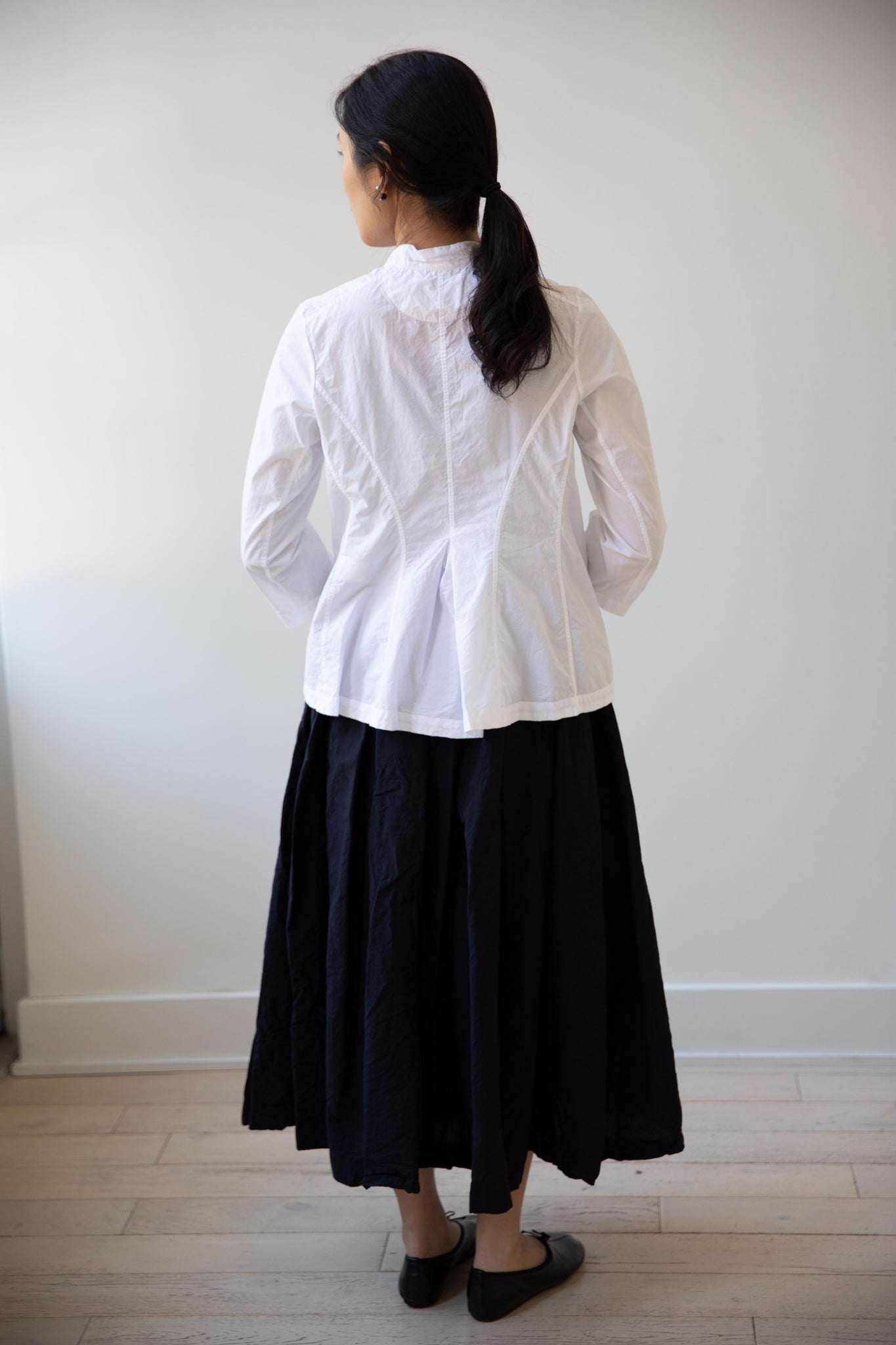 We love this new shirt style from Bergfabel because of it's thoughtful tailoring and construction. It has three quarter sleeves with a flat band collar at the top. The back has multiple seams so the fit is just right and flares out a little bit with one inverted pleat in the center back. We love this top paired with a great skirt.