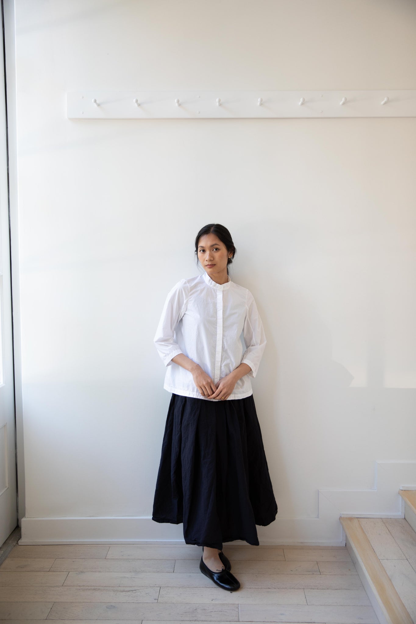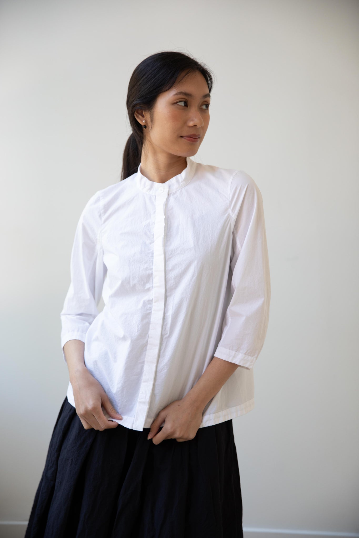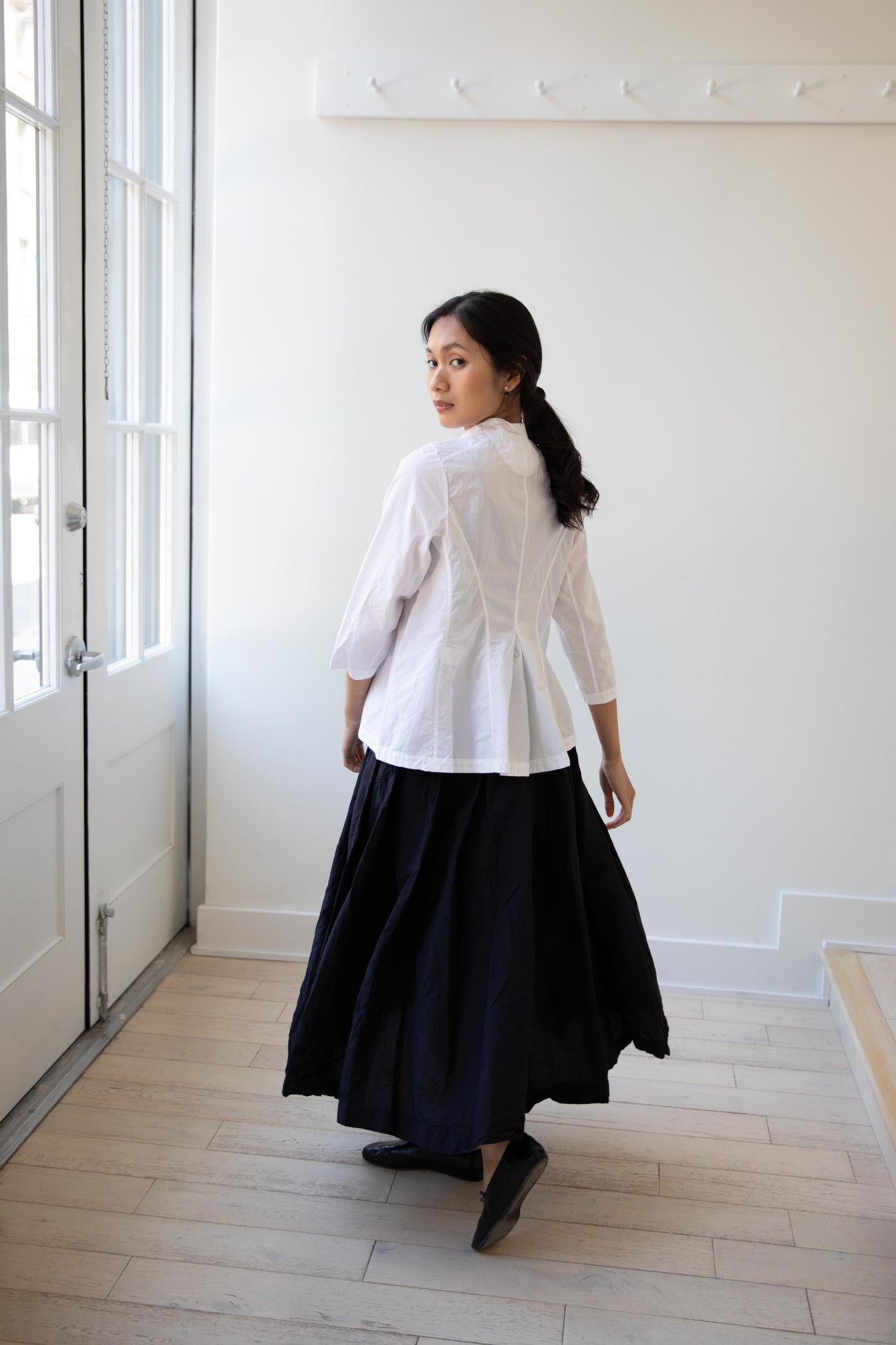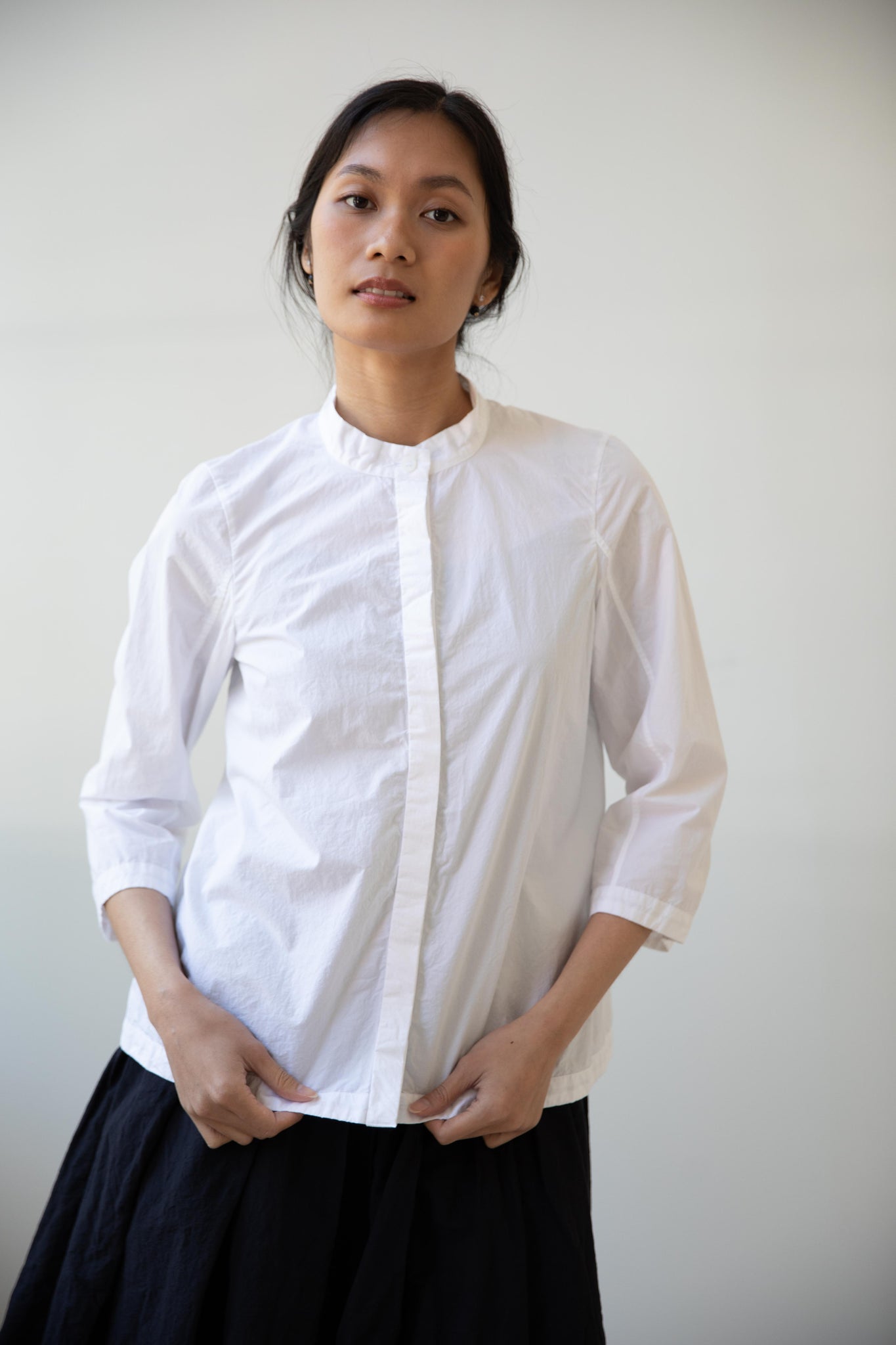 We love this new shirt style from Bergfabel because of it's thoughtful tailoring and construction. It has three quarter sleeves with a flat band collar at the top. The back has multiple seams so the fit is just right and flares out a little bit with one inverted pleat in the center back. We love this top paired with a great skirt.
