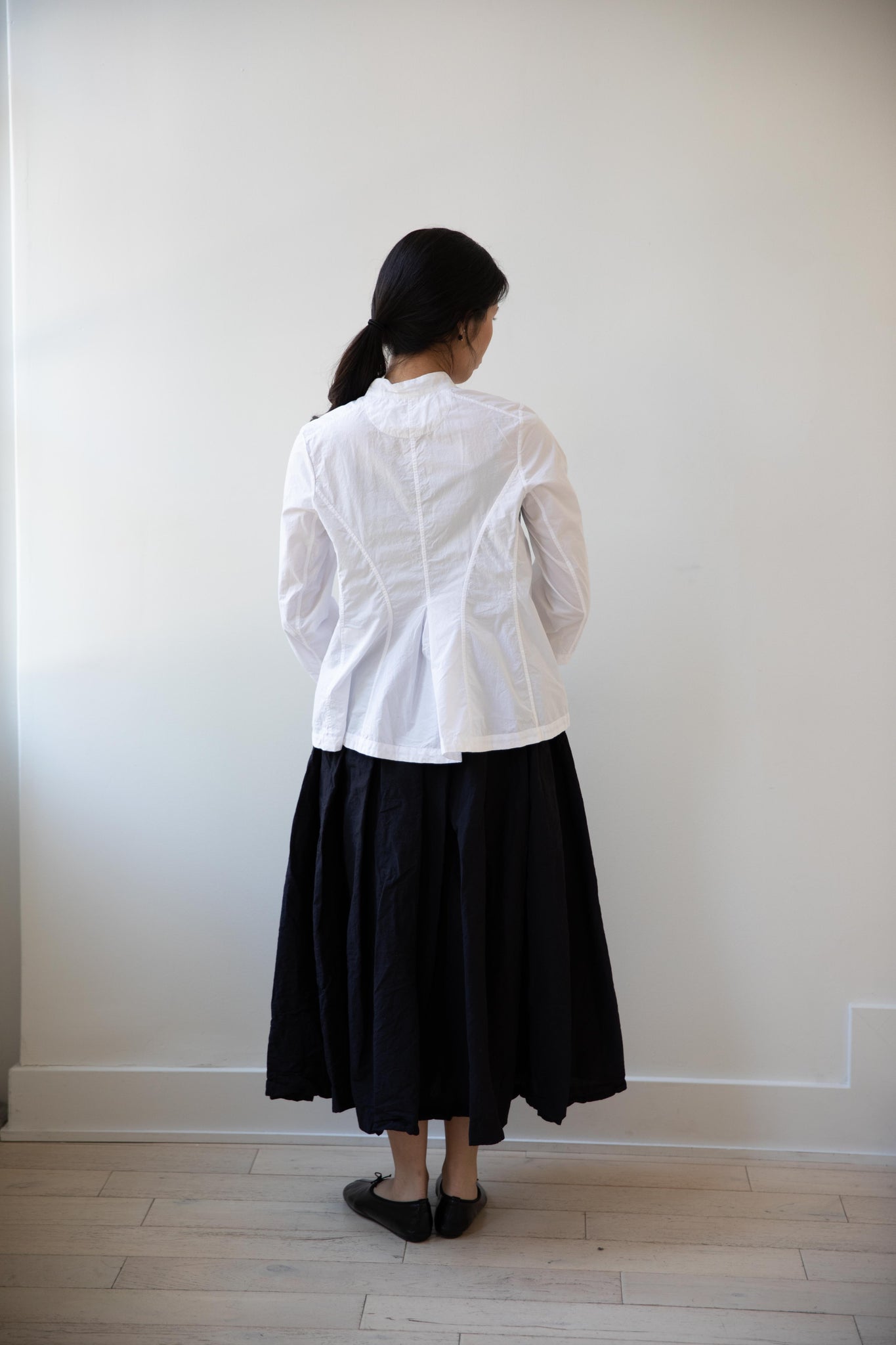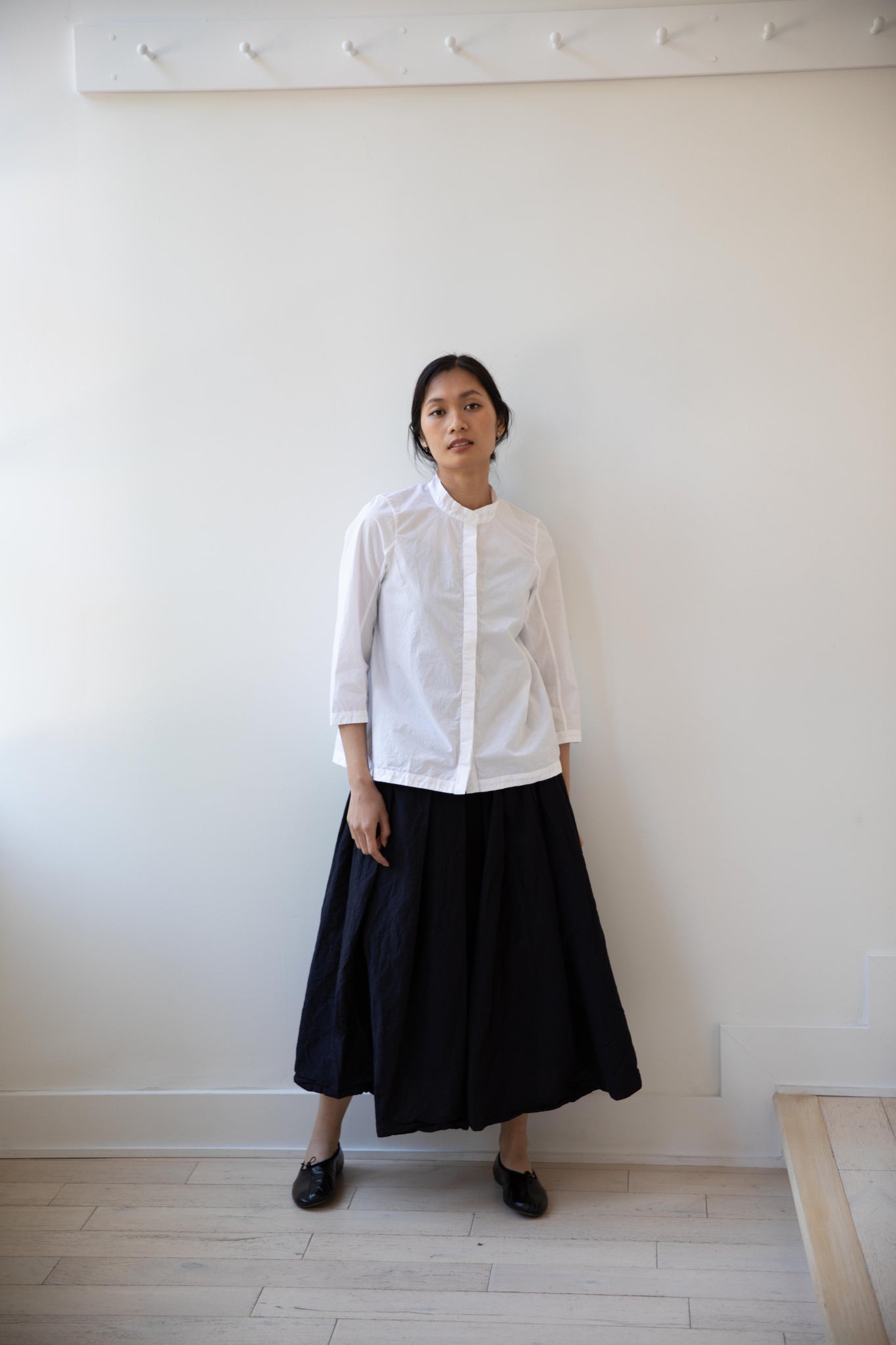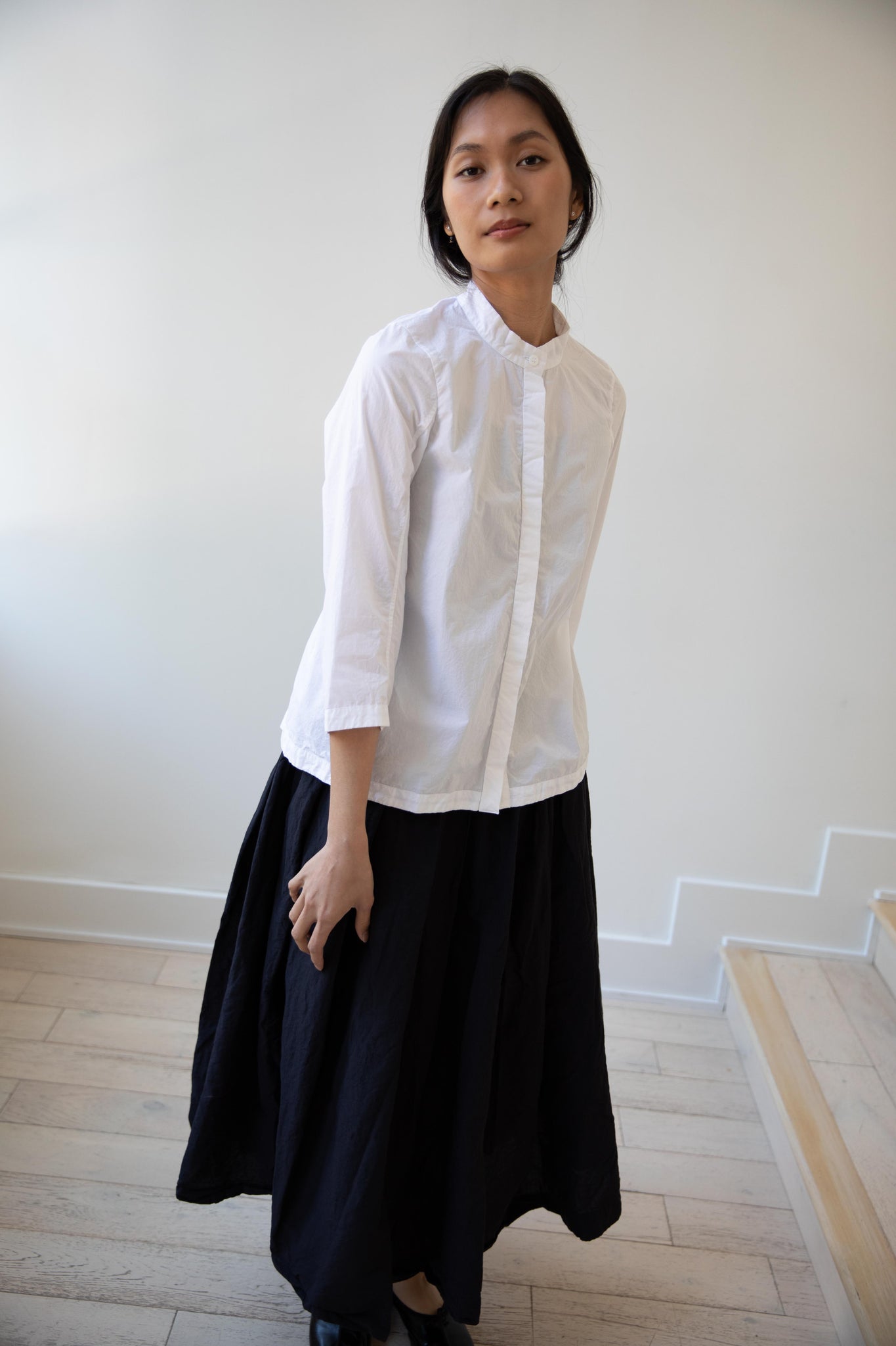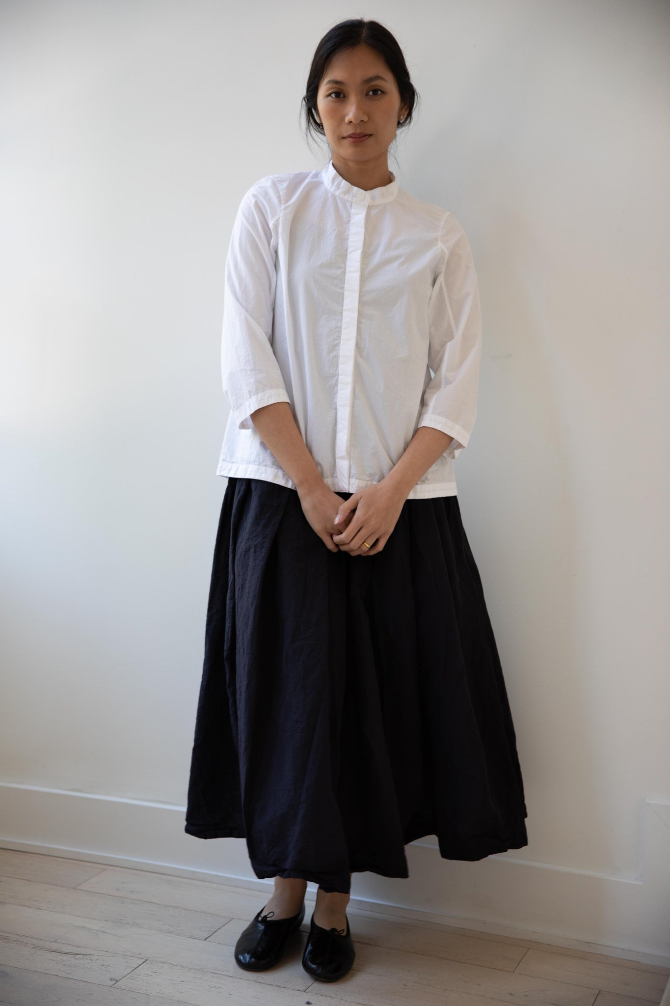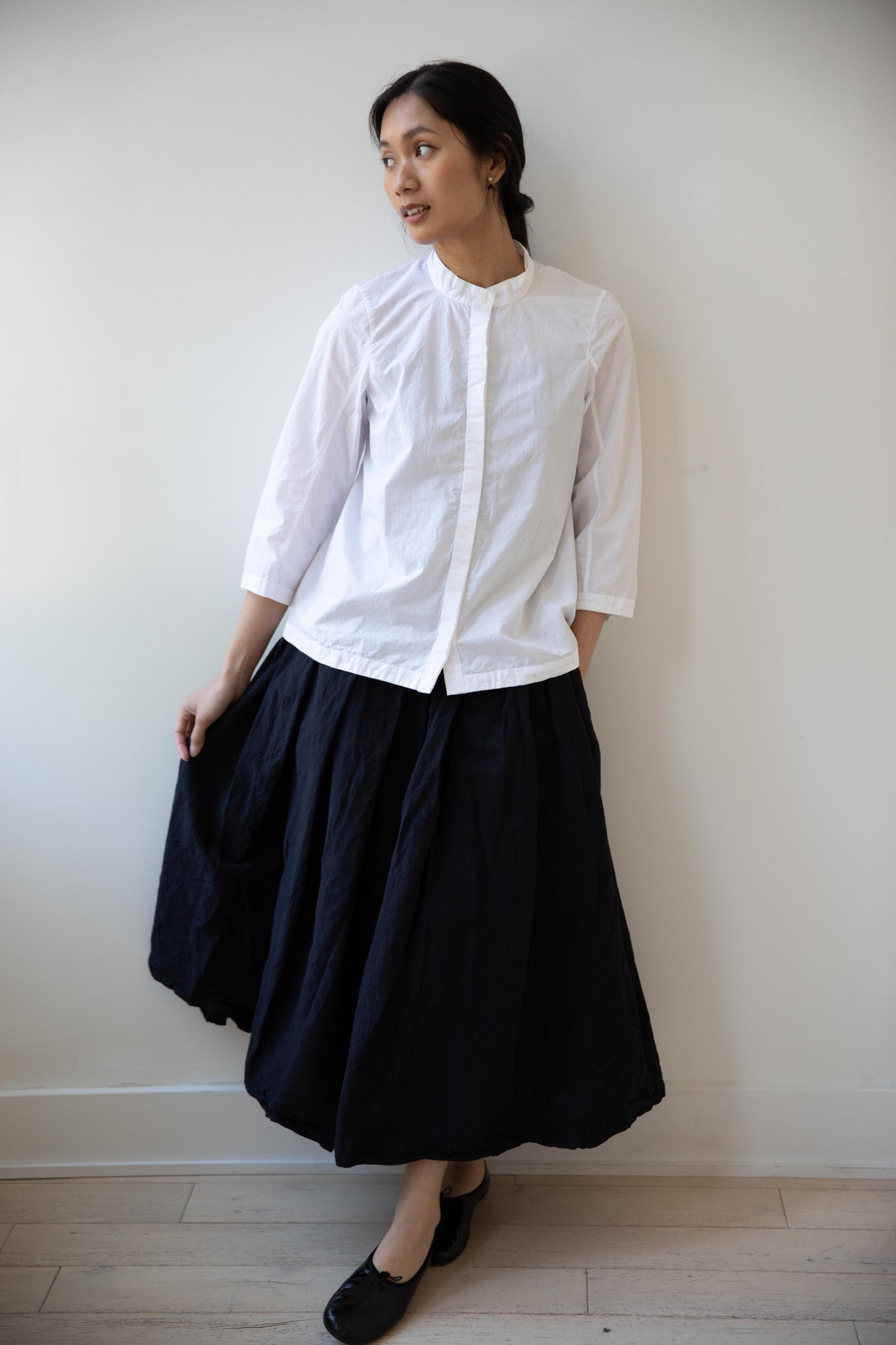 We love this new shirt style from Bergfabel because of it's thoughtful tailoring and construction. It has three quarter sleeves with a flat band collar at the top. The back has multiple seams so the fit is just right and flares out a little bit with one inverted pleat in the center back. We love this top paired with a great skirt.