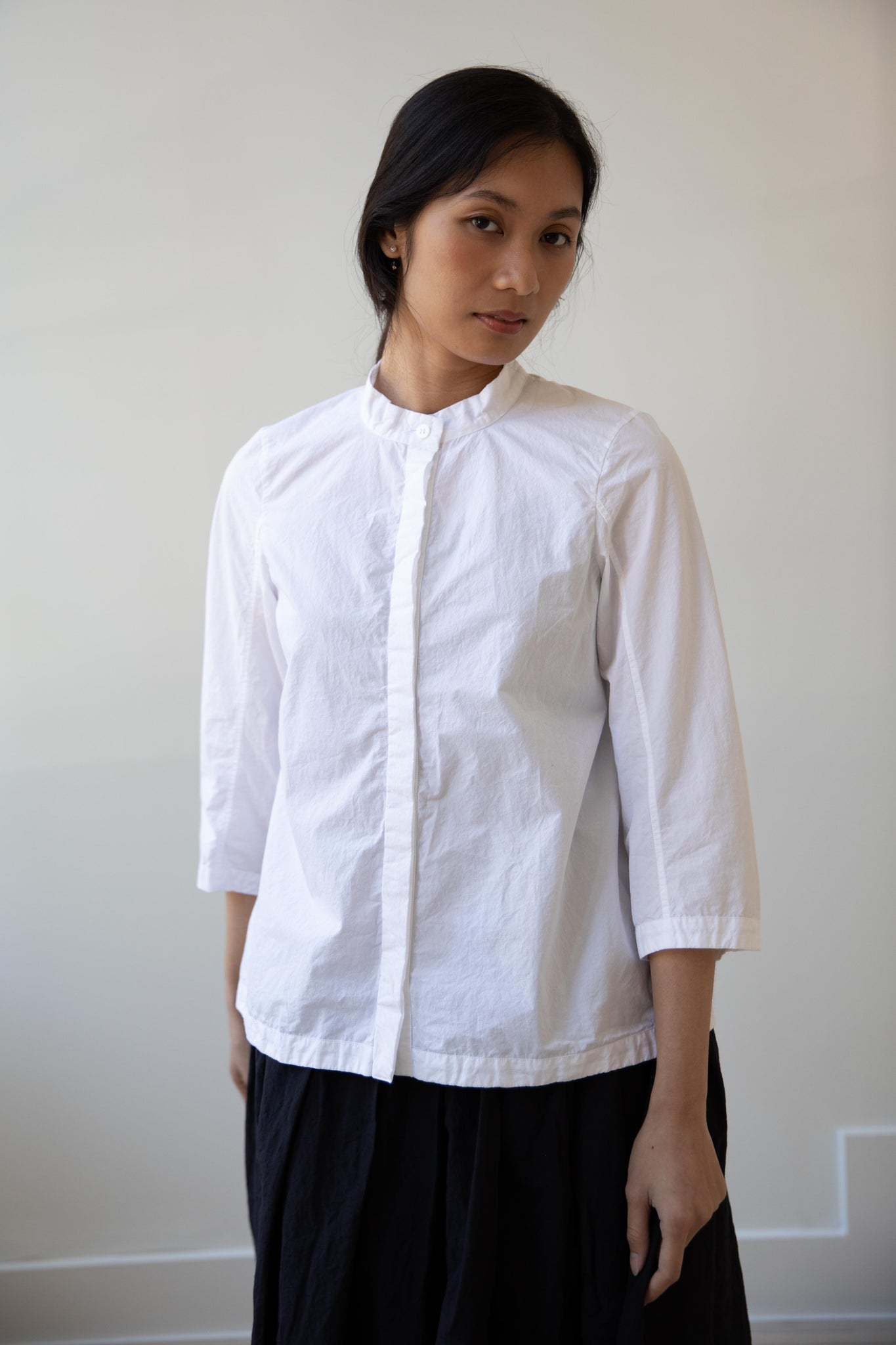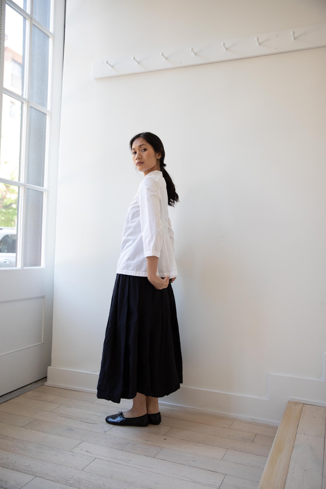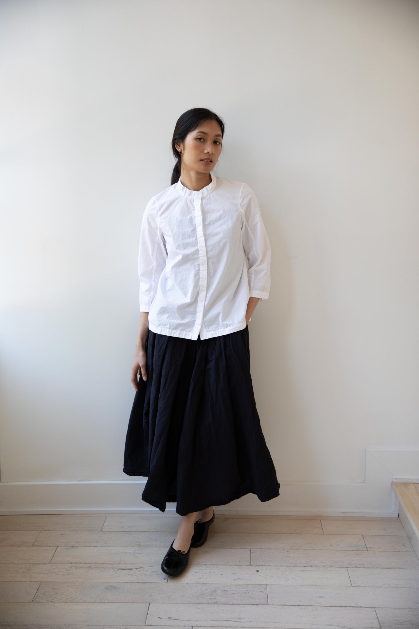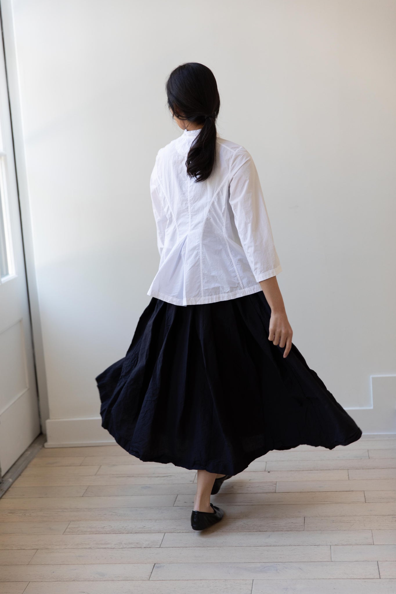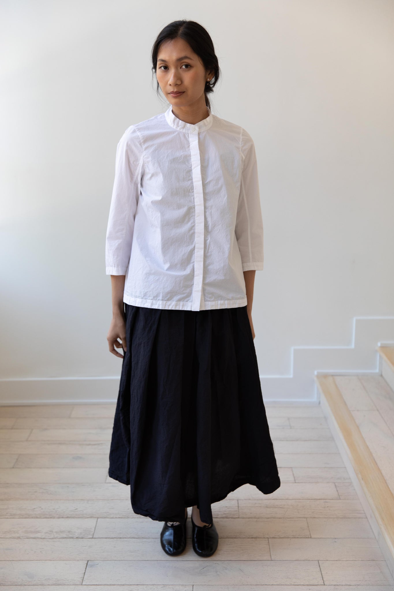 We love this new shirt style from Bergfabel because of it's thoughtful tailoring and construction. It has three quarter sleeves with a flat band collar at the top. The back has multiple seams so the fit is just right and flares out a little bit with one inverted pleat in the center back. We love this top paired with a great skirt.