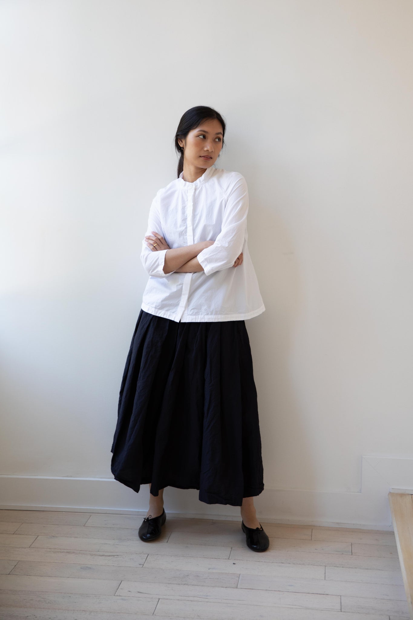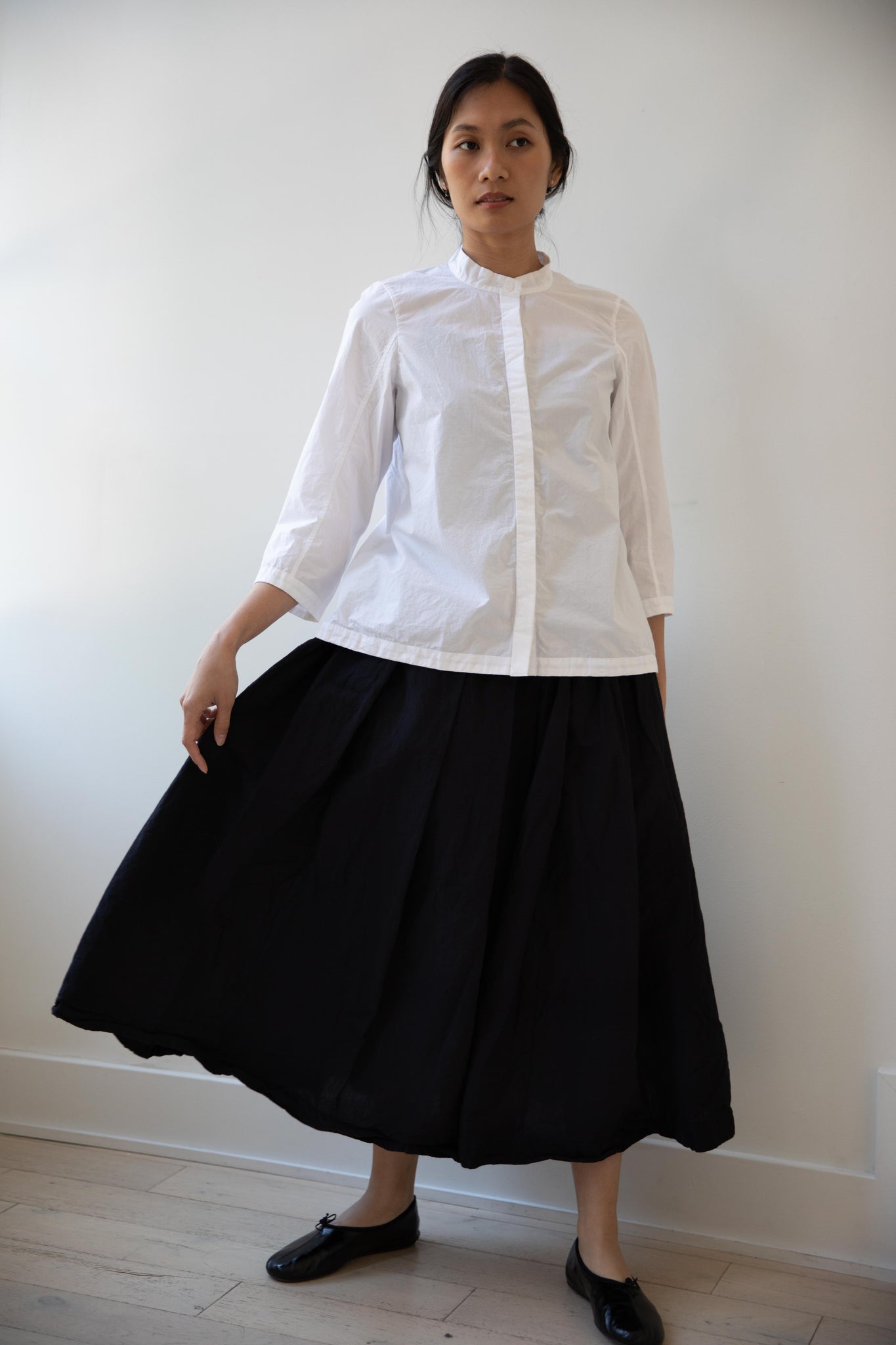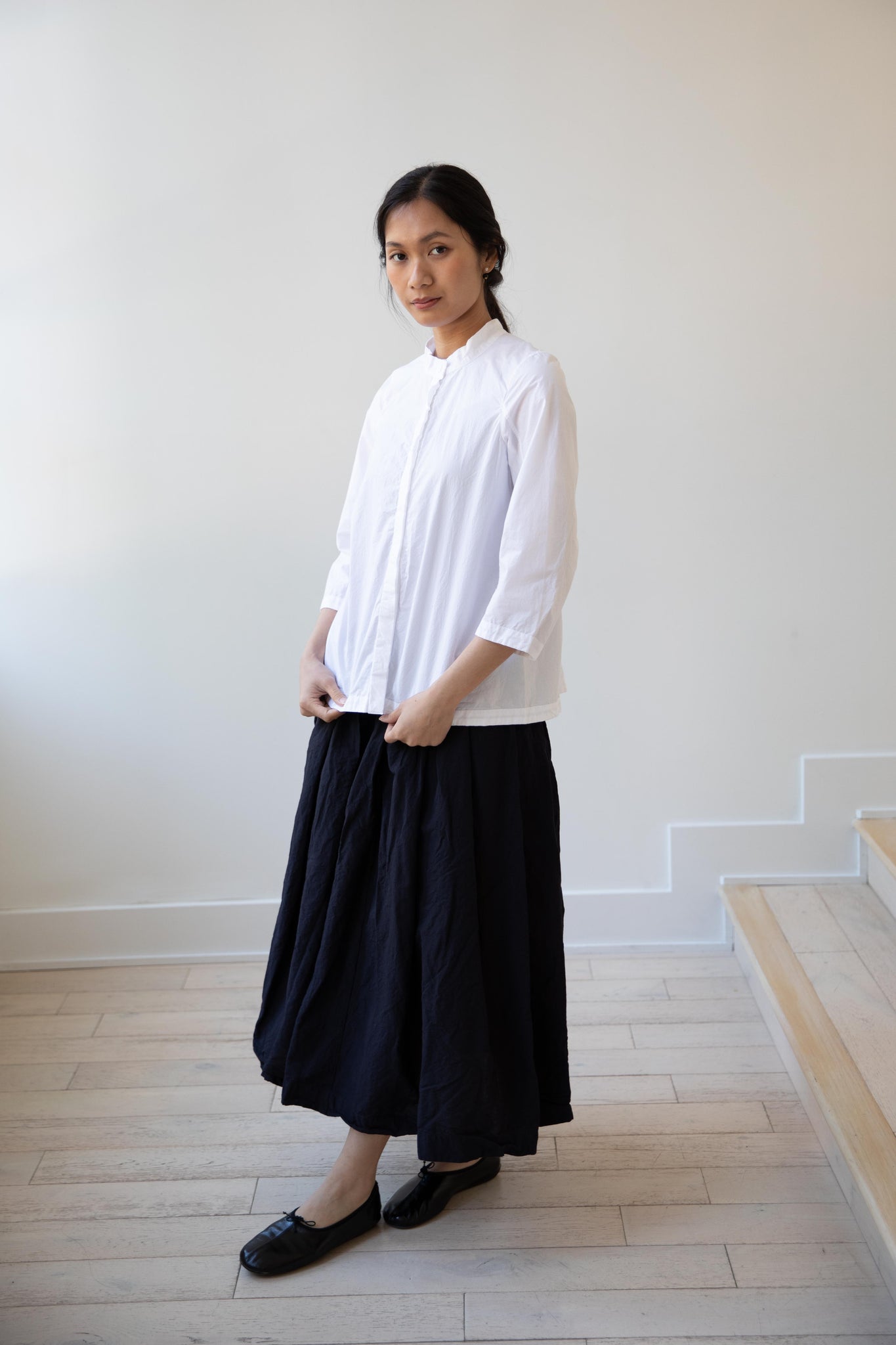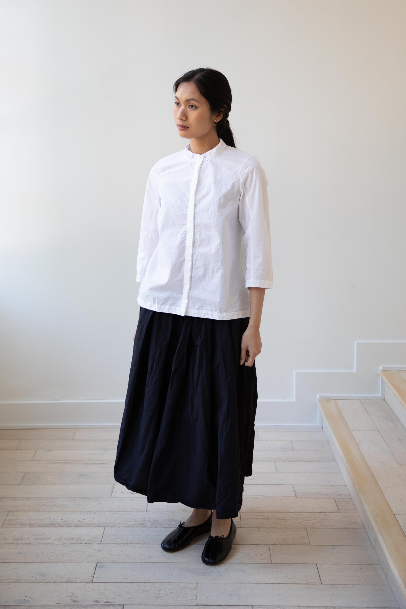 We love this new shirt style from Bergfabel because of it's thoughtful tailoring and construction. It has three quarter sleeves with a flat band collar at the top. The back has multiple seams so the fit is just right and flares out a little bit with one inverted pleat in the center back. We love this top paired with a great skirt.