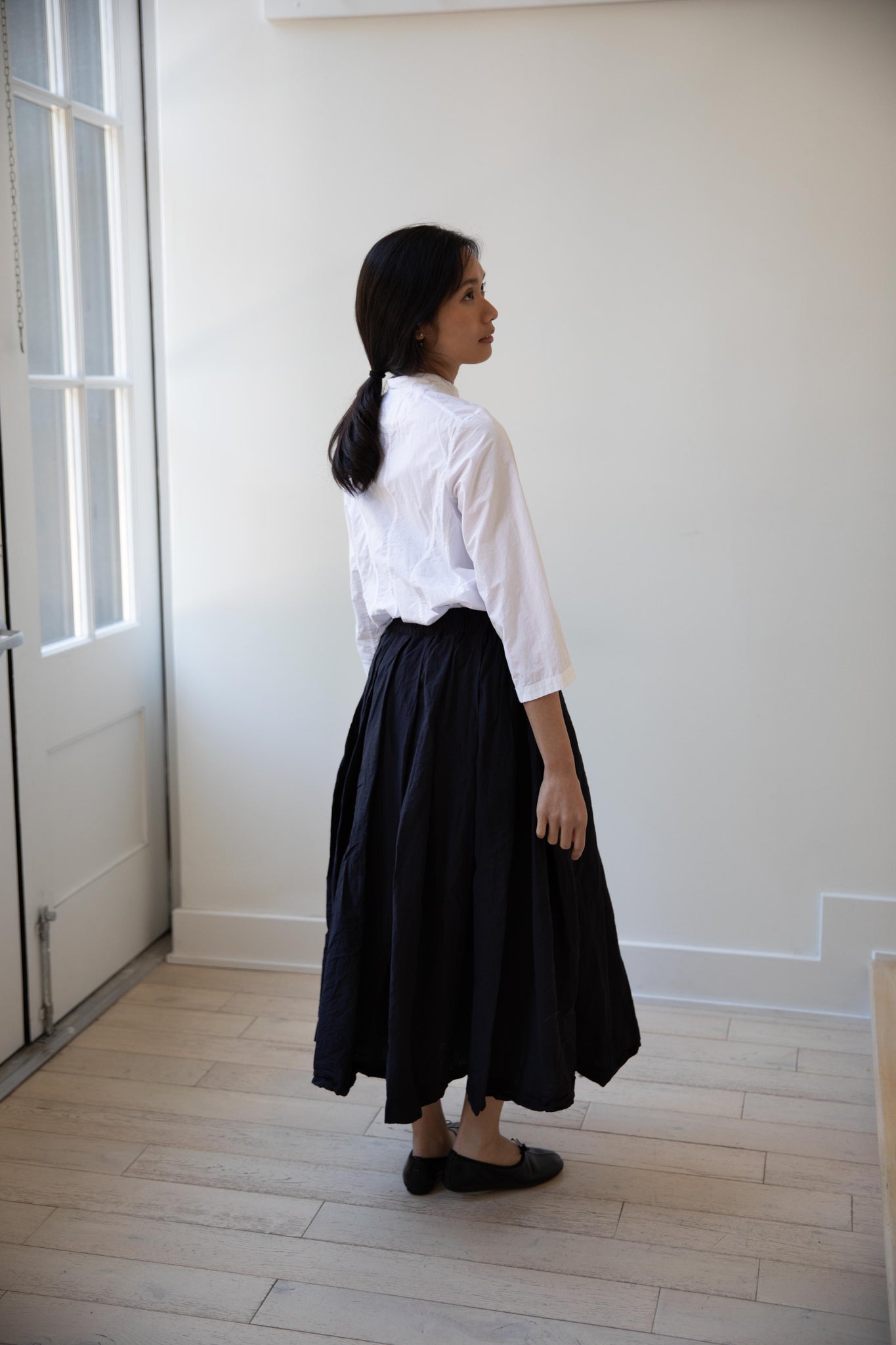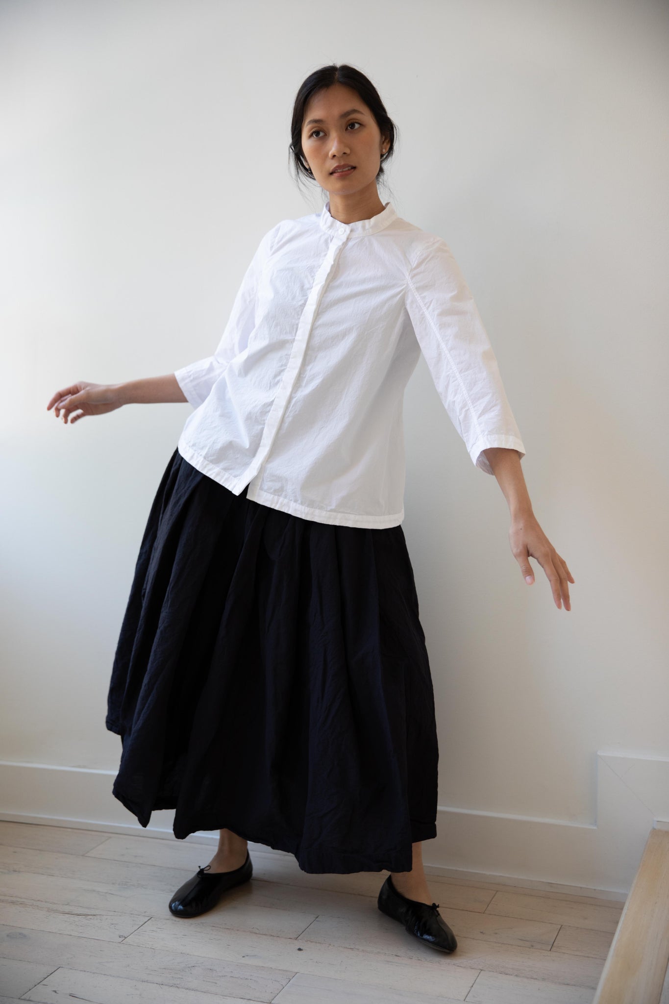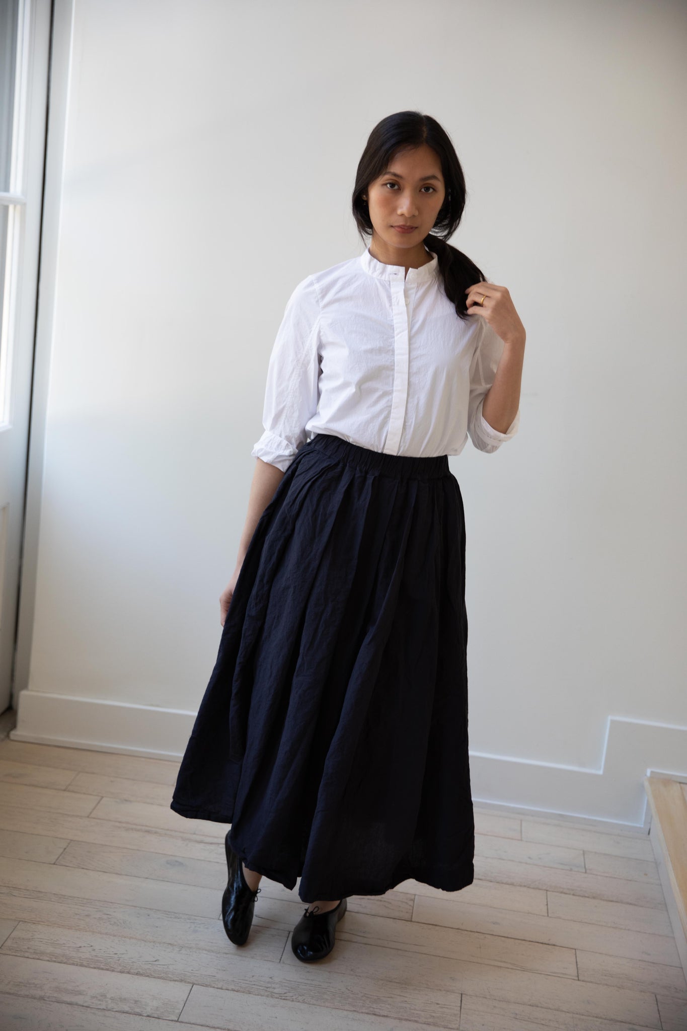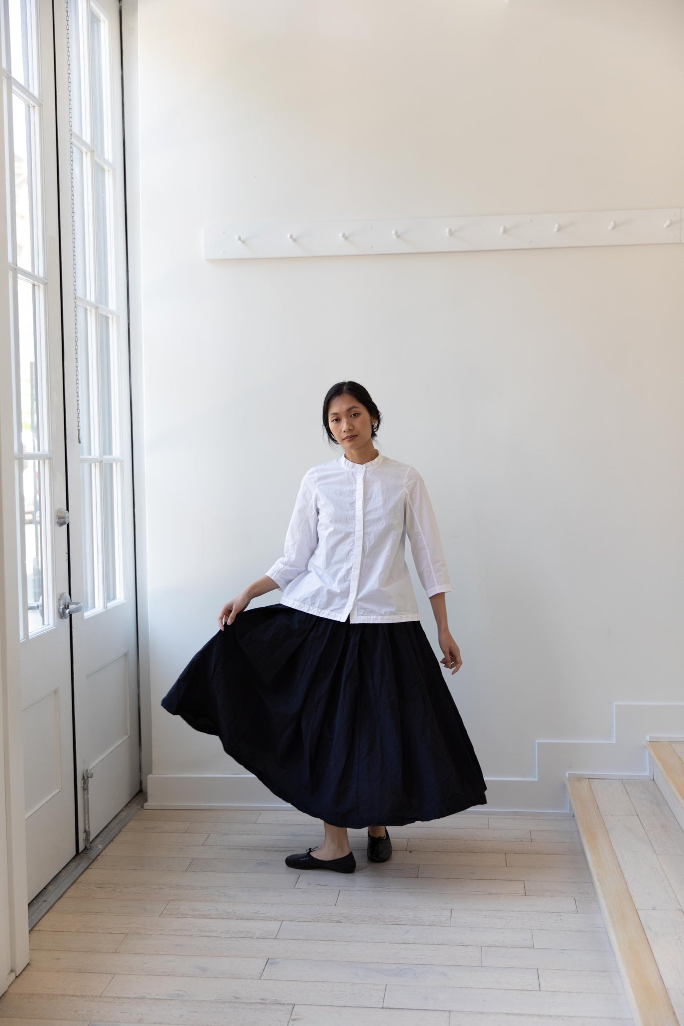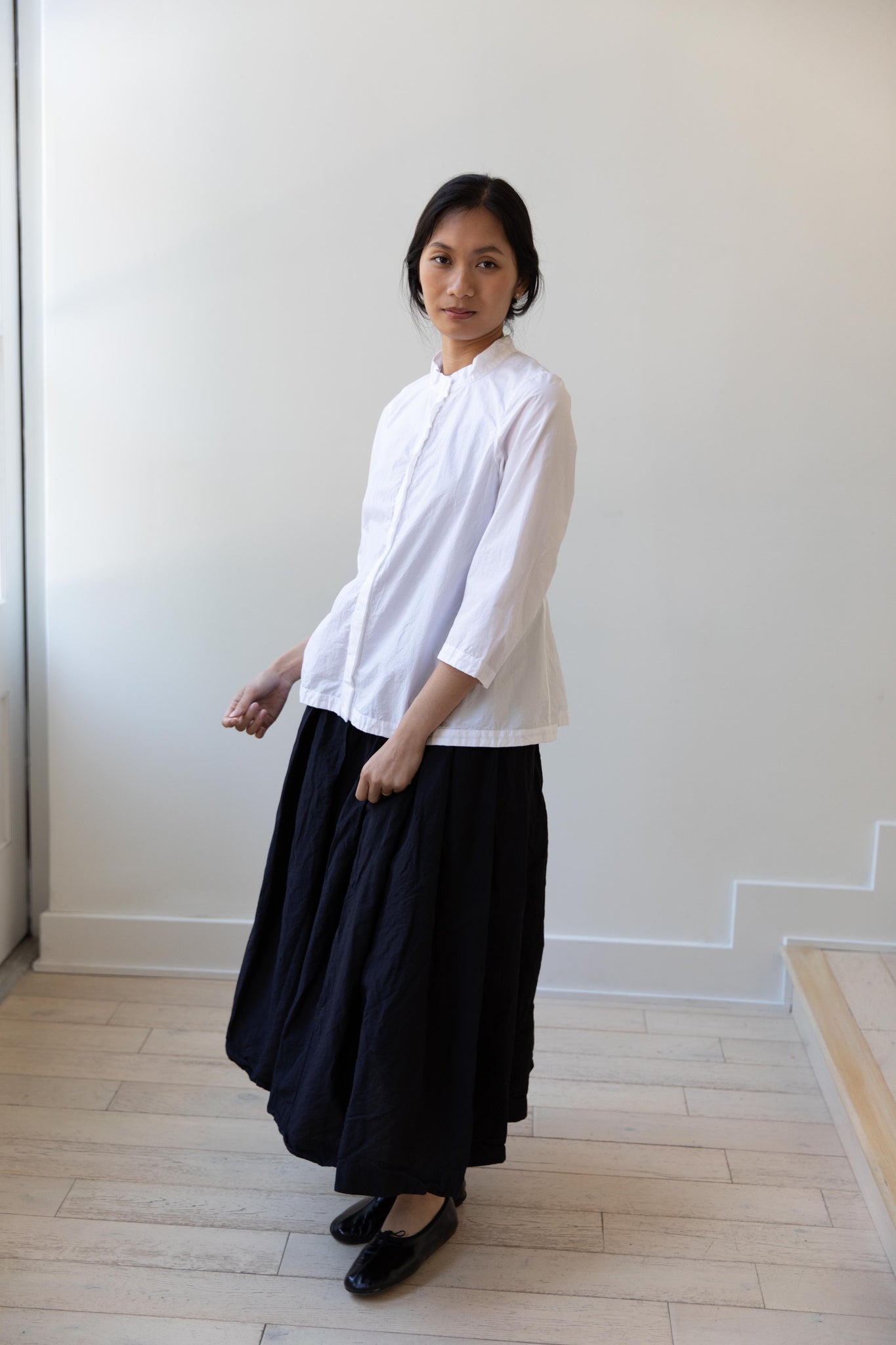 We love this new shirt style from Bergfabel because of it's thoughtful tailoring and construction. It has three quarter sleeves with a flat band collar at the top. The back has multiple seams so the fit is just right and flares out a little bit with one inverted pleat in the center back. We love this top paired with a great skirt.