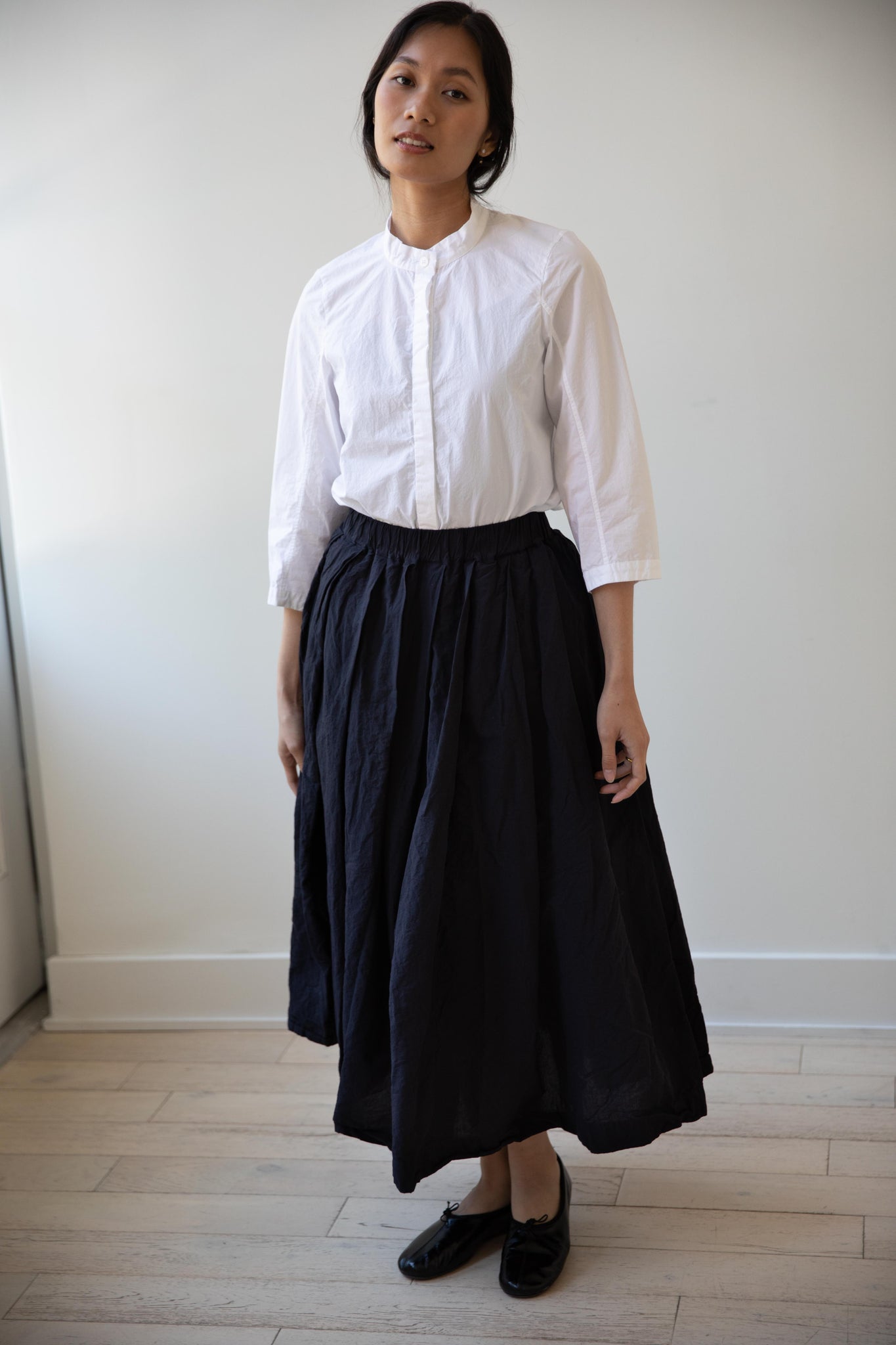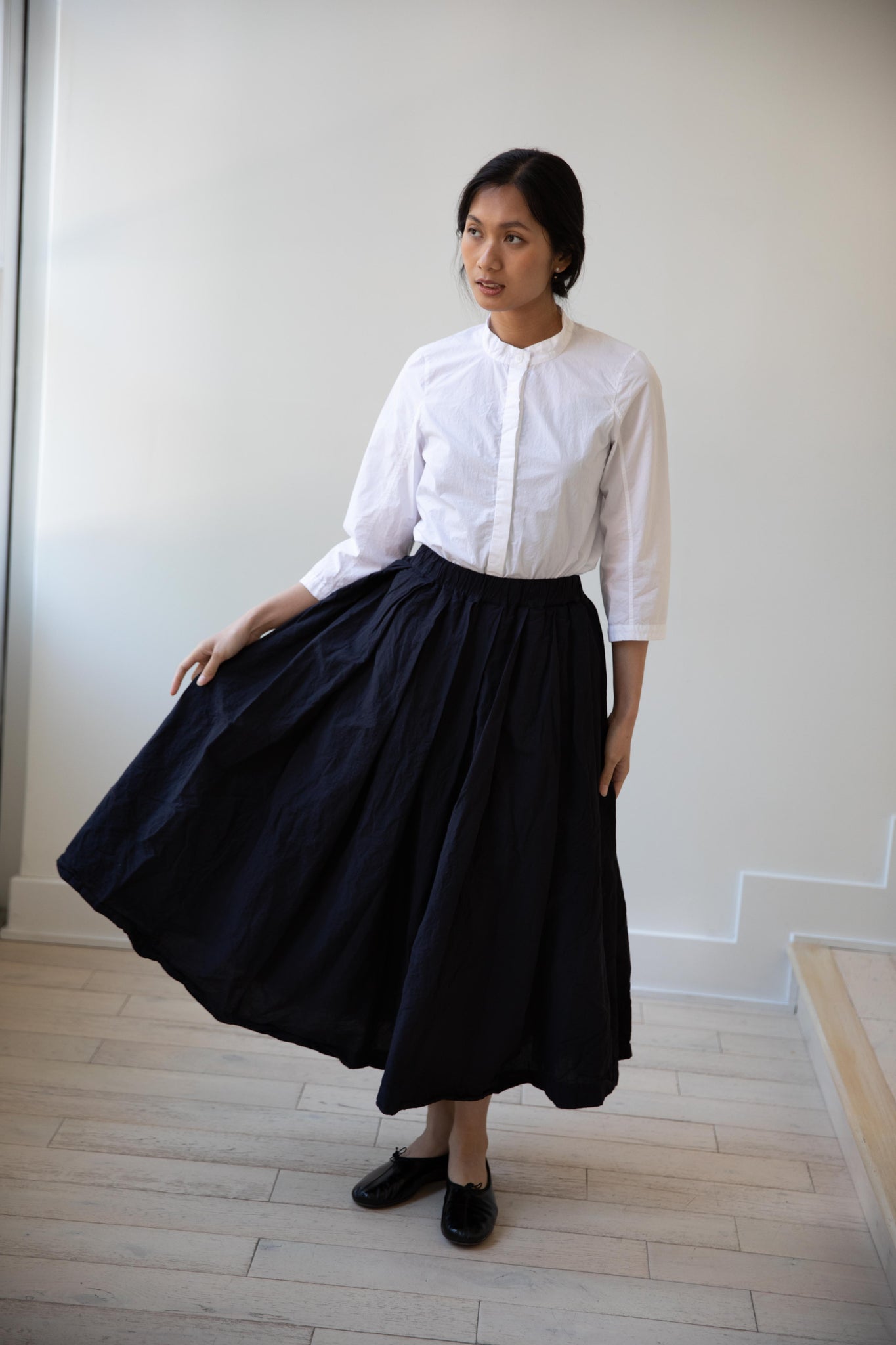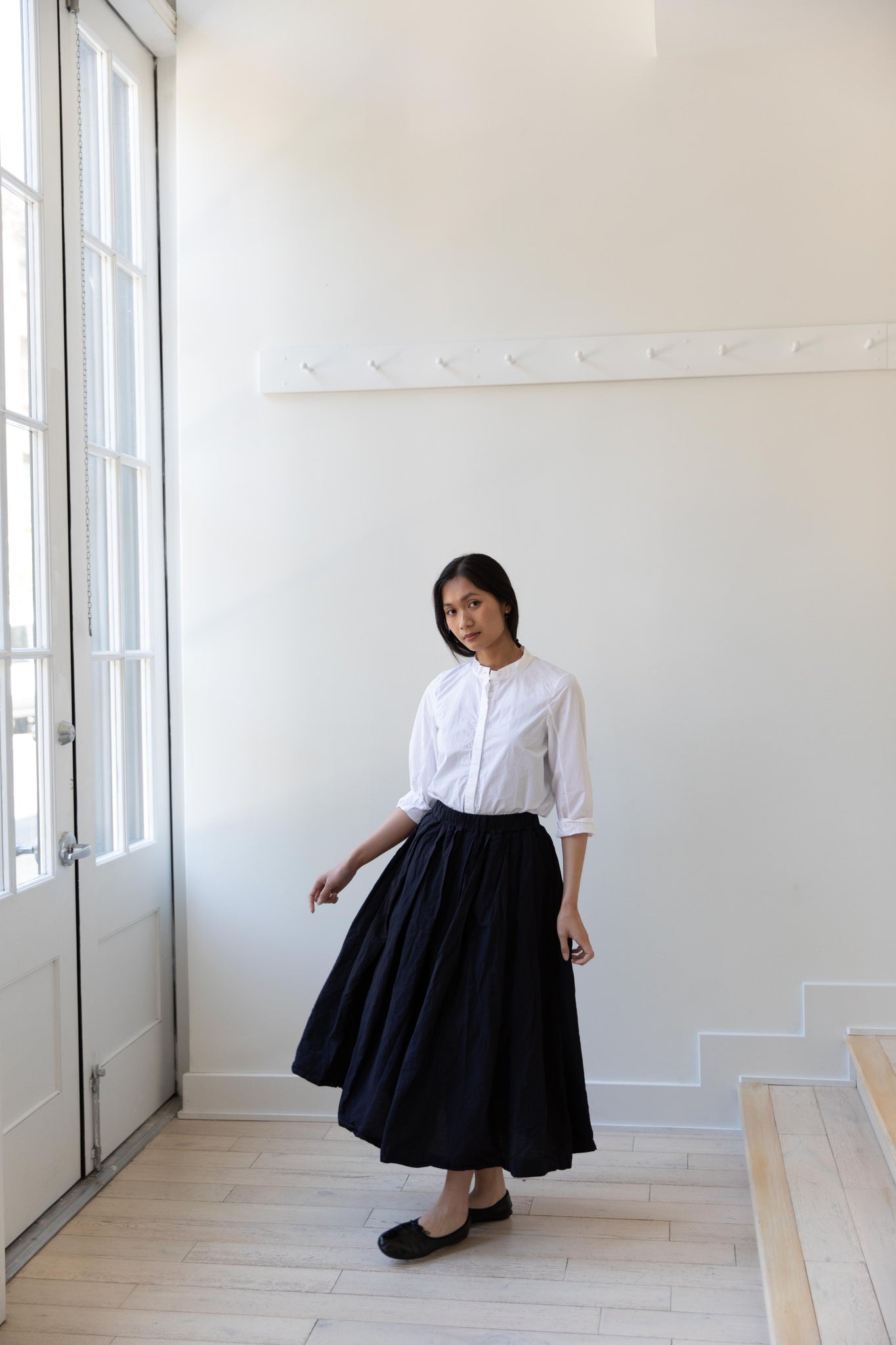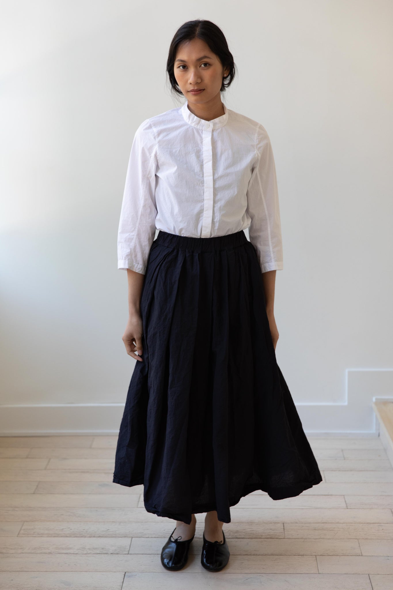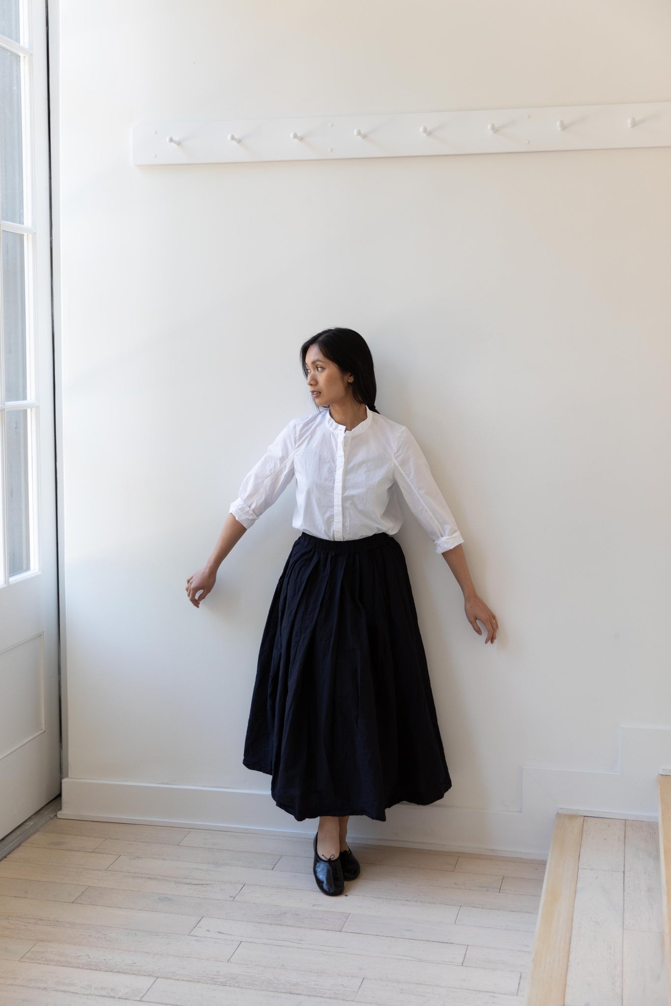 We love this new shirt style from Bergfabel because of it's thoughtful tailoring and construction. It has three quarter sleeves with a flat band collar at the top. The back has multiple seams so the fit is just right and flares out a little bit with one inverted pleat in the center back. We love this top paired with a great skirt.