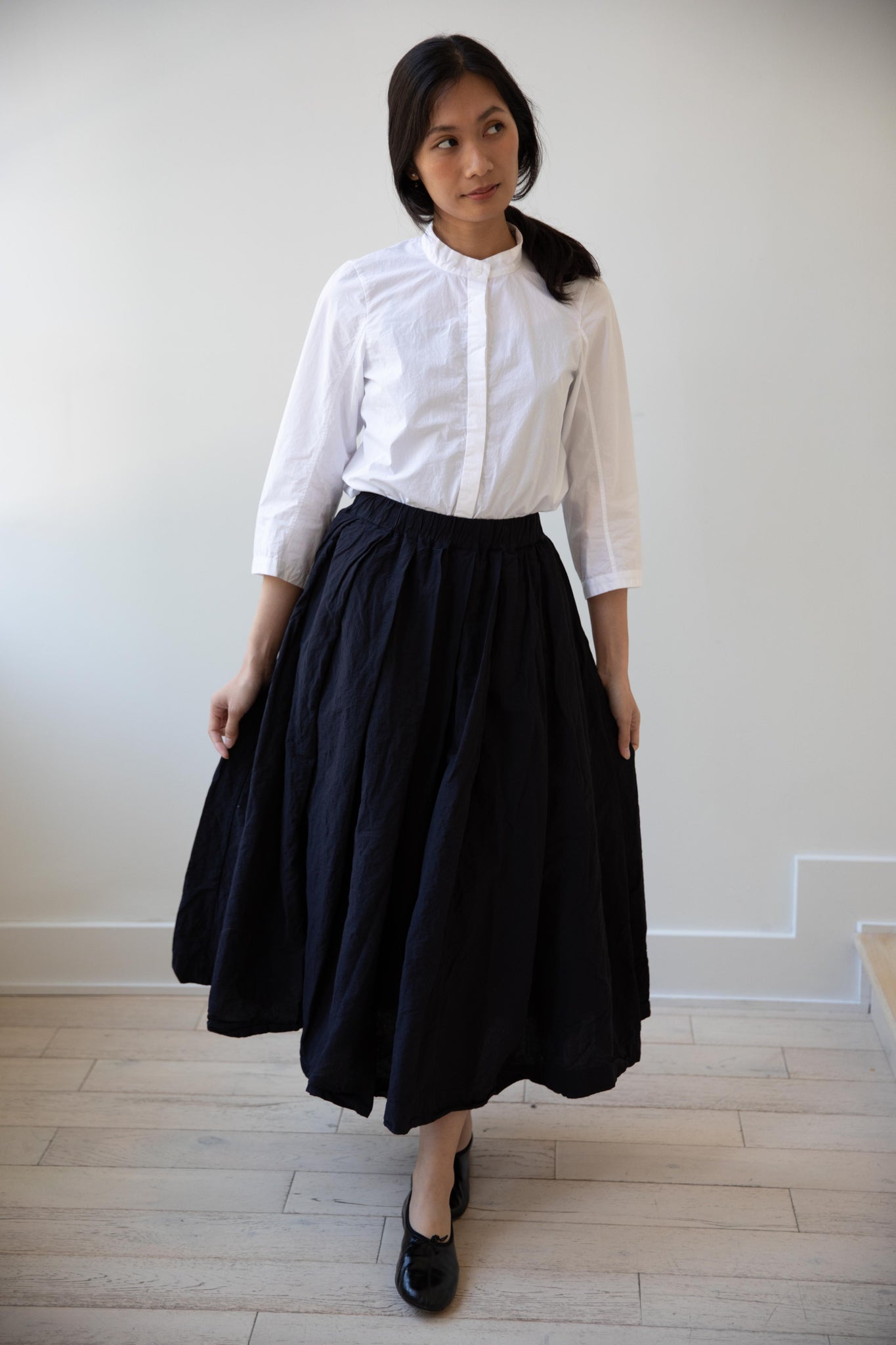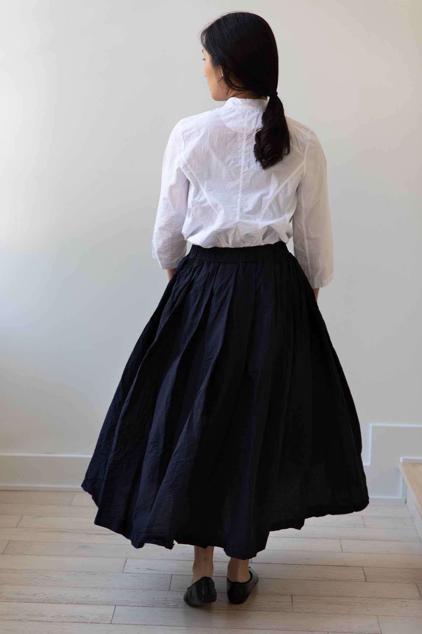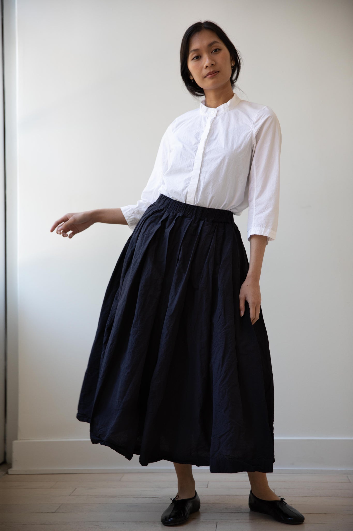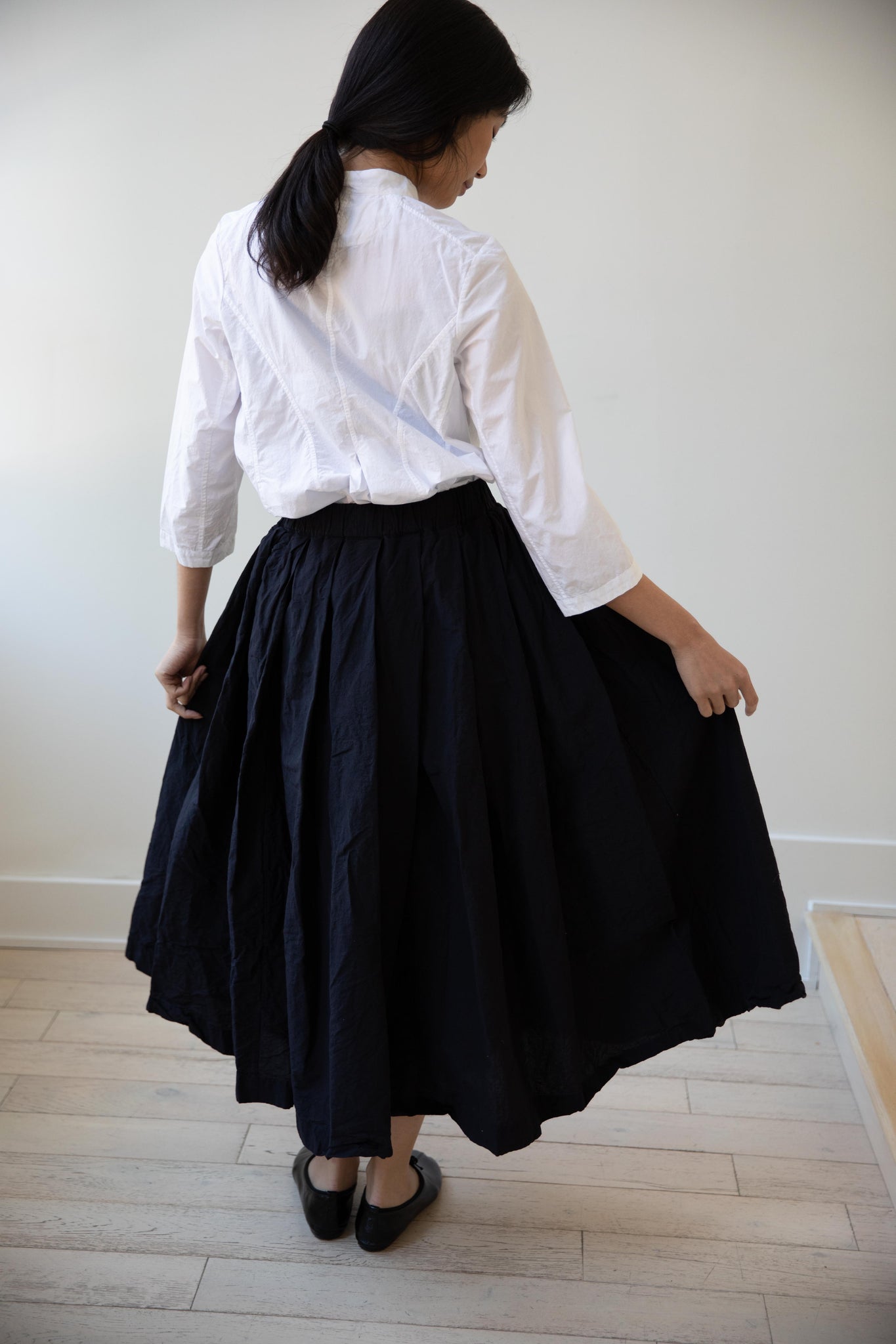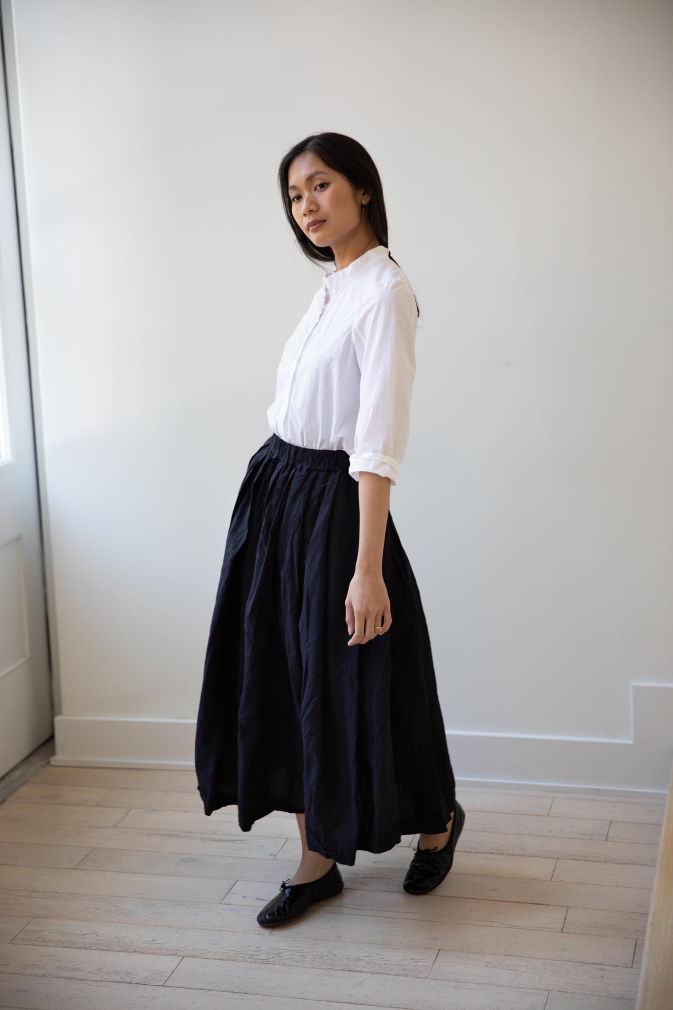 We love this new shirt style from Bergfabel because of it's thoughtful tailoring and construction. It has three quarter sleeves with a flat band collar at the top. The back has multiple seams so the fit is just right and flares out a little bit with one inverted pleat in the center back. We love this top paired with a great skirt.