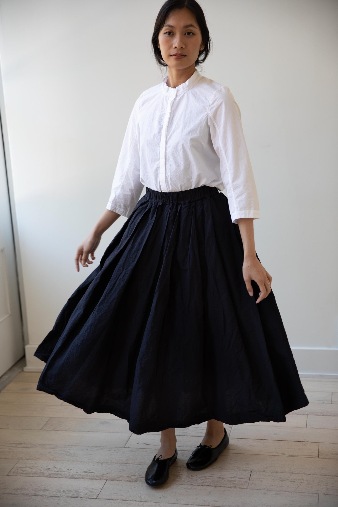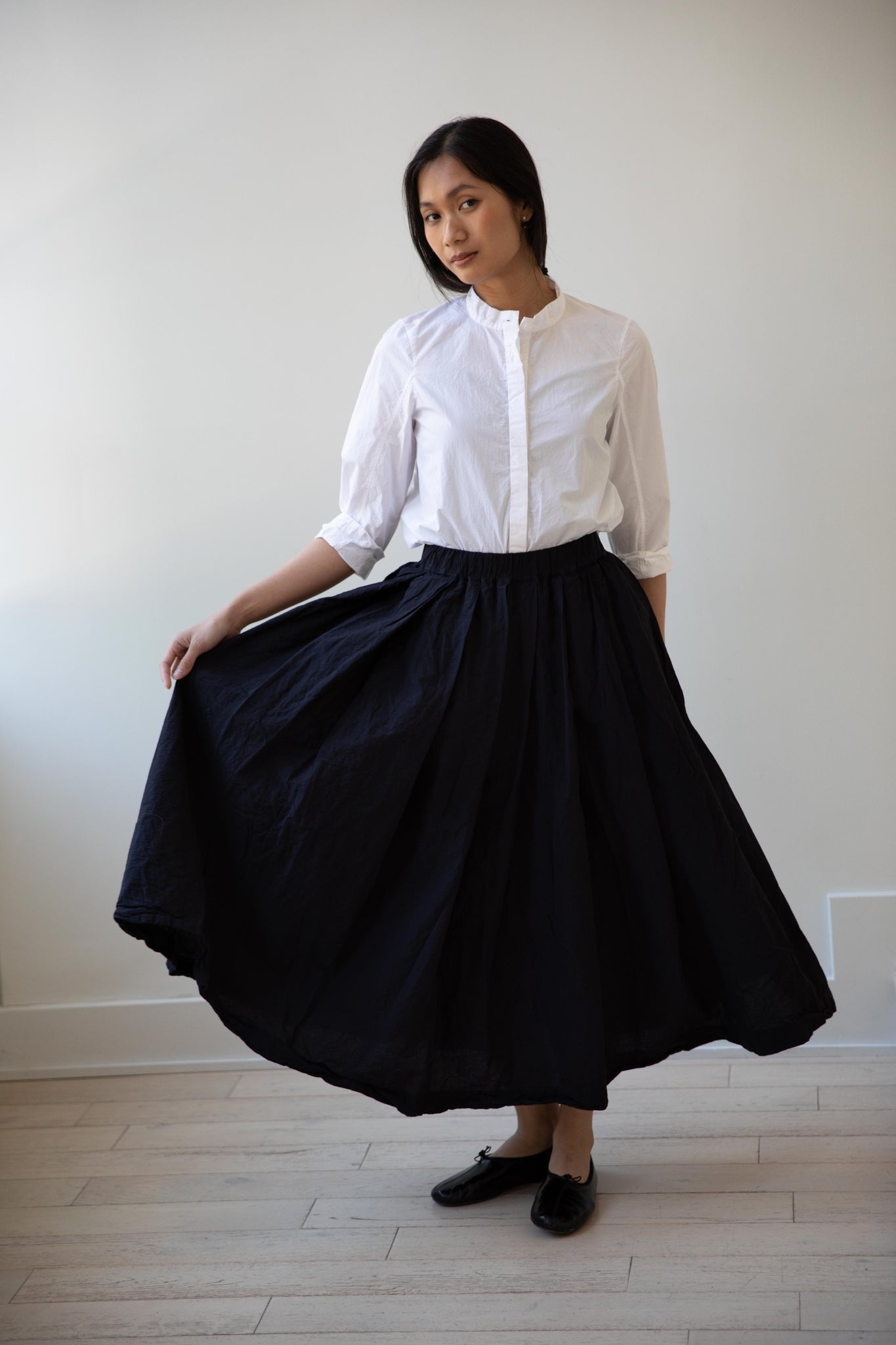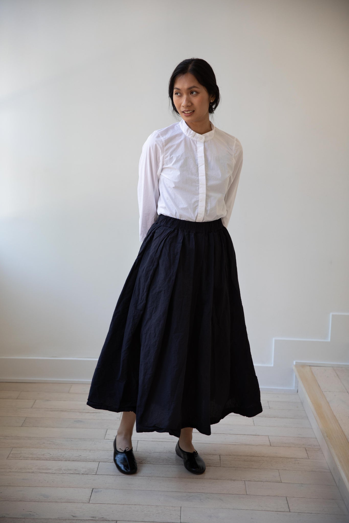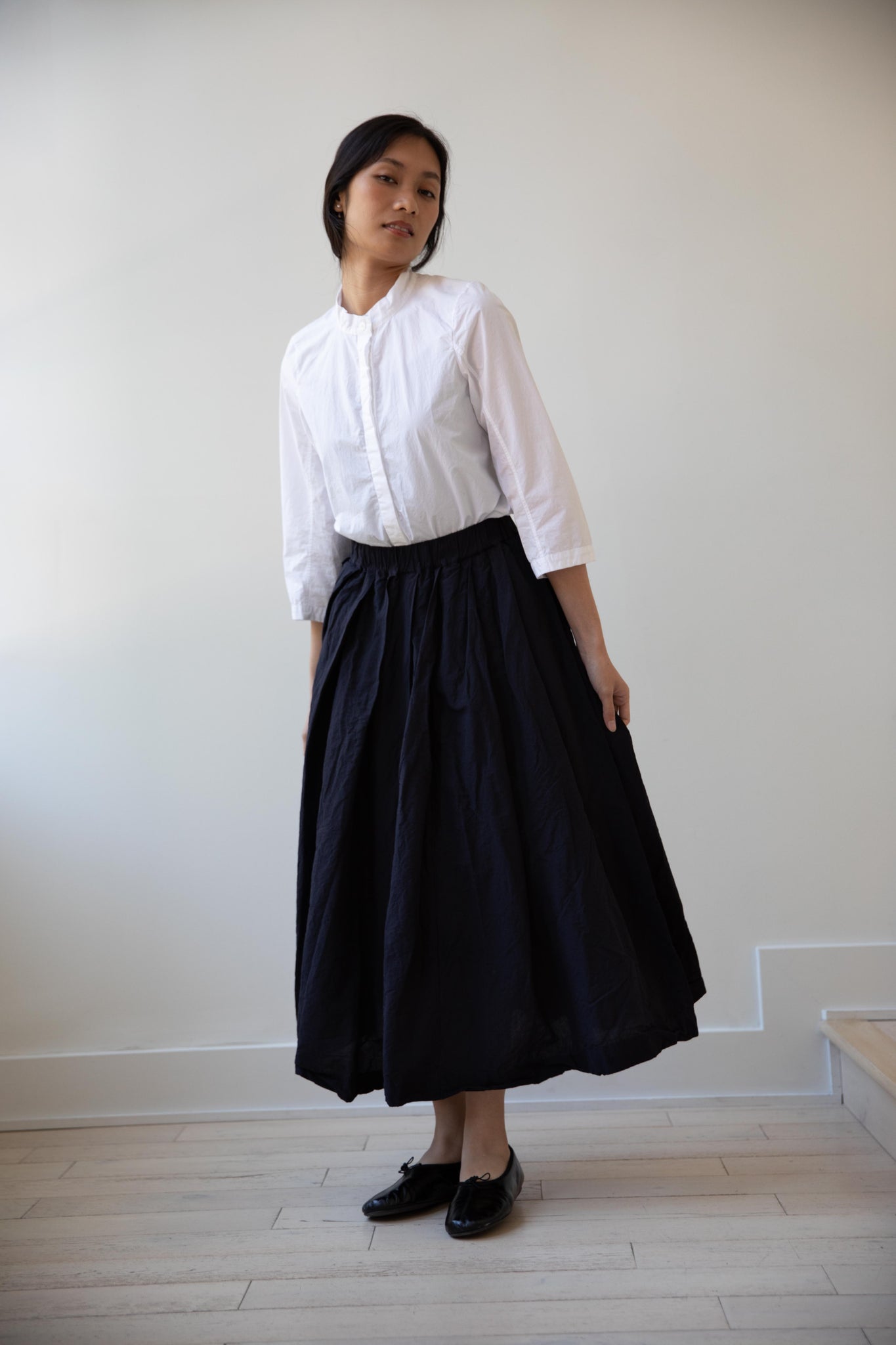 We love this new shirt style from Bergfabel because of it's thoughtful tailoring and construction. It has three quarter sleeves with a flat band collar at the top. The back has multiple seams so the fit is just right and flares out a little bit with one inverted pleat in the center back. We love this top paired with a great skirt.