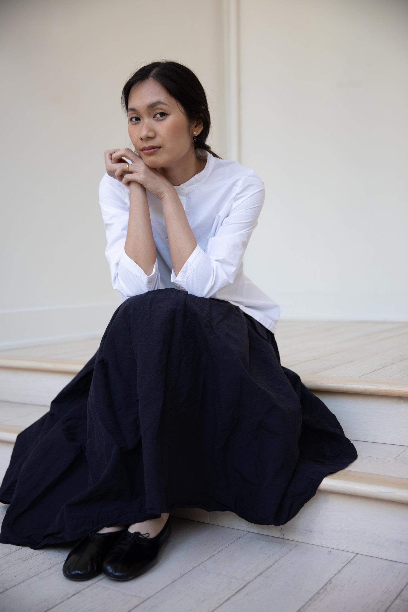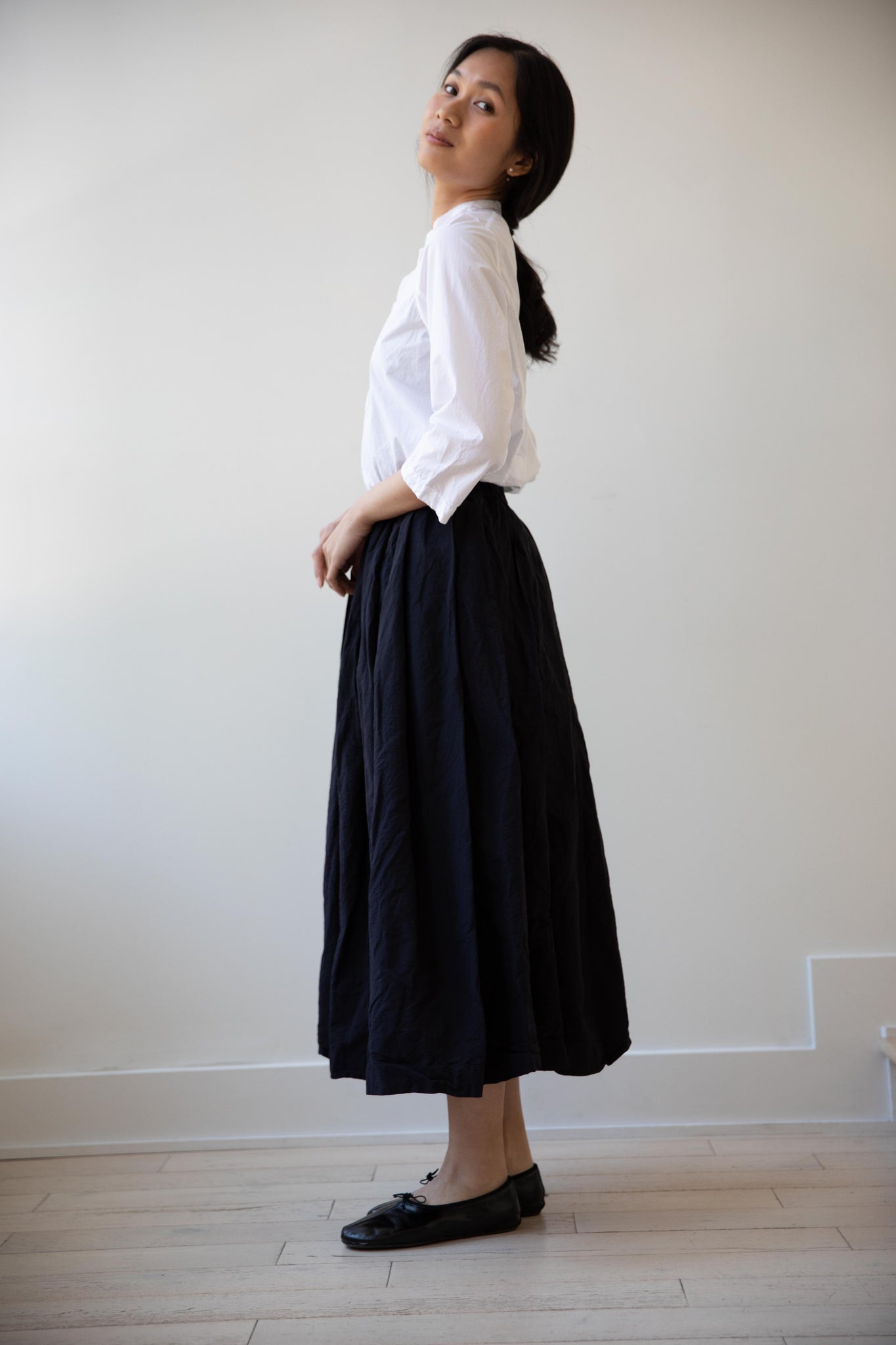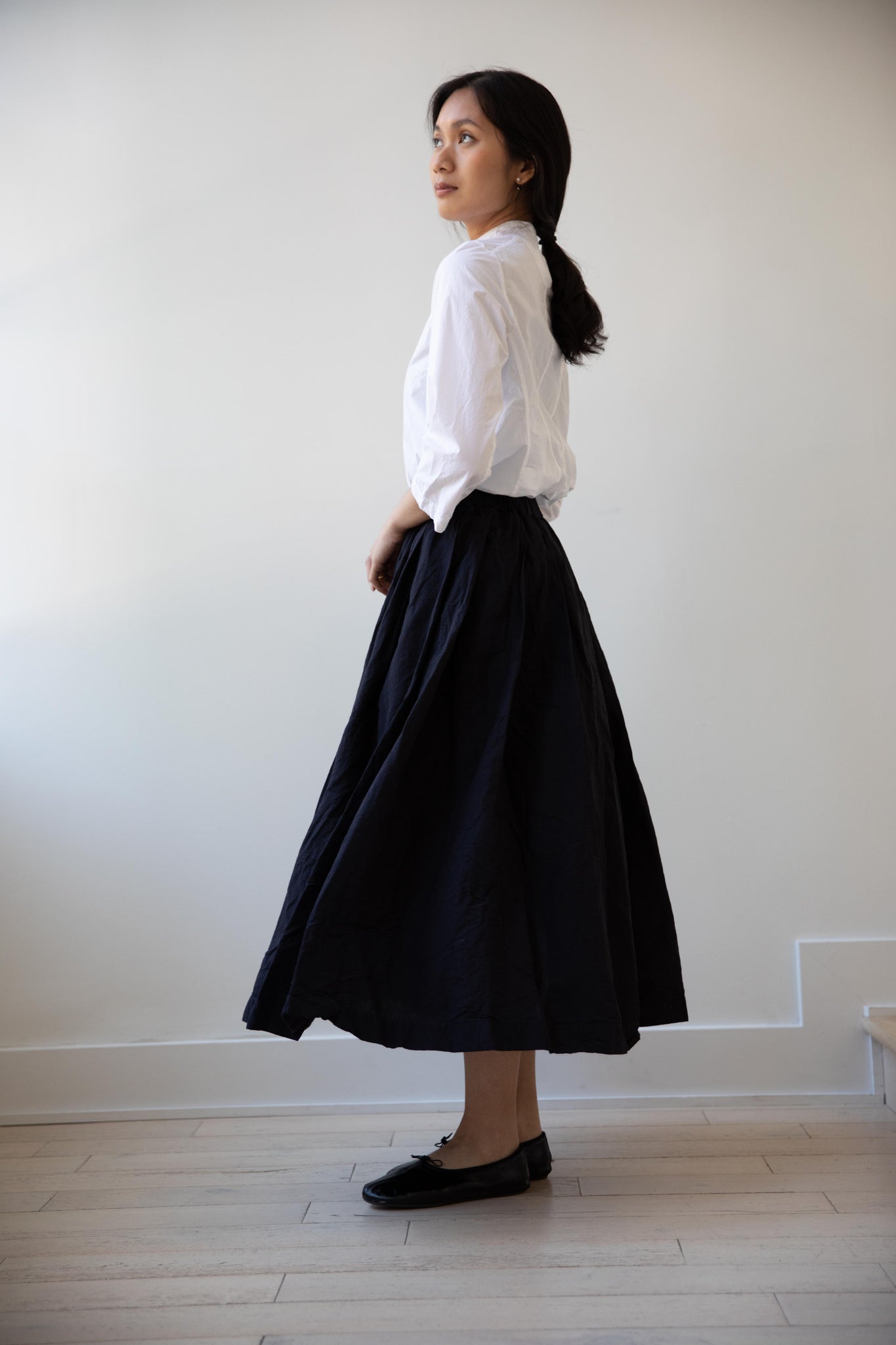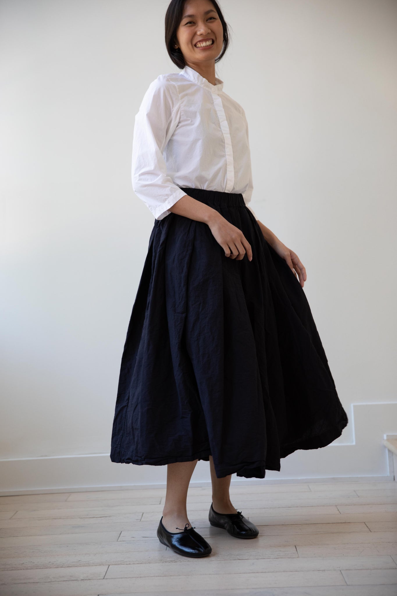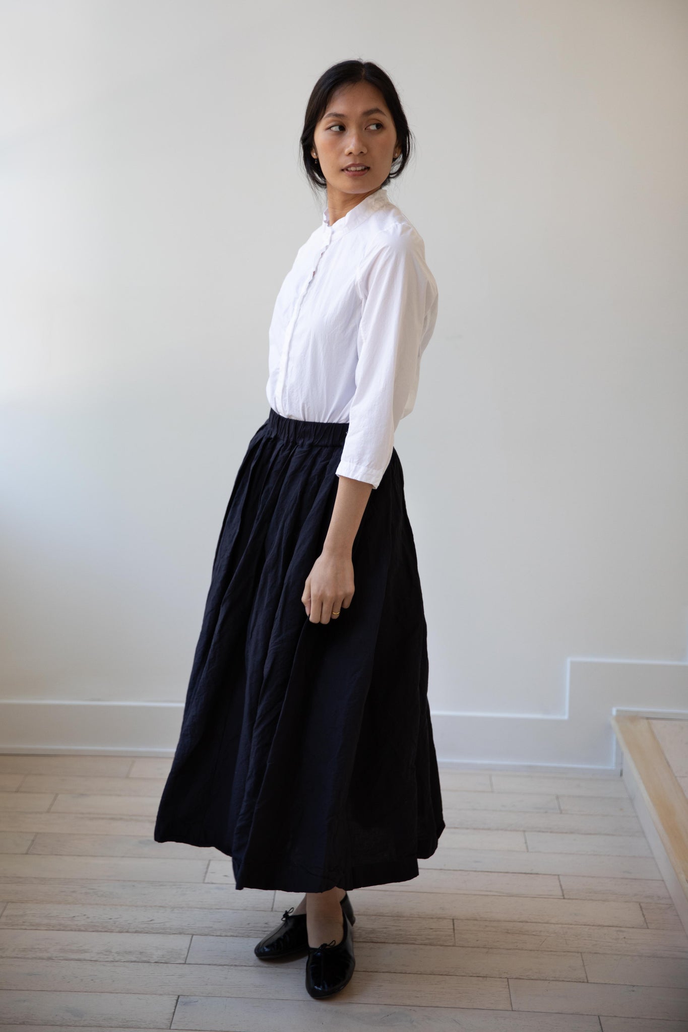 We love this new shirt style from Bergfabel because of it's thoughtful tailoring and construction. It has three quarter sleeves with a flat band collar at the top. The back has multiple seams so the fit is just right and flares out a little bit with one inverted pleat in the center back. We love this top paired with a great skirt.