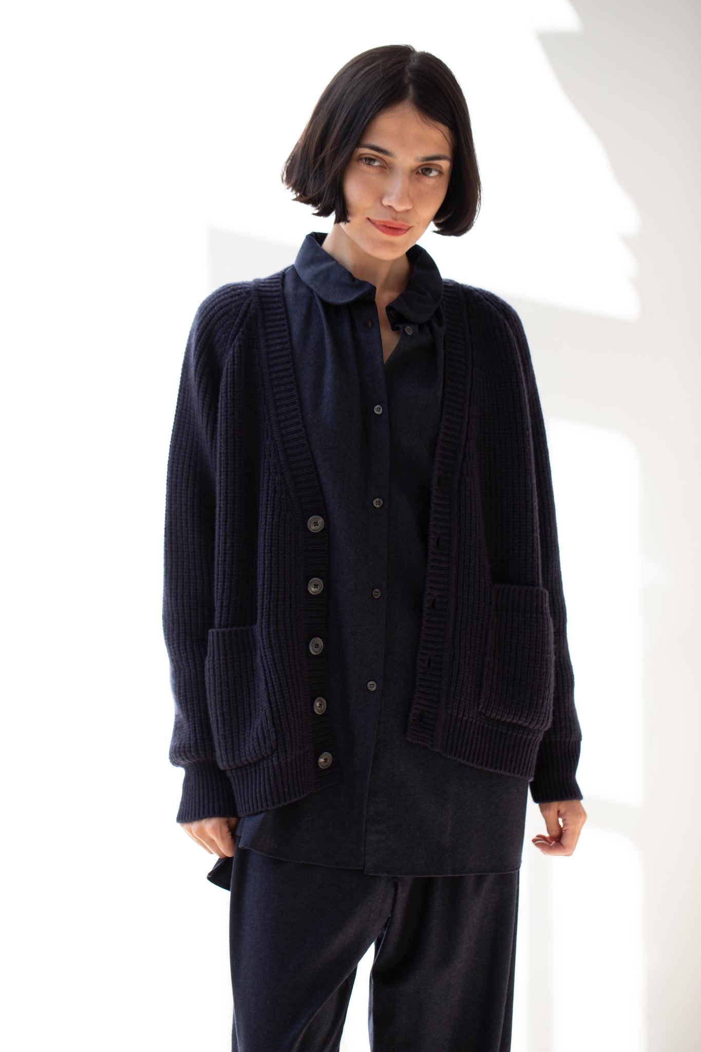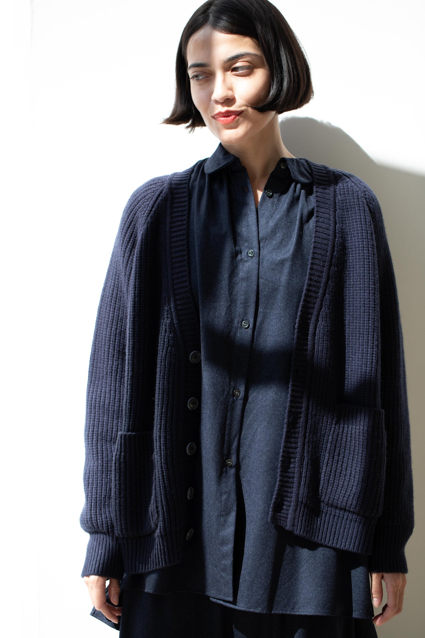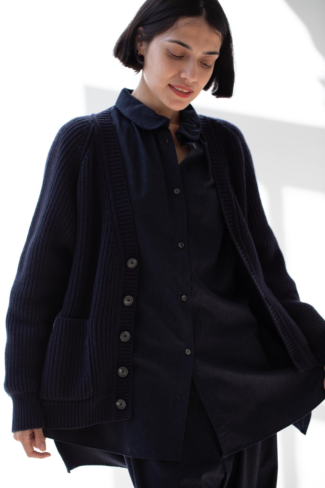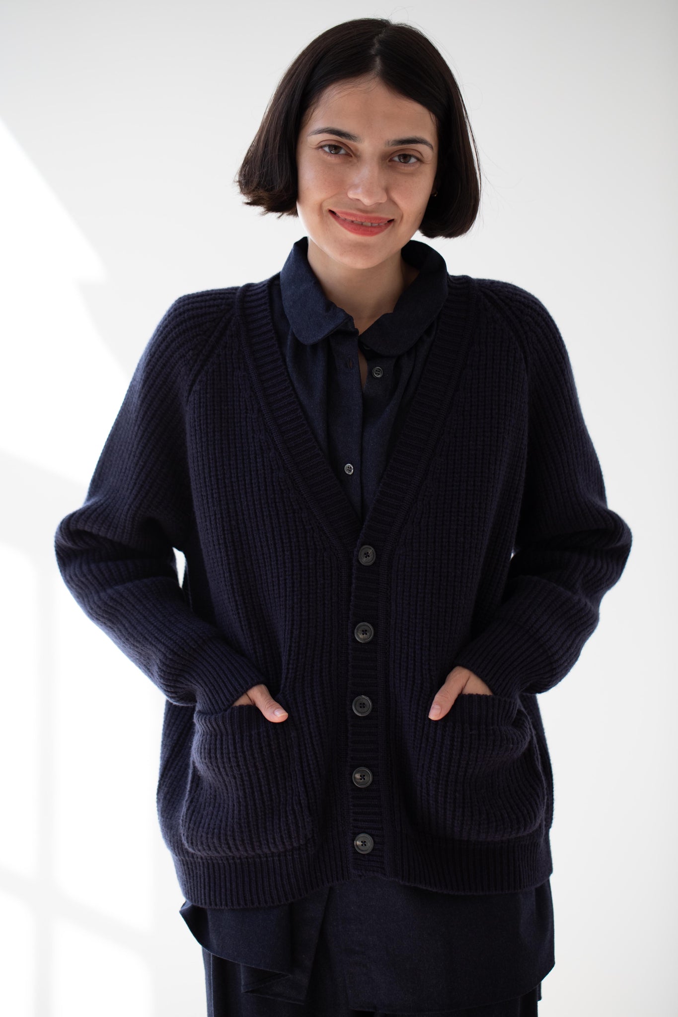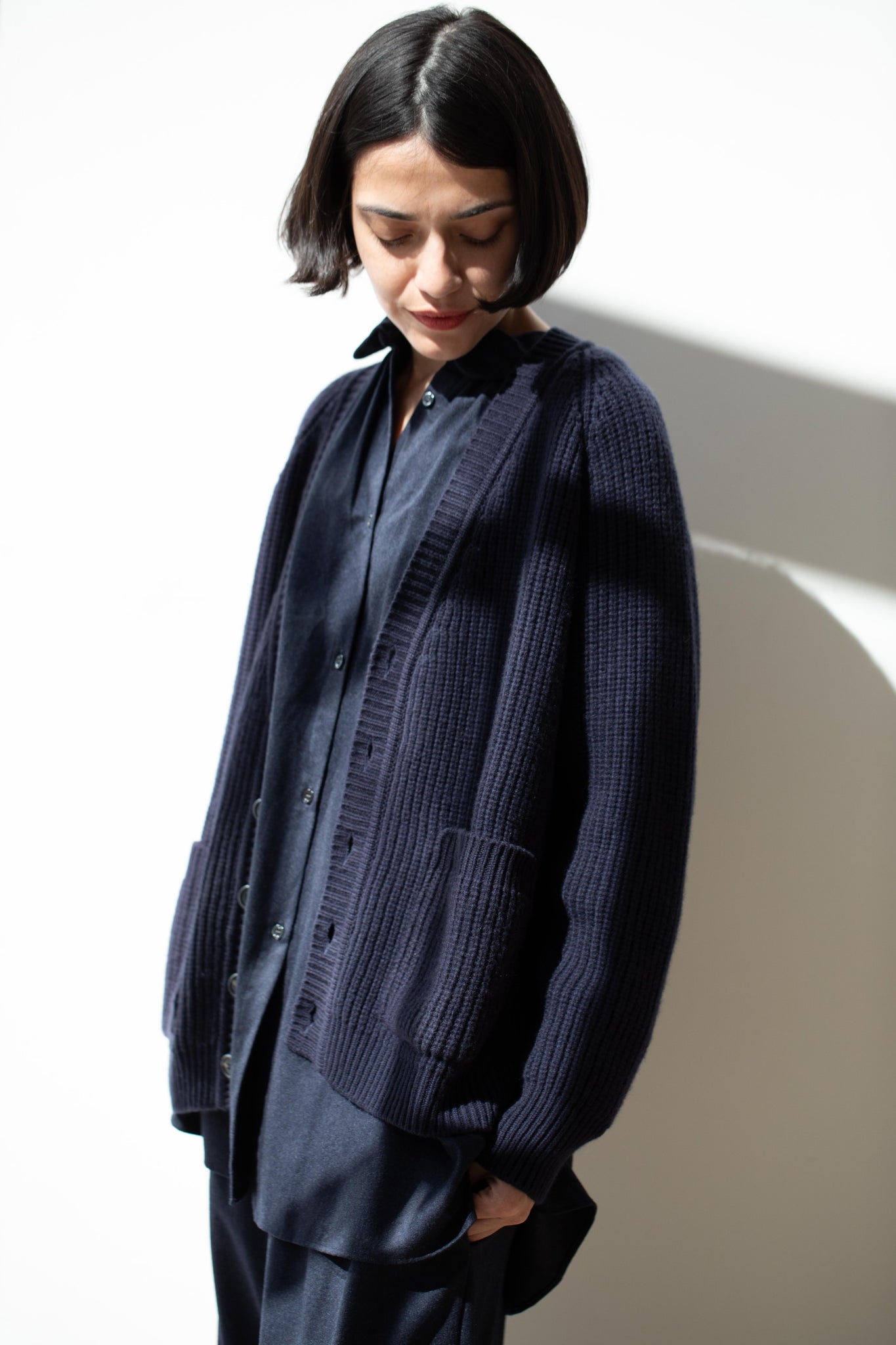 This cardigan is made from the softest cashmere yarn and is nice and thick due to the rib knit. It has a button up front and two side patch pockets. We think this would pair wonderfully with any look this winter, the navy color goes with pretty much anything!