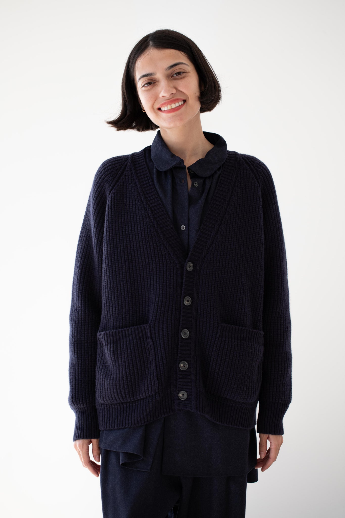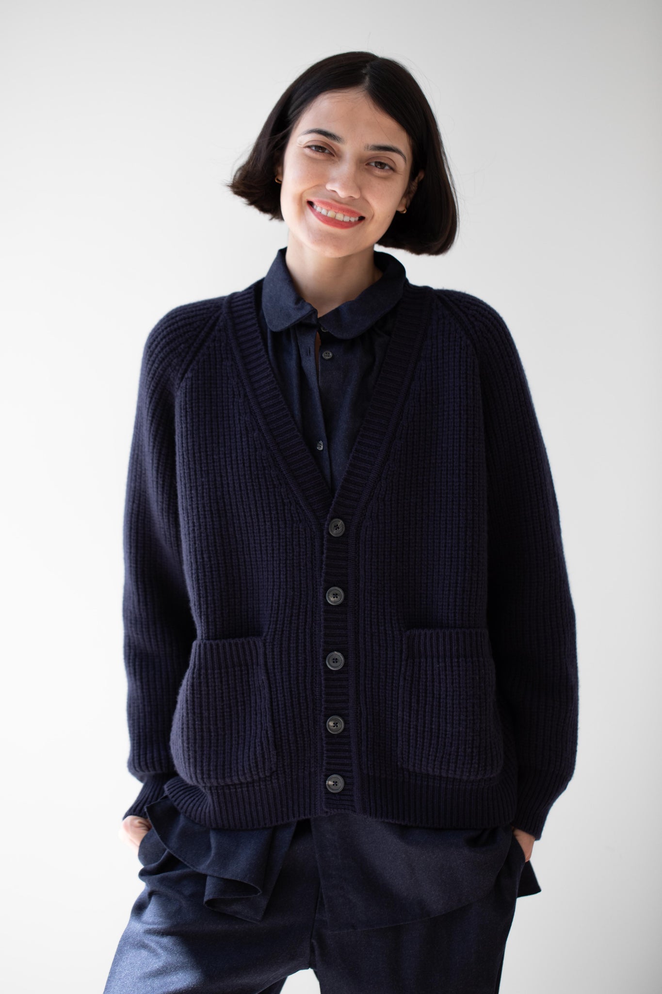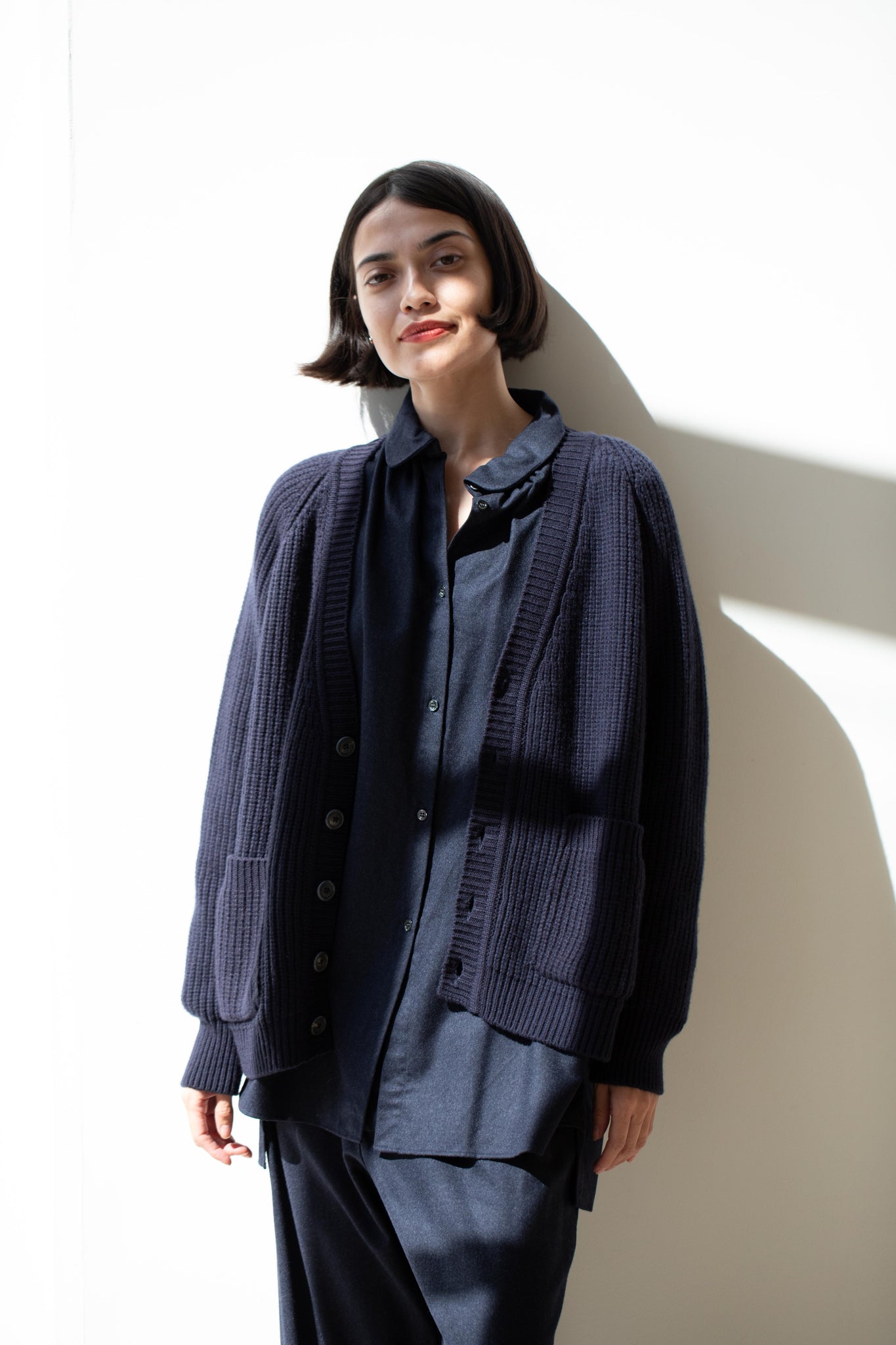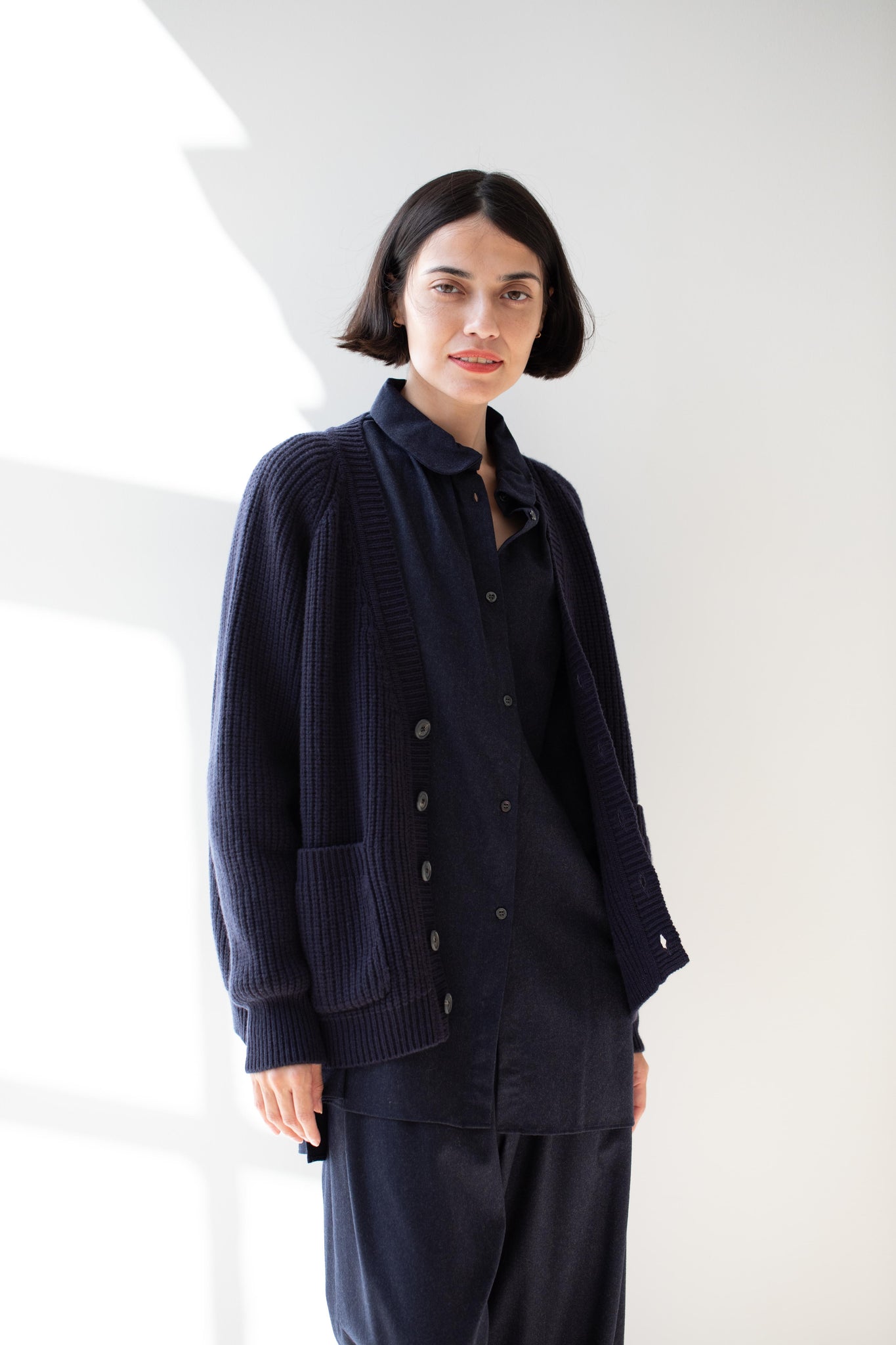 This cardigan is made from the softest cashmere yarn and is nice and thick due to the rib knit. It has a button up front and two side patch pockets. We think this would pair wonderfully with any look this winter, the navy color goes with pretty much anything!