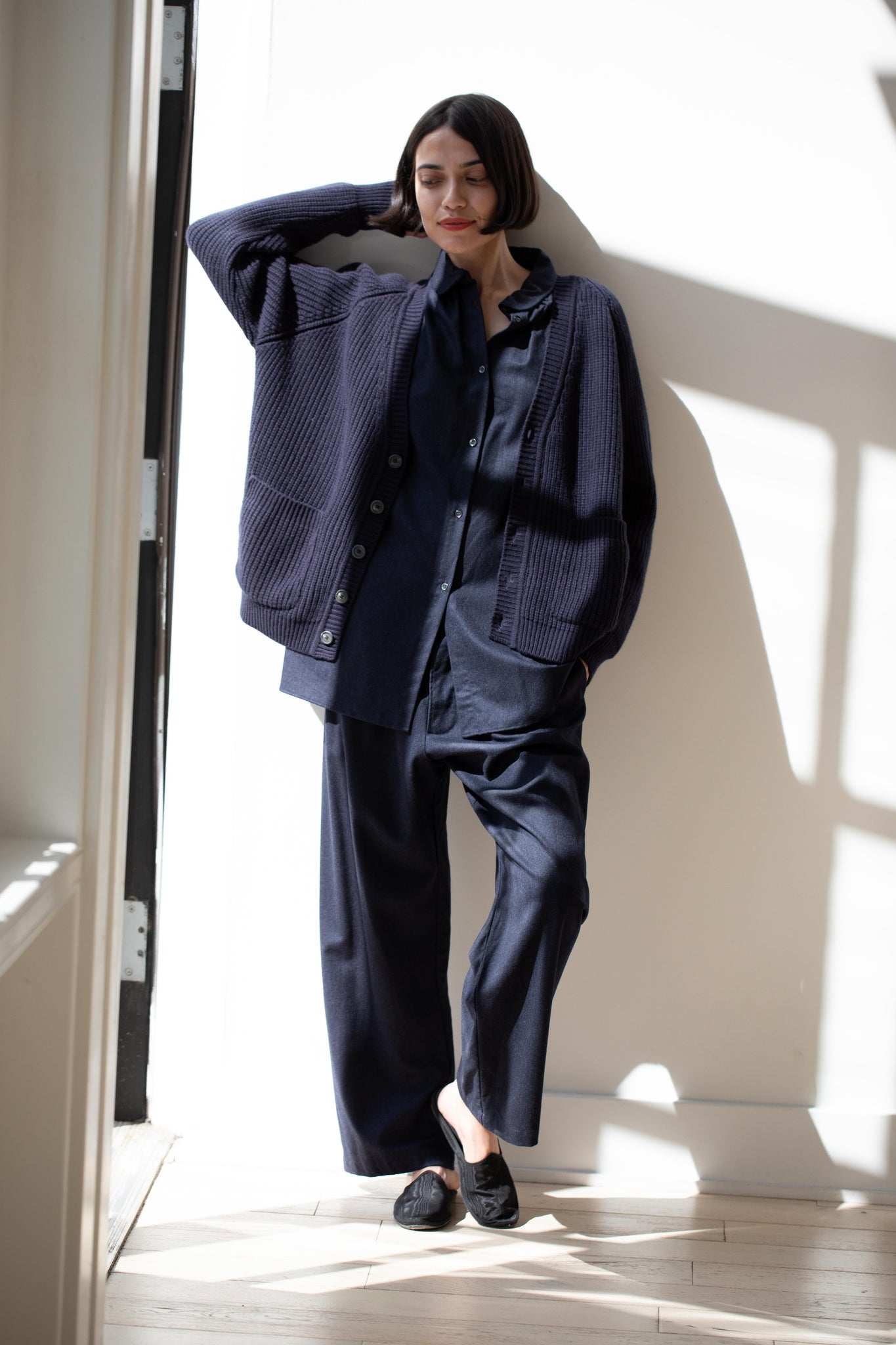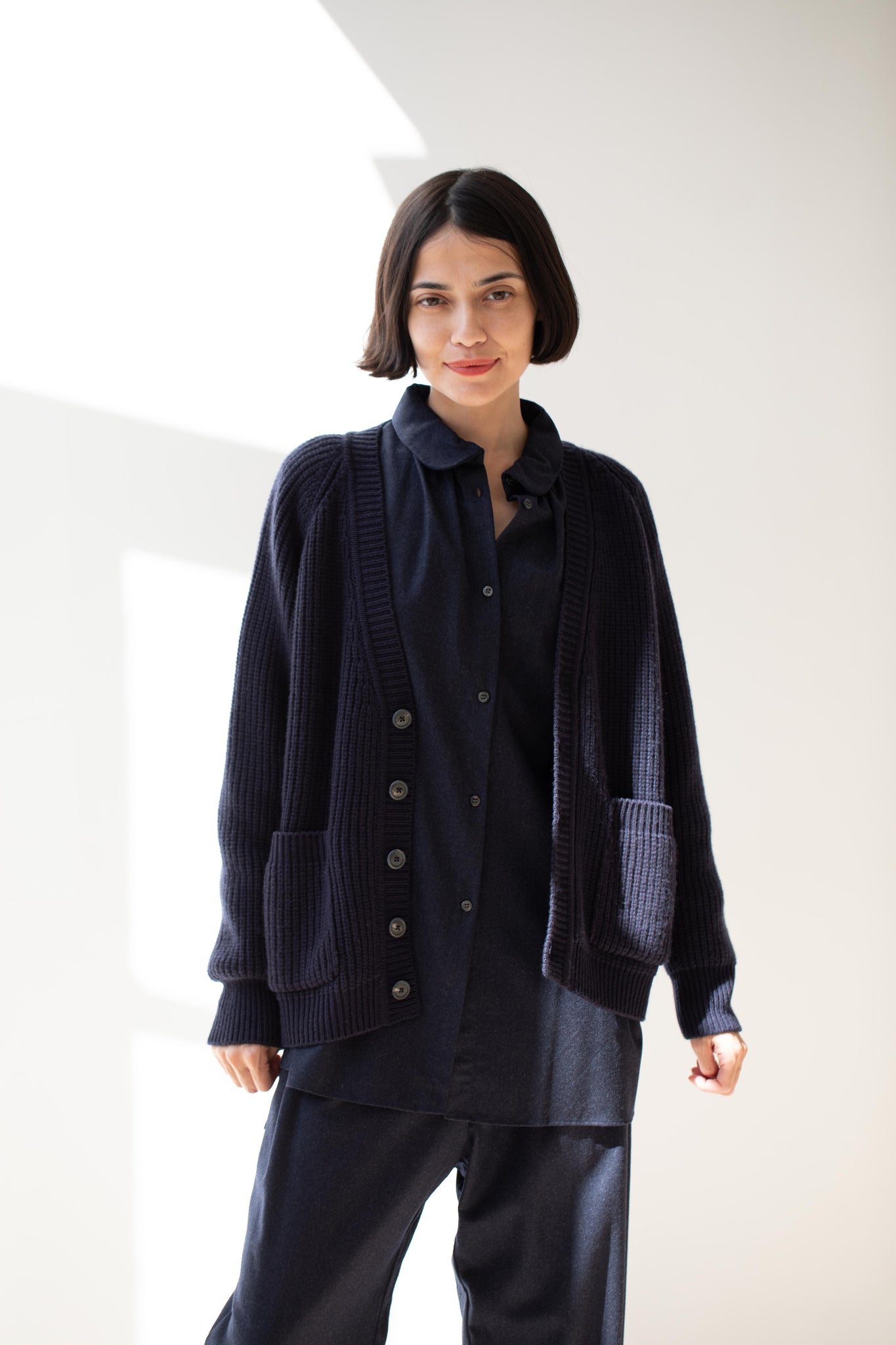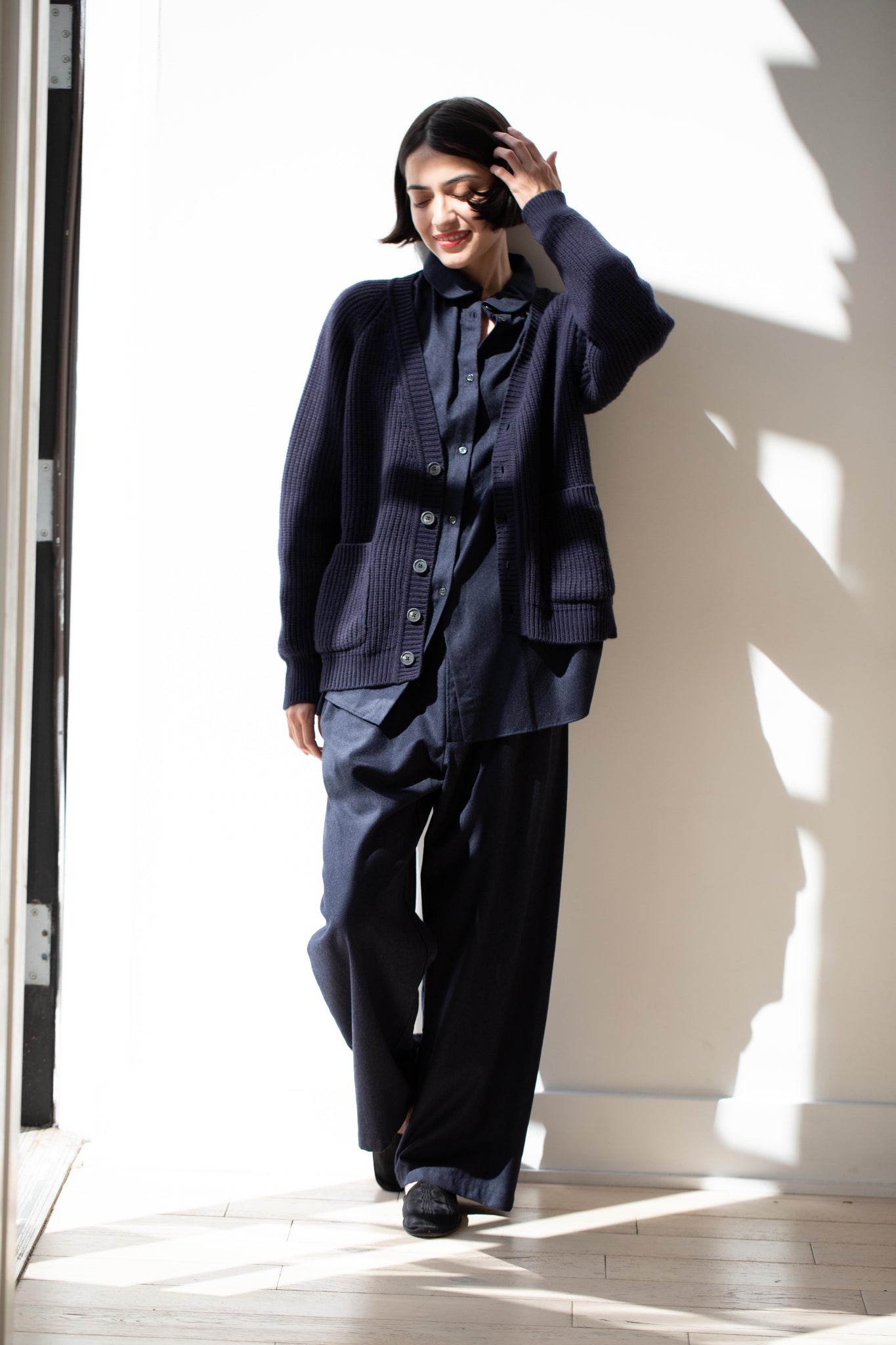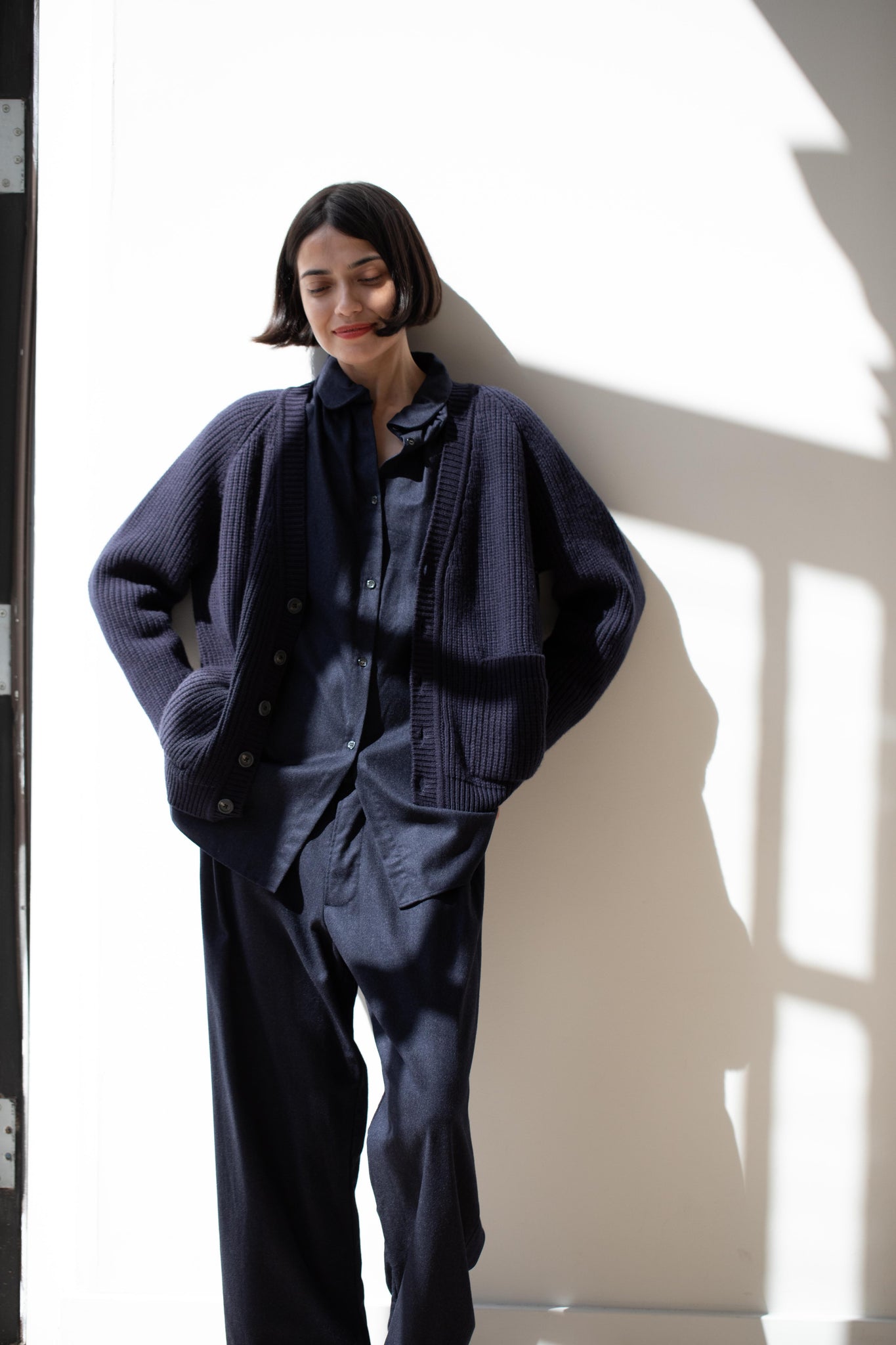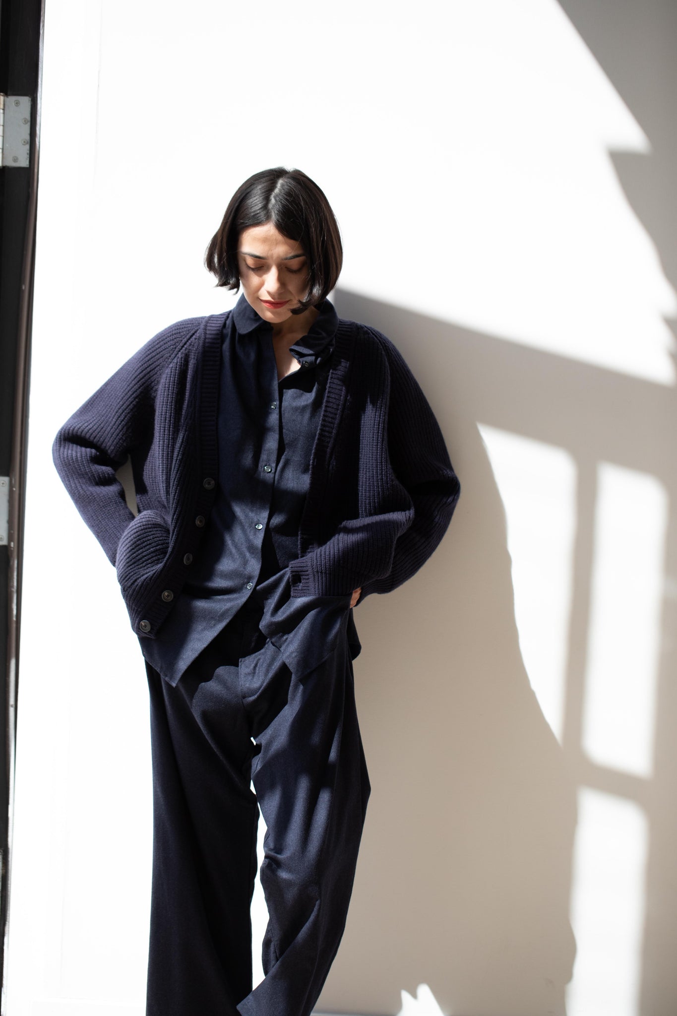 This cardigan is made from the softest cashmere yarn and is nice and thick due to the rib knit. It has a button up front and two side patch pockets. We think this would pair wonderfully with any look this winter, the navy color goes with pretty much anything!
