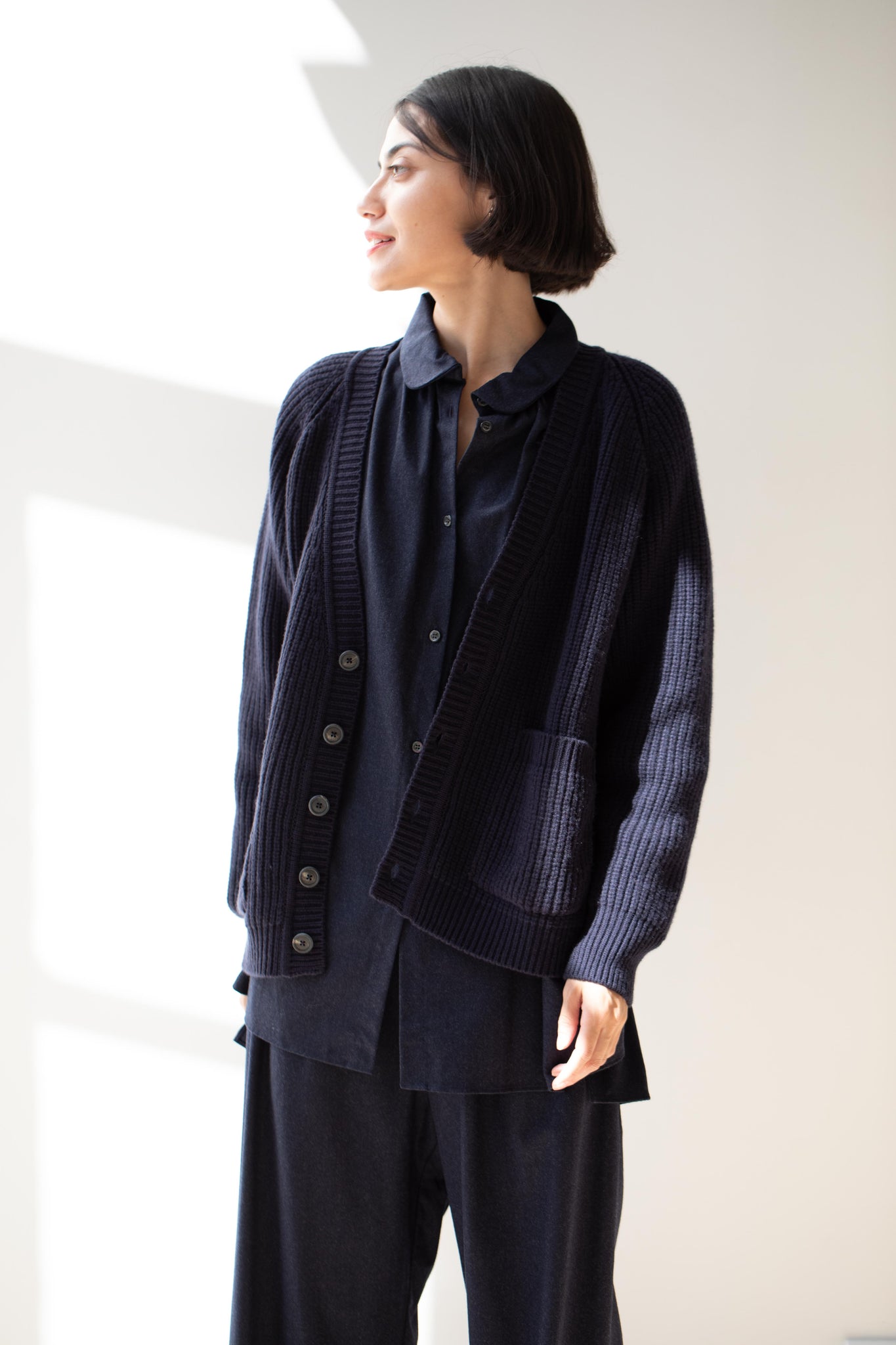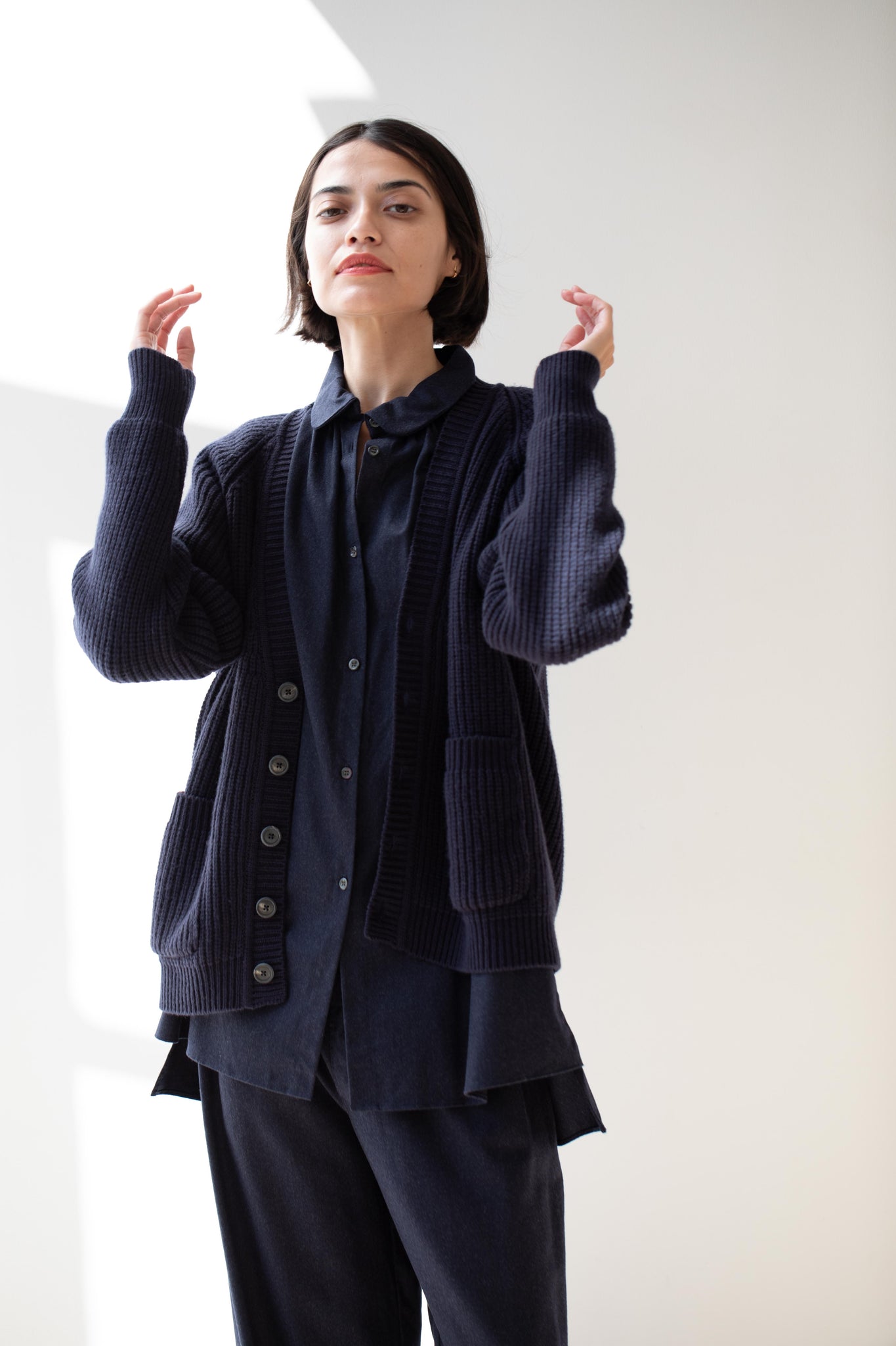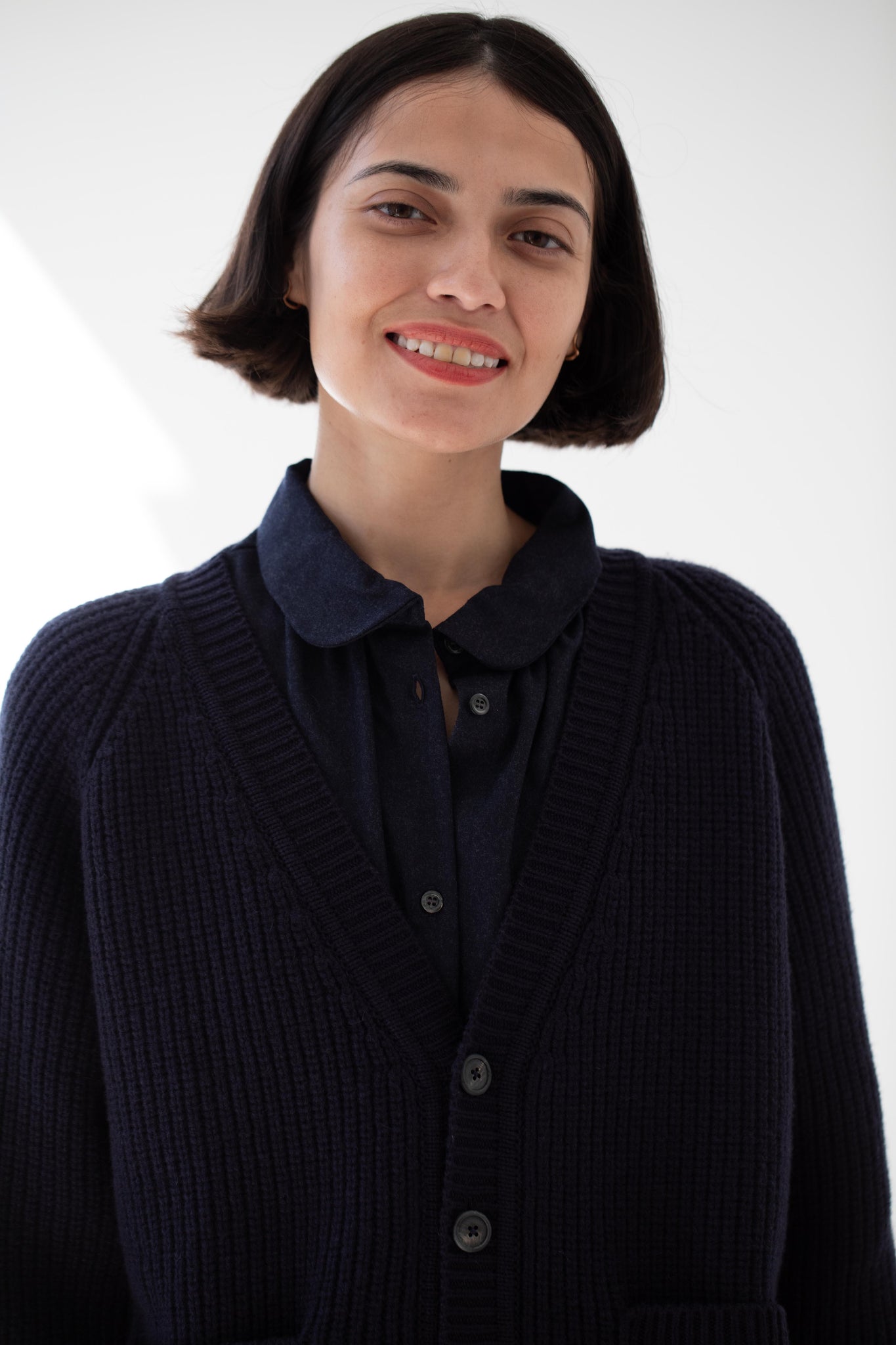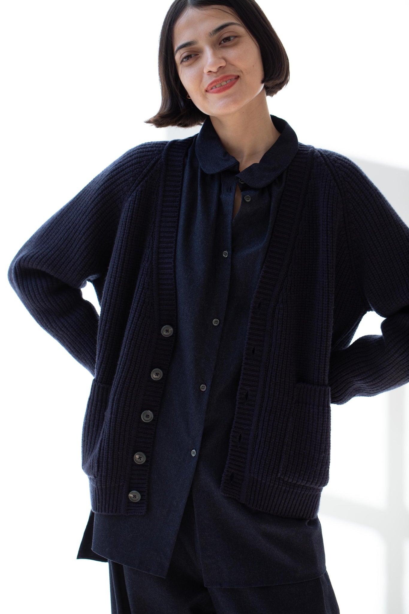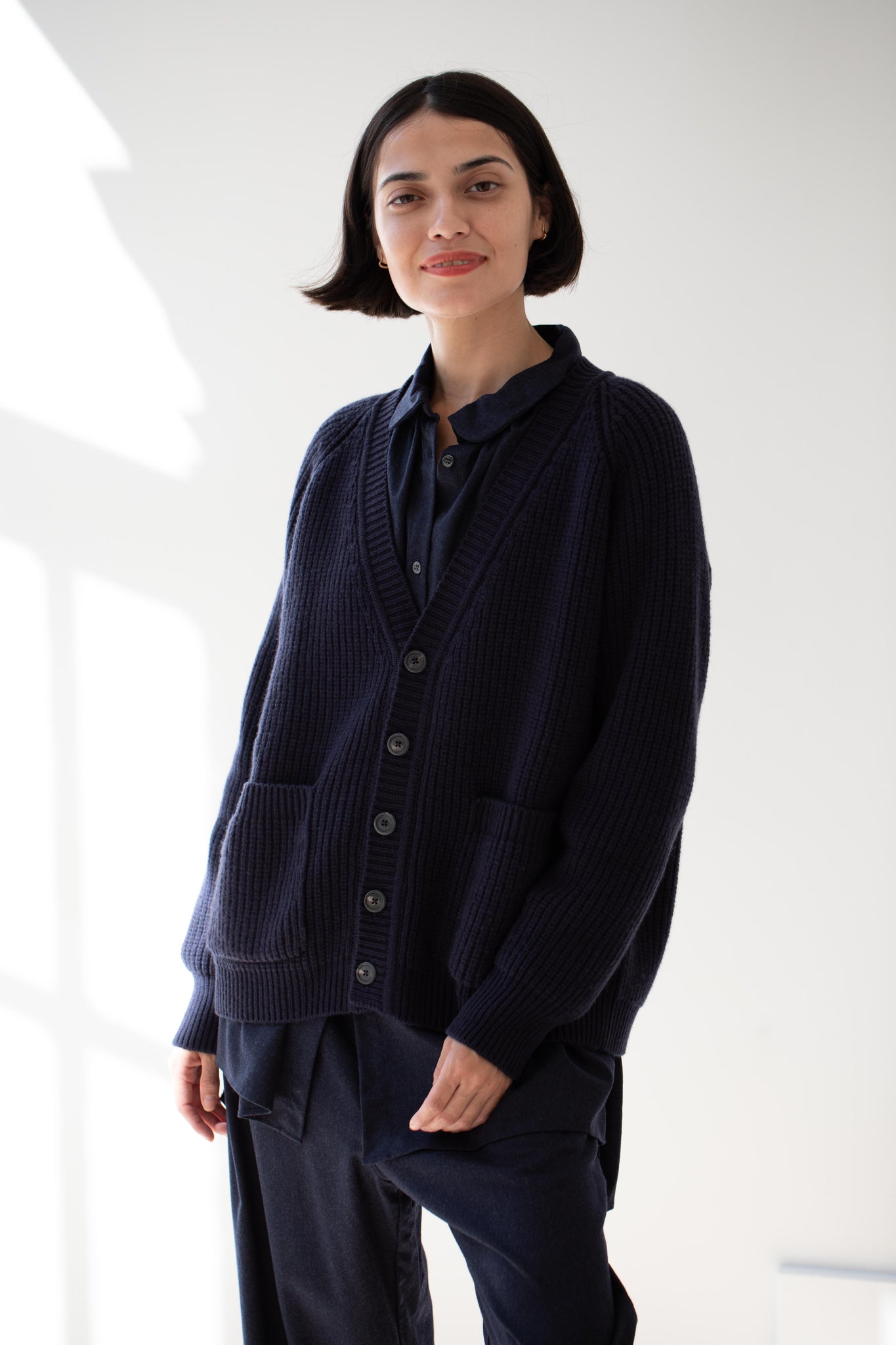 This cardigan is made from the softest cashmere yarn and is nice and thick due to the rib knit. It has a button up front and two side patch pockets. We think this would pair wonderfully with any look this winter, the navy color goes with pretty much anything!