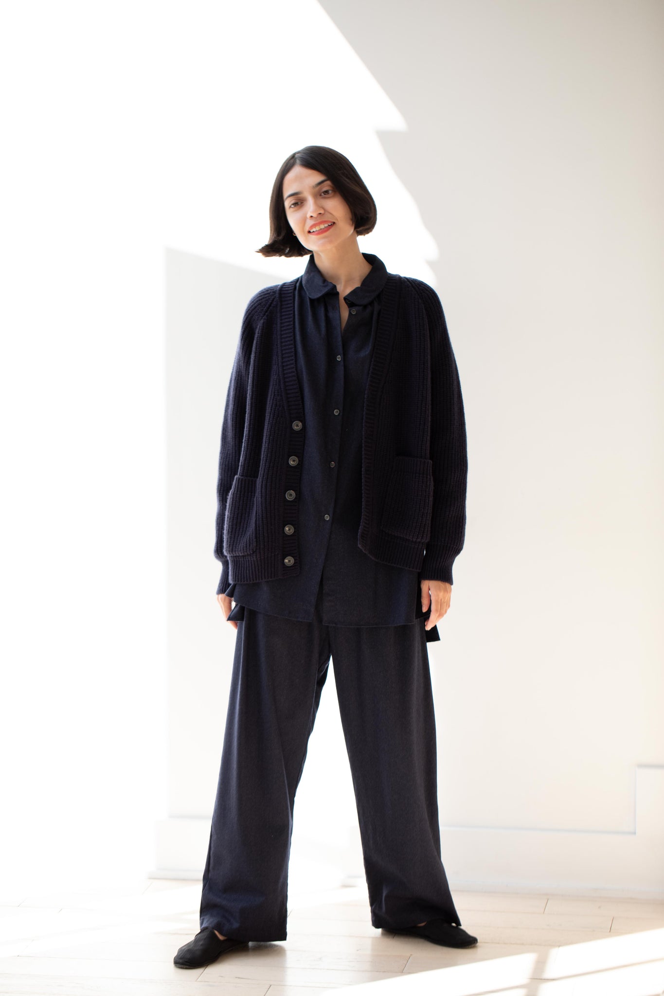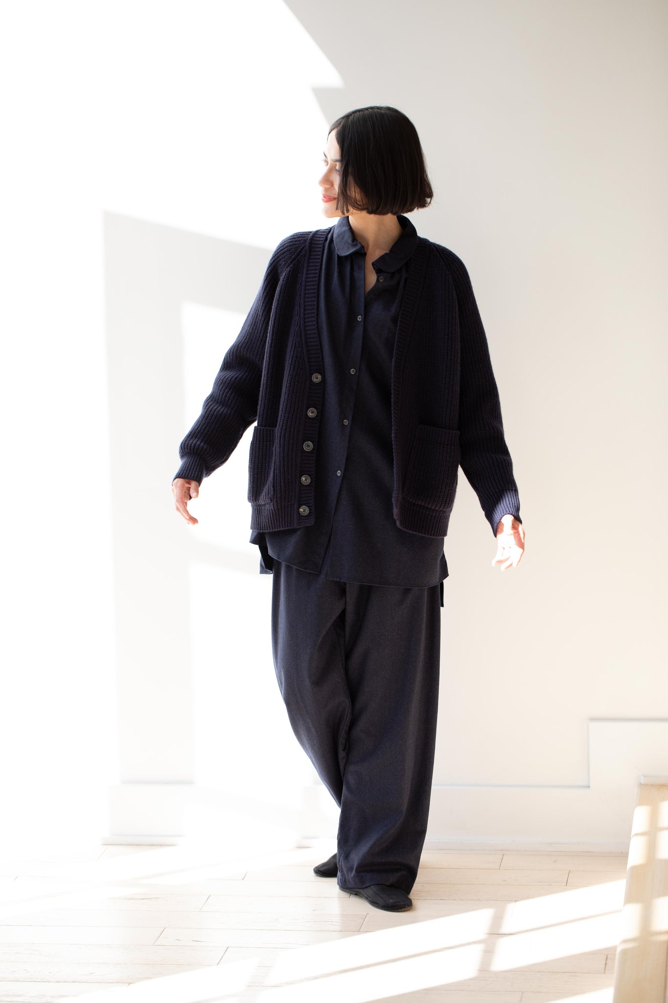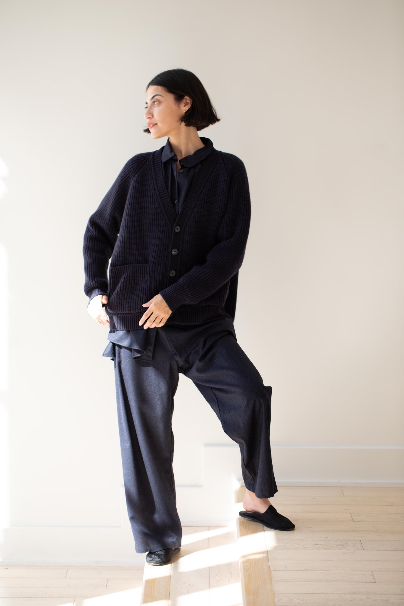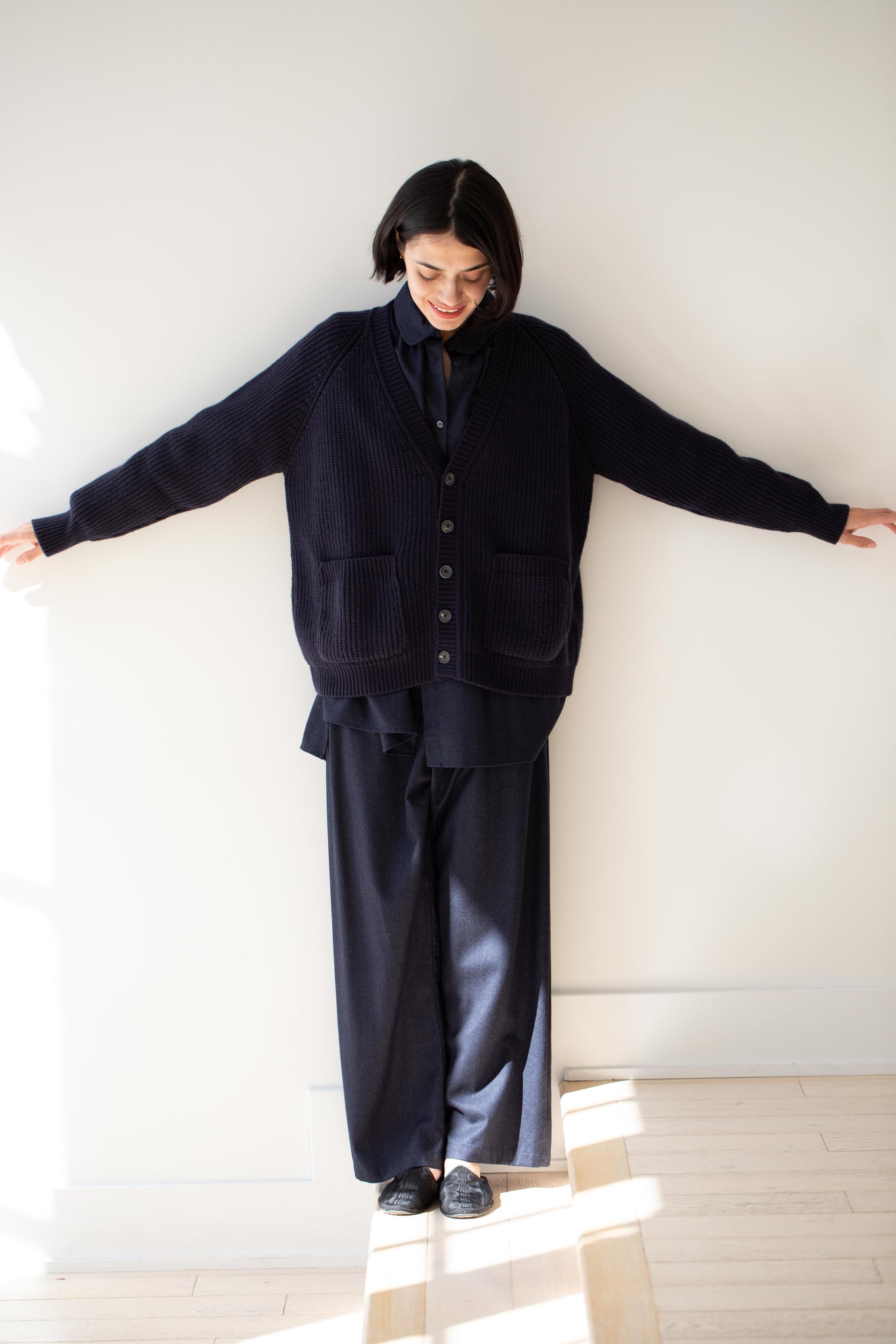 This cardigan is made from the softest cashmere yarn and is nice and thick due to the rib knit. It has a button up front and two side patch pockets. We think this would pair wonderfully with any look this winter, the navy color goes with pretty much anything!