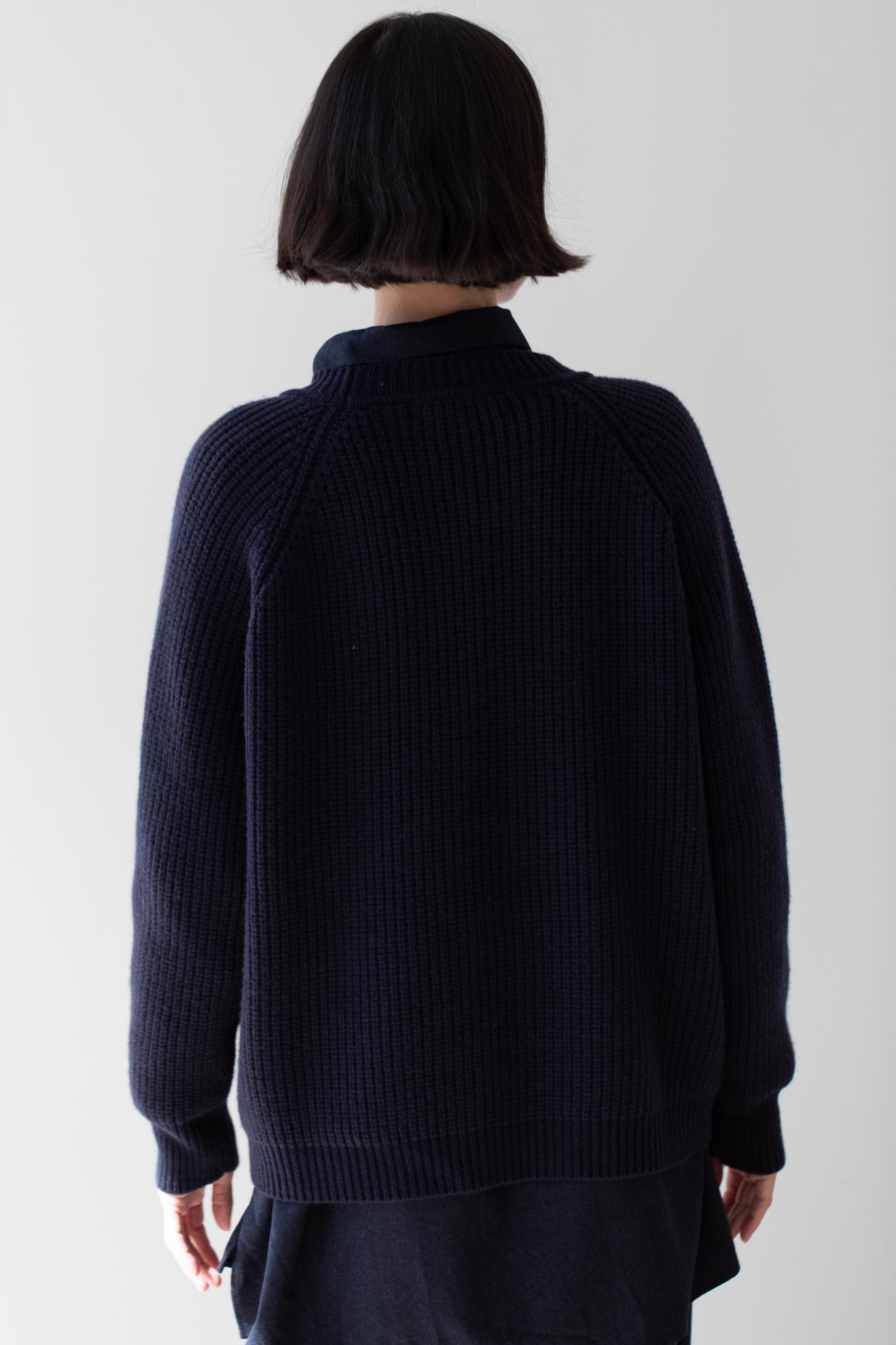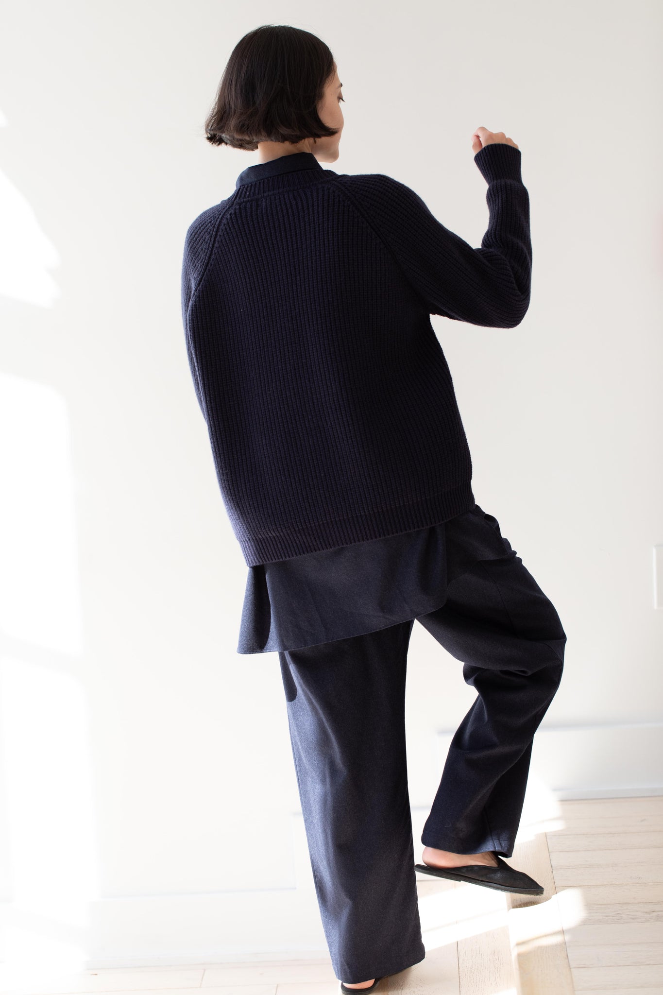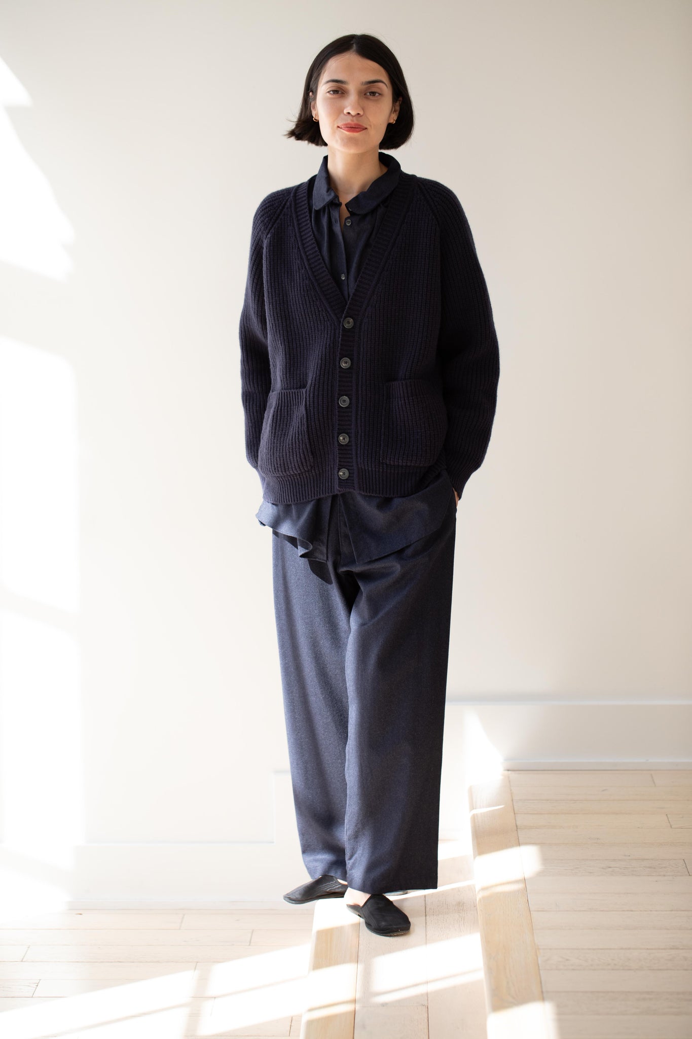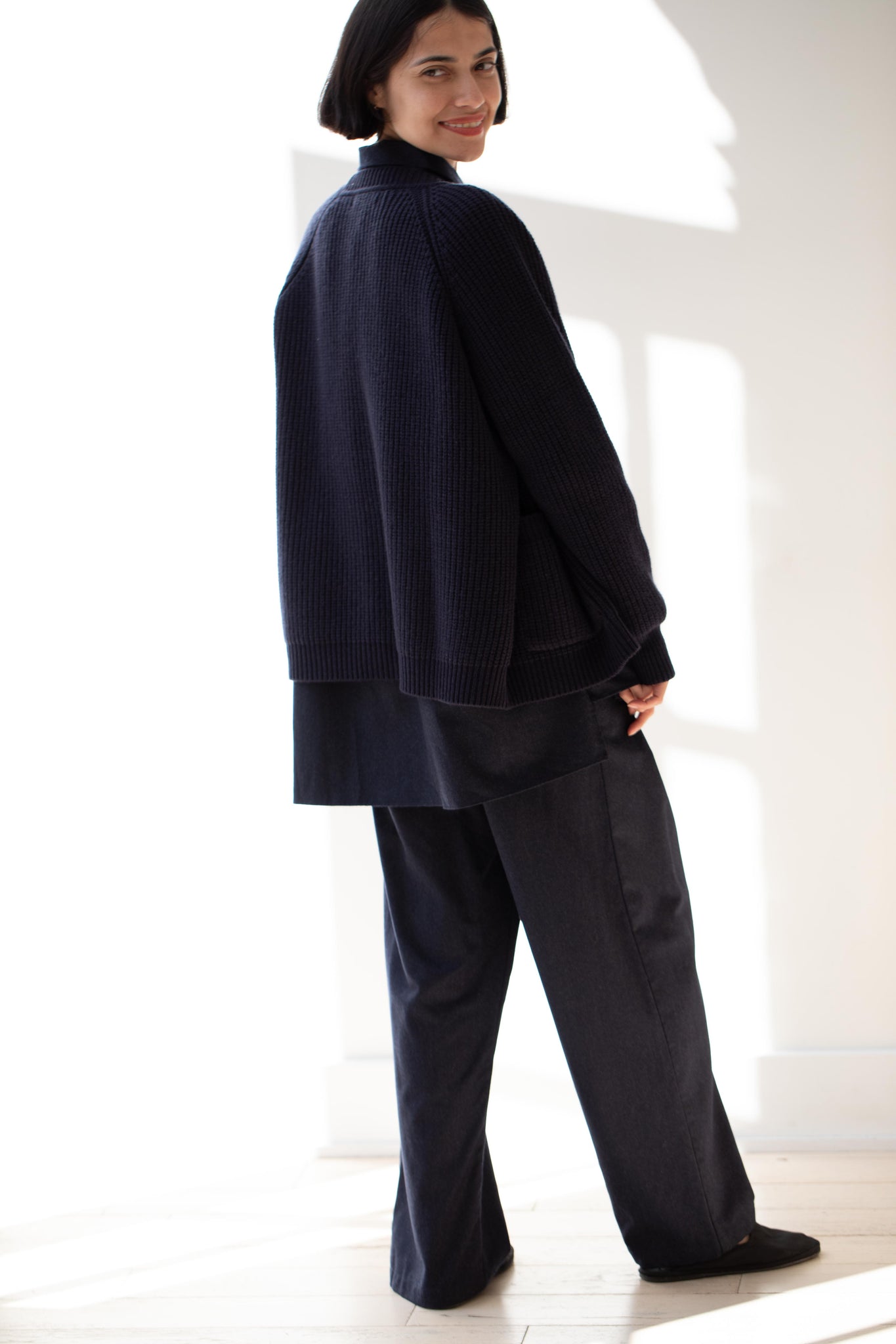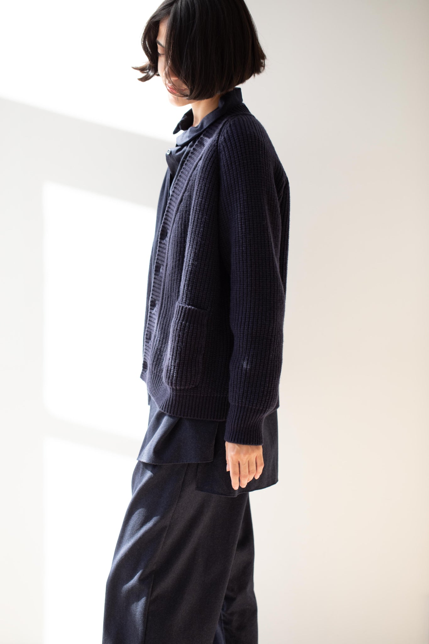 This cardigan is made from the softest cashmere yarn and is nice and thick due to the rib knit. It has a button up front and two side patch pockets. We think this would pair wonderfully with any look this winter, the navy color goes with pretty much anything!