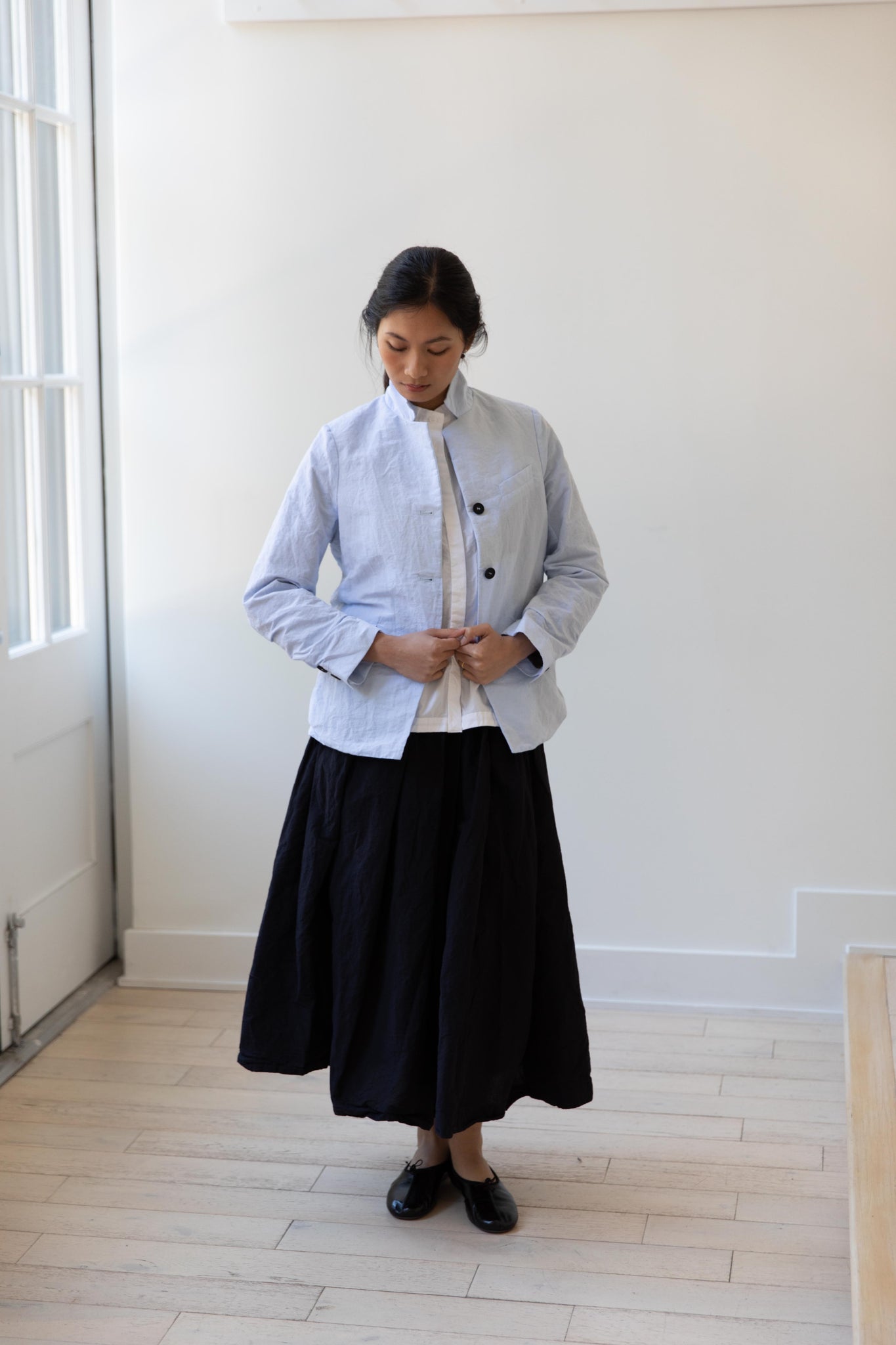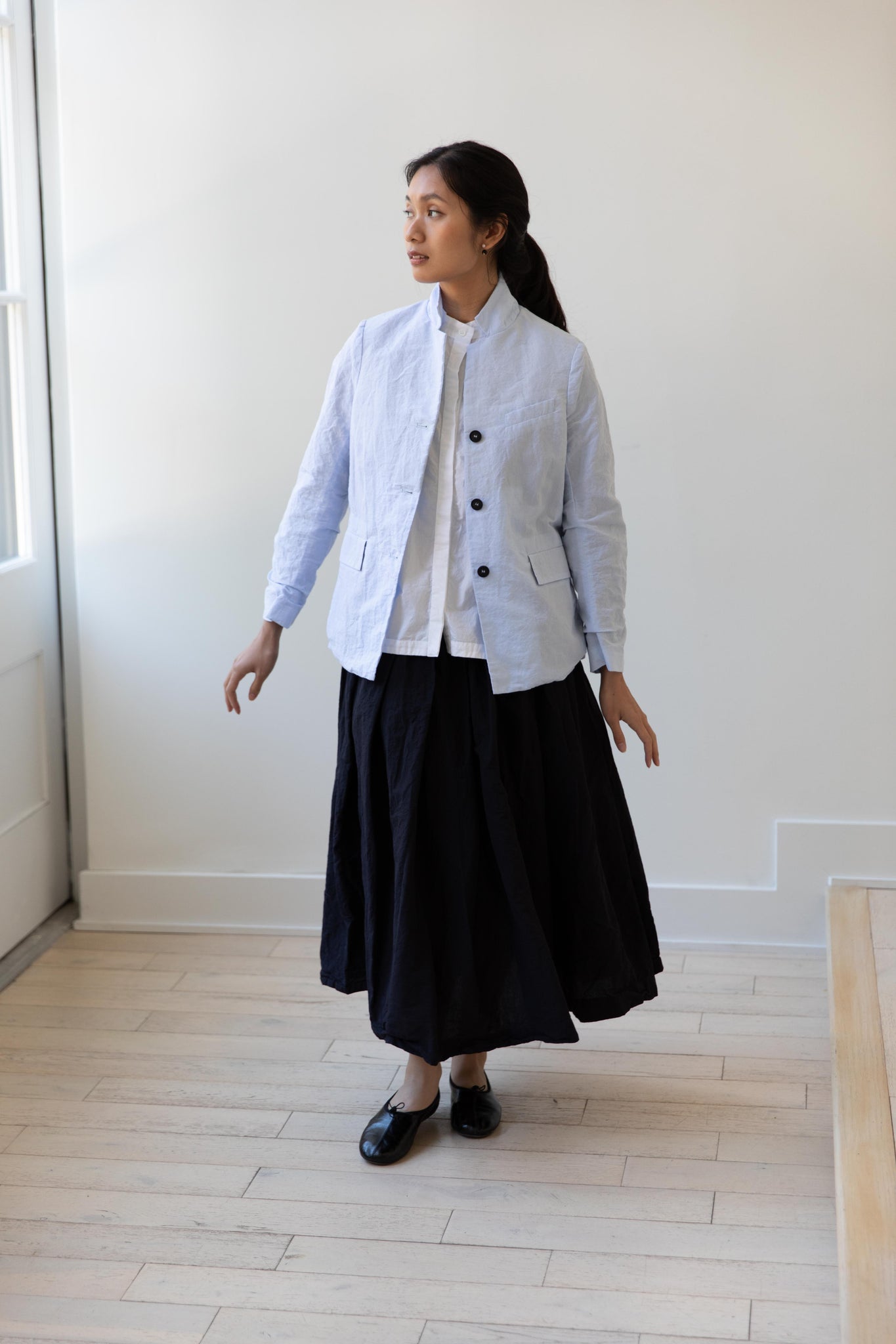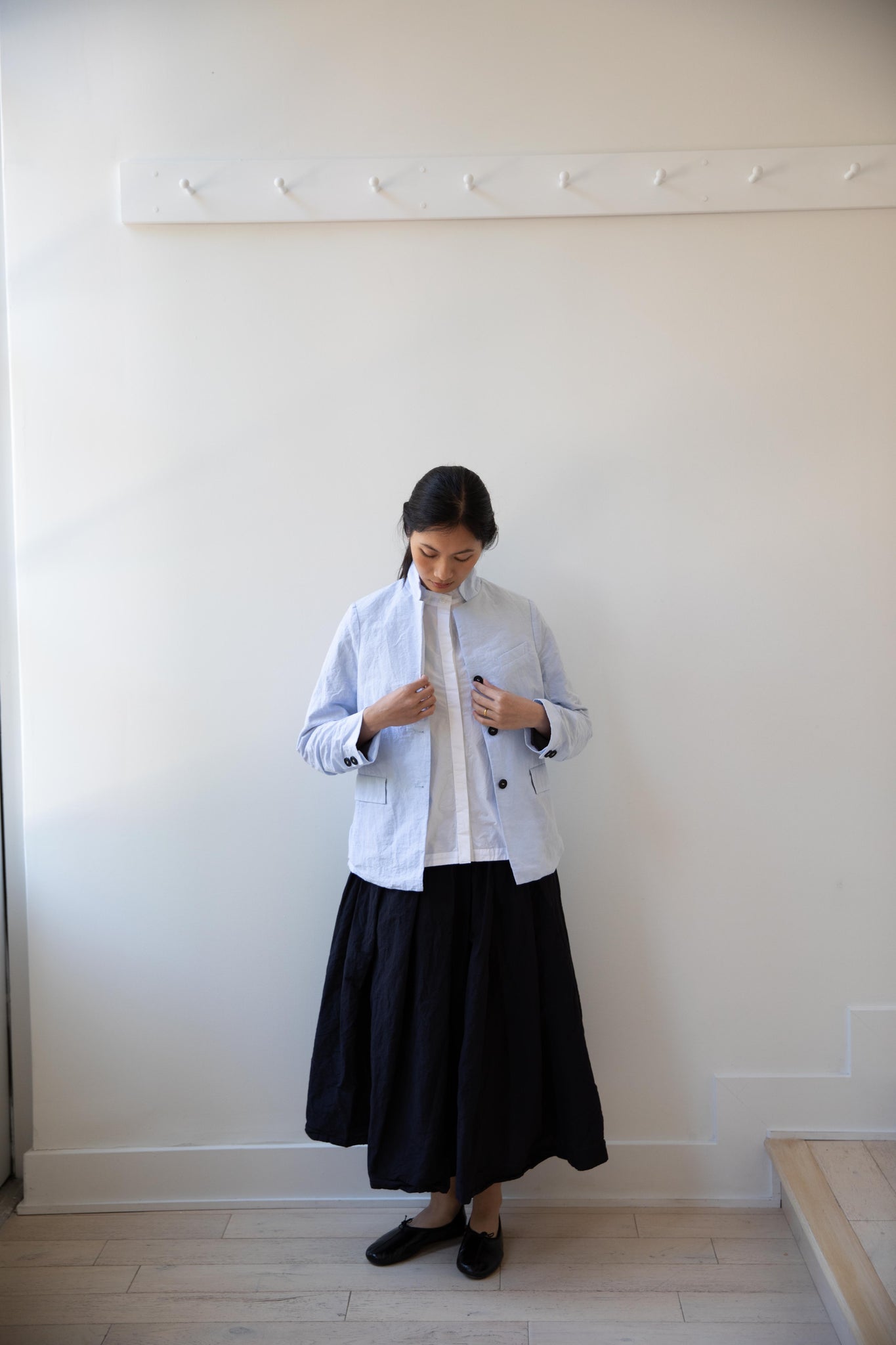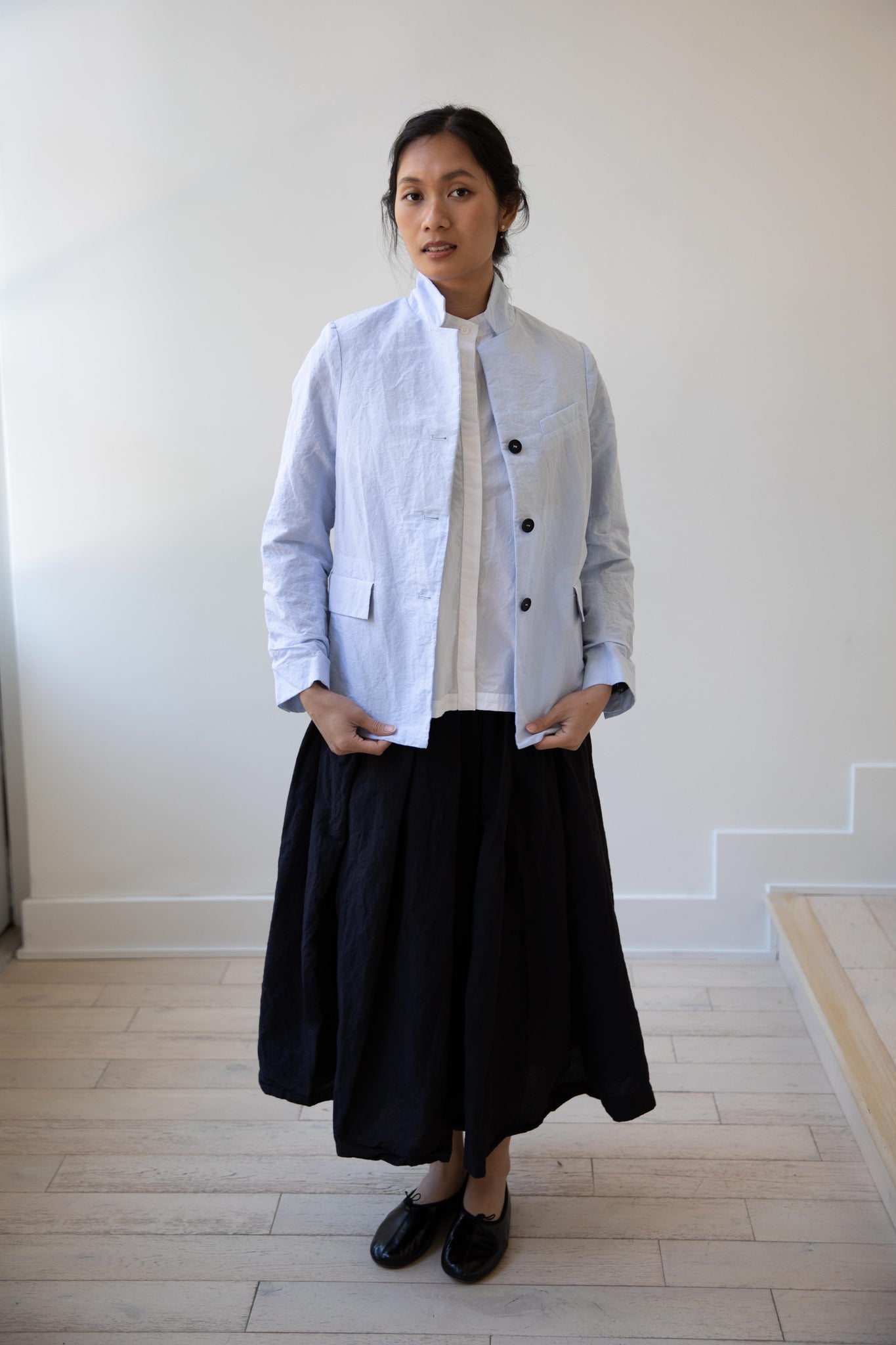 The Giulia jacket is back in this crinkled light blue cotton. The style is similar to the Tyrol that we all know and love, but with just a few small details that are different. The bottom is flat across, and there are two flap welt pockets on the front.  It's lined in a grey fabric, and pairs well with everything for the summer season.