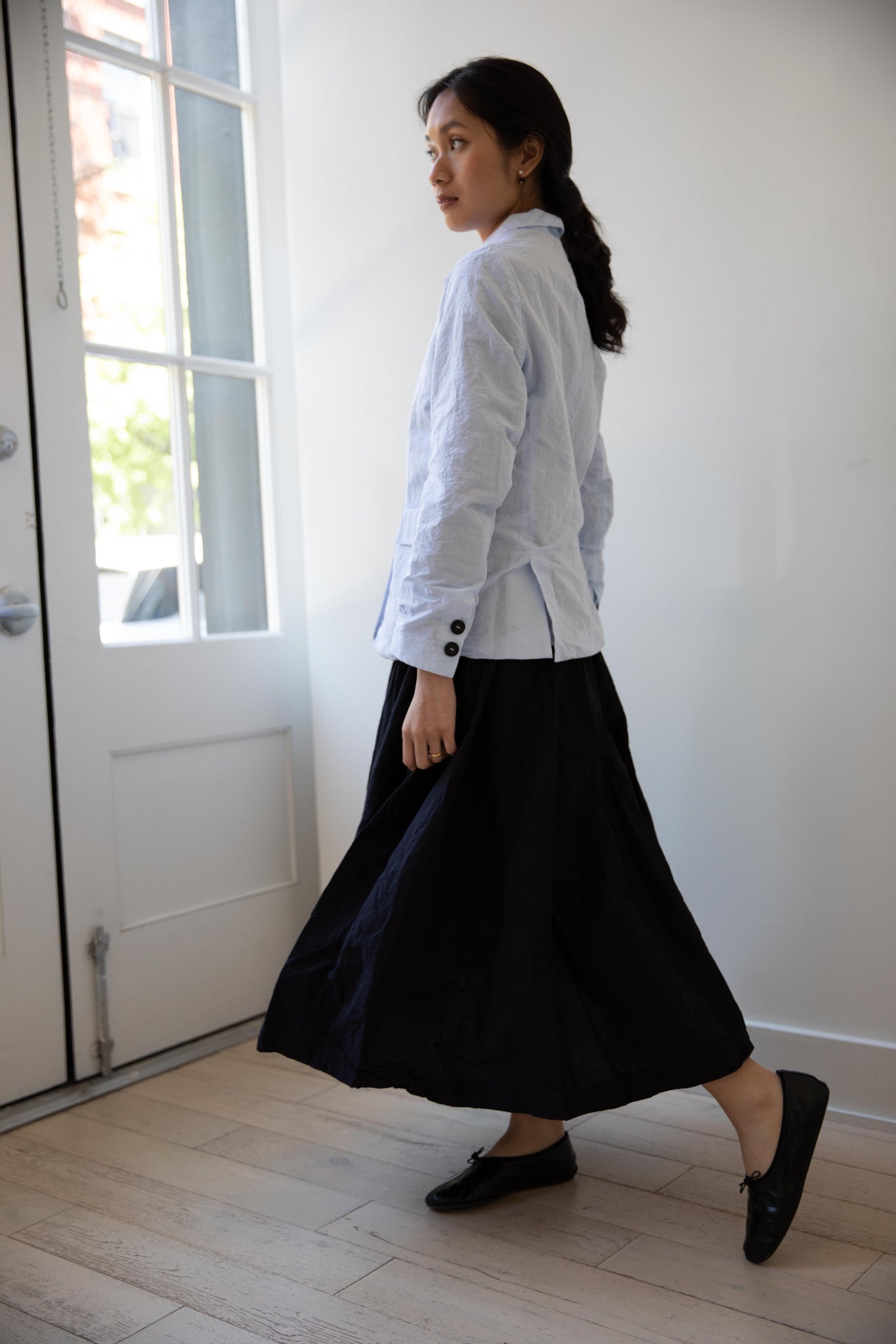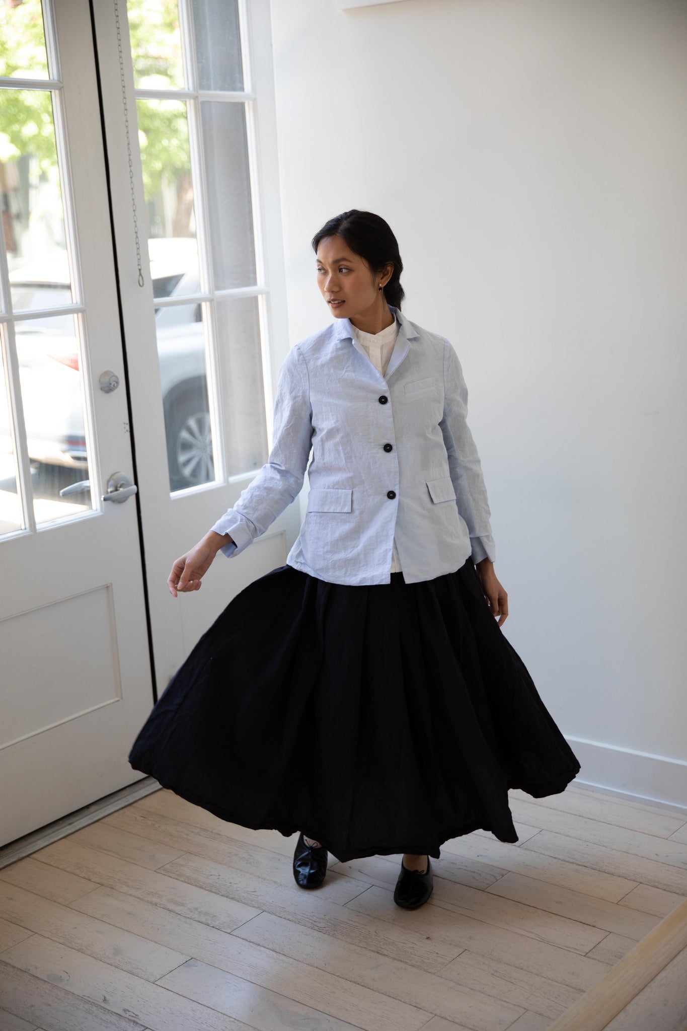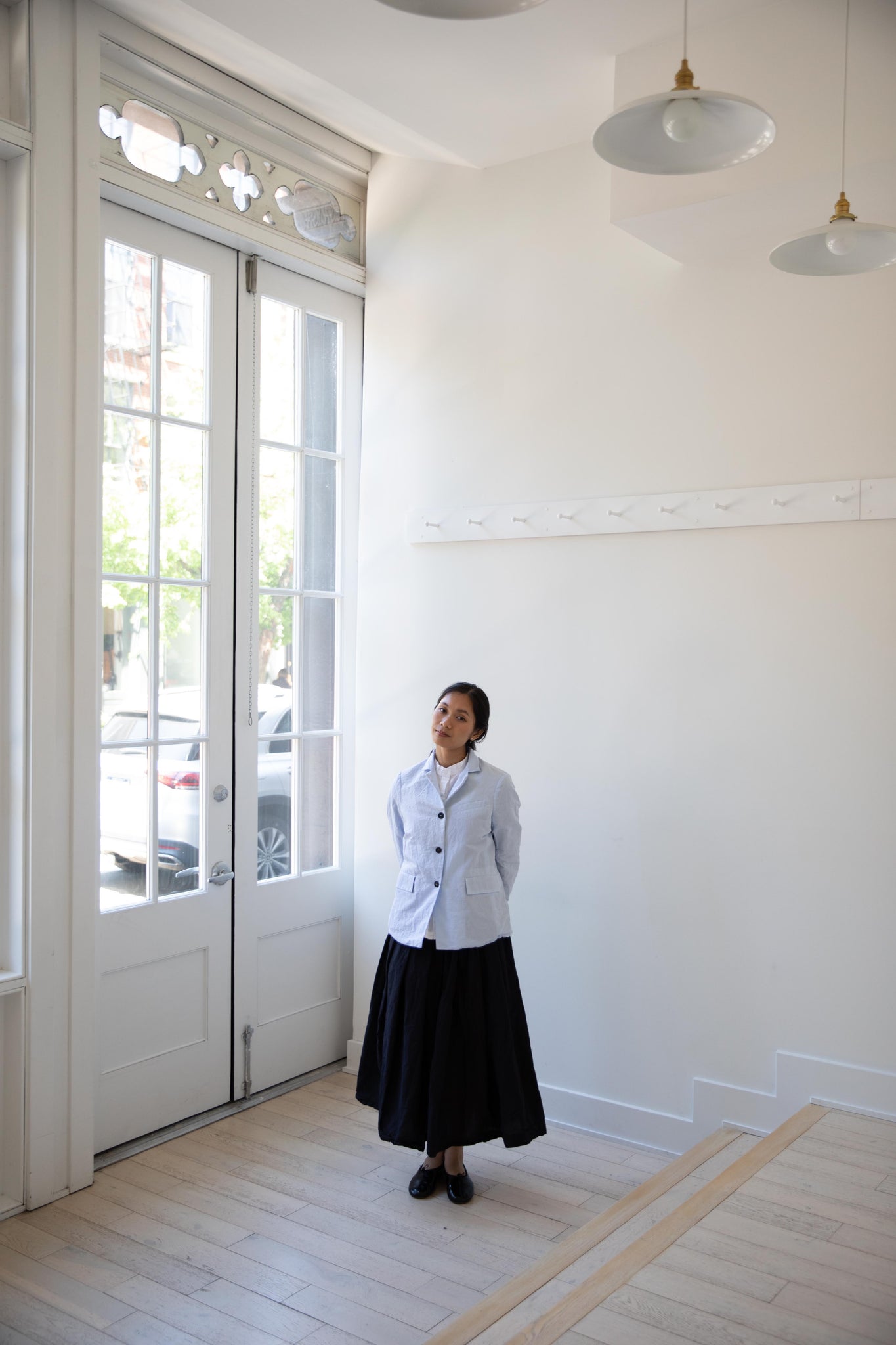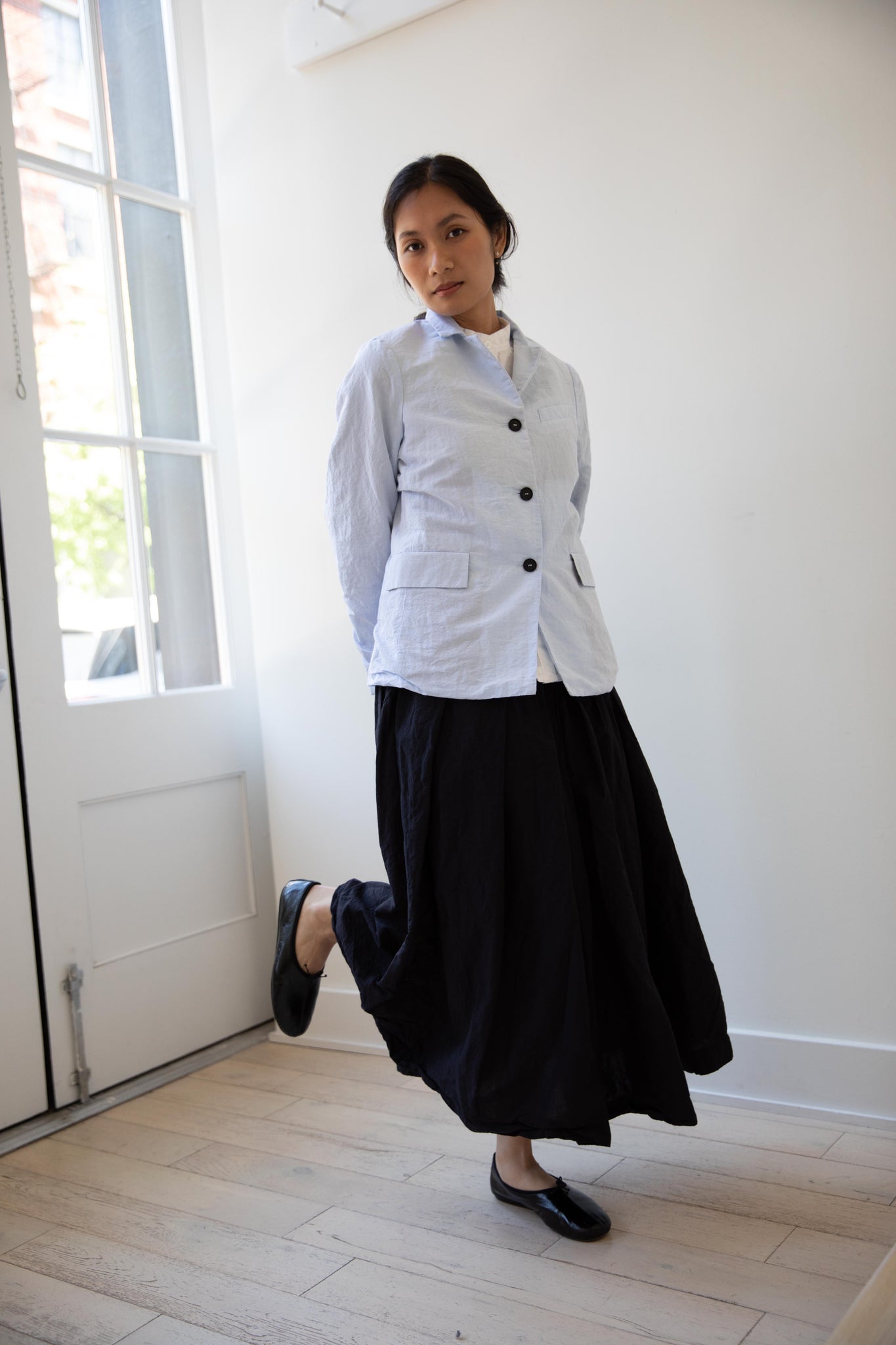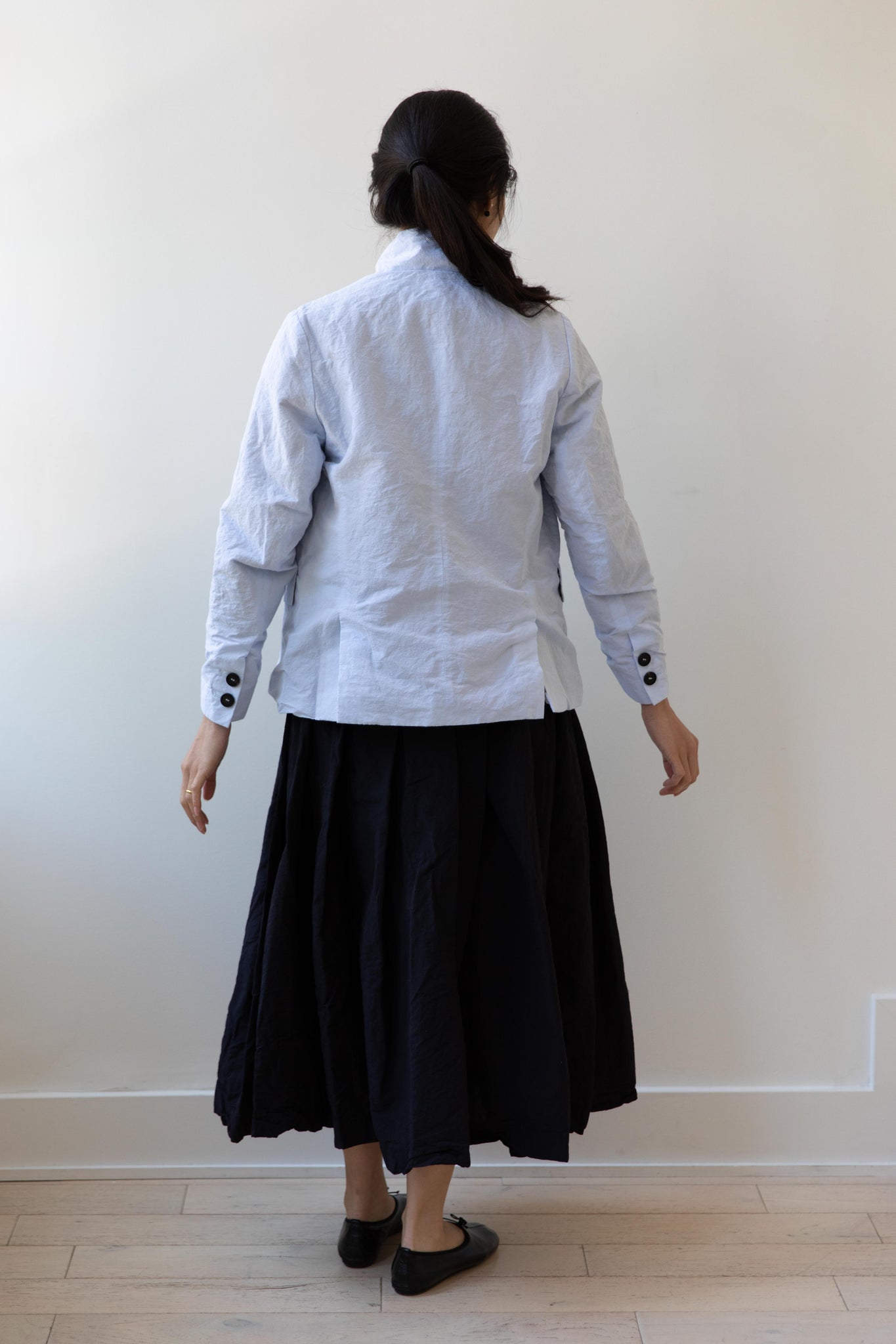 The Giulia jacket is back in this crinkled light blue cotton. The style is similar to the Tyrol that we all know and love, but with just a few small details that are different. The bottom is flat across, and there are two flap welt pockets on the front.  It's lined in a grey fabric, and pairs well with everything for the summer season.