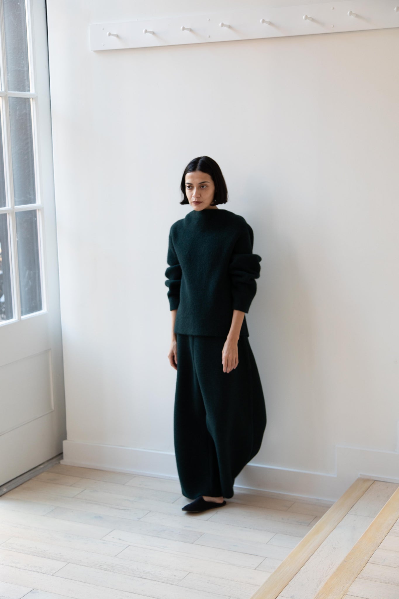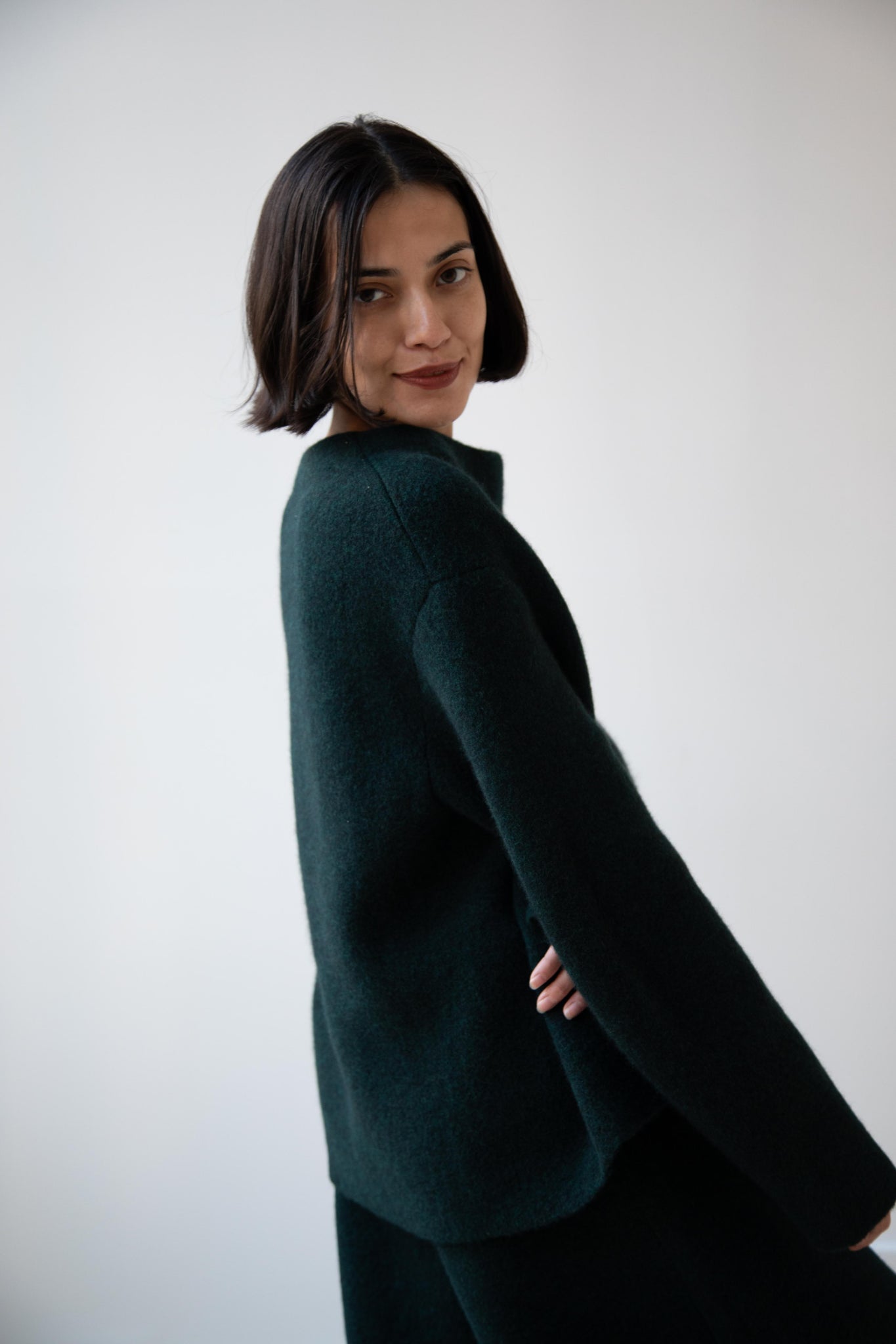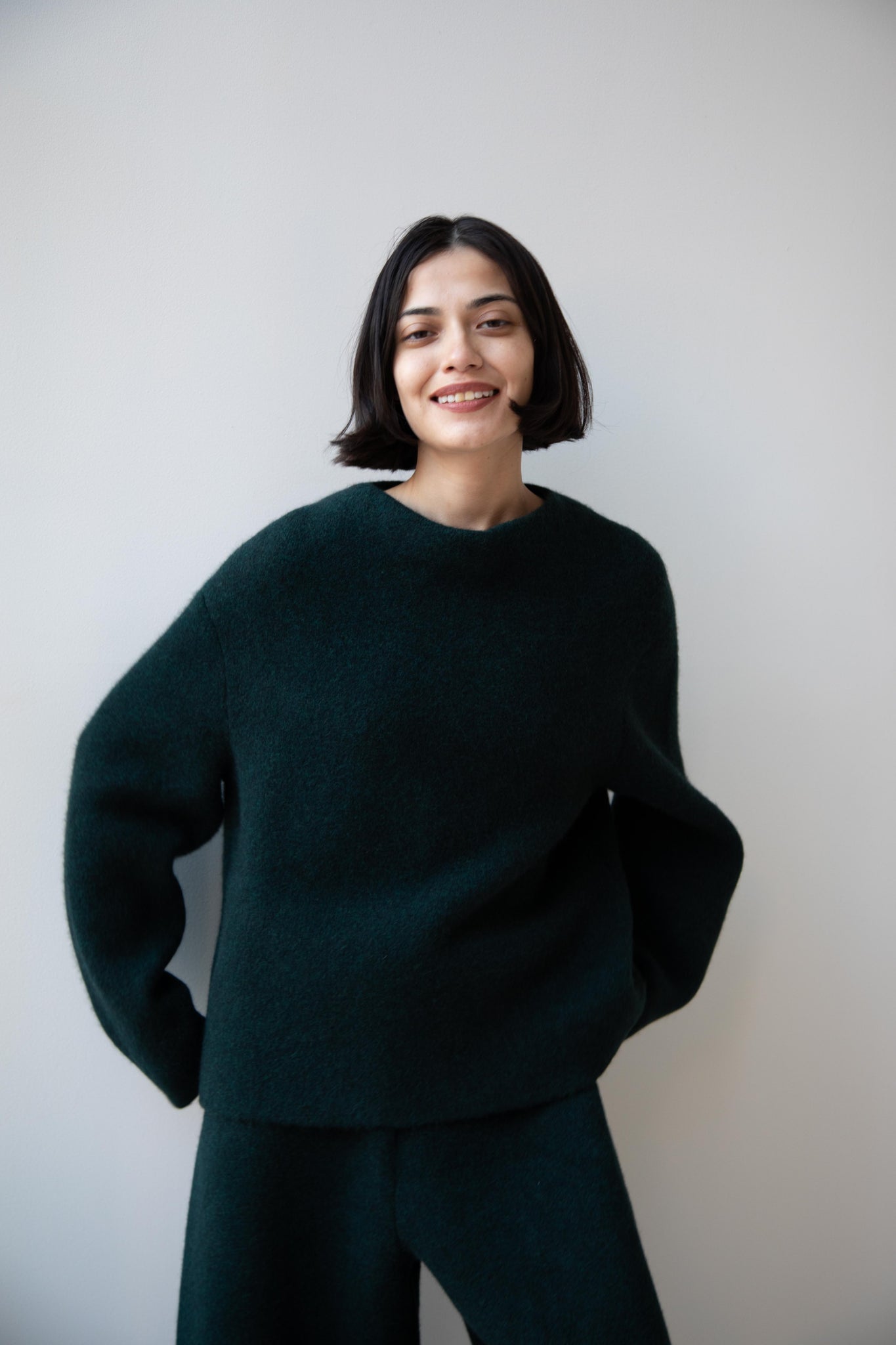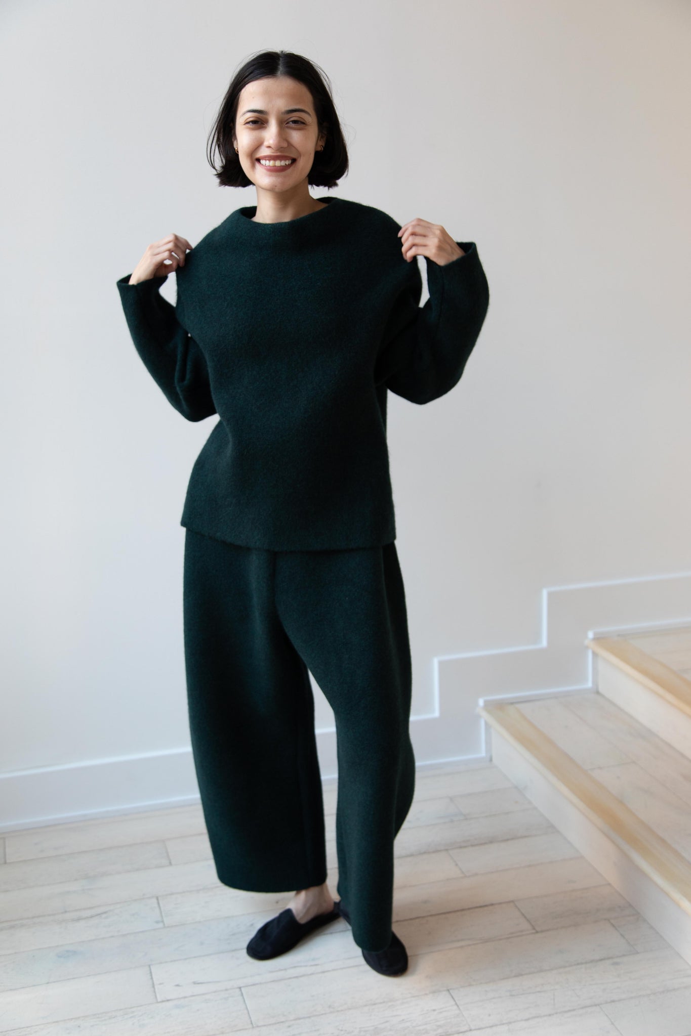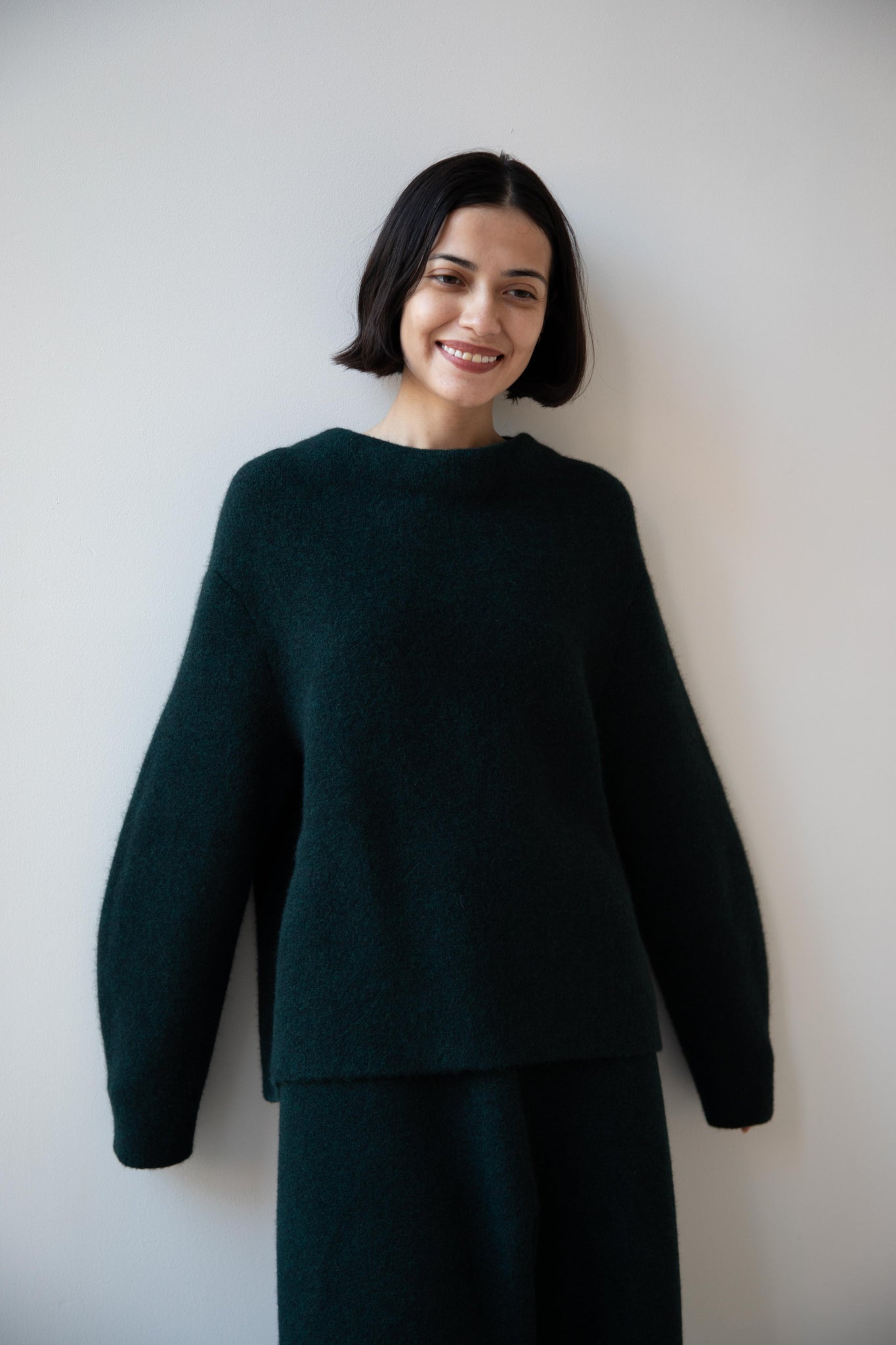 This pullover sweater features a wide boat neckline that is a little bit baggy.  The sleeves are slightly bowed, giving the whole piece a sculptural and elegant shape.  Wear it with the matching trousers for a perfect fall outfit.  The shade of green is very deep and beautiful too.