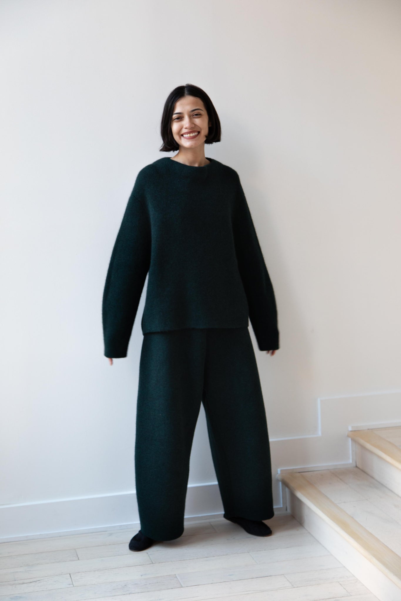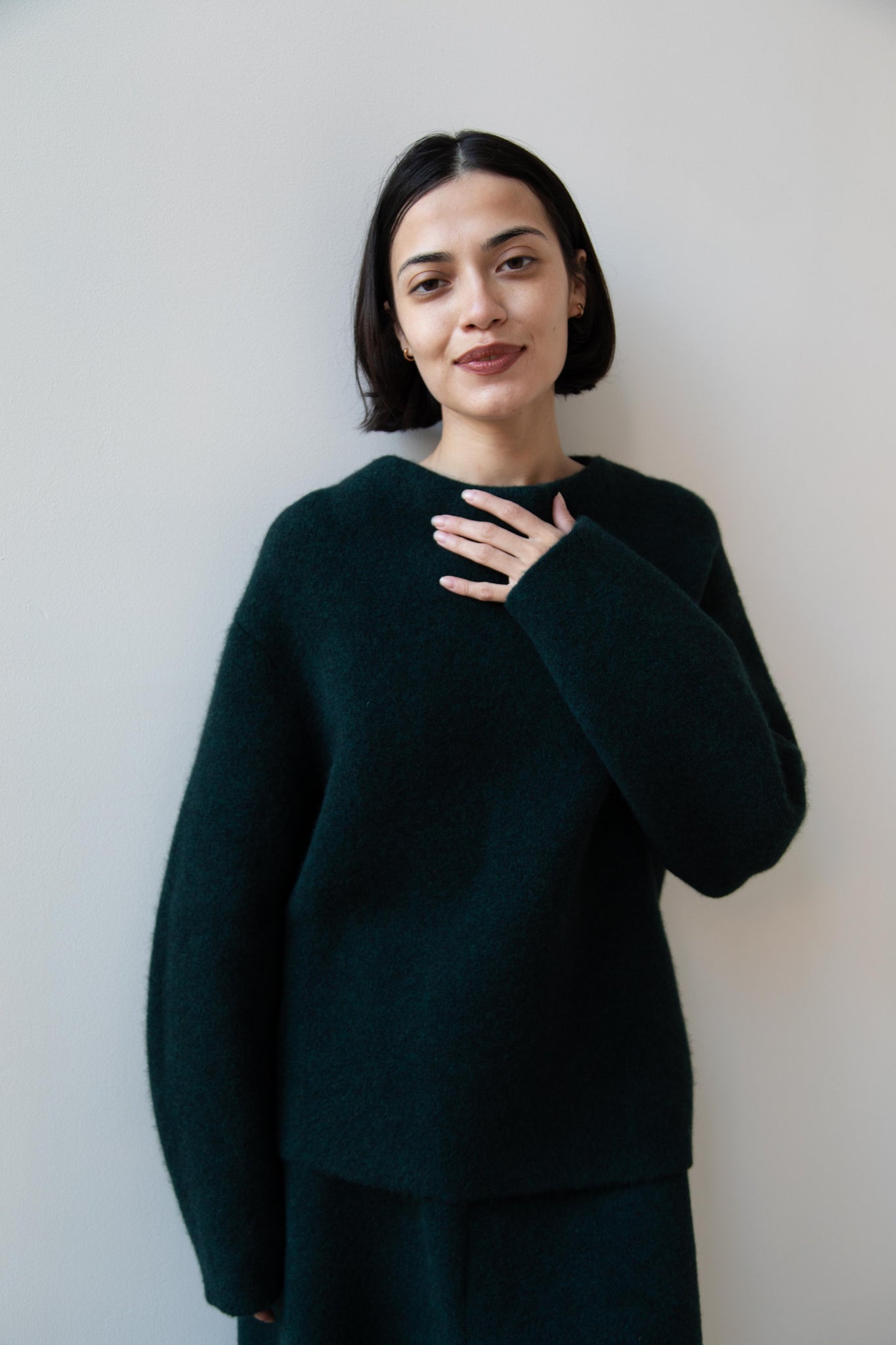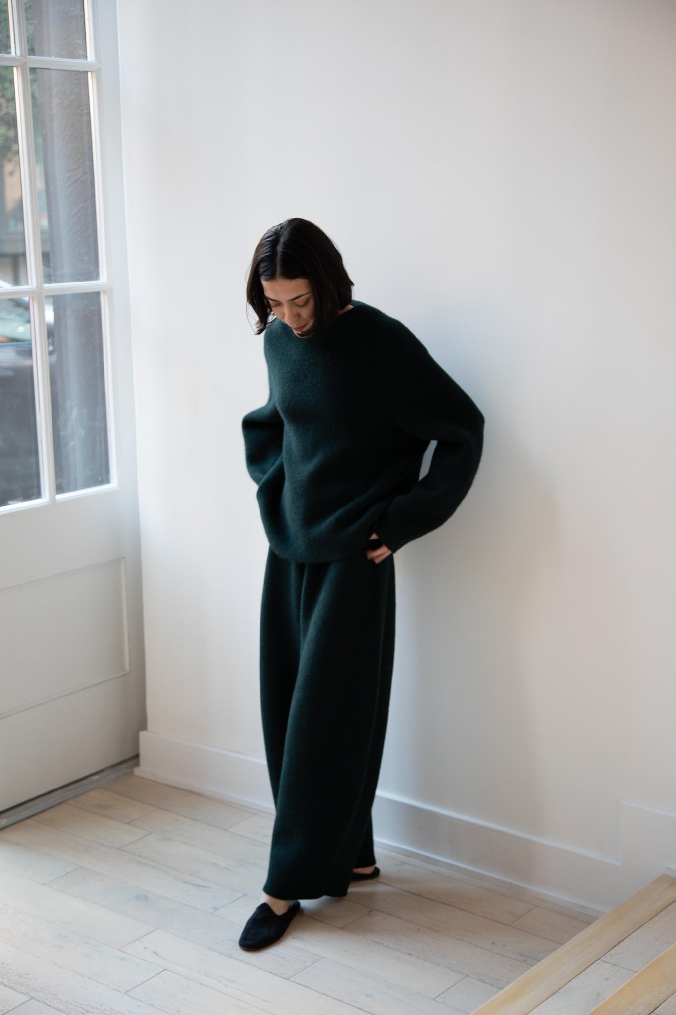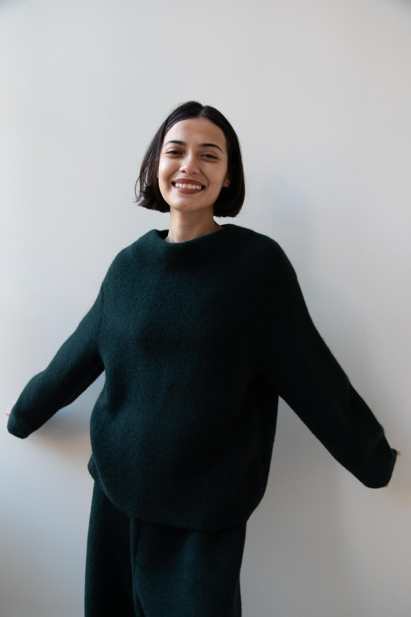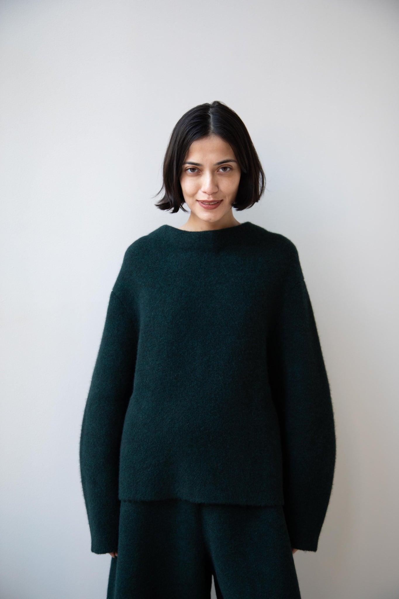 This pullover sweater features a wide boat neckline that is a little bit baggy.  The sleeves are slightly bowed, giving the whole piece a sculptural and elegant shape.  Wear it with the matching trousers for a perfect fall outfit.  The shade of green is very deep and beautiful too.