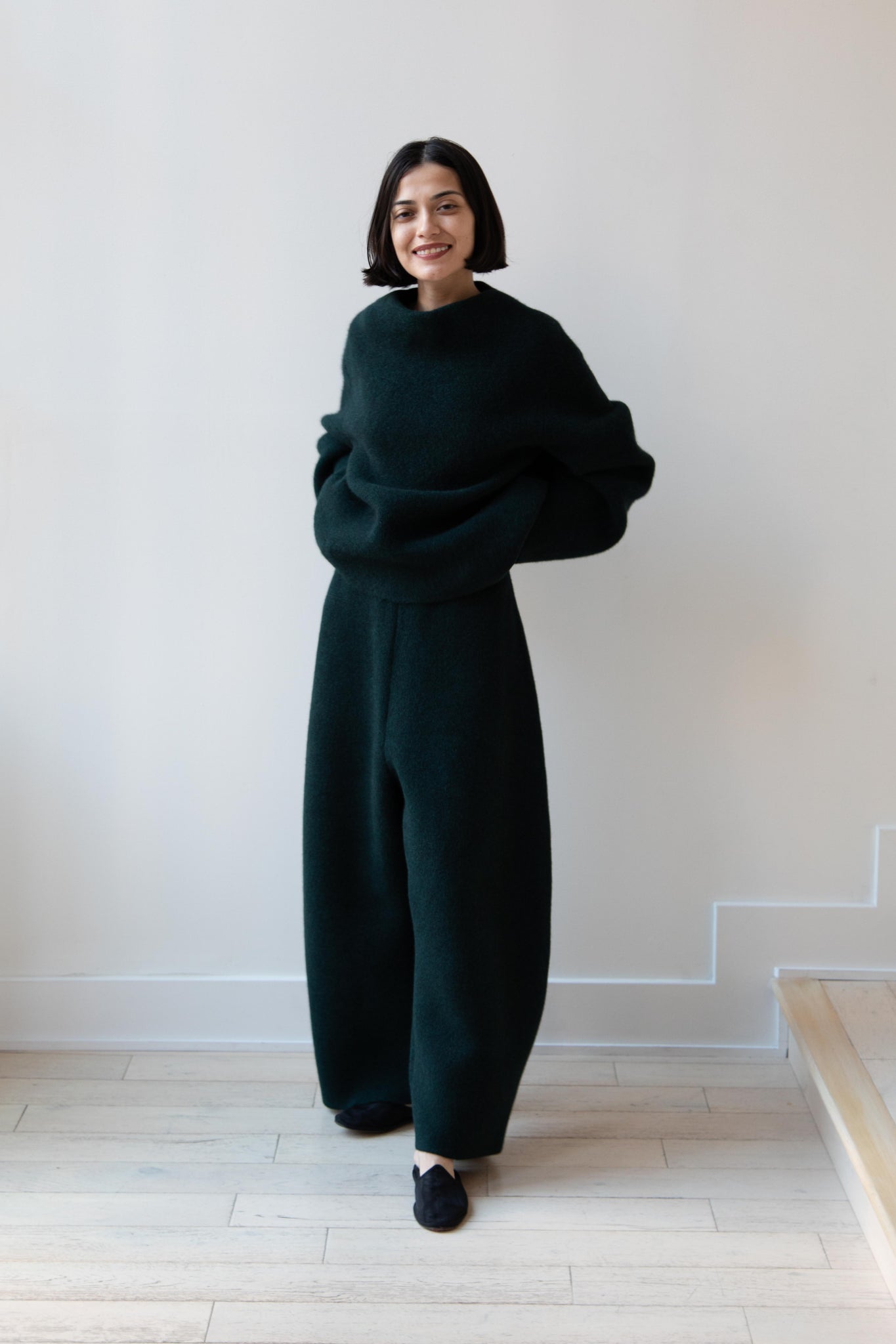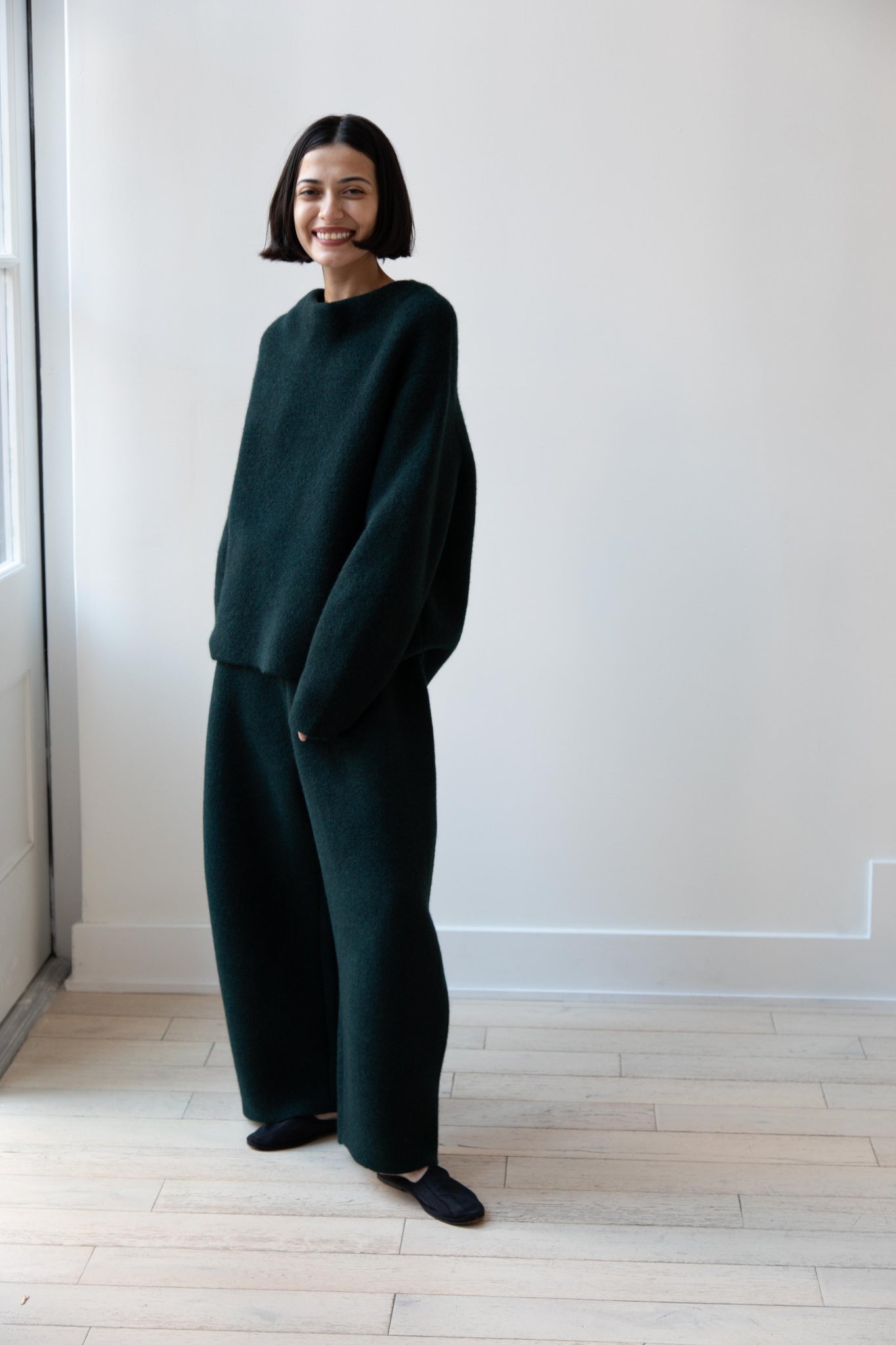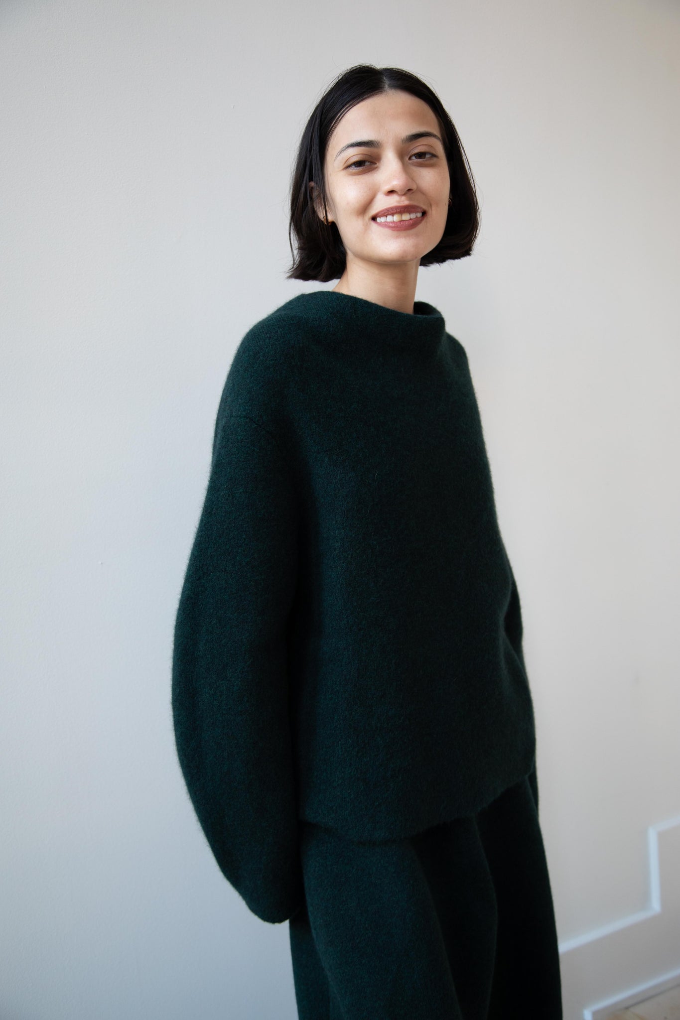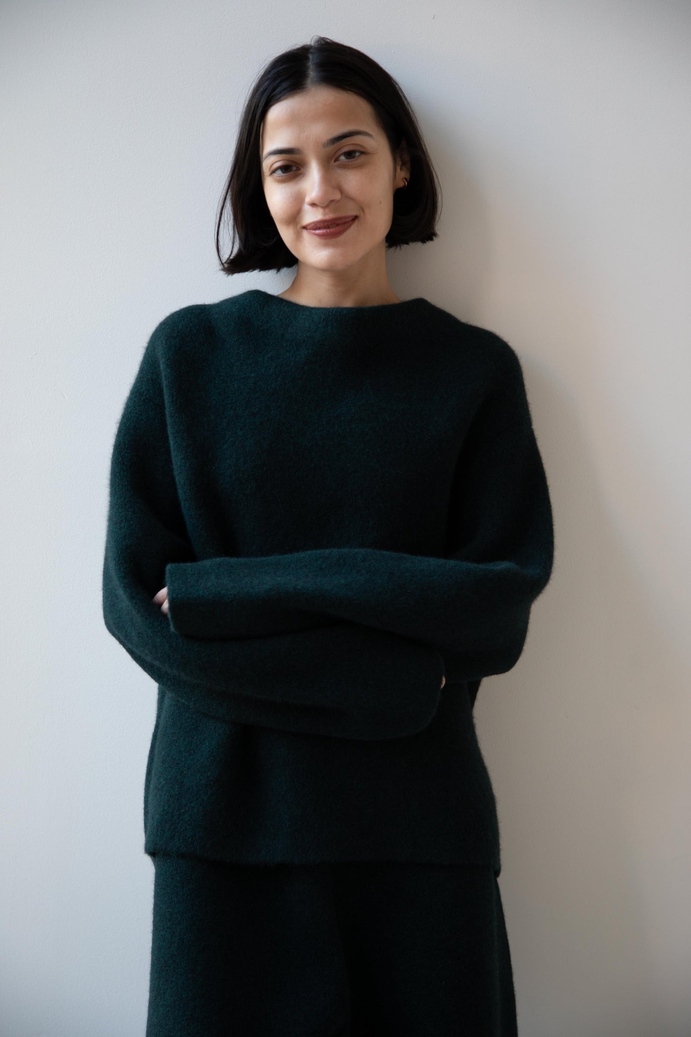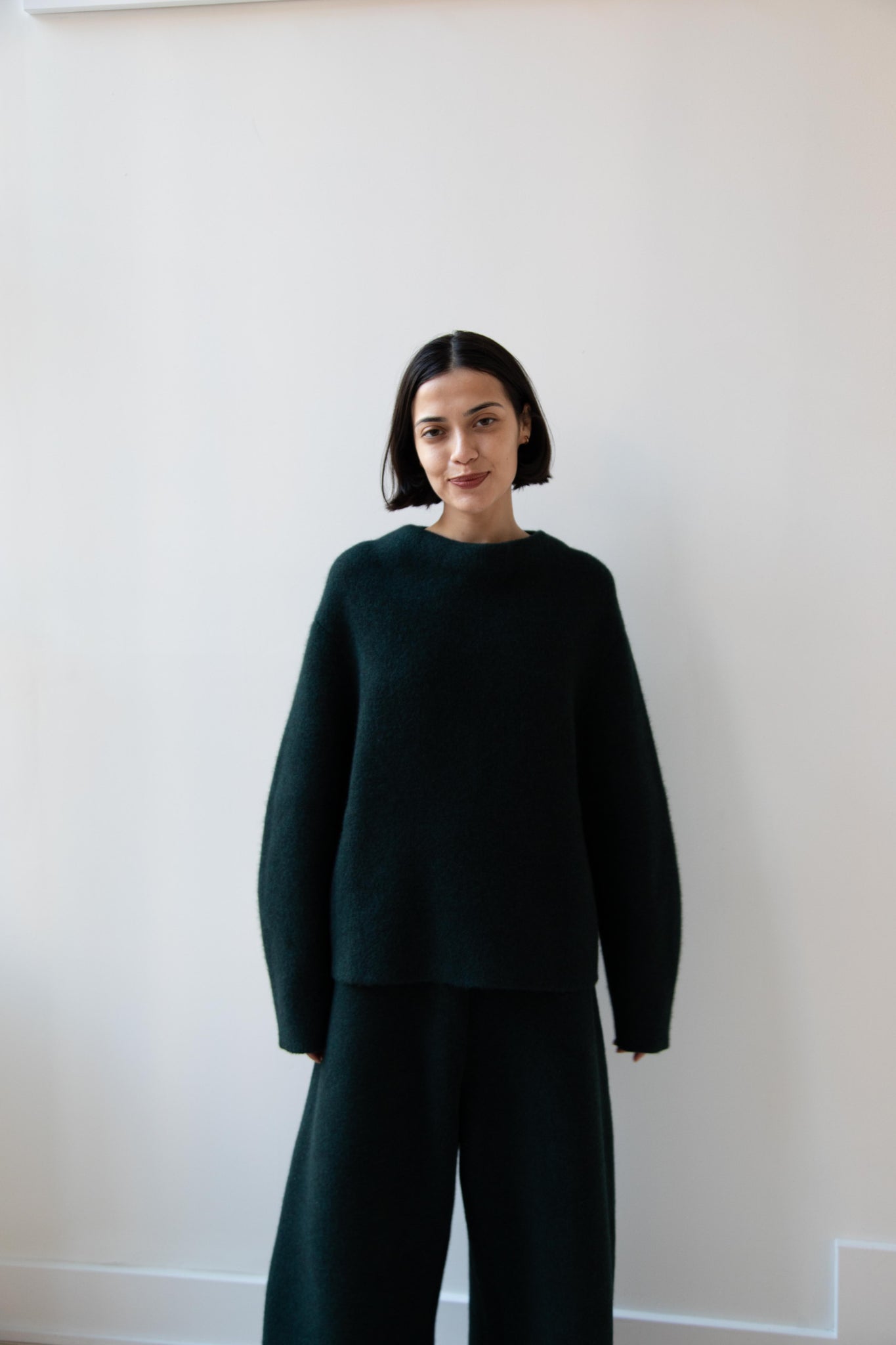 This pullover sweater features a wide boat neckline that is a little bit baggy.  The sleeves are slightly bowed, giving the whole piece a sculptural and elegant shape.  Wear it with the matching trousers for a perfect fall outfit.  The shade of green is very deep and beautiful too.