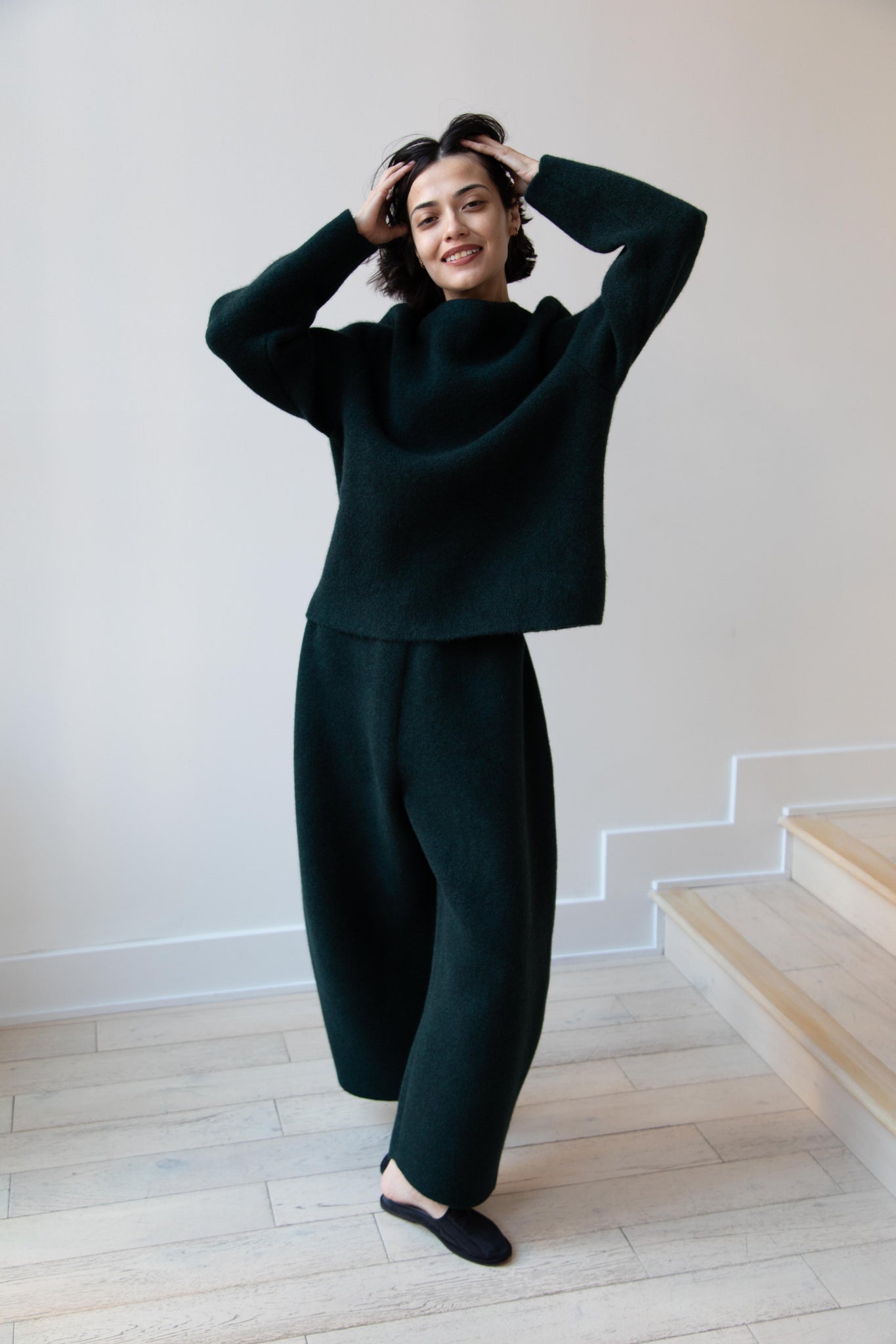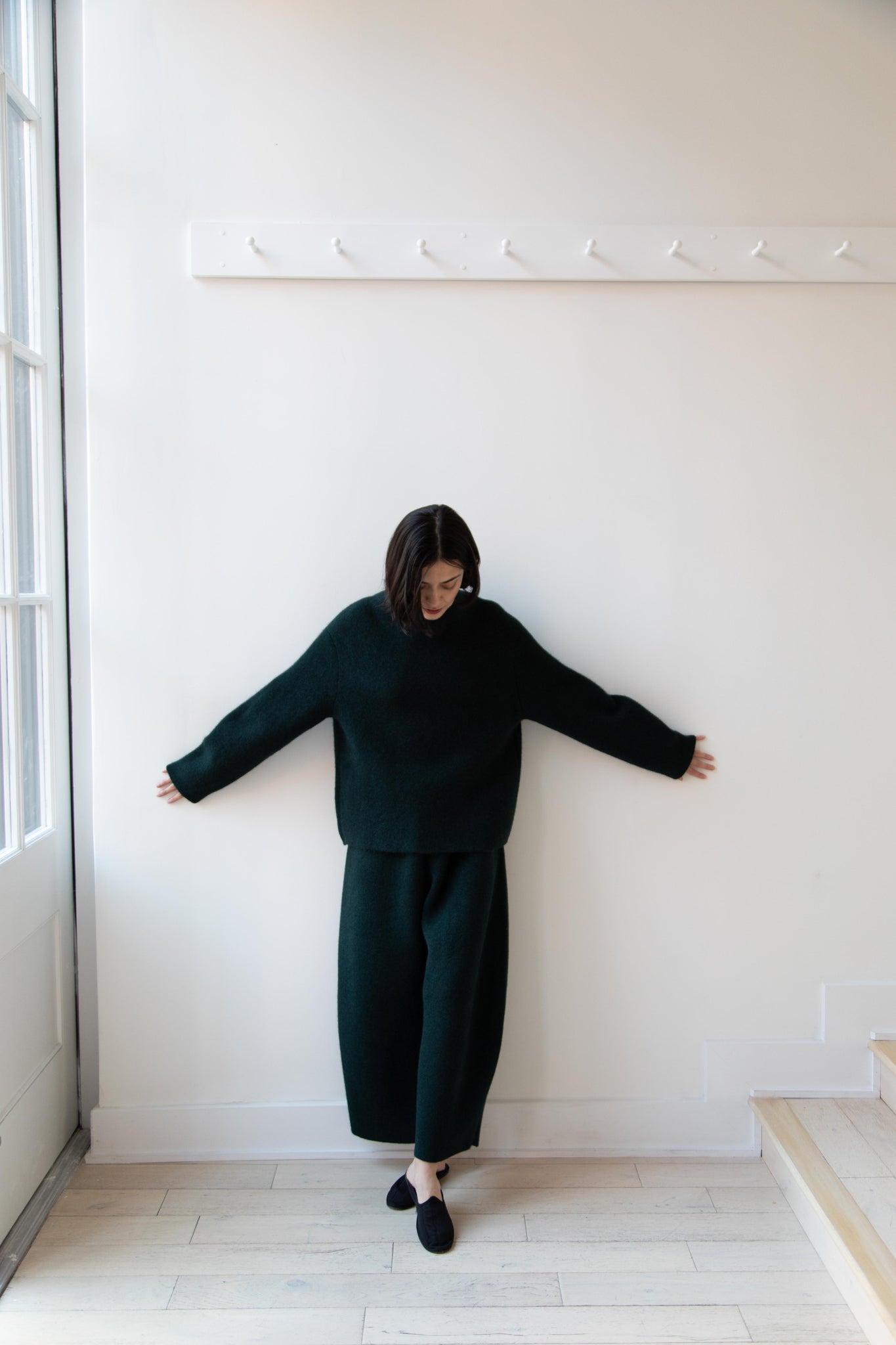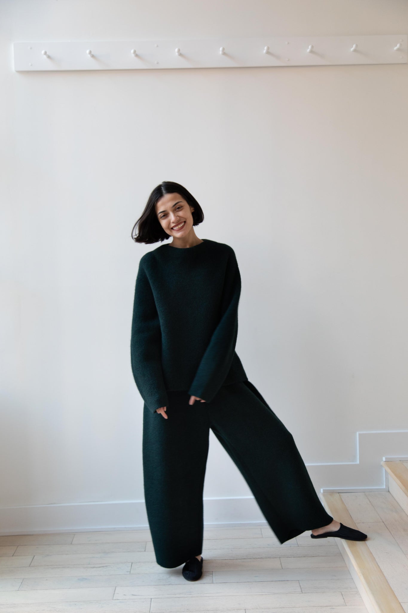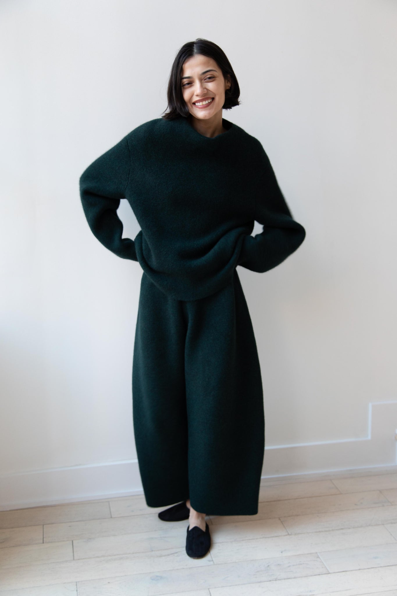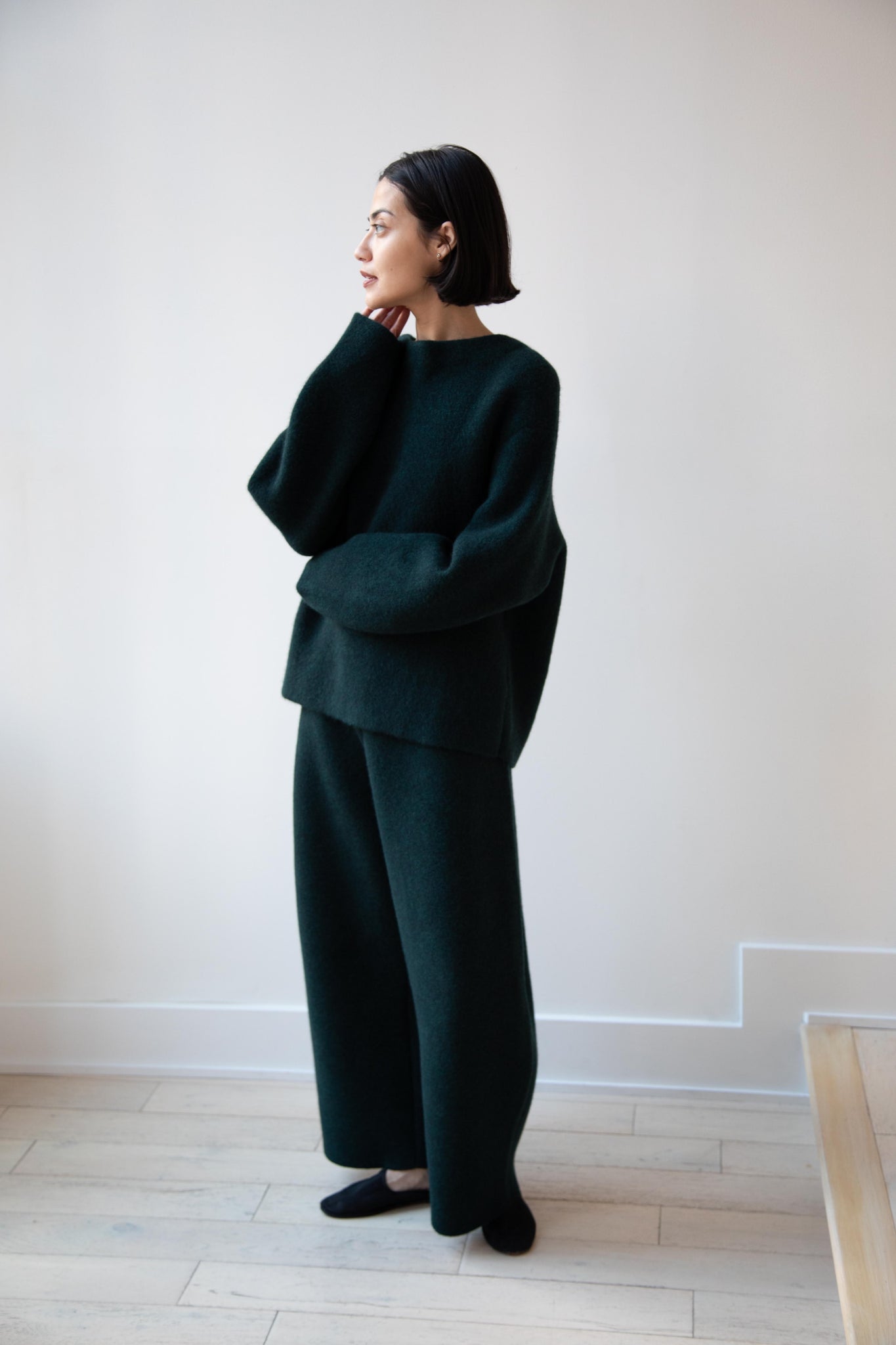 This pullover sweater features a wide boat neckline that is a little bit baggy.  The sleeves are slightly bowed, giving the whole piece a sculptural and elegant shape.  Wear it with the matching trousers for a perfect fall outfit.  The shade of green is very deep and beautiful too.