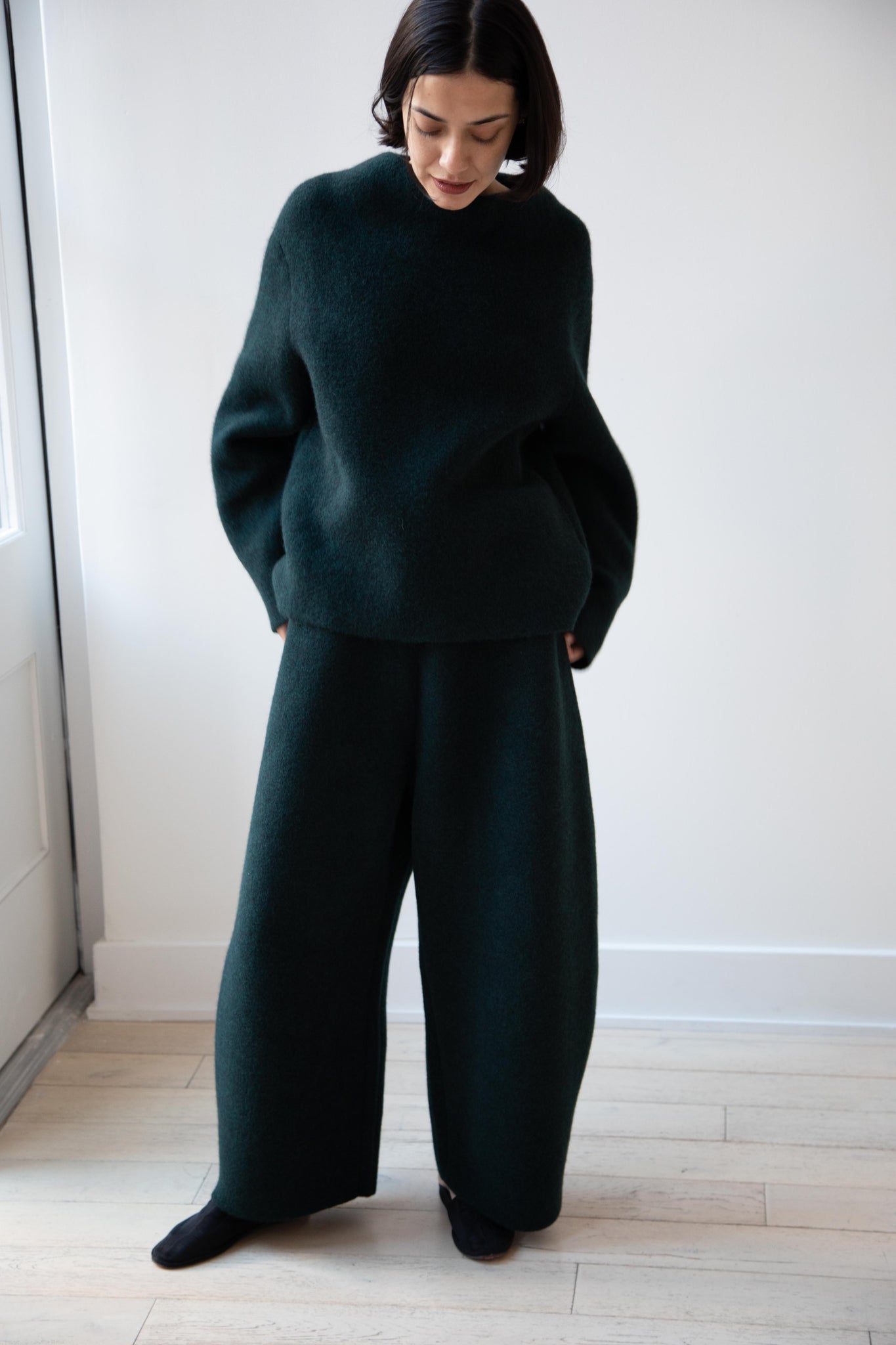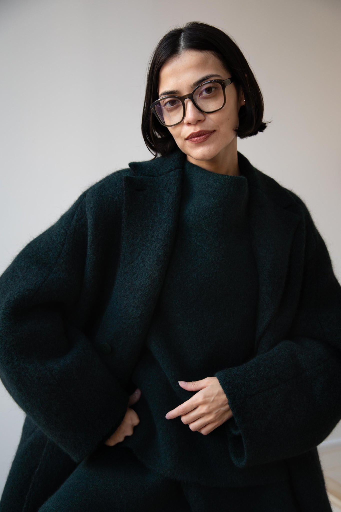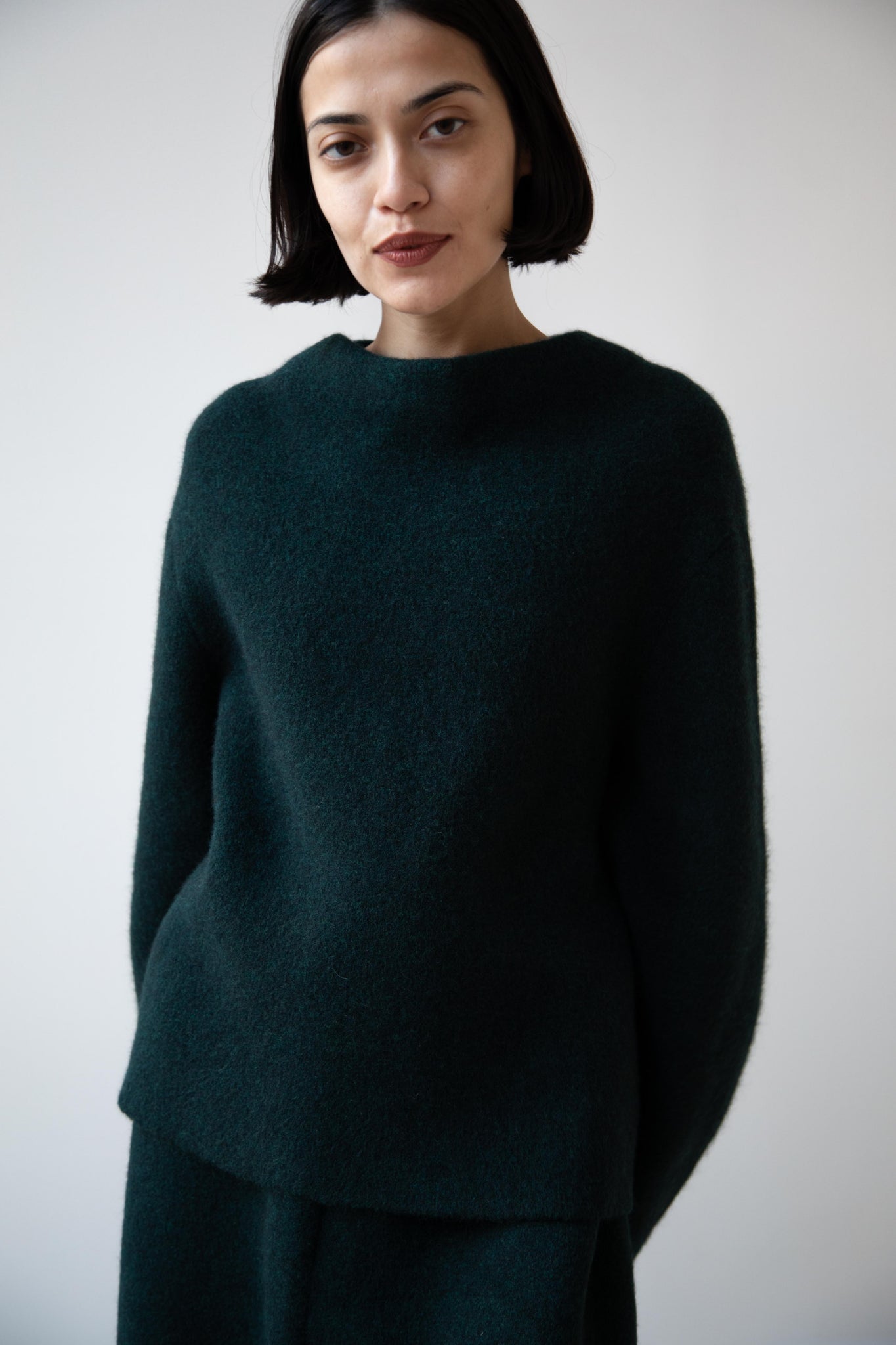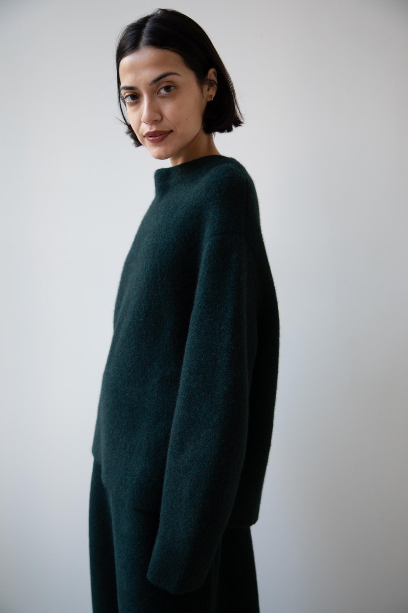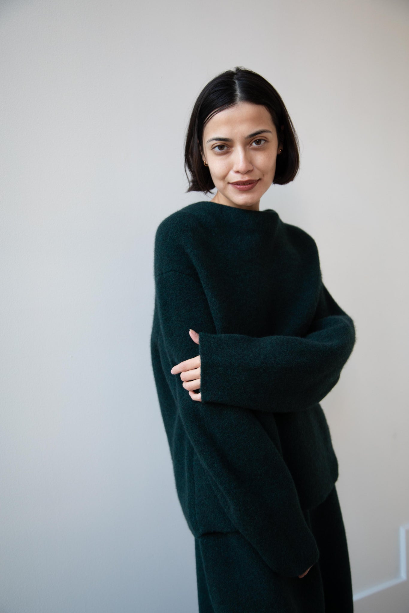 This pullover sweater features a wide boat neckline that is a little bit baggy.  The sleeves are slightly bowed, giving the whole piece a sculptural and elegant shape.  Wear it with the matching trousers for a perfect fall outfit.  The shade of green is very deep and beautiful too.