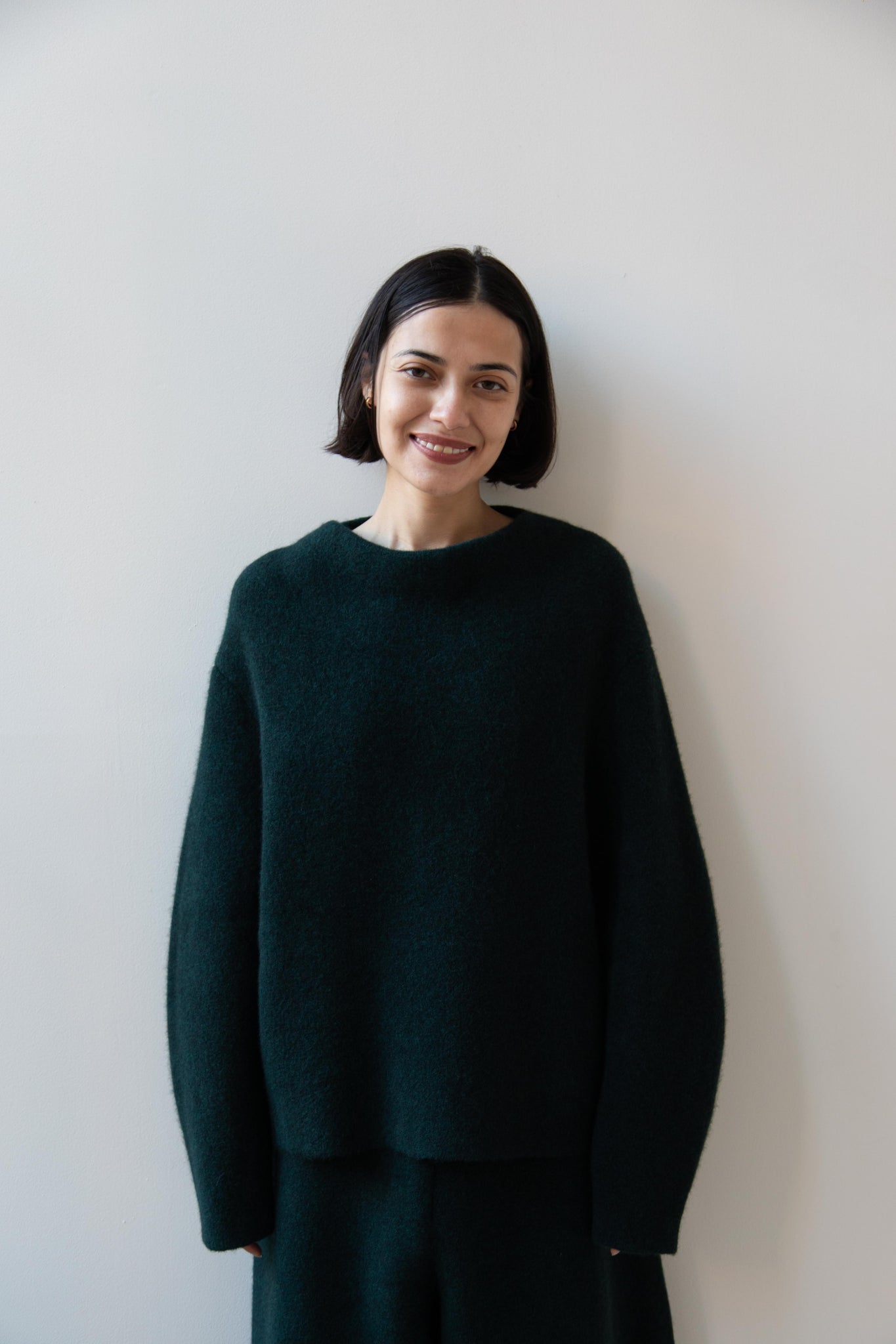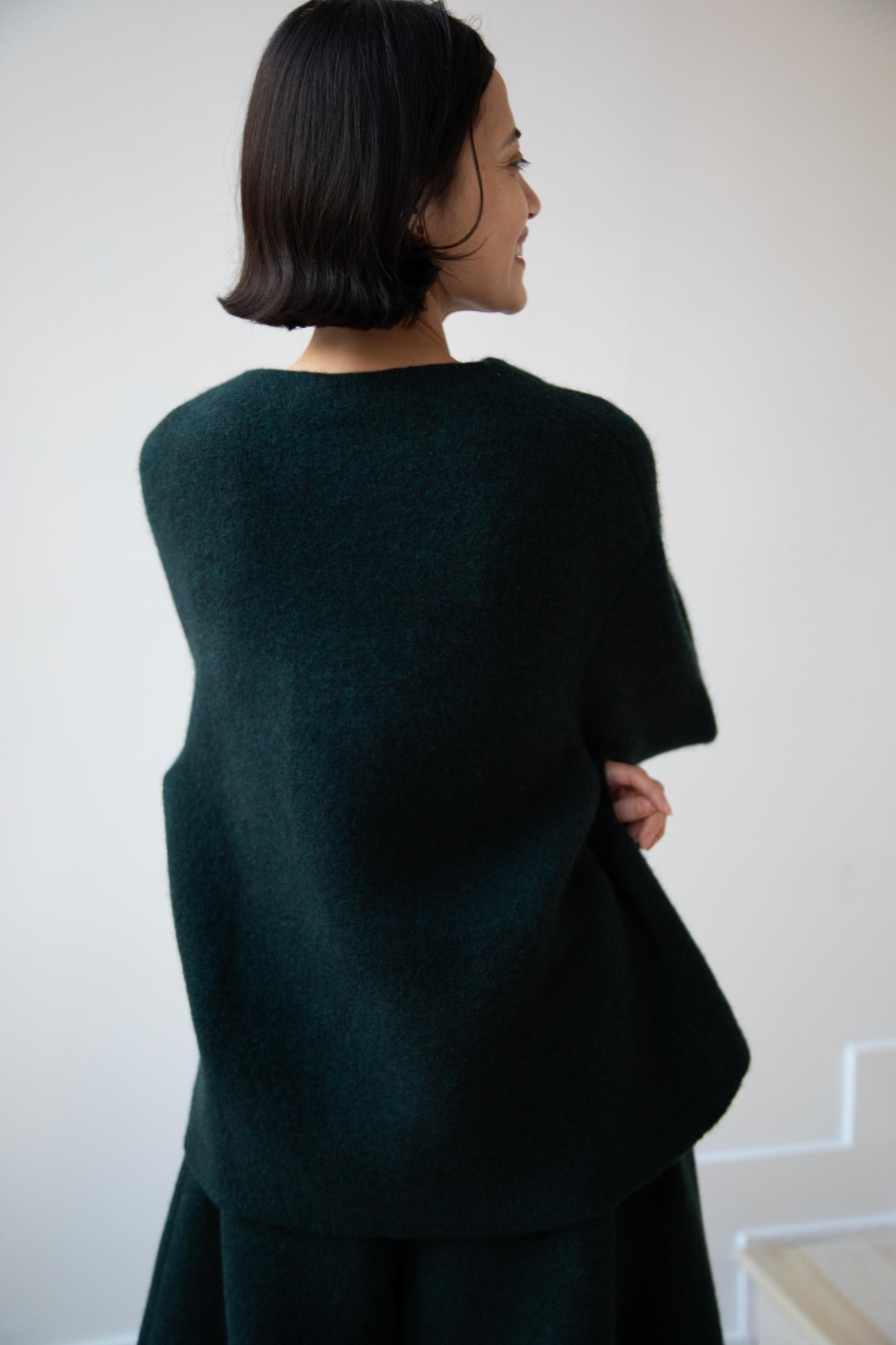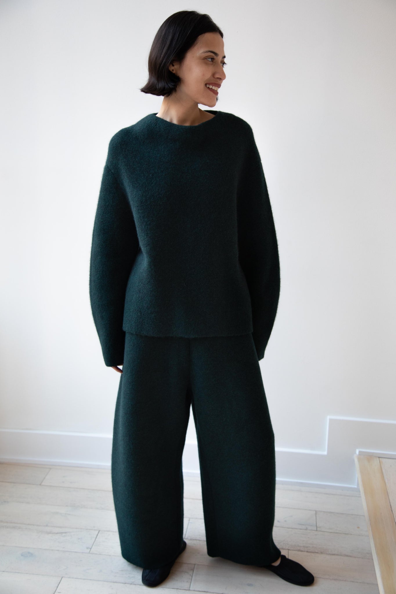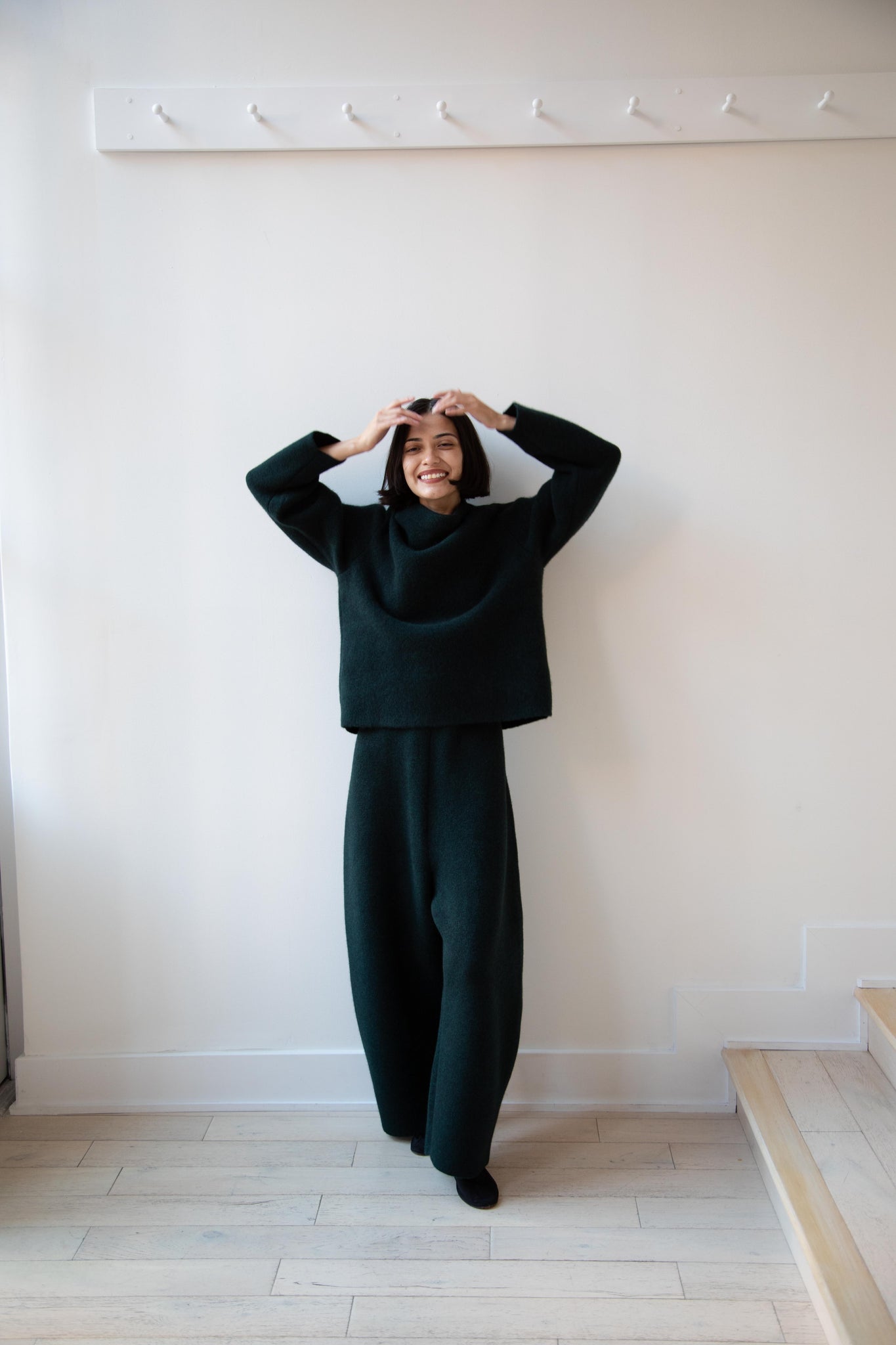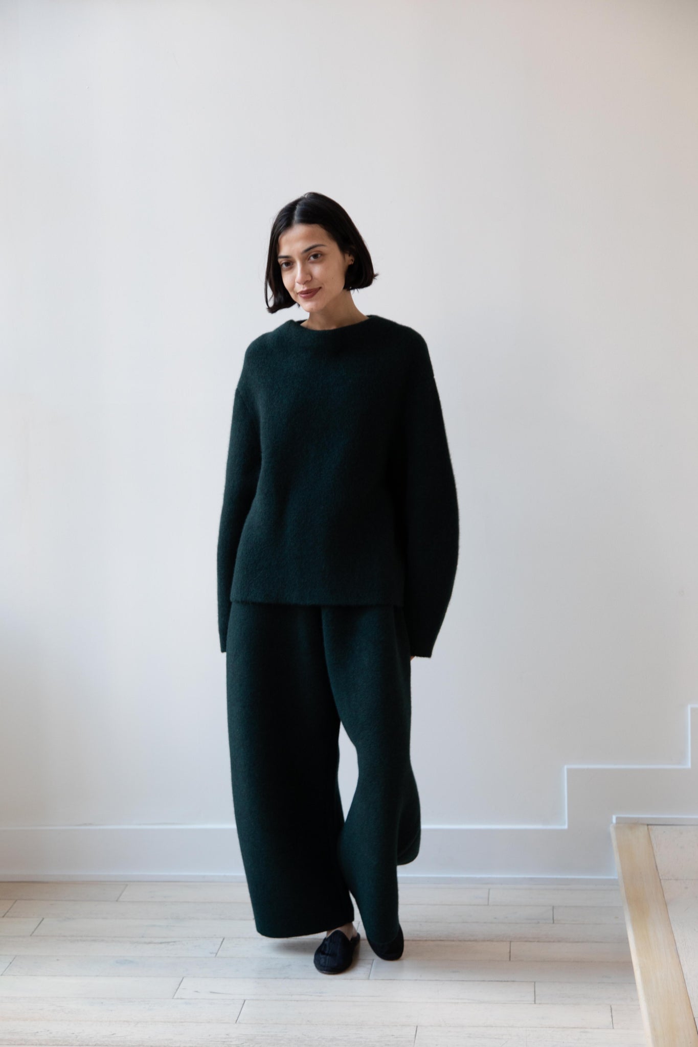 This pullover sweater features a wide boat neckline that is a little bit baggy.  The sleeves are slightly bowed, giving the whole piece a sculptural and elegant shape.  Wear it with the matching trousers for a perfect fall outfit.  The shade of green is very deep and beautiful too.