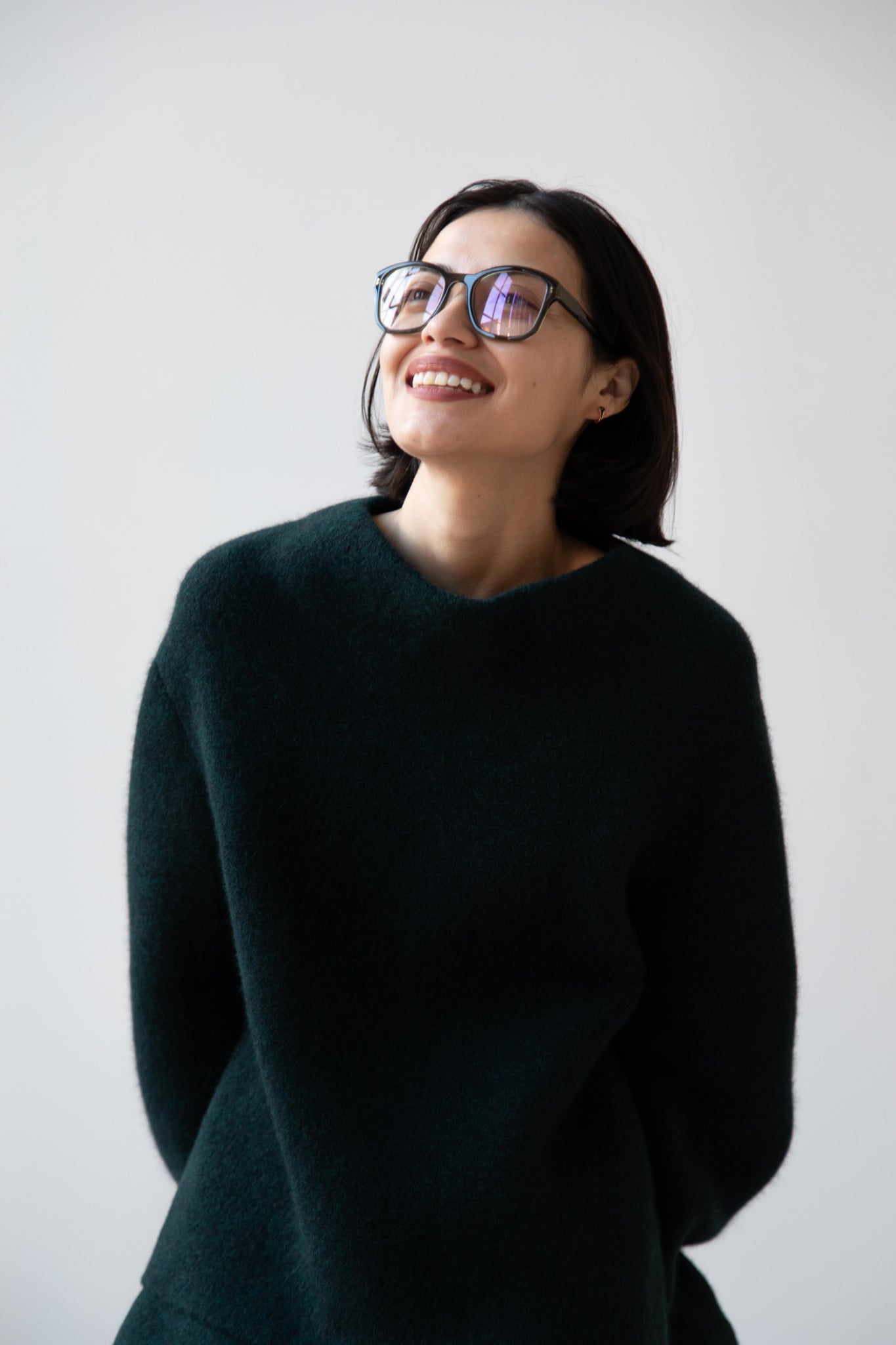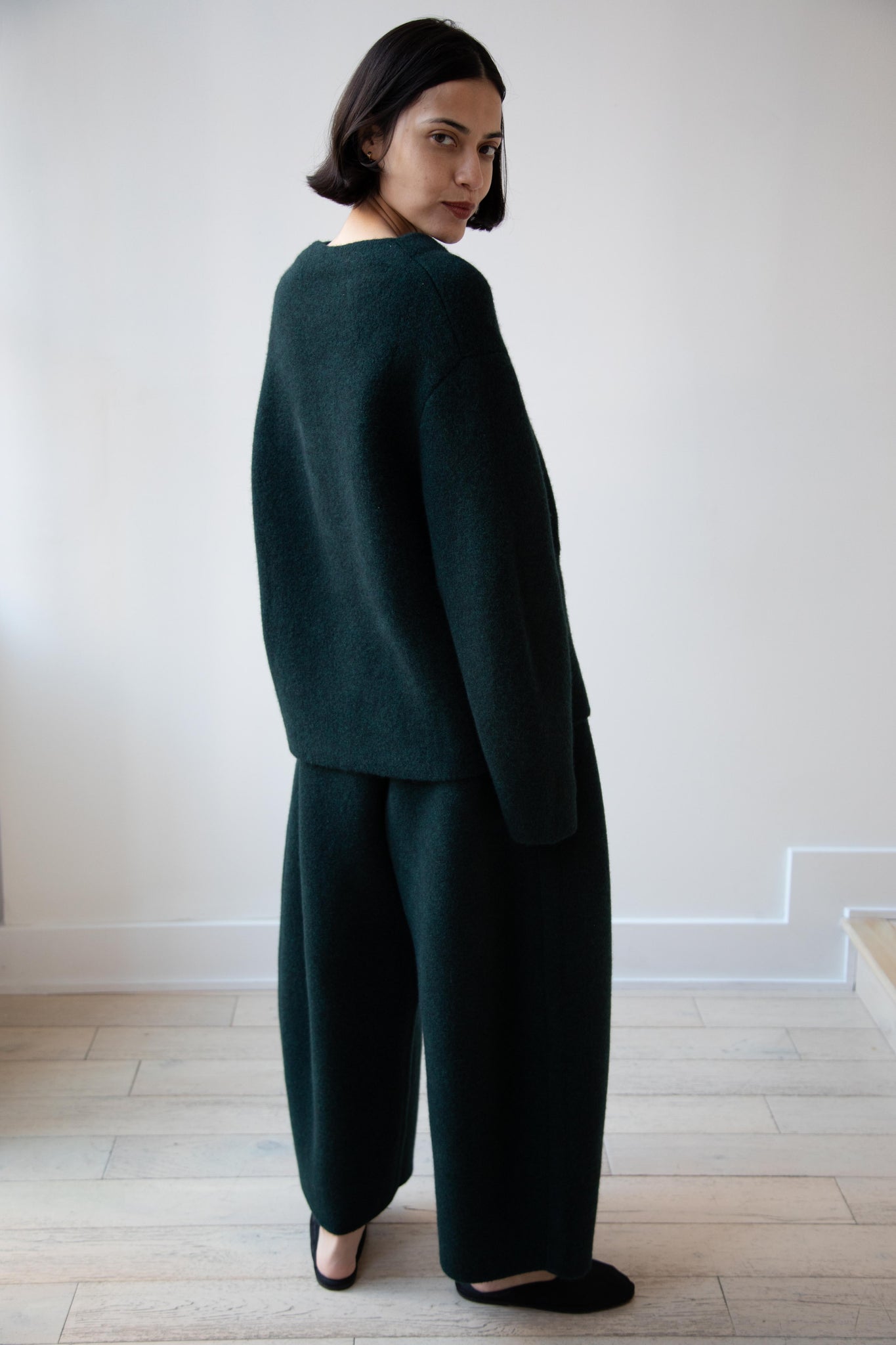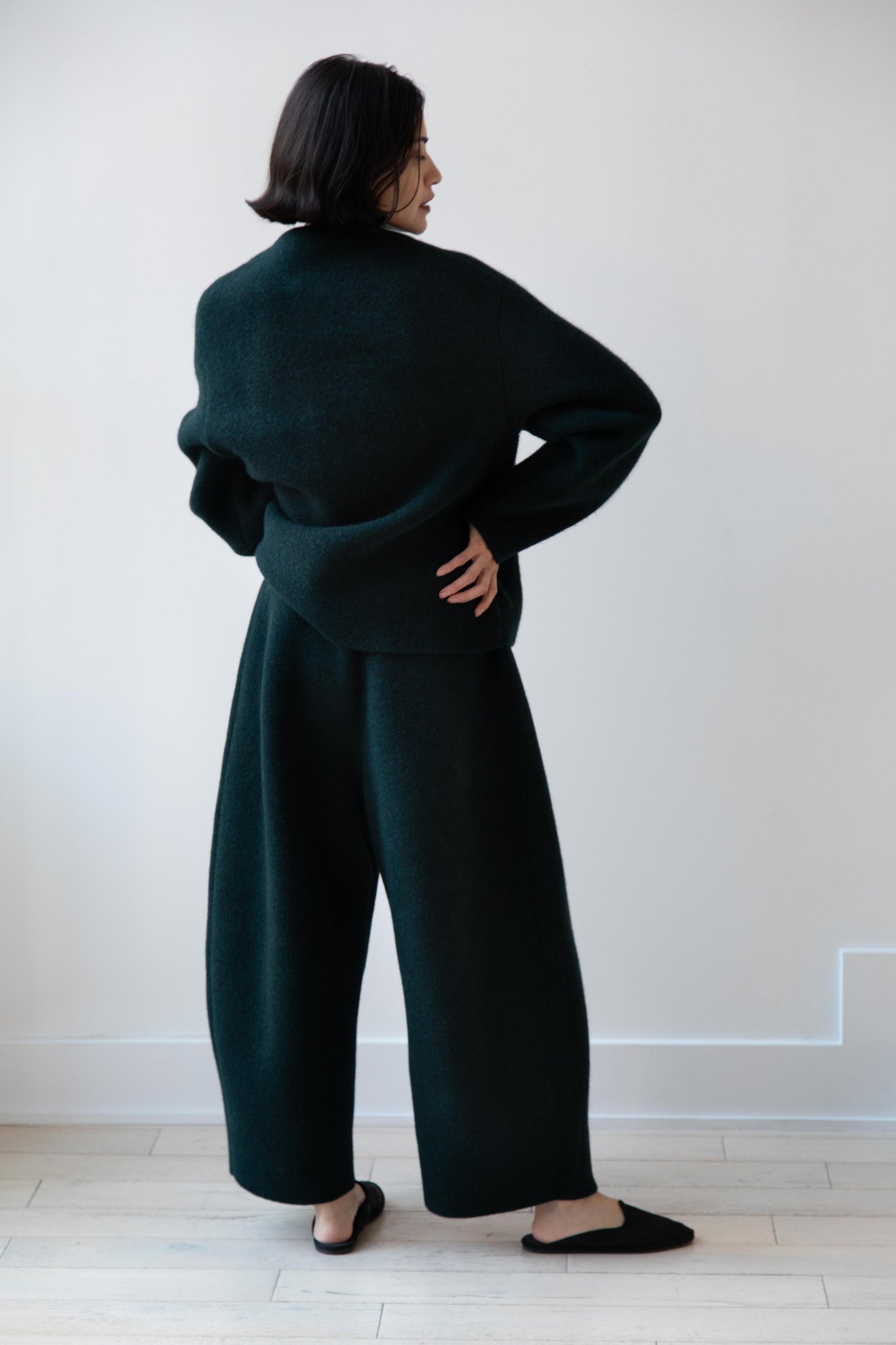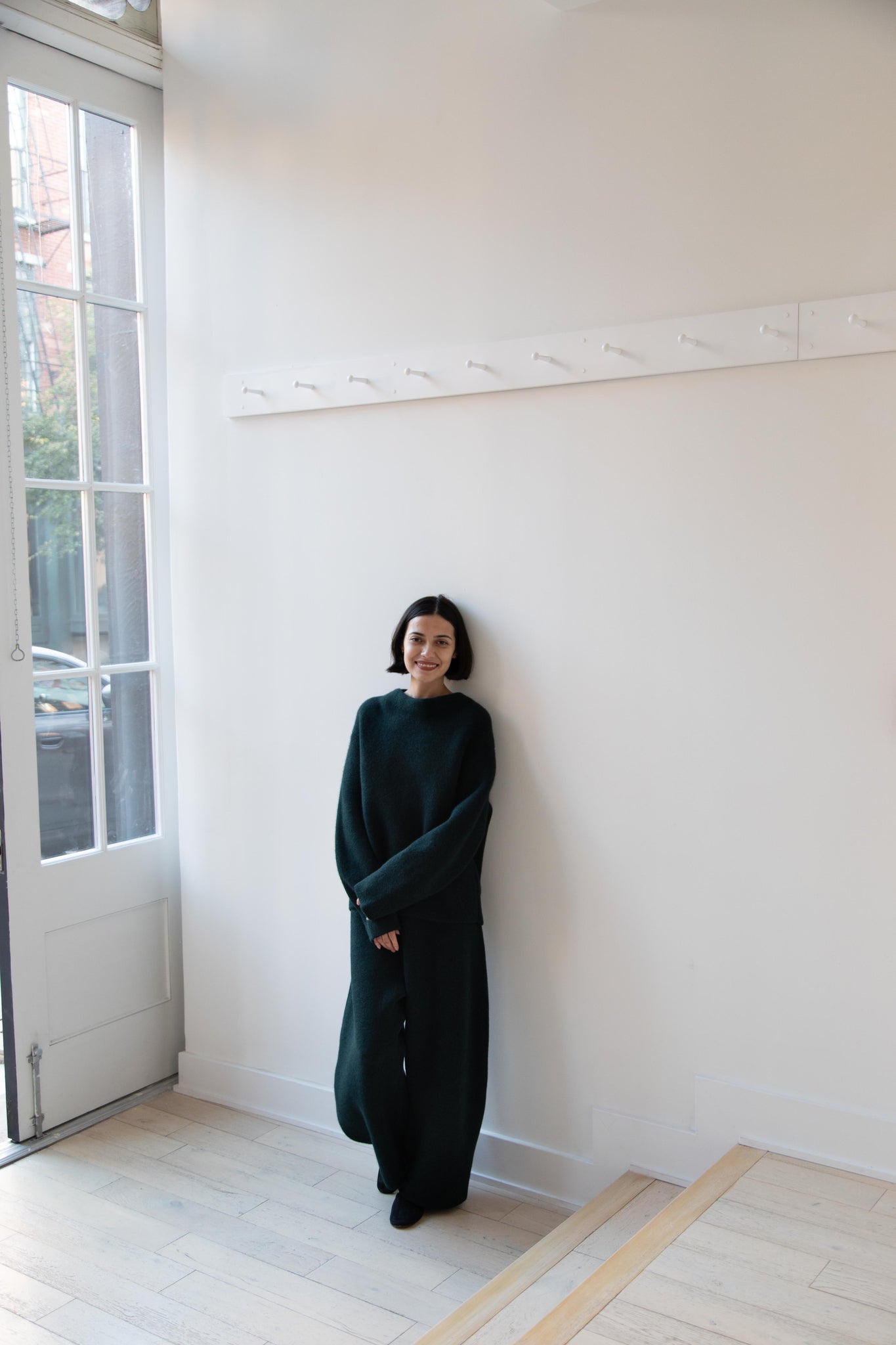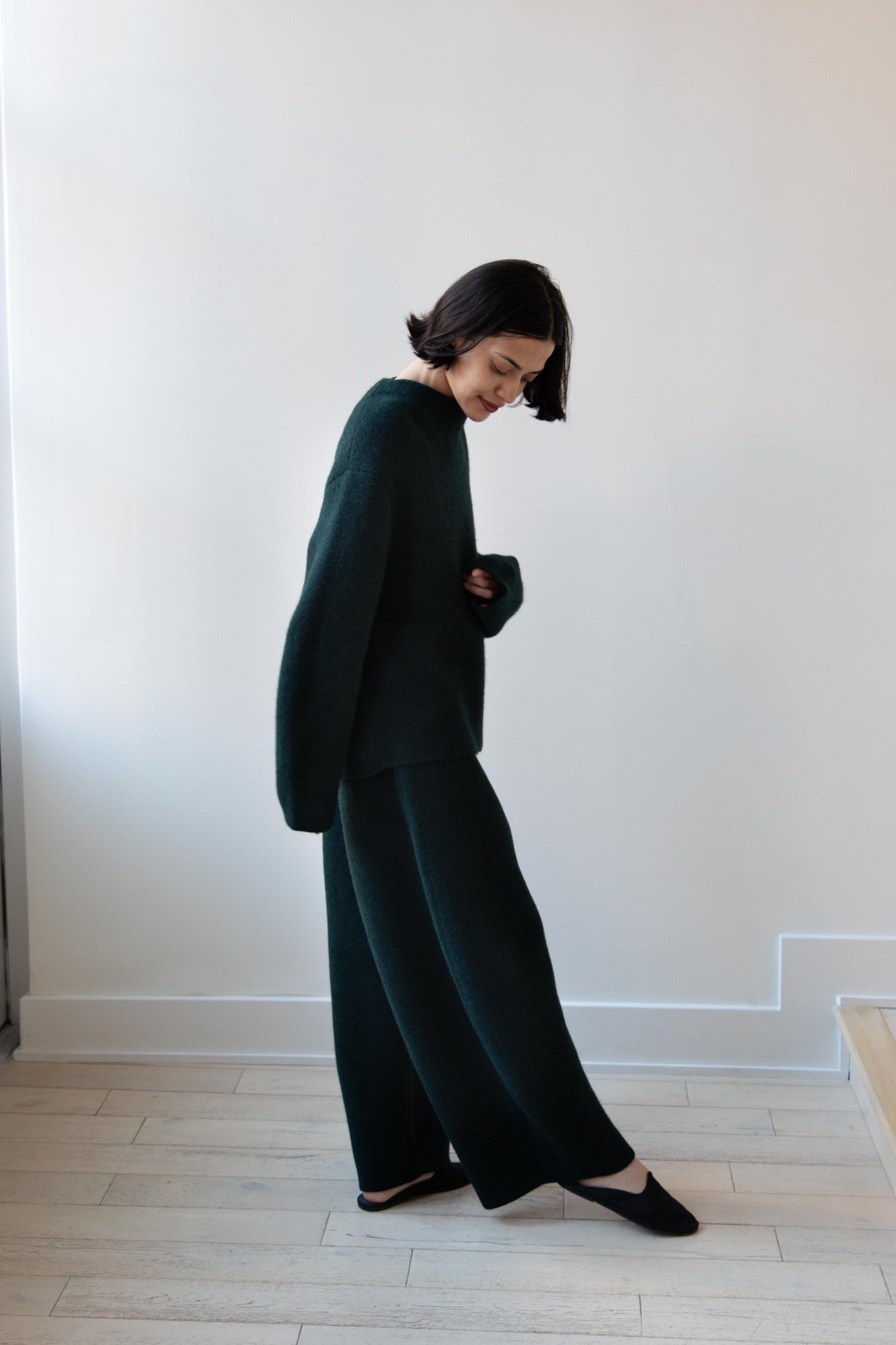 This pullover sweater features a wide boat neckline that is a little bit baggy.  The sleeves are slightly bowed, giving the whole piece a sculptural and elegant shape.  Wear it with the matching trousers for a perfect fall outfit.  The shade of green is very deep and beautiful too.
