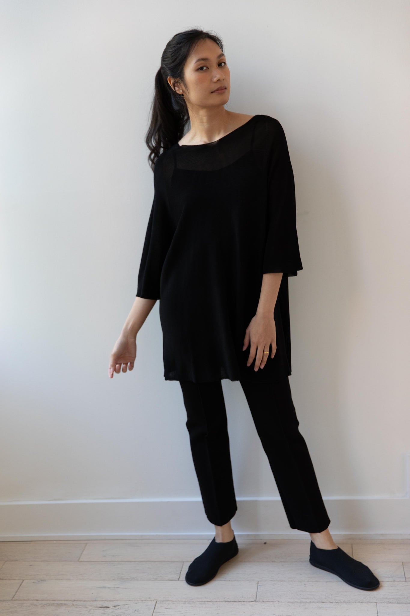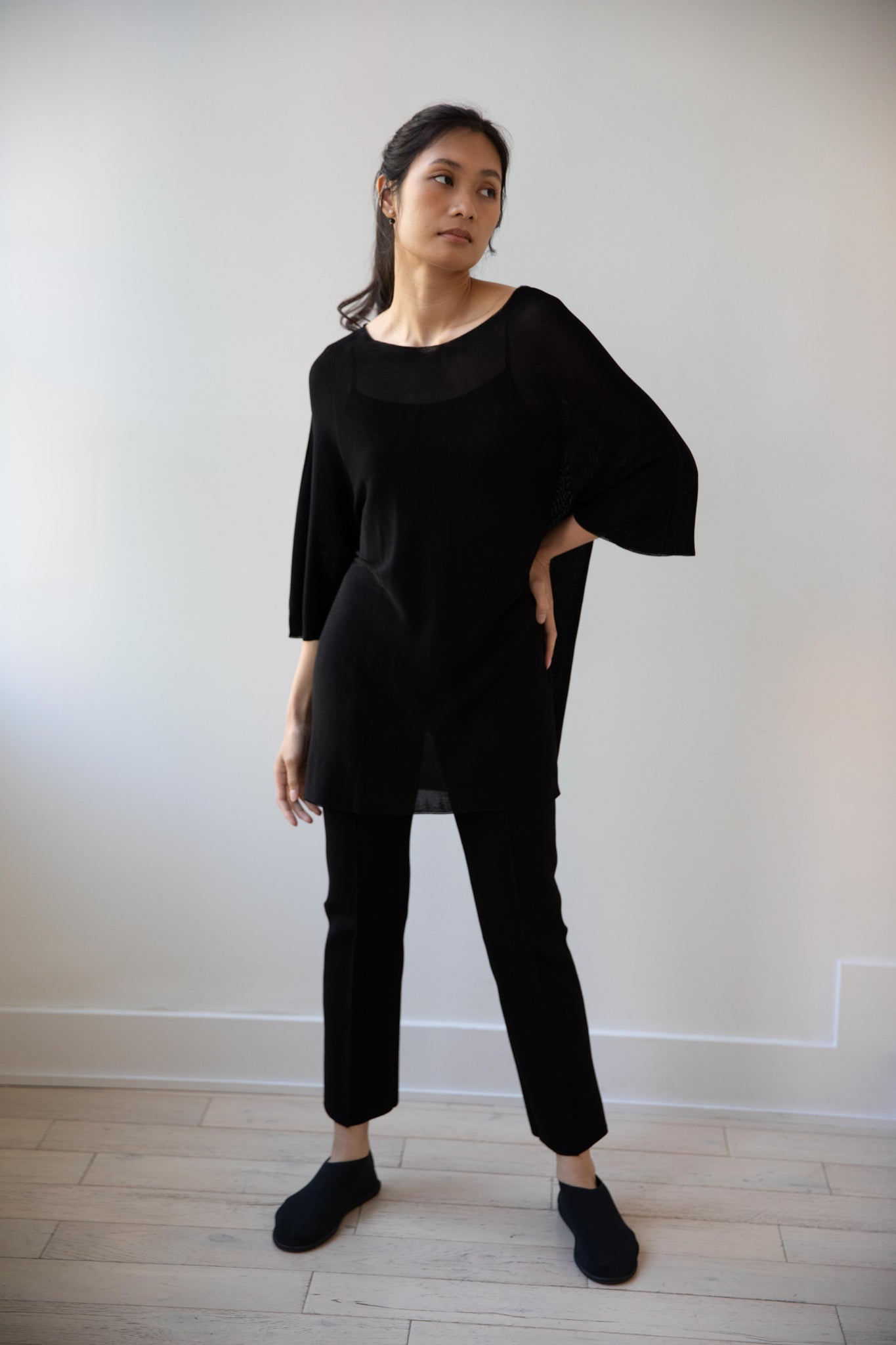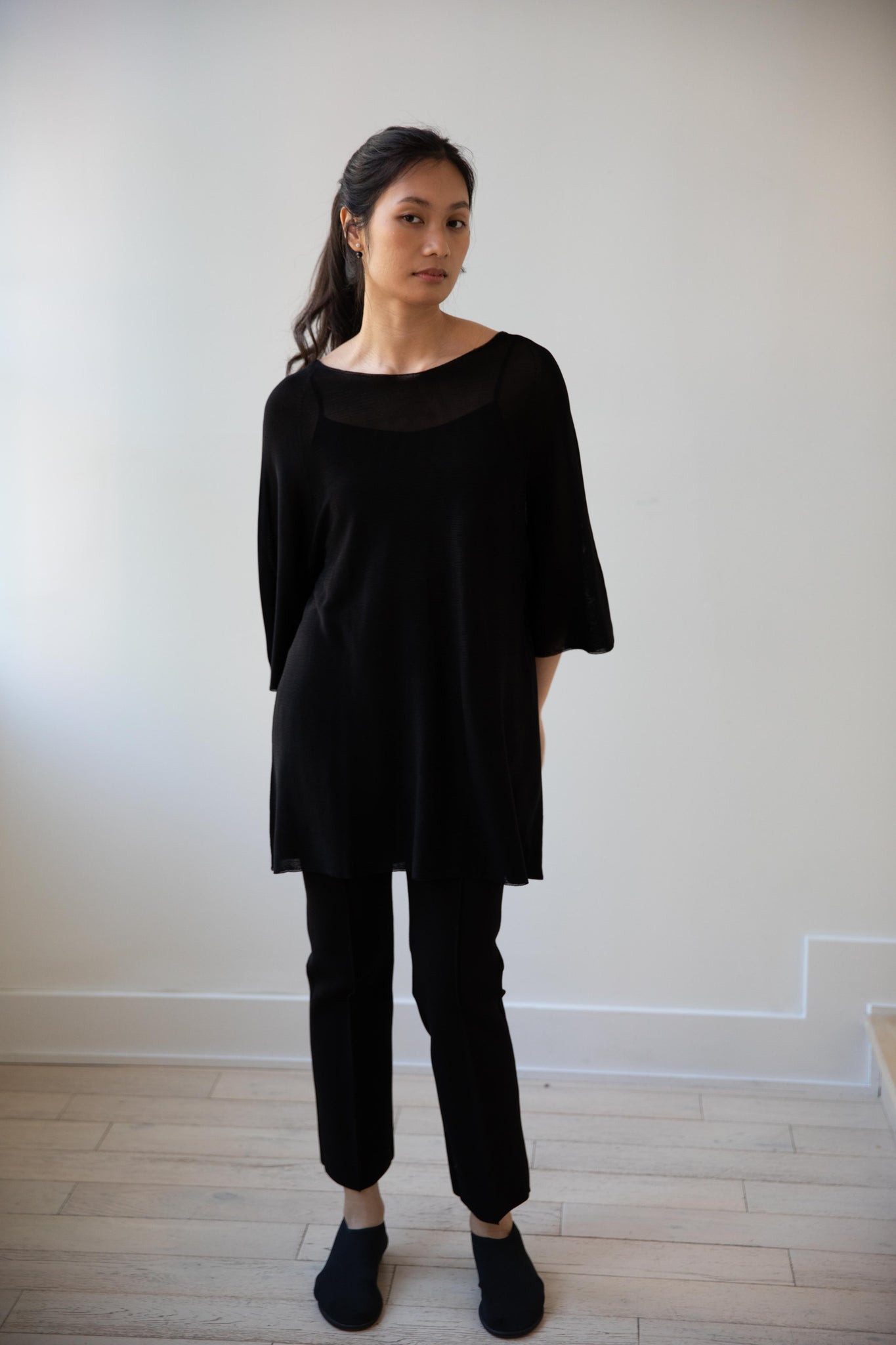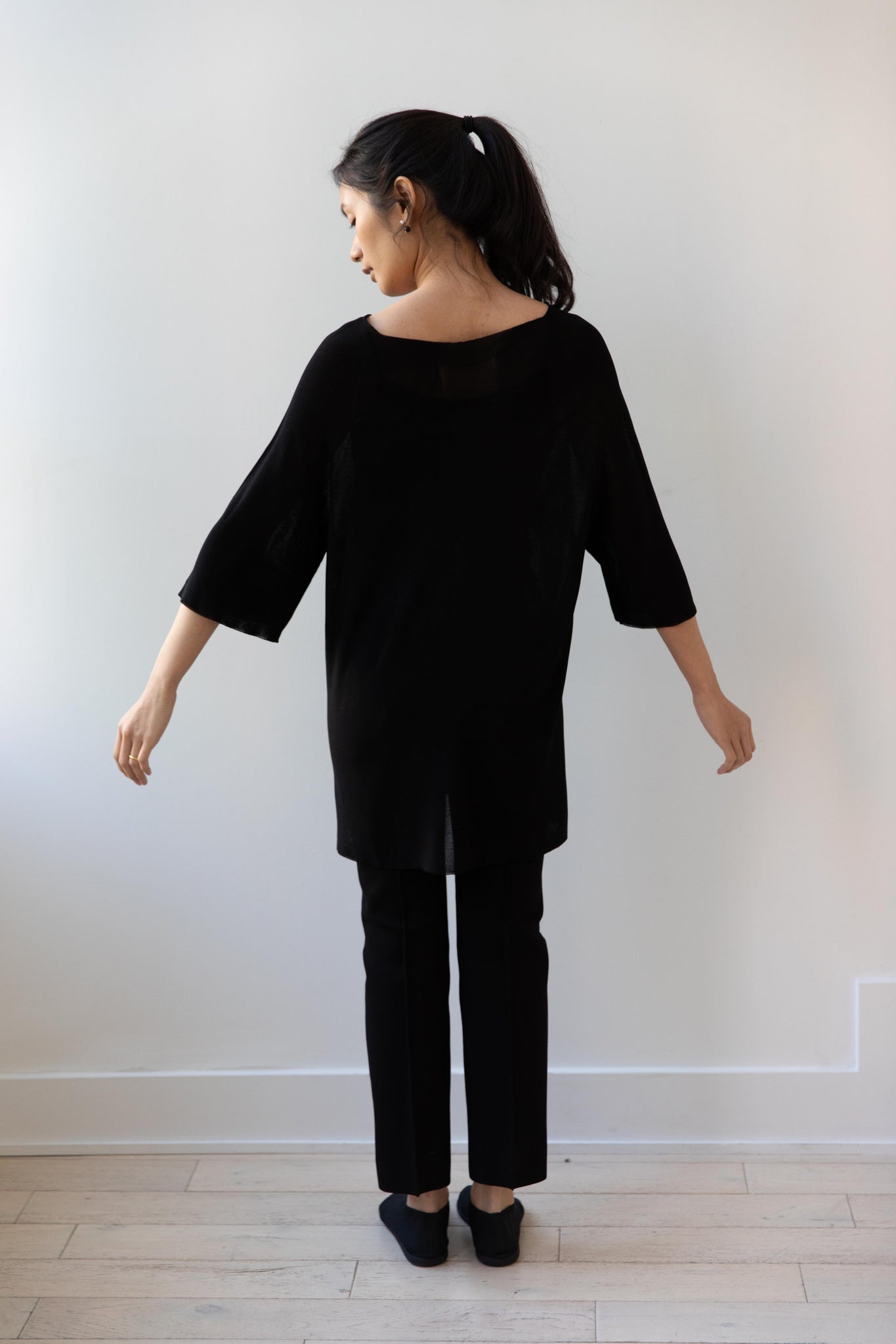 Cancellato Uniform's viscose knits are perfect for summer. Made from a lightweight yarn that very breathable, we are happy to have many styles in it this season so you can mix and match to get an ideal layered look, something the line is so good at. This elongated tunic is a great style over one of their loose trousers, or a narrow trouser, like this High Sport one.